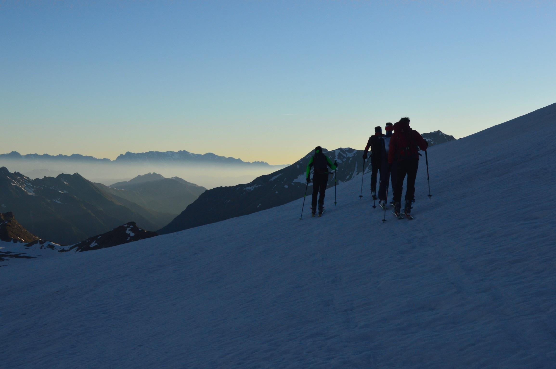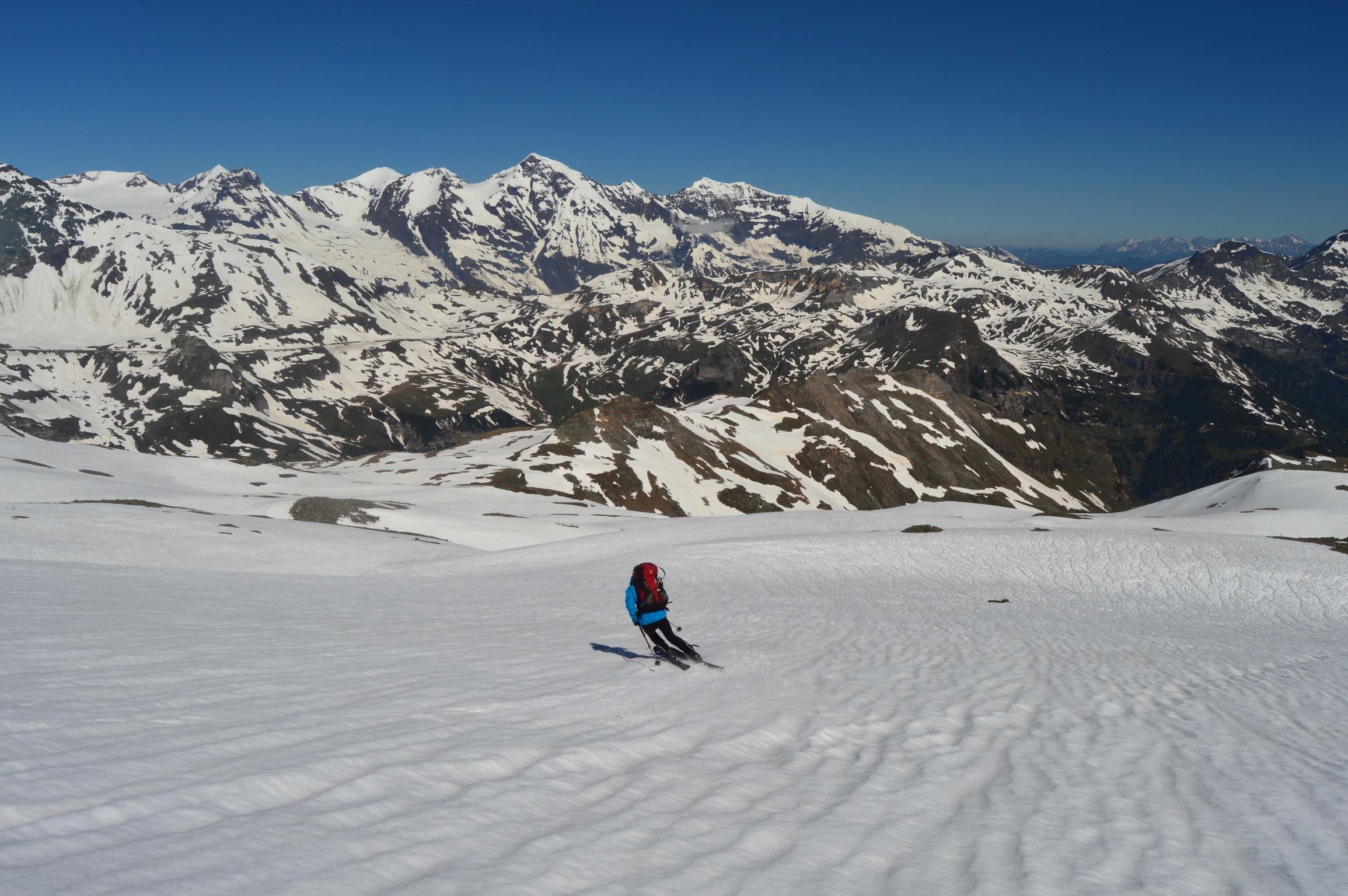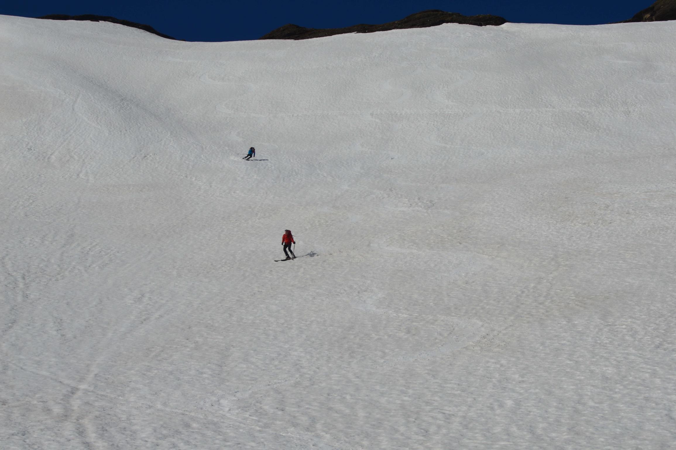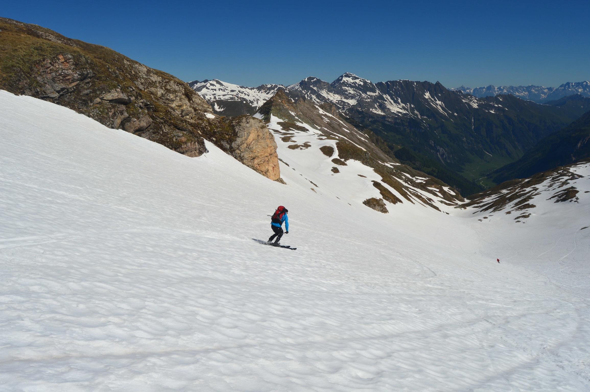 Der Vorteil bei dieser Tour ist, dass die Abfahrt vor dem Hauptaufstieg erfolgt und dadurch die Schneeverhältnisse auch Mitte Juni bei vernünftiger Abstrahlung noch perfekt sind.