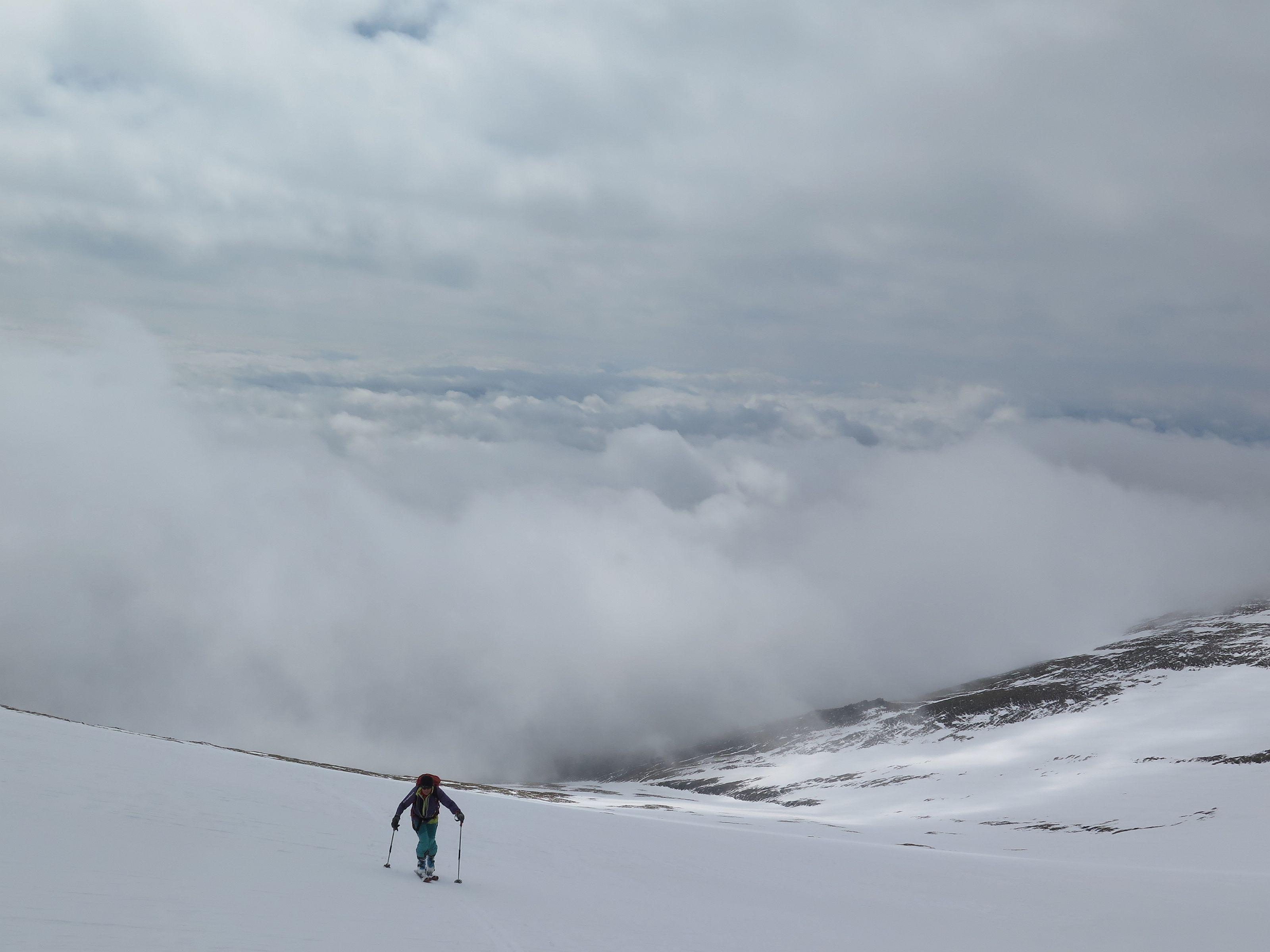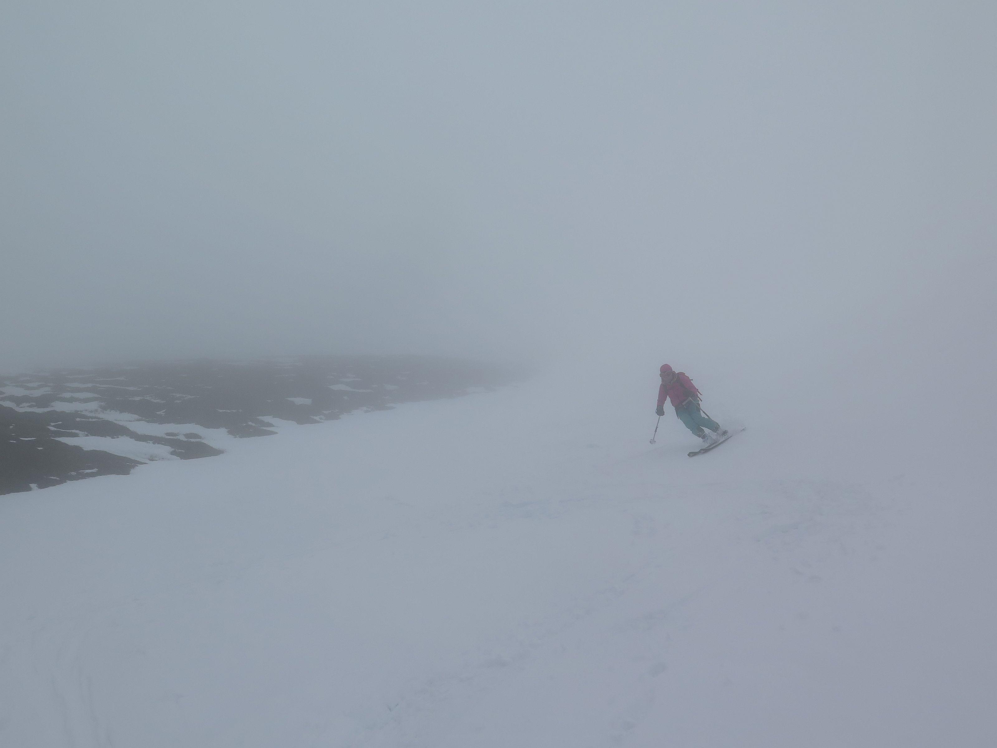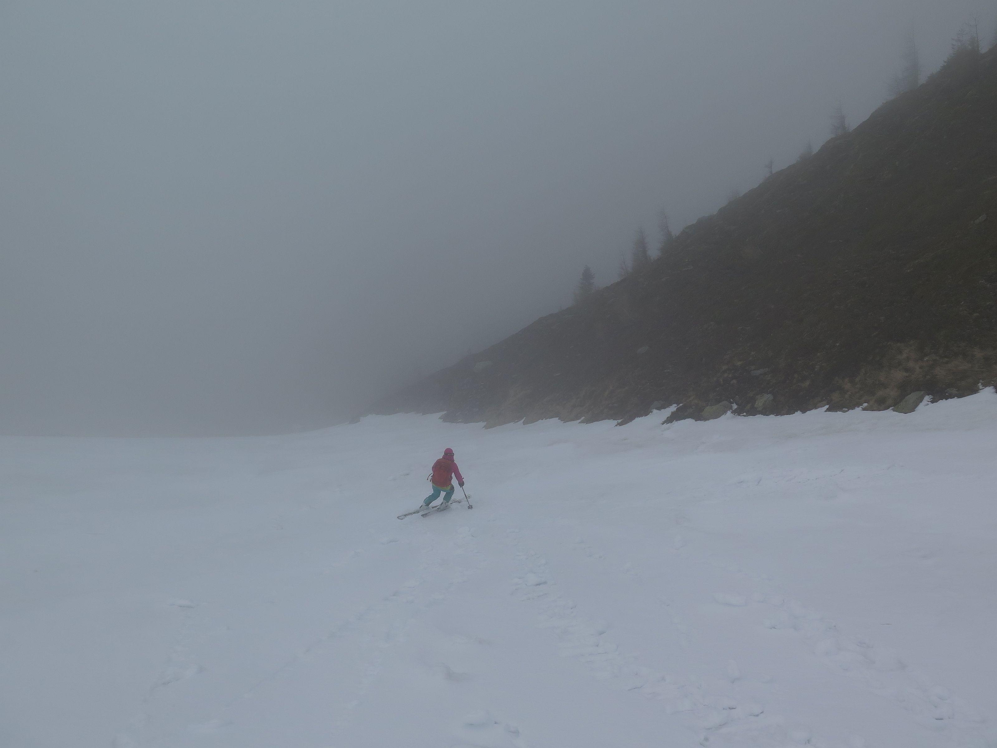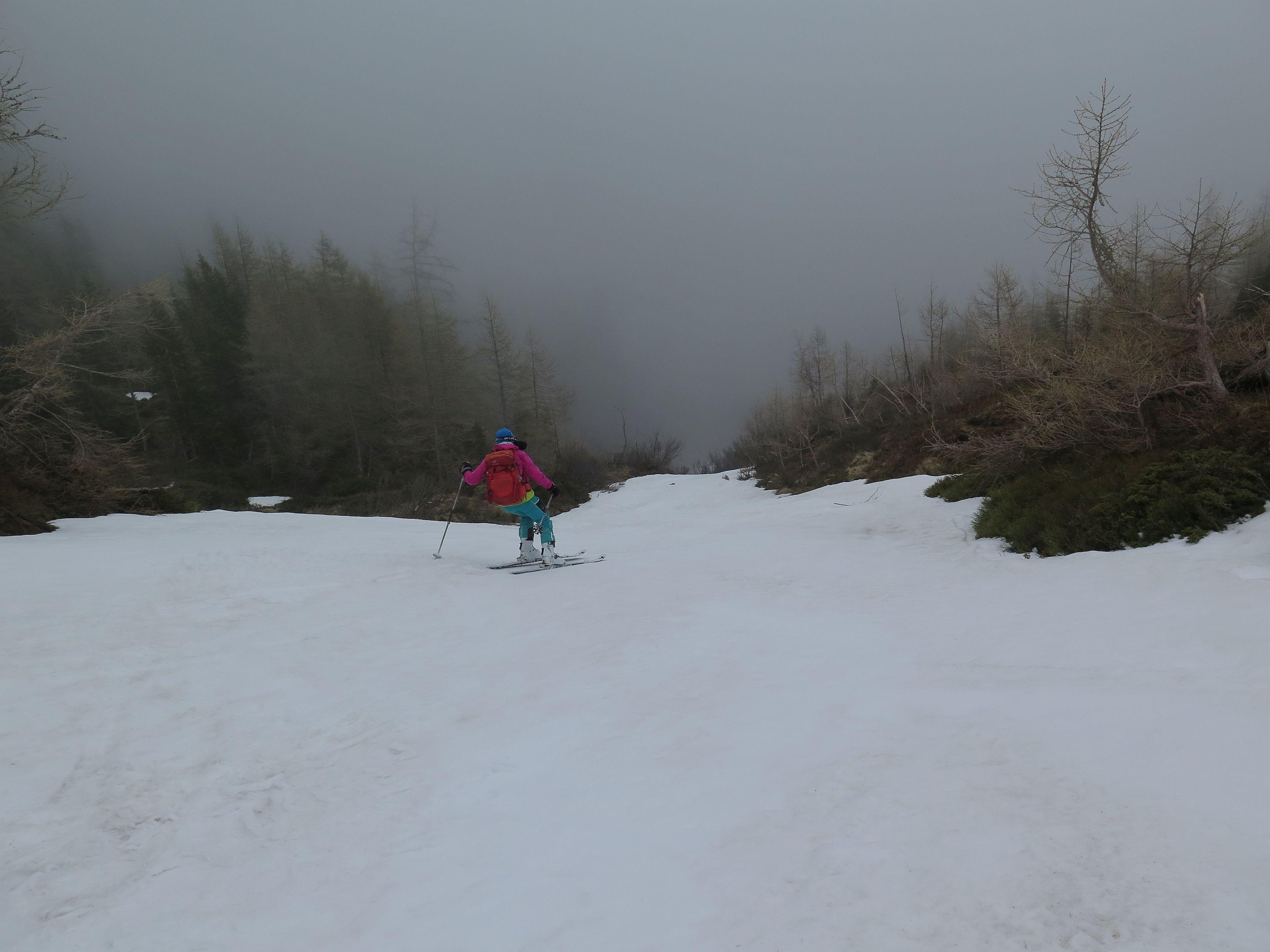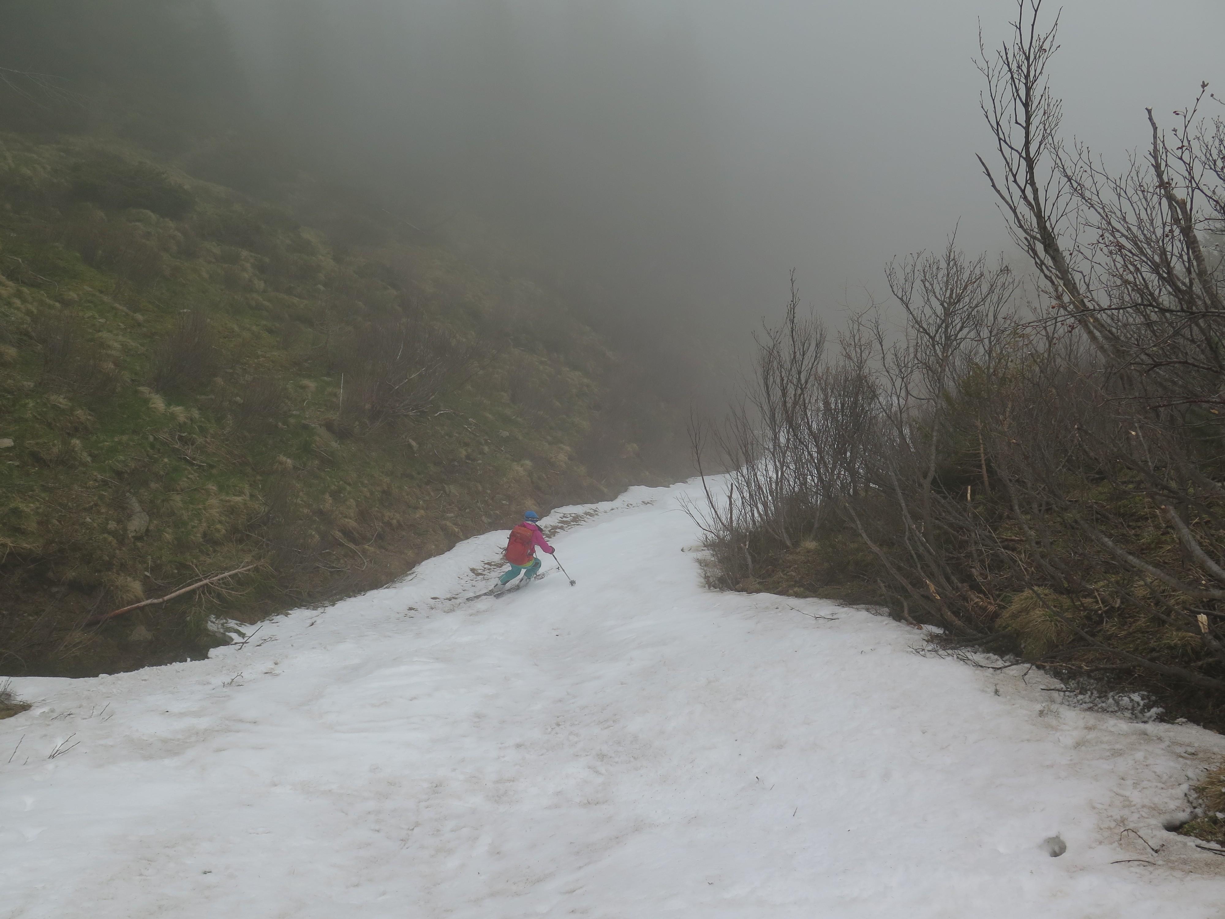 bis zur Rinne müssen die Ski getragen werden, danach durchgehende Schneedecke bis zum Gipfel. Der Abfahrtsgenuss wurde durch Nebel etwas getrübt, am Gipfel war es kalt und windig.