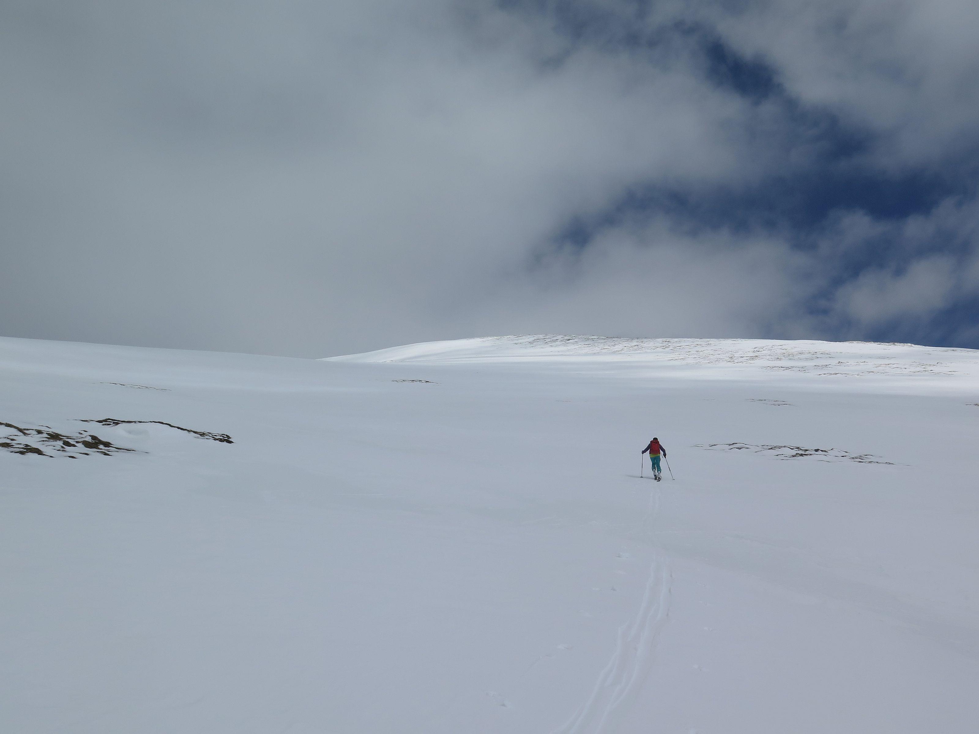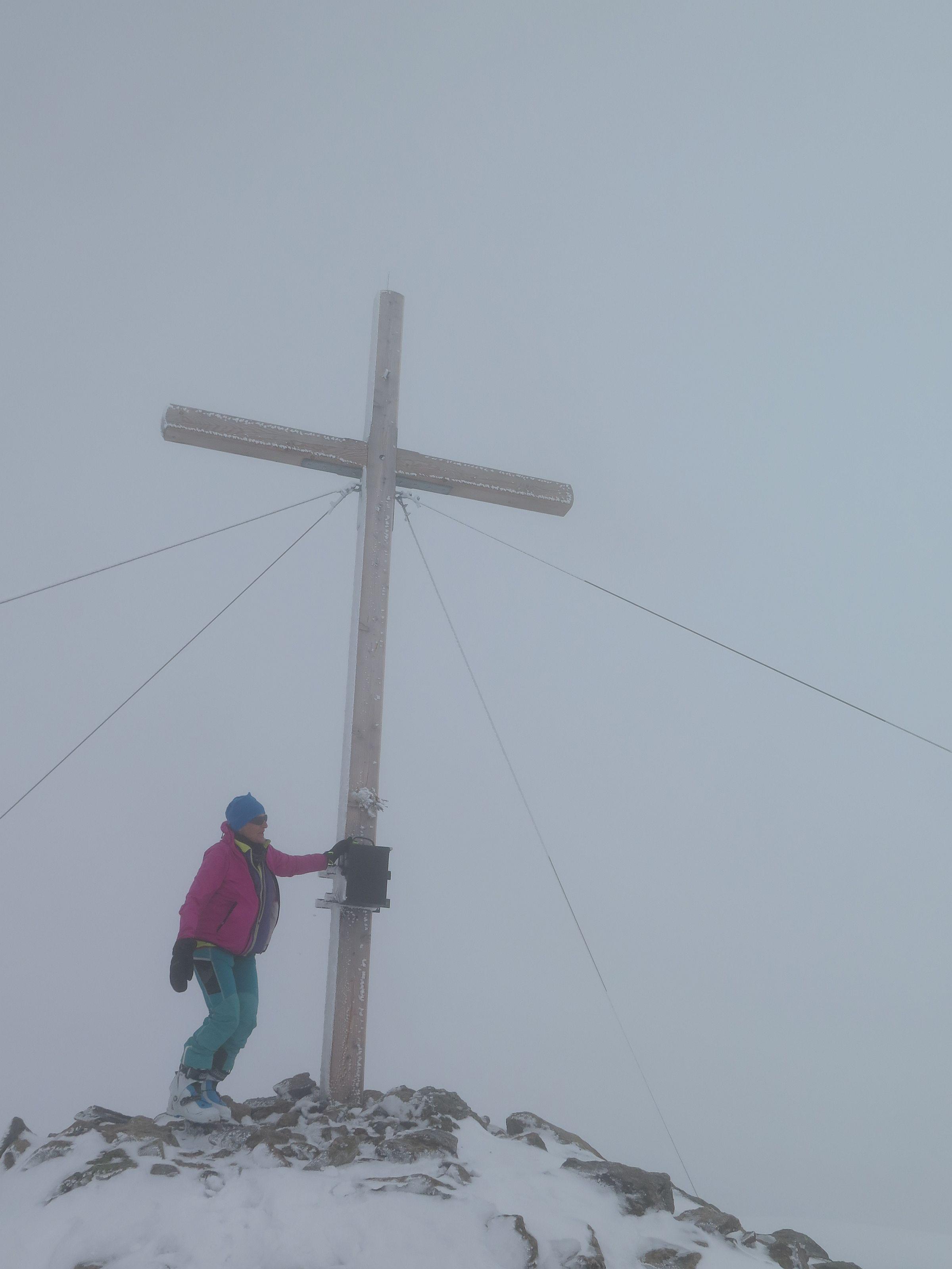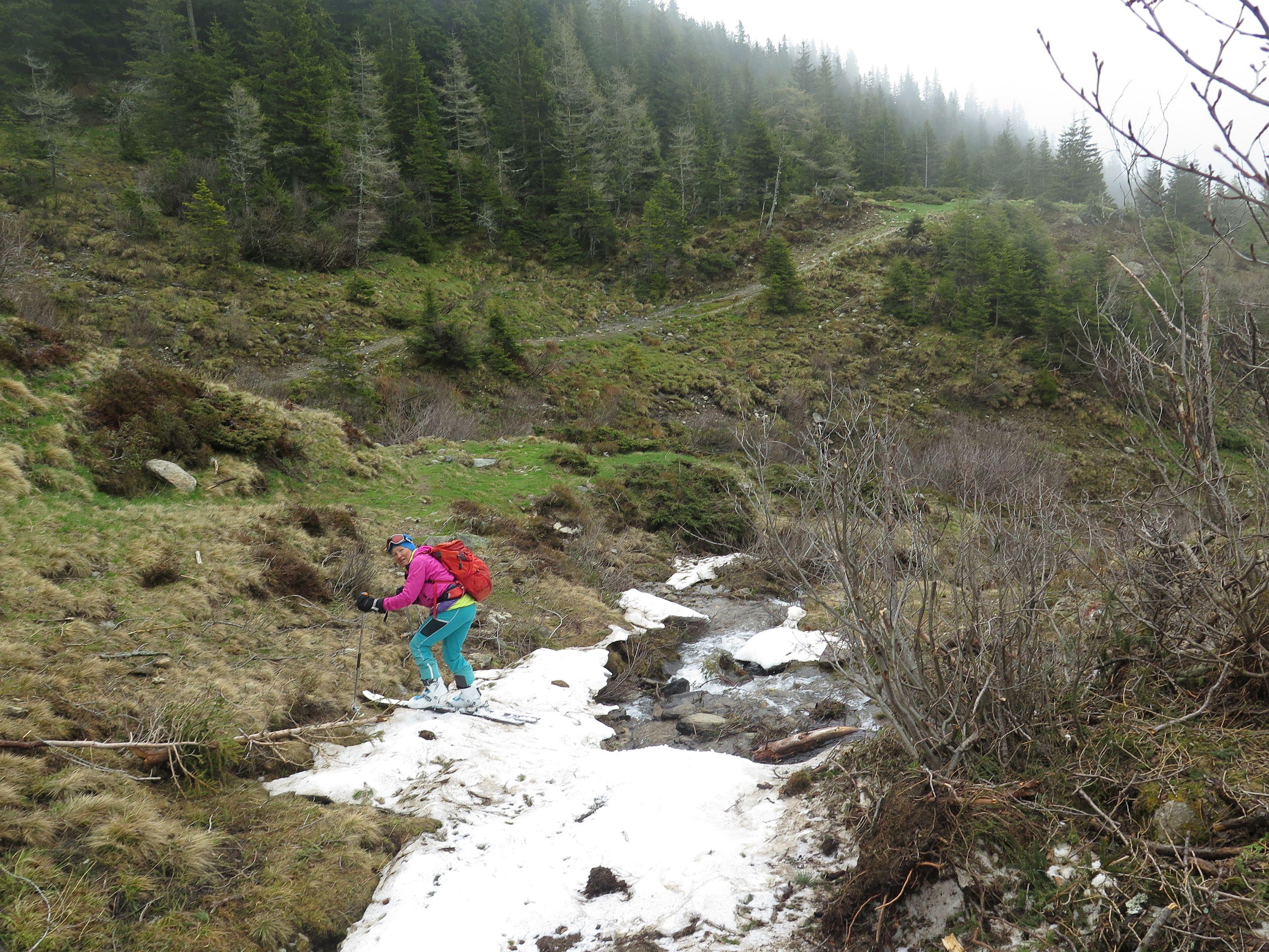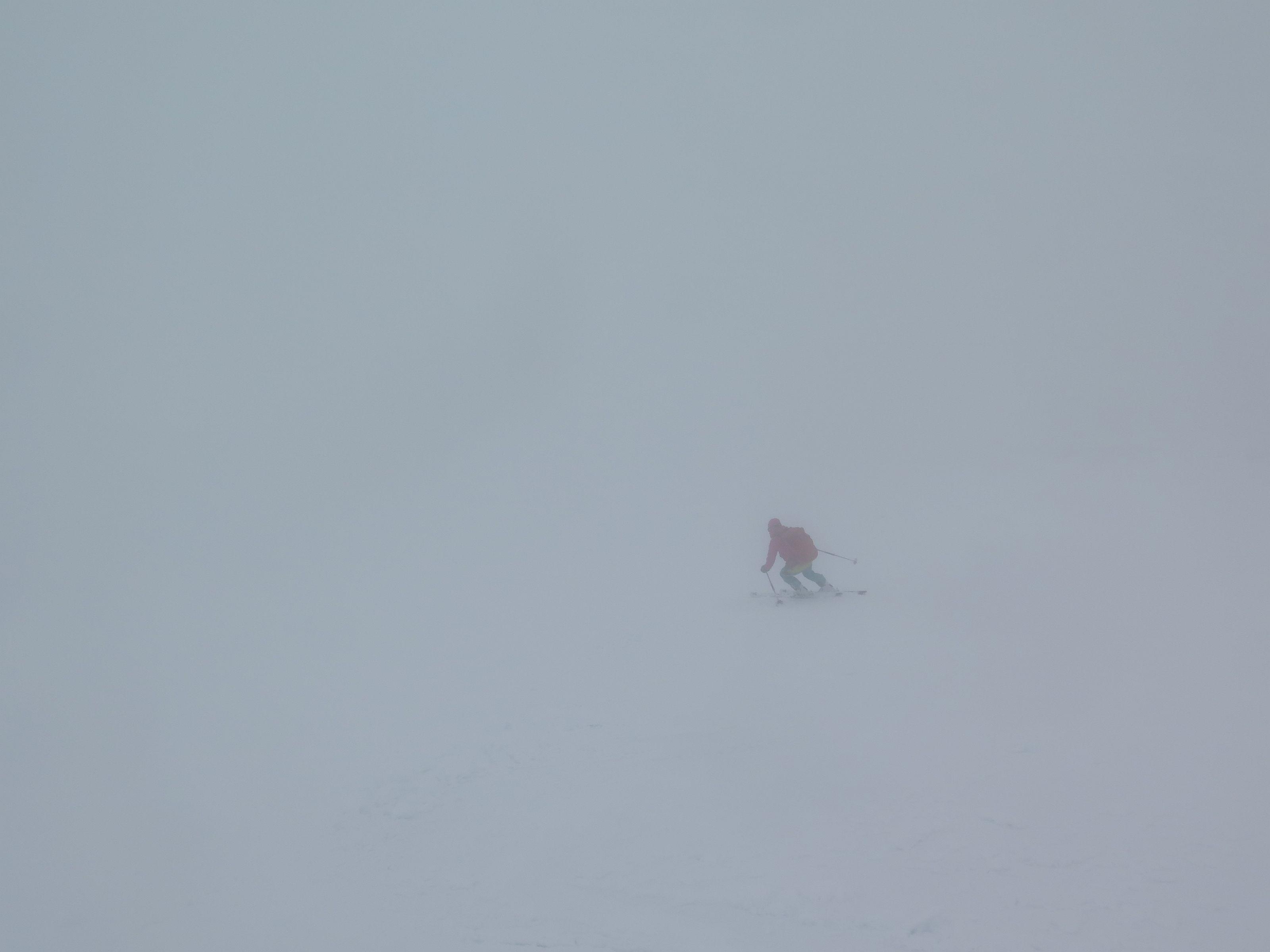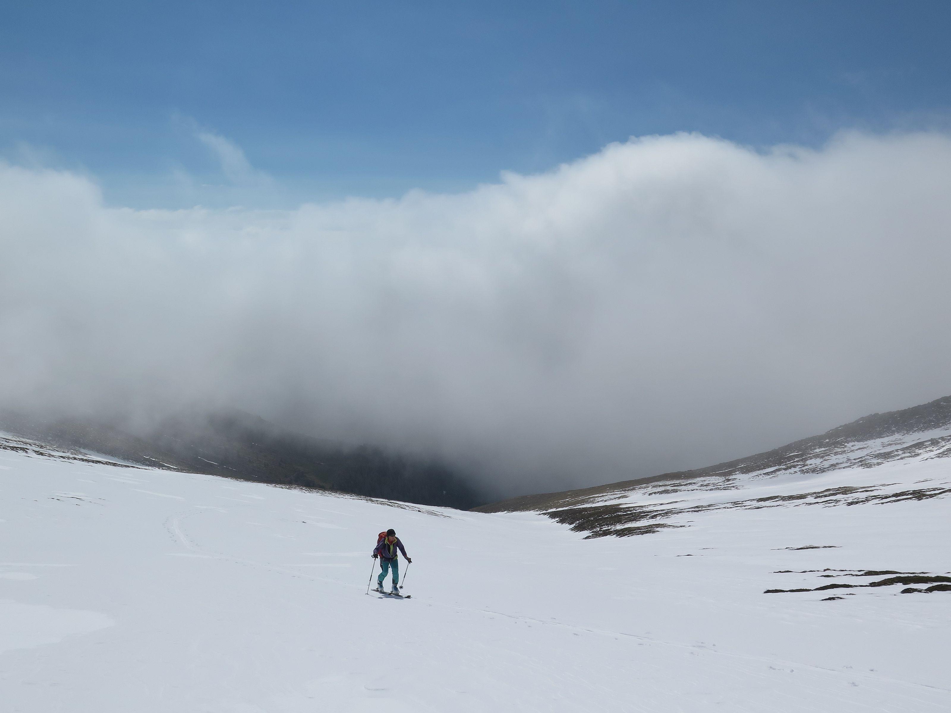 bis zur Rinne müssen die Ski getragen werden, danach durchgehende Schneedecke bis zum Gipfel. Der Abfahrtsgenuss wurde durch Nebel etwas getrübt, am Gipfel war es kalt und windig.