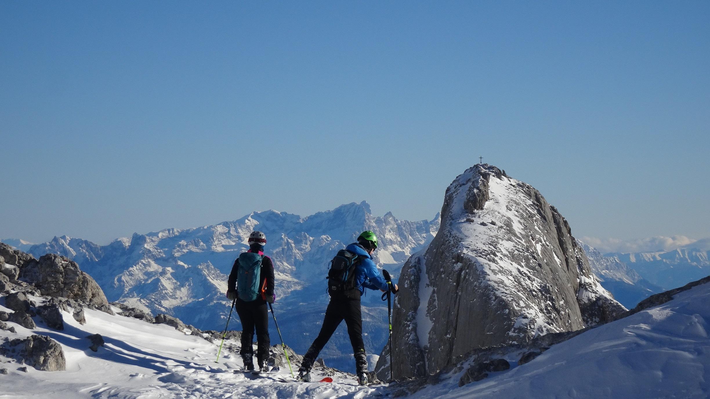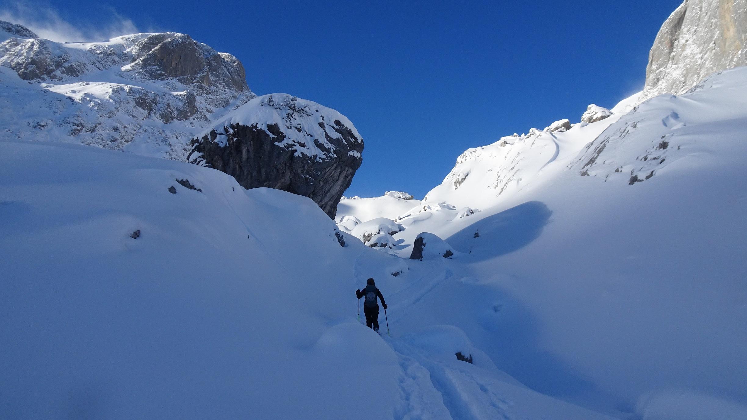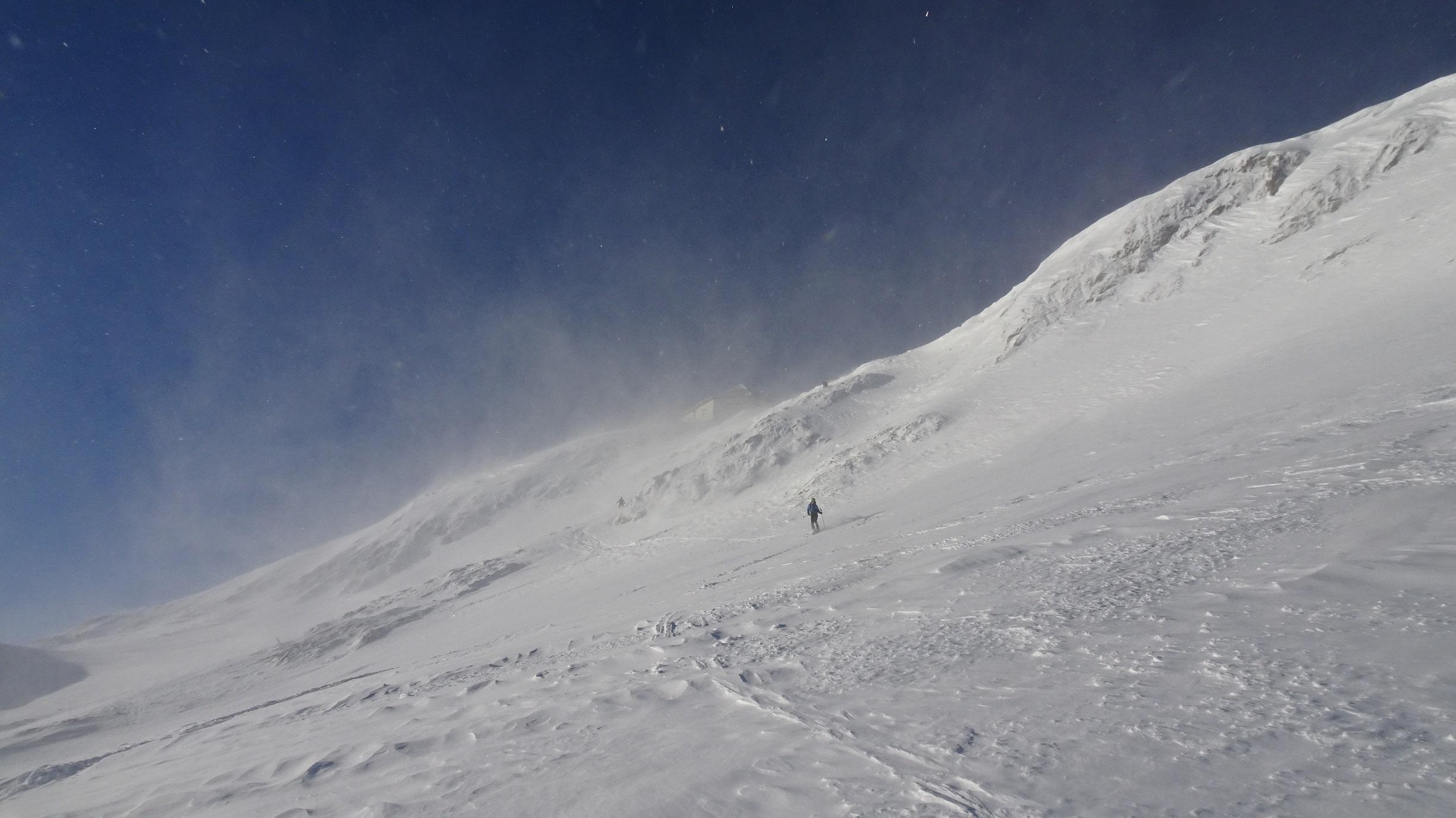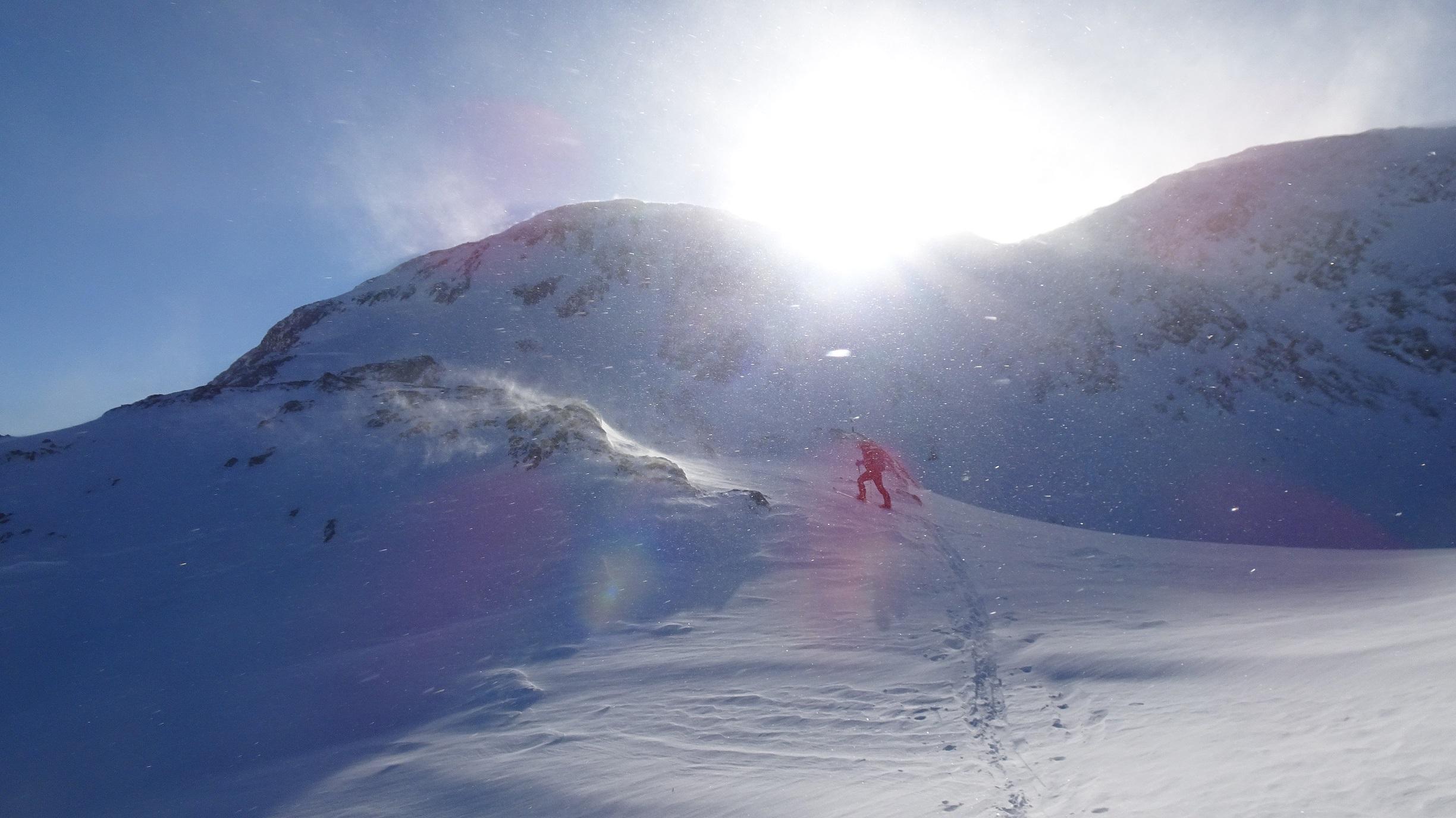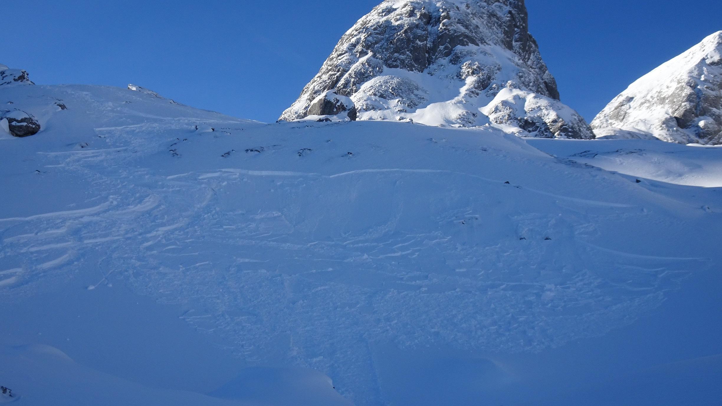 Es hat ein bischen geschneit, aber nicht soviel, dass wir diesmal mit weniger Kratzer davongekommen wären. Der Schnee war vom Westwind verfrachtet worden, und heute lebte der Südwind auf. Hinter Geländekanten lauerten kleine Triebschneepakete auf einer Schwachschicht.