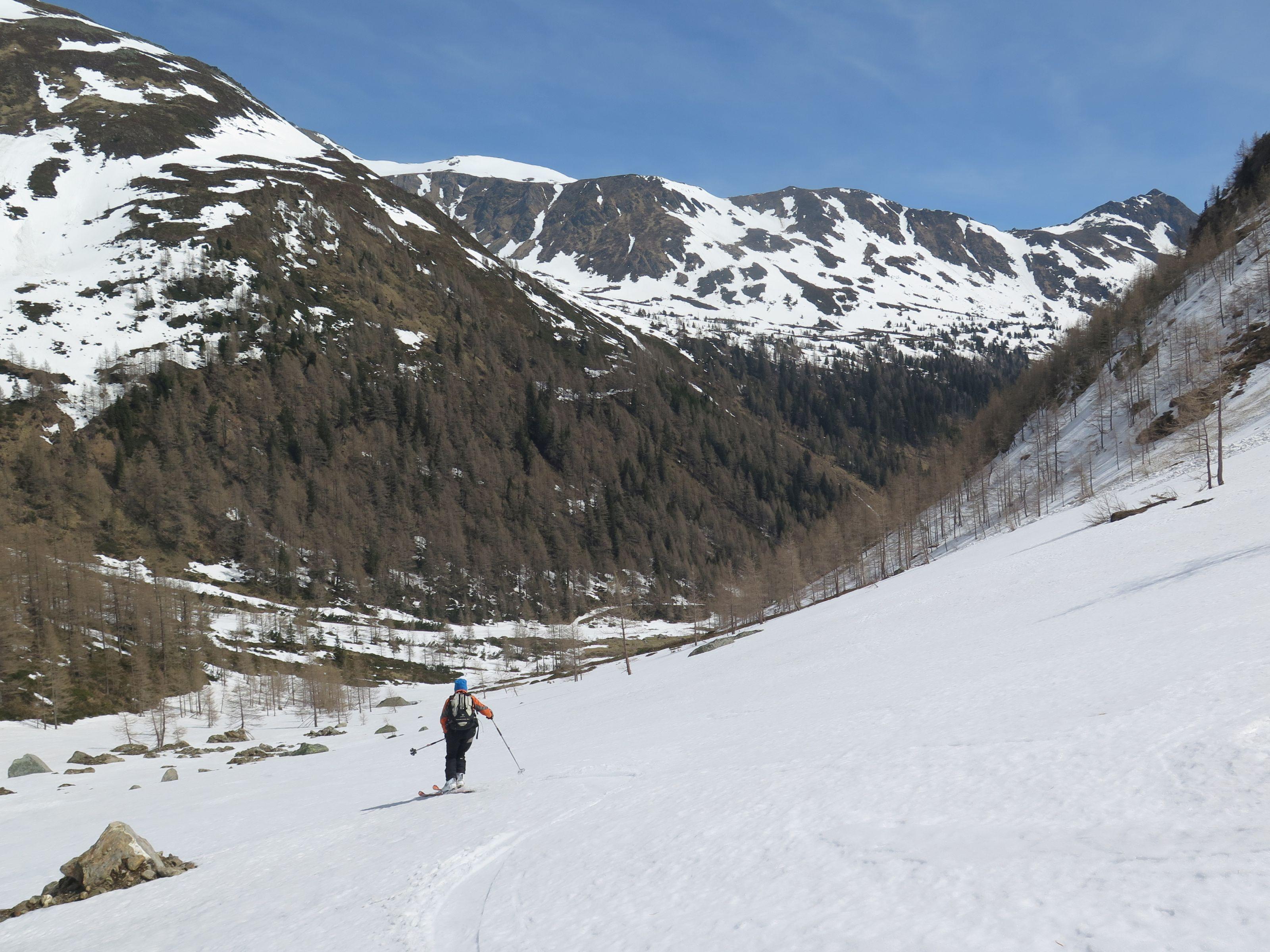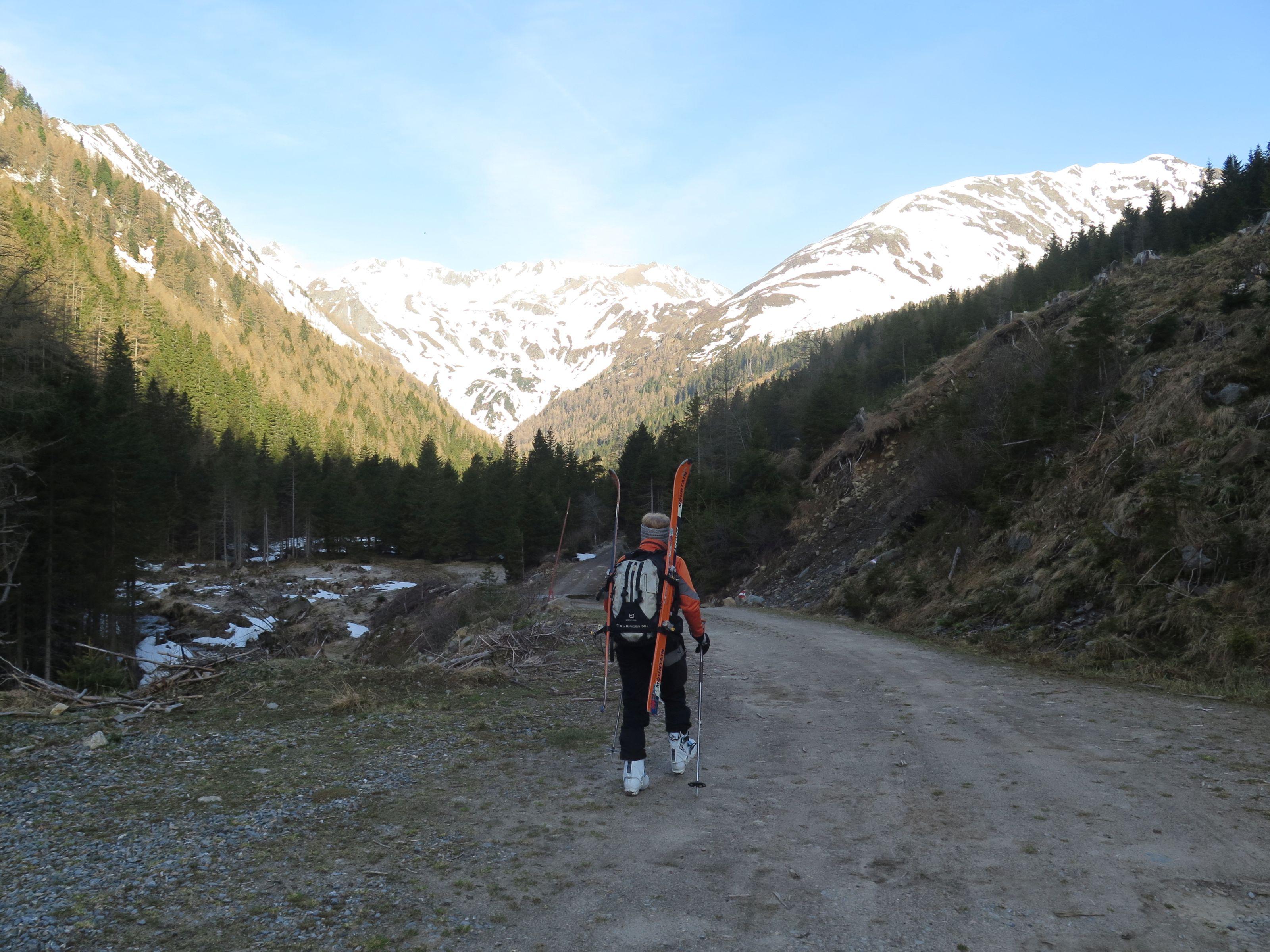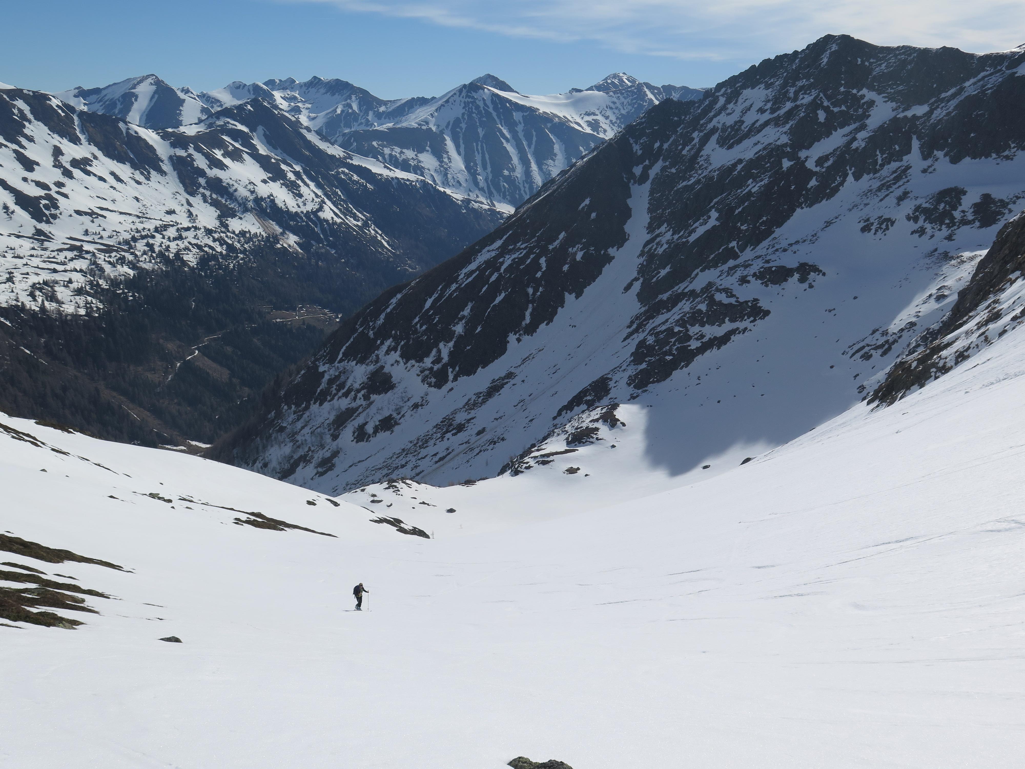Start bei der Kreutzerhütte am Sölkpass. Ski sind bis zur Bachüberquerung zu tragen.Wetter : Sonne, zeitweise hohe Wolken.Schnee : Firn. Einsame Skitour.