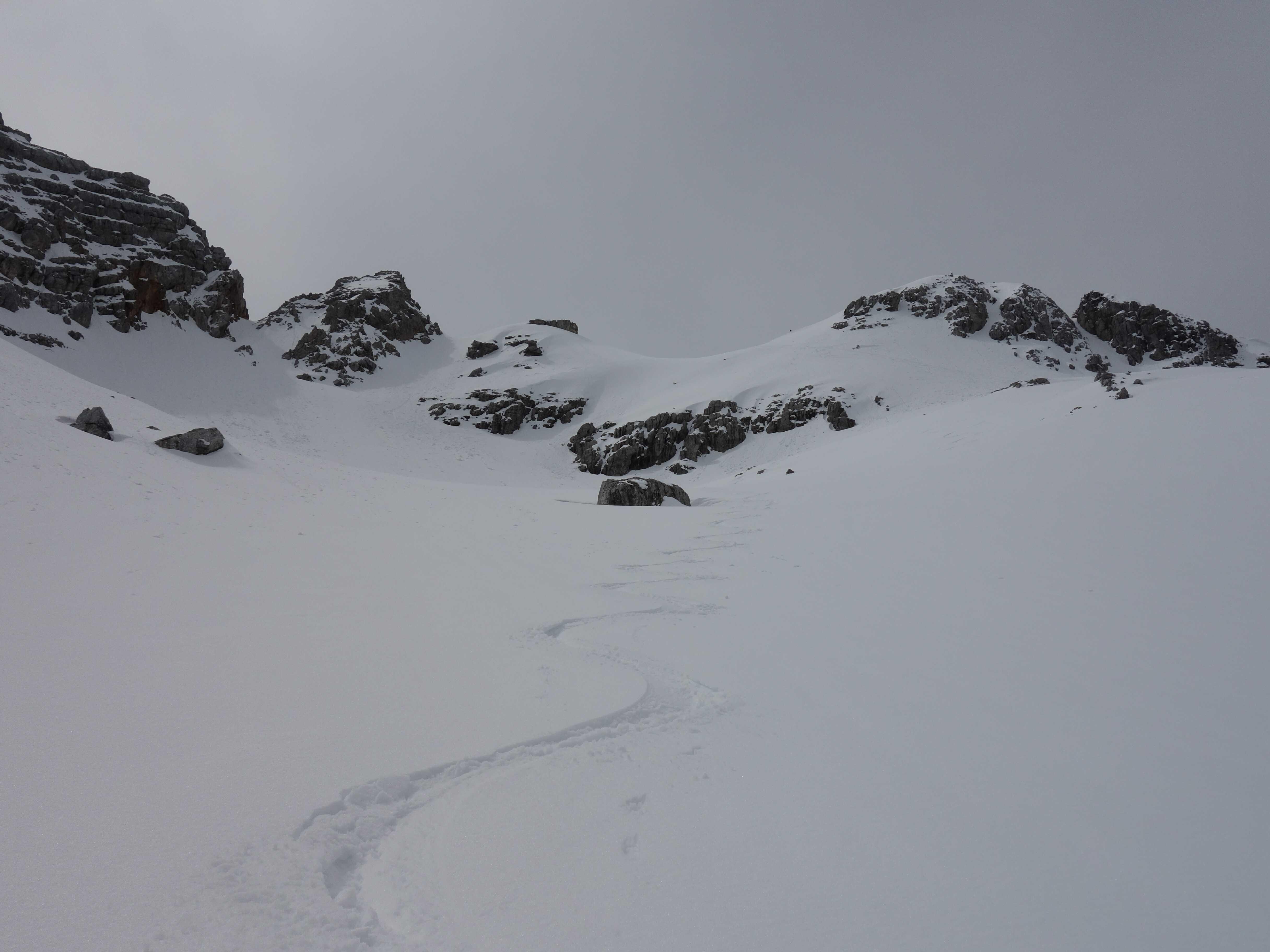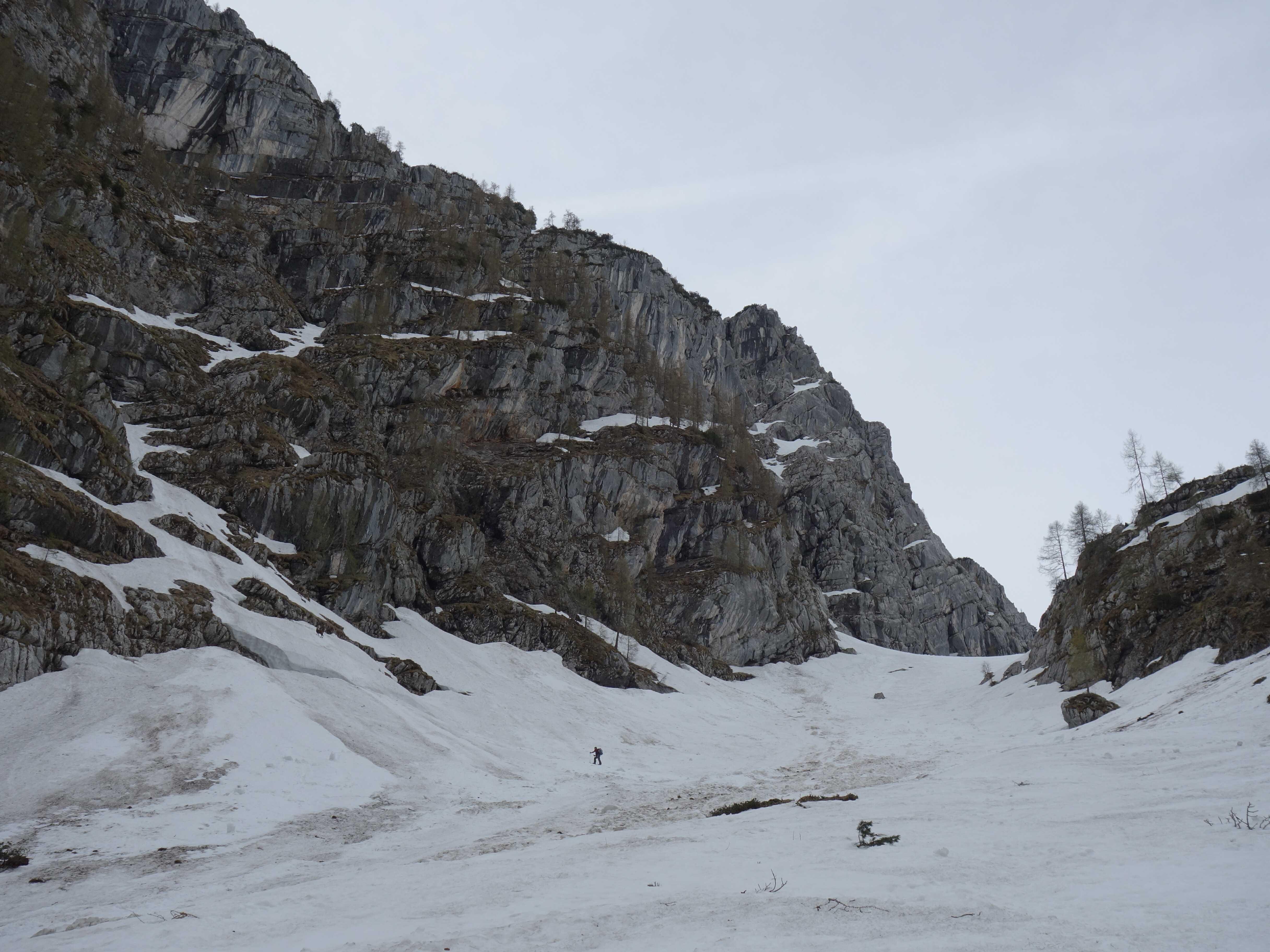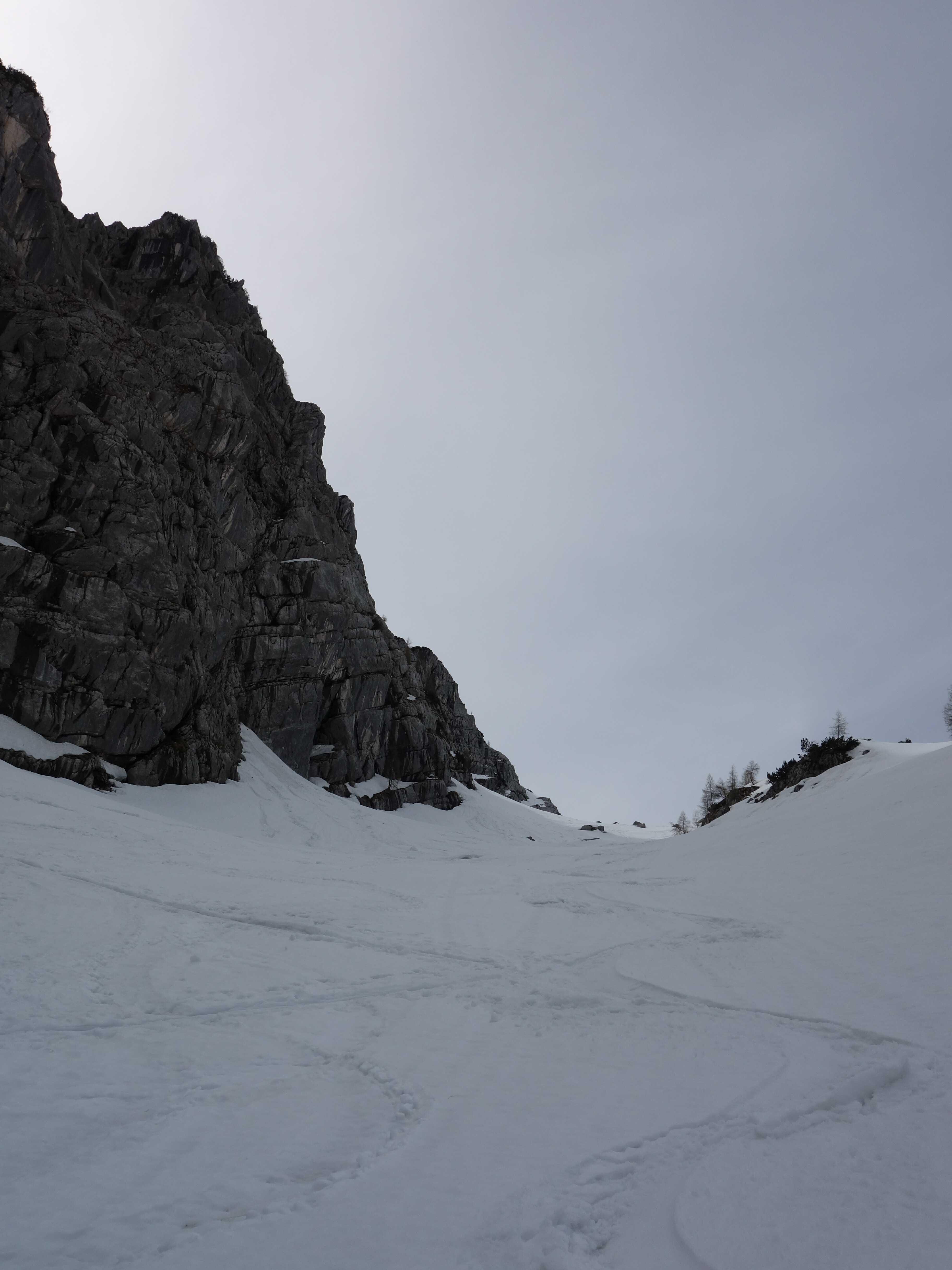 Schneelage: Nach 40 Min Ski tragen (1100) konnte mit Ski weiter aufgestiegen werden. Im untersten Teil der Rinne liegt bereichsweise erdiger Dreck auf dem Schnee. Oberhalb ca. 1400m Sulzauflage, die weiter oben wieder kompakter wurde. Abfahrt ging deutlich besser als im Aufstieg befürchtet.