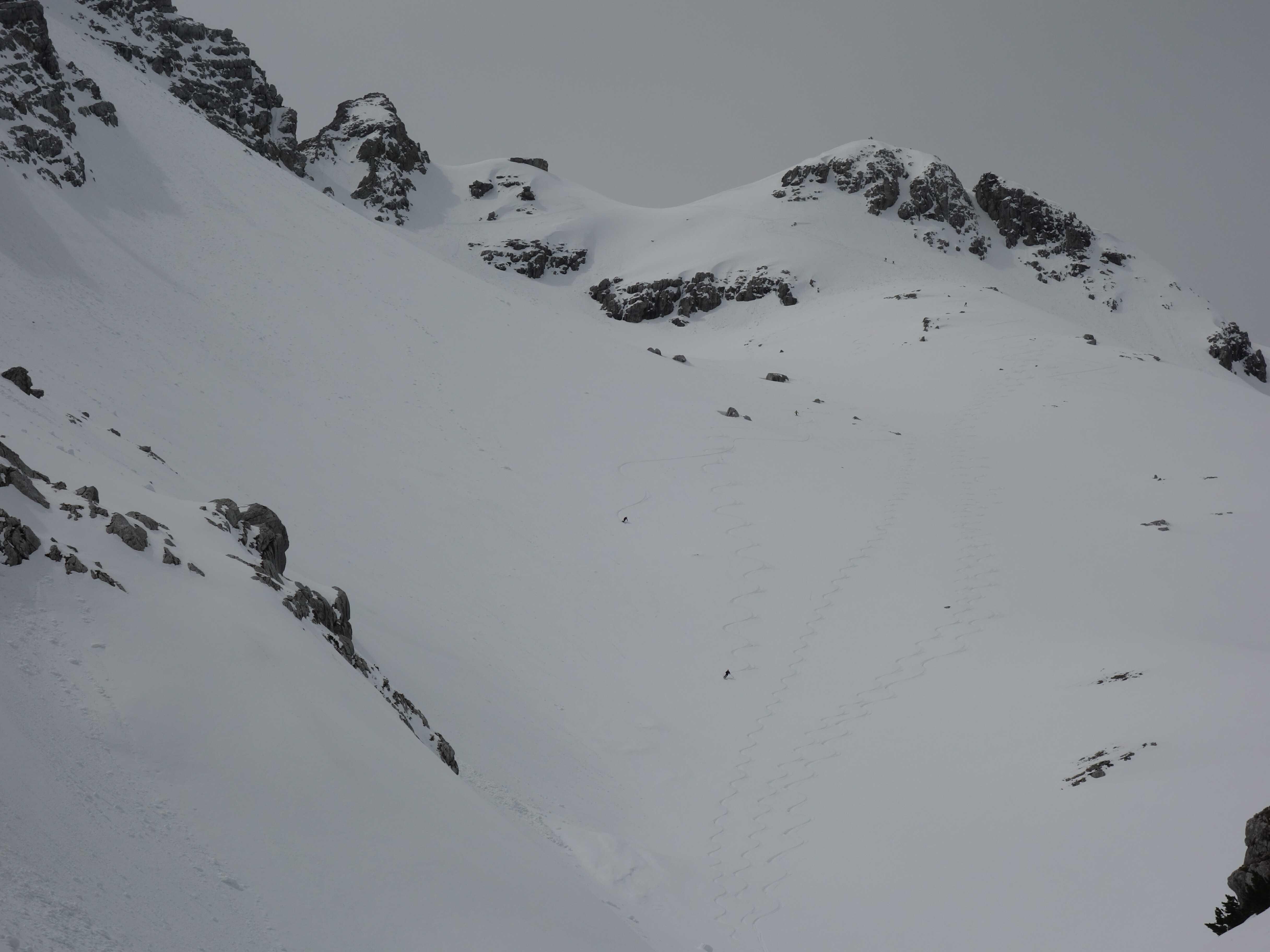 Lawinenbeobachtungen: Keine aktuellen. Oben war der Schnee recht kompakt (Gipfelhang und oberster Teil der Rinne) und gut mit der Unterlage verbunden, dann wurde er nach unten hin immer sulziger, war aber noch ganz gut fahrbar.