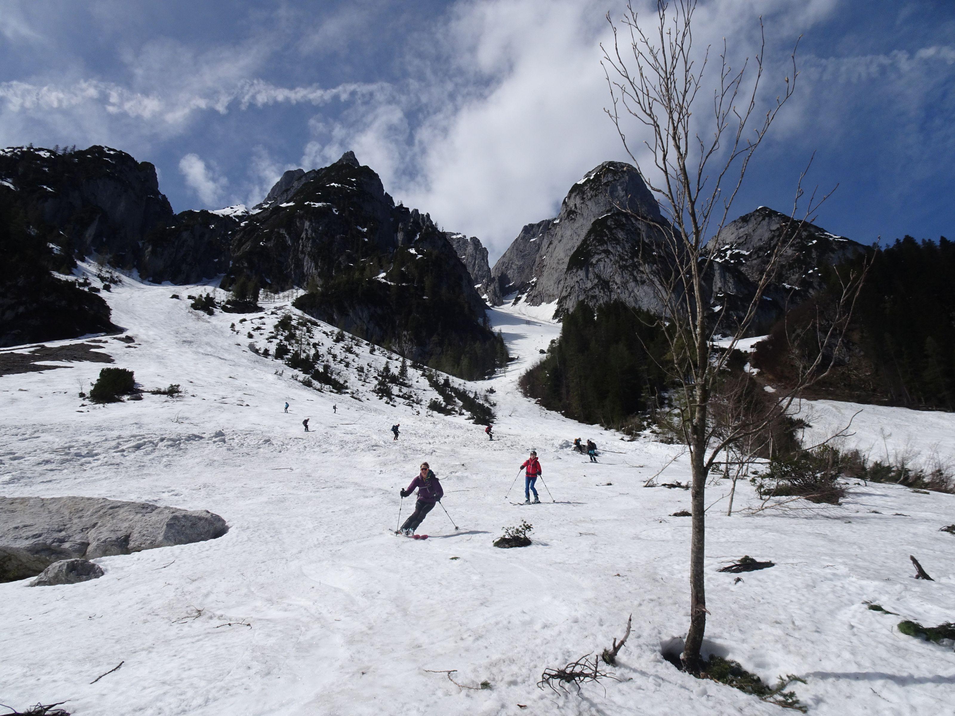 Schnee: griffig, im oberen Bereich Harscheisen angenehm, bei der Abfahrt vorwiegend Firn.