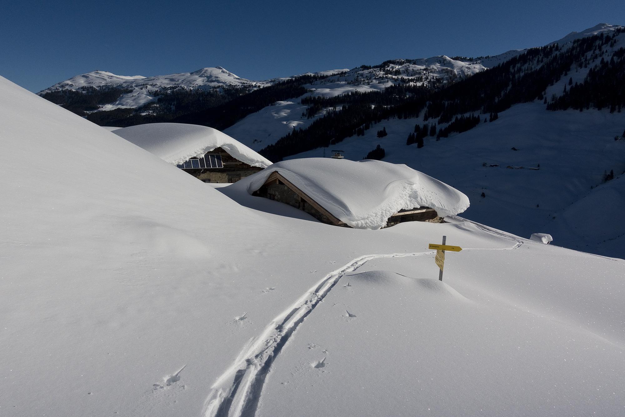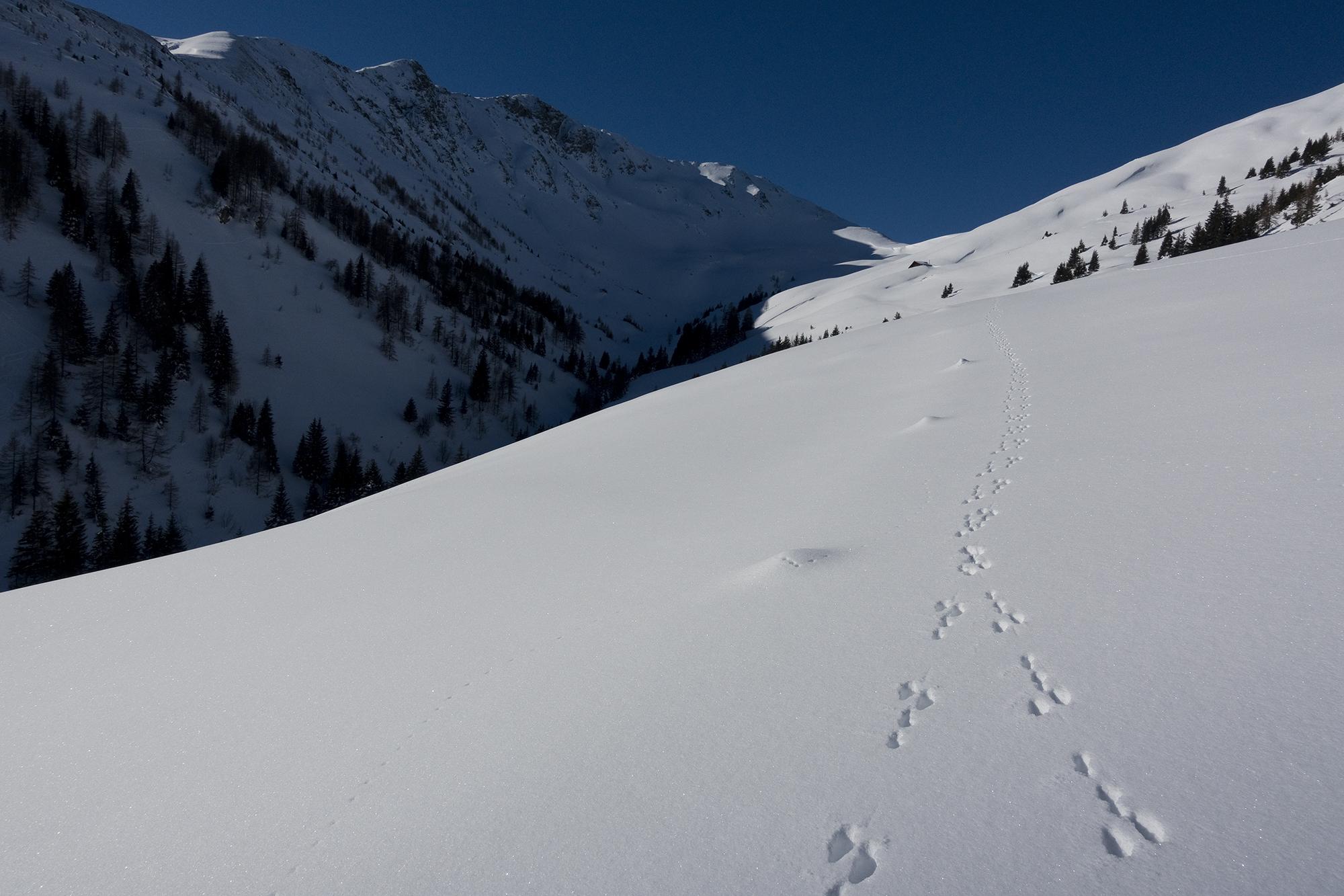 Tief pulvrig verschneit bei besten Verhältnissen ist der Schwarzachgraben. Wenn man bei -13° im Tal startet, möchte man schnell in die Sonne.