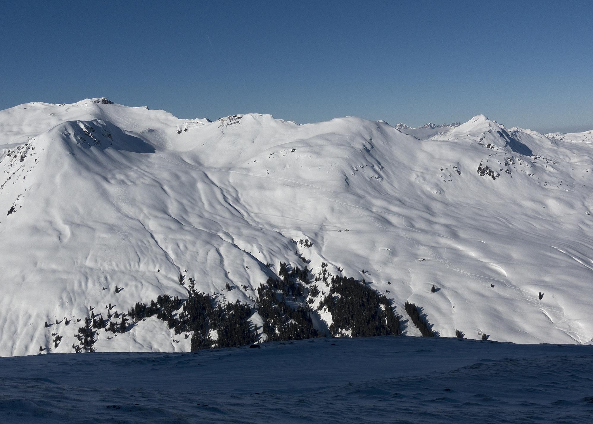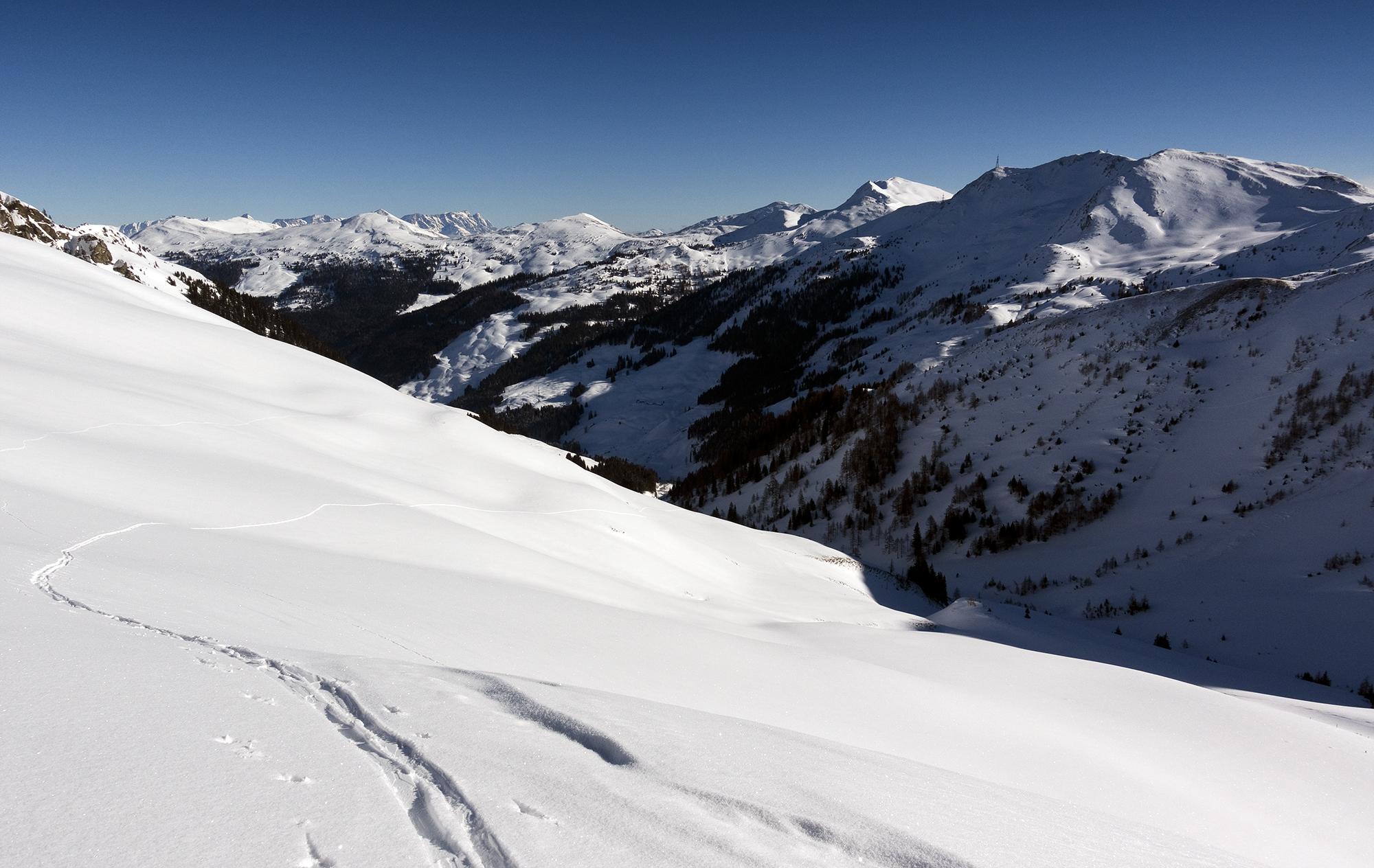 1. Pulver-Abfahrt ostseitig ins Stoffenkar, Wiederanstieg zur Scharte und über den freigewehten NW-Grat zum Manlitzkogel, 2247m.