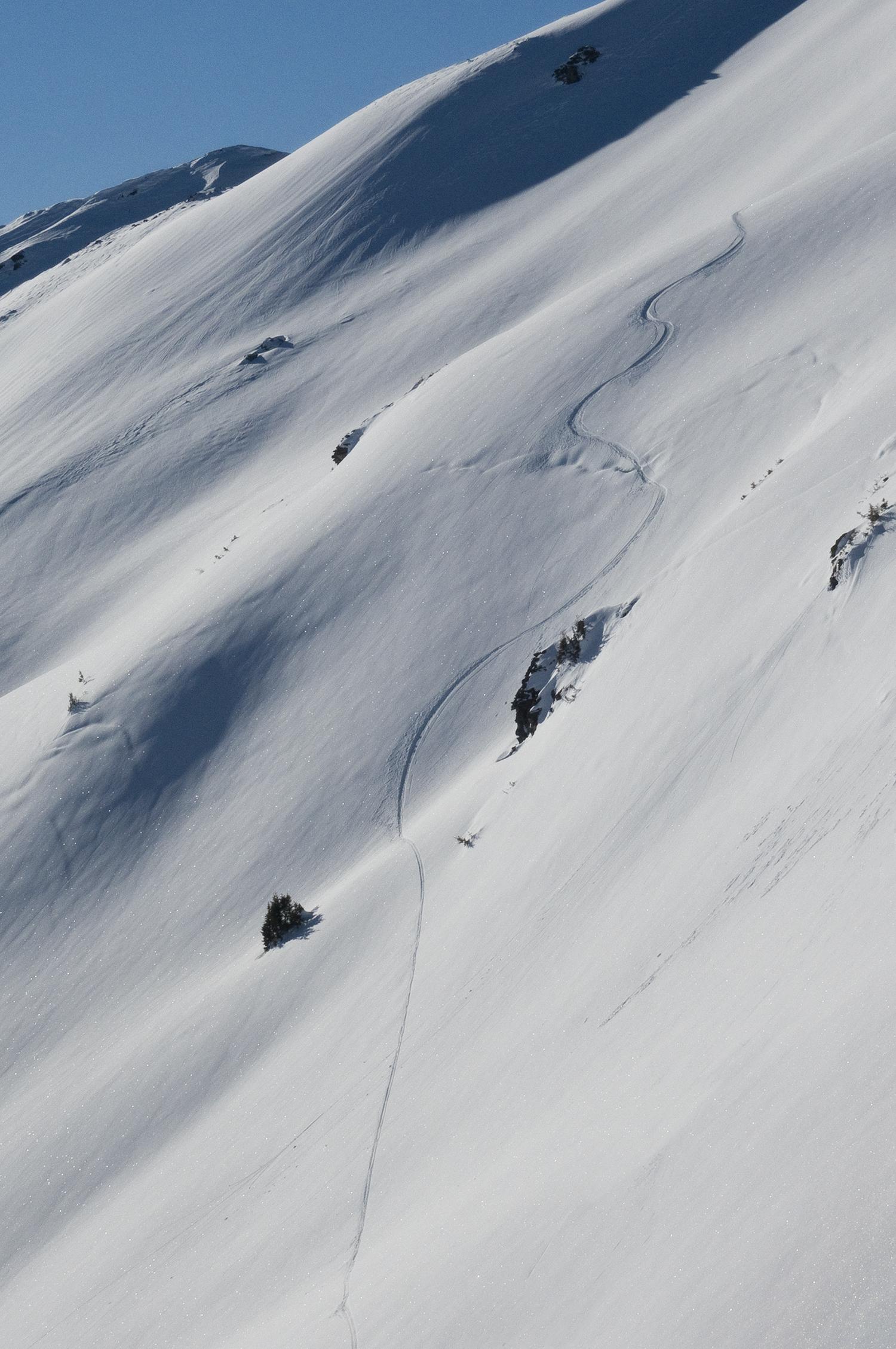 Man kann den wunderbaren steilen Lärchen-N-Hang bis ganz hinunter ins Bachbett stauben, weil das so tief verschneit ist. Ganz mühelos lässt es sich dort fahren bis man am Abzweig zum Bärenkopf rauskommt.