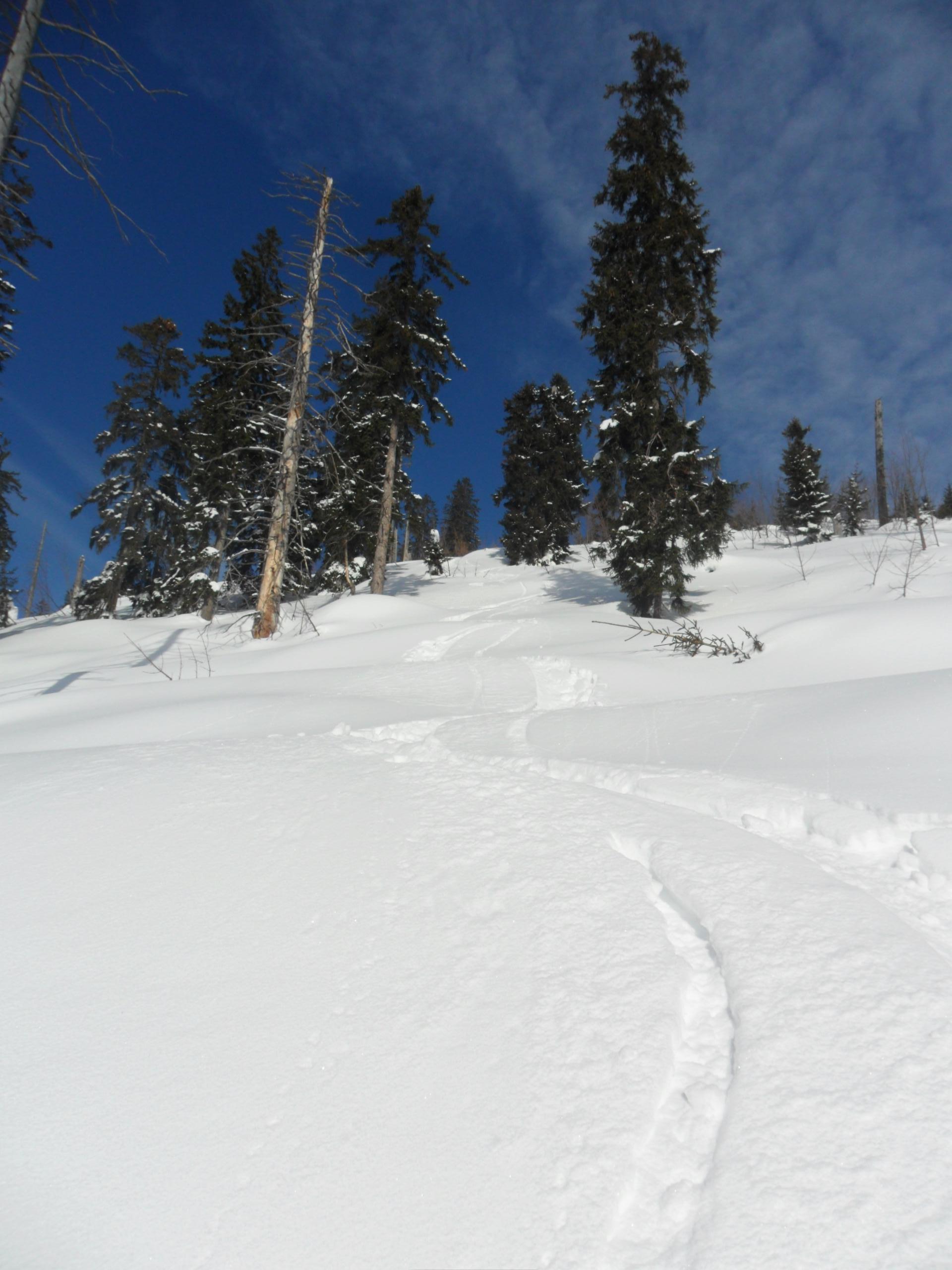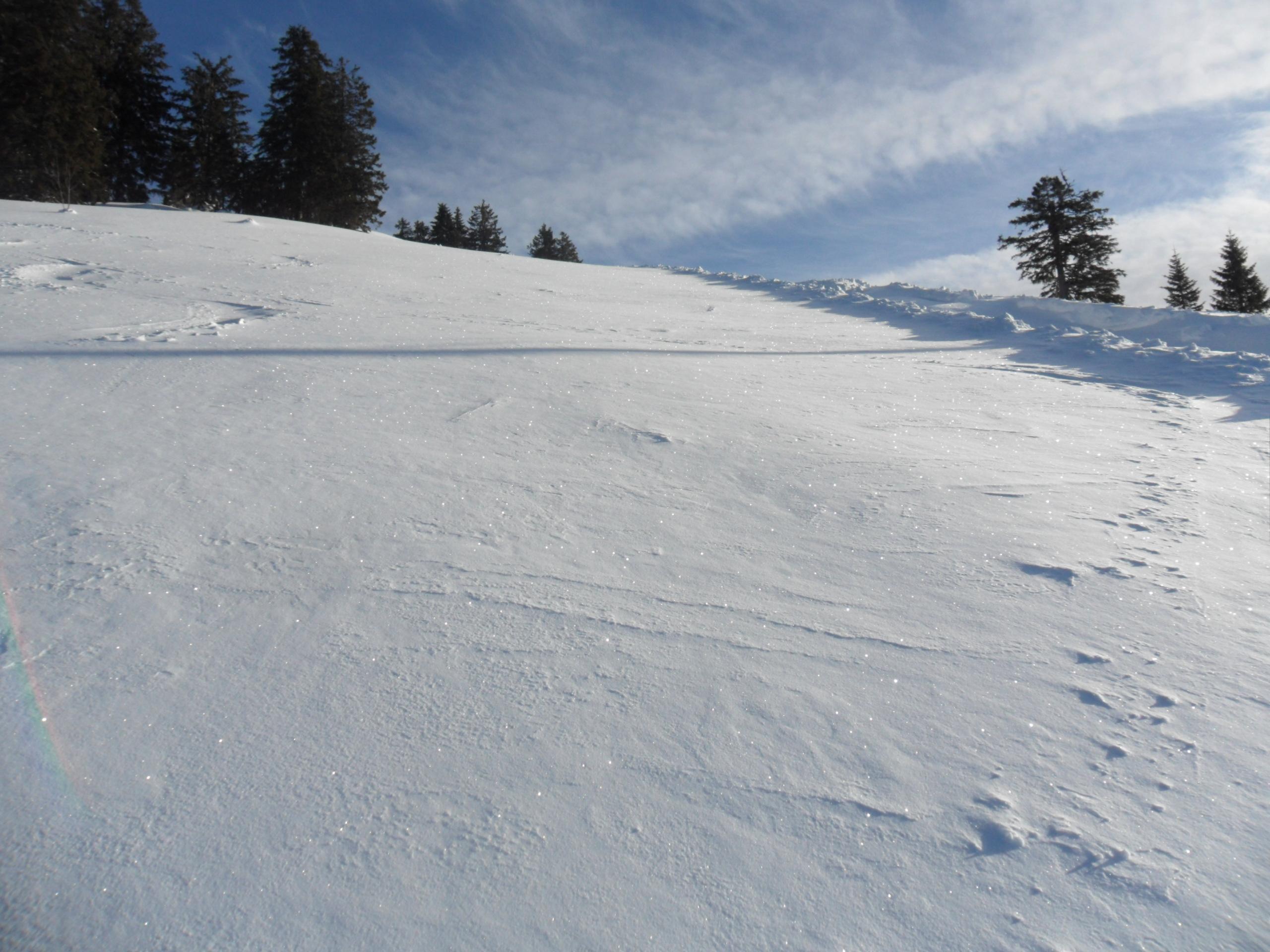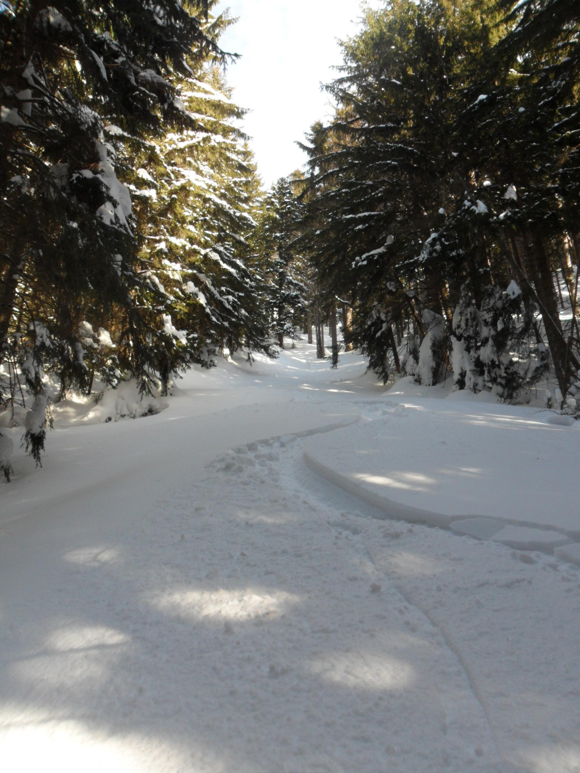 Das obere Almengelände nur leicht angeblasen, bei einer Pulverschicht von ca. 10-20 cm. Richtung Wald wurden es dann schon 30 cm feinster Powder. Von oben bis unten super zum Fahren und mehr gibts da auch schon gar nicht mehr zum Sagen.