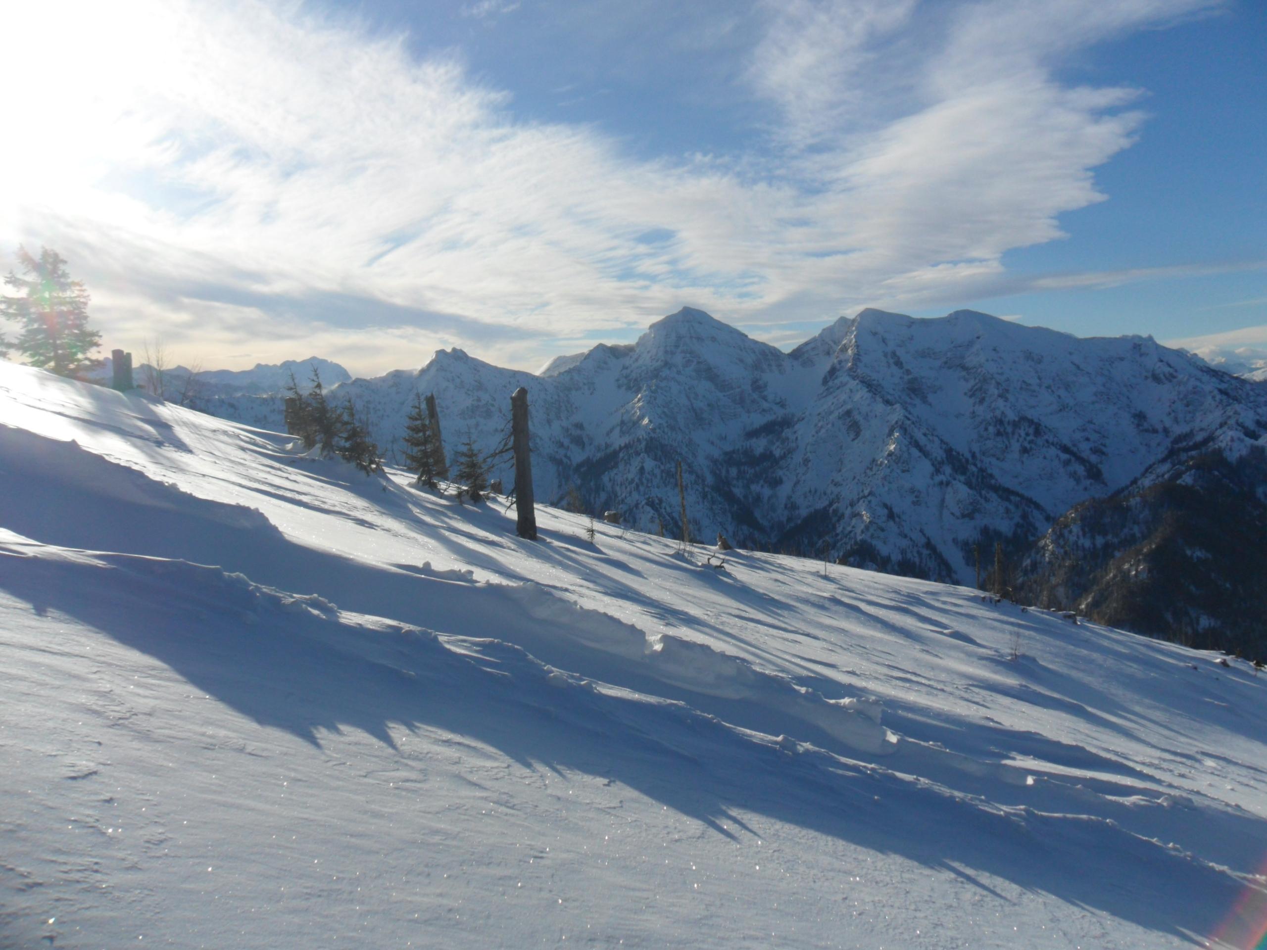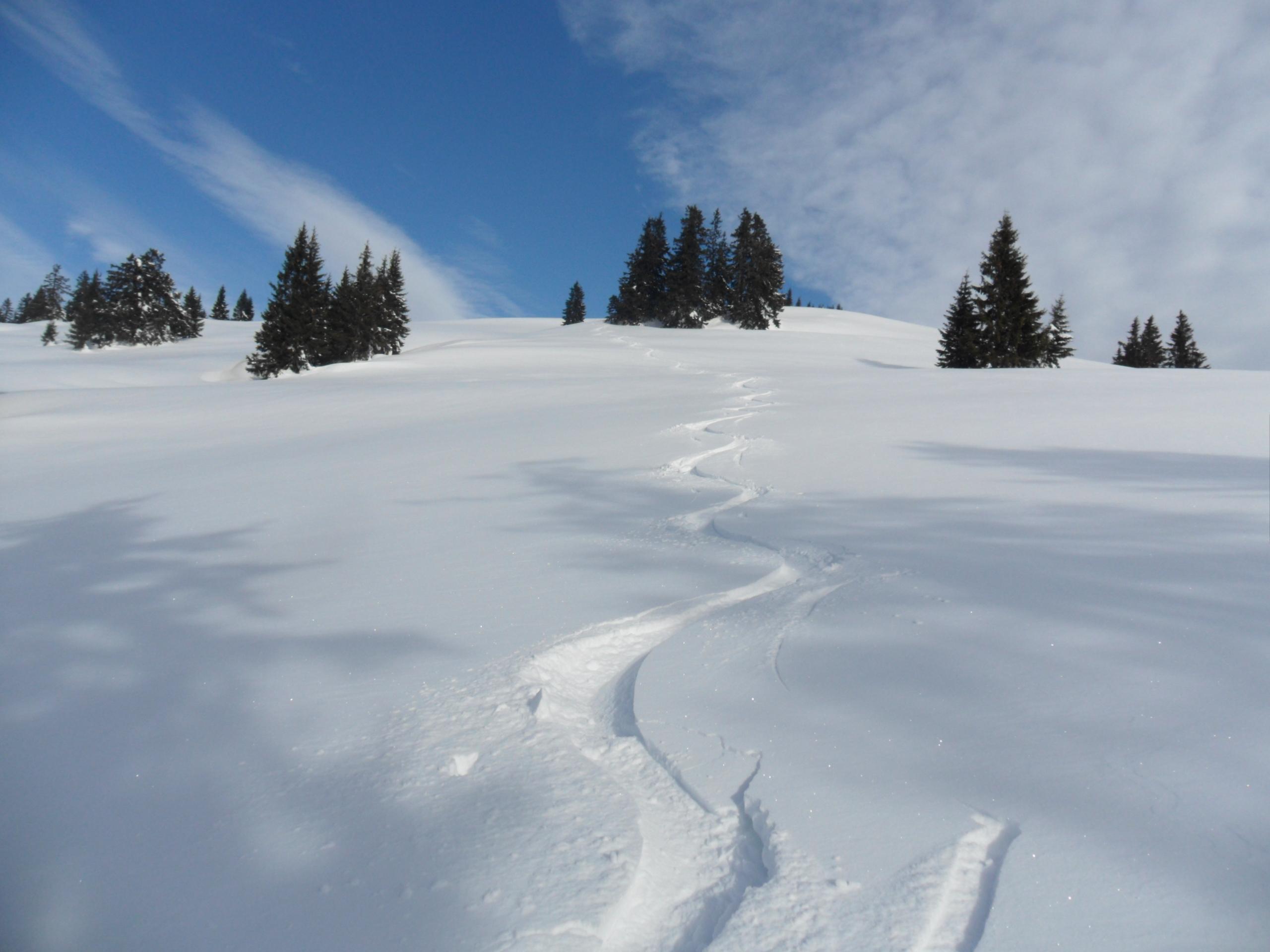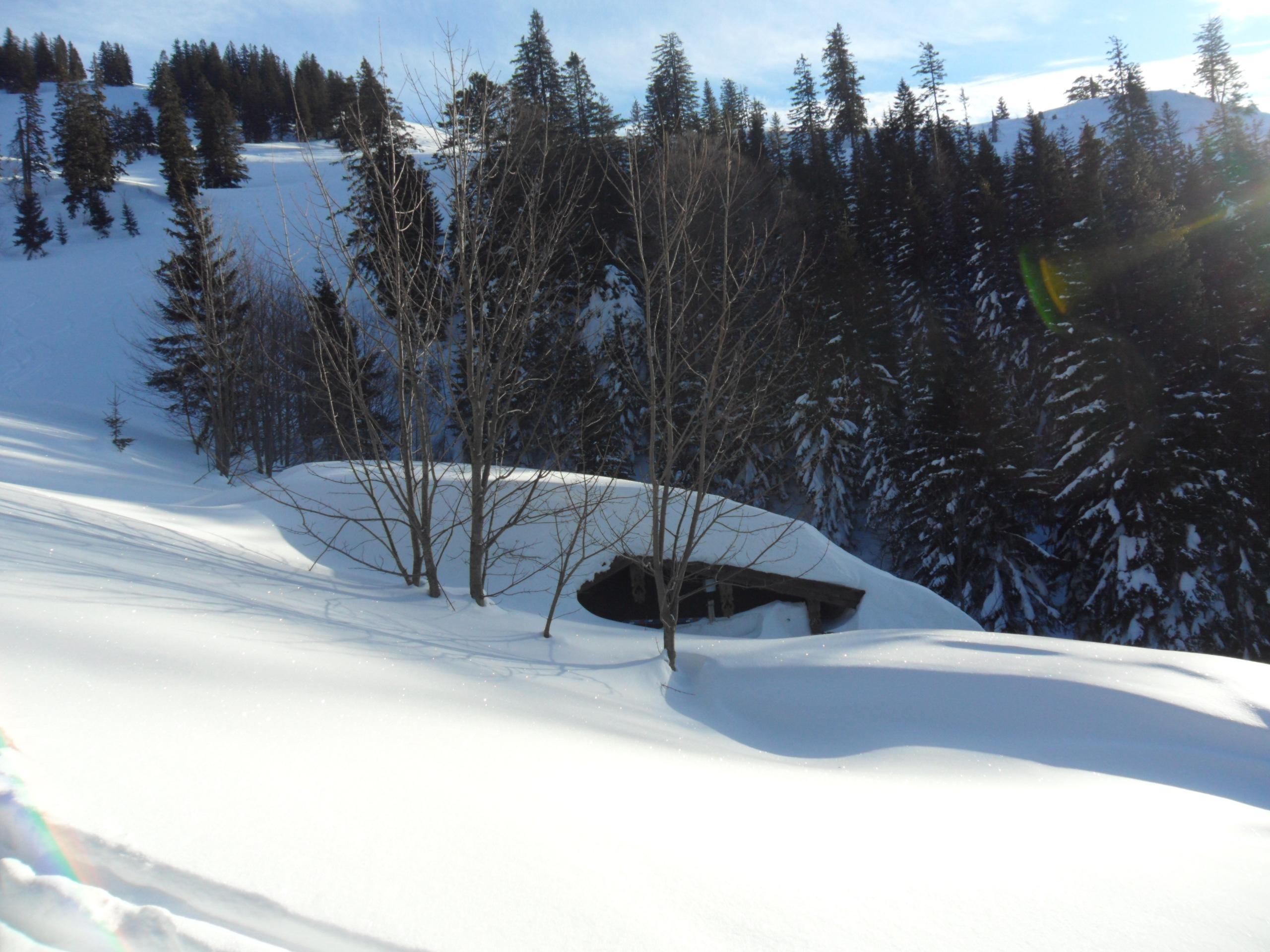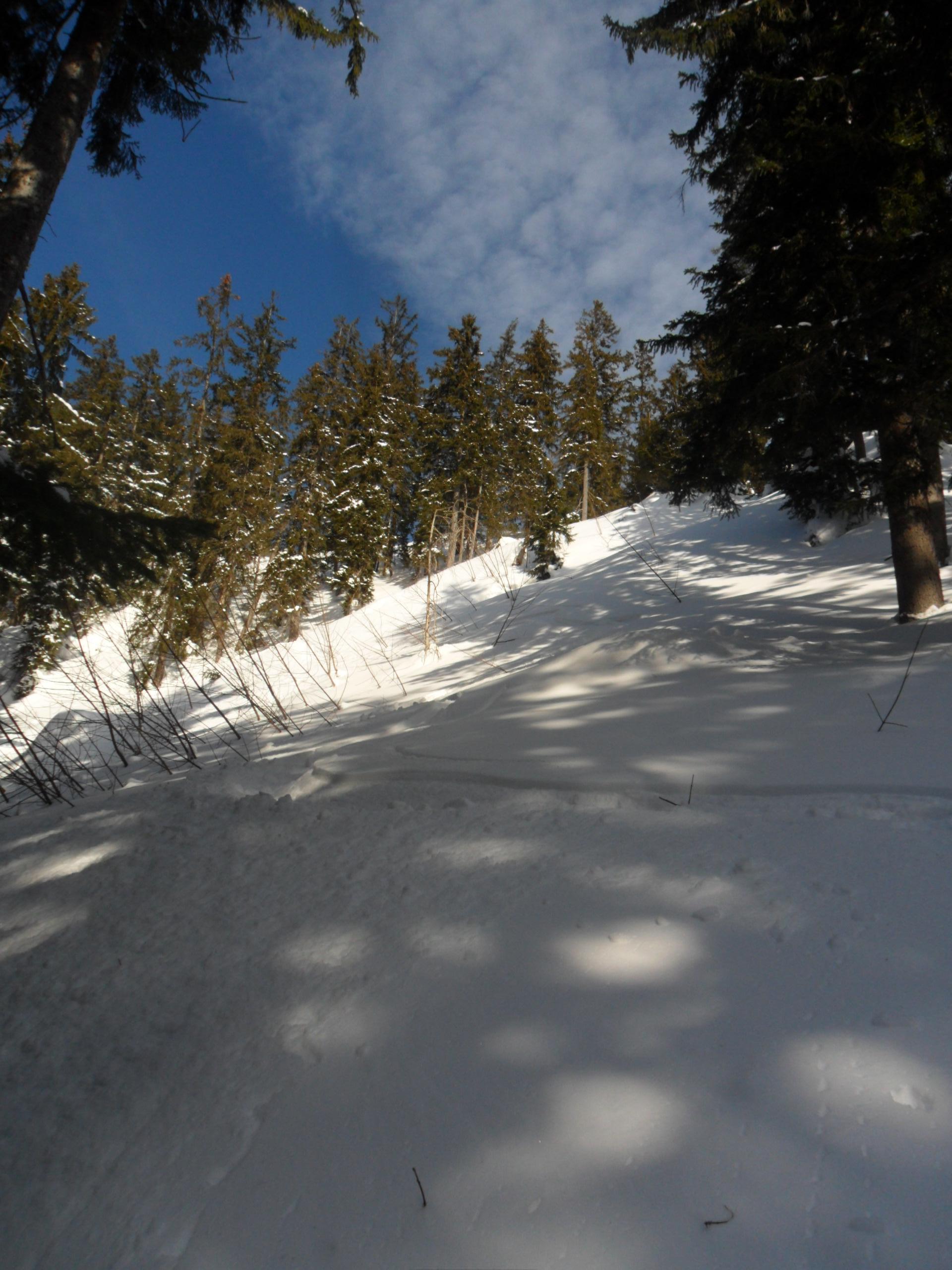 Das obere Almengelände nur leicht angeblasen, bei einer Pulverschicht von ca. 10-20 cm. Richtung Wald wurden es dann schon 30 cm feinster Powder. Von oben bis unten super zum Fahren und mehr gibts da auch schon gar nicht mehr zum Sagen.