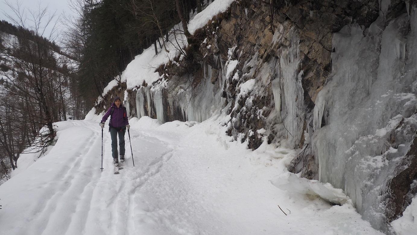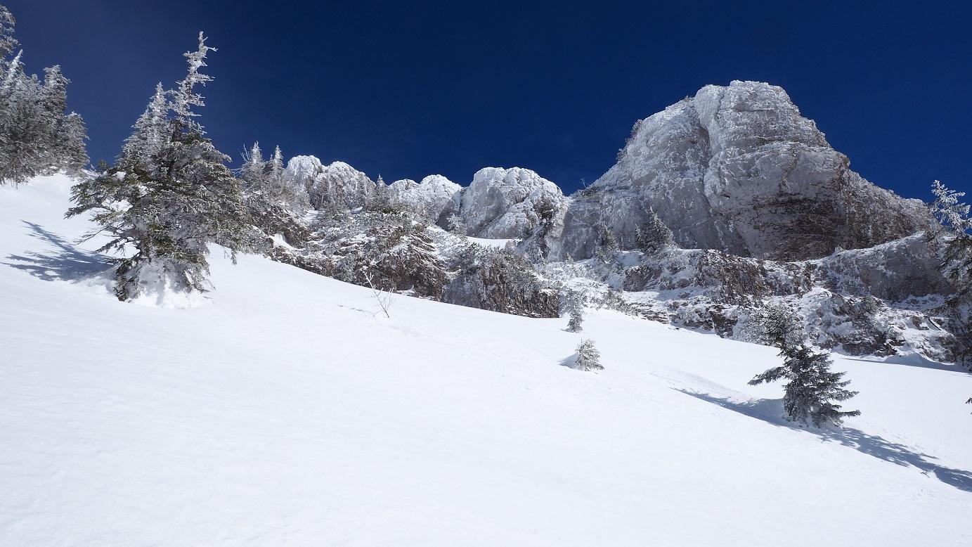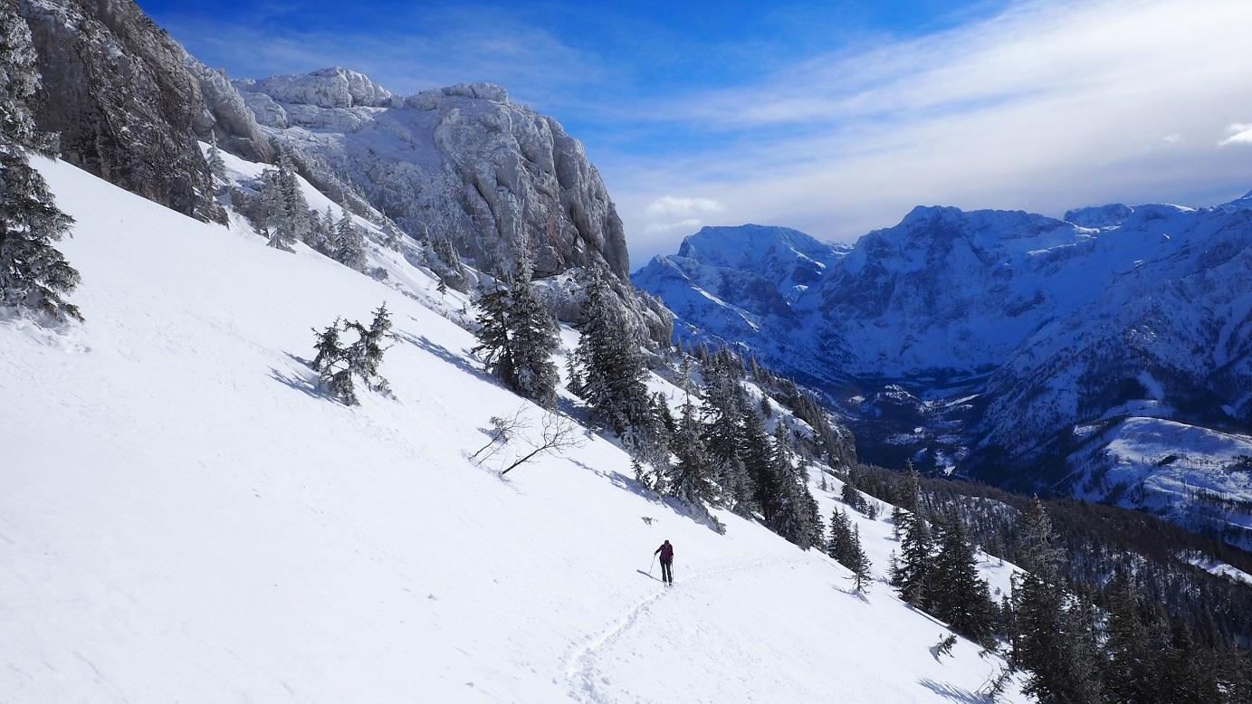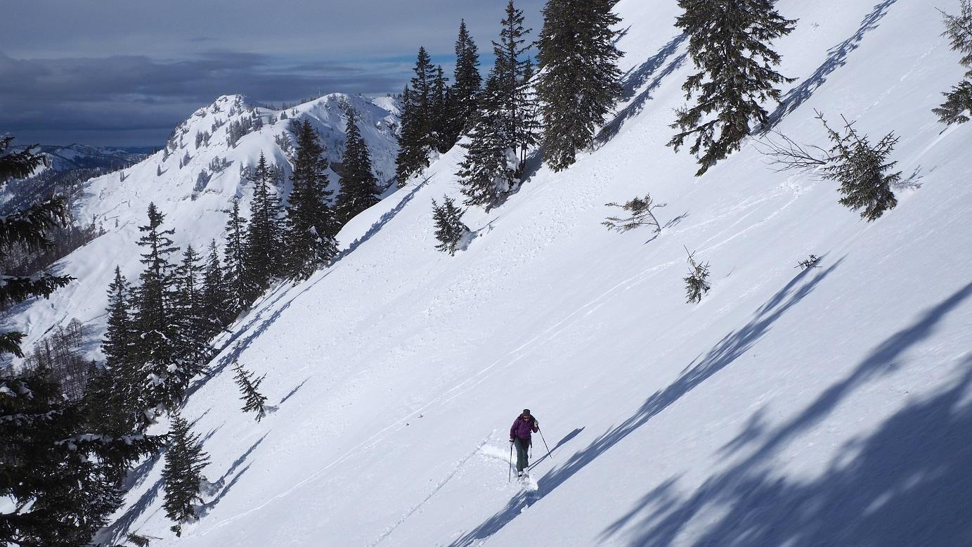 Anstieg vom Wallibachtal, vorweg: keine "normale" Skiroute, nur eine Möglichkeit über die Südwestseite den Gipfel zu erreichen. Lange Tour über die Wallibachhütte und die verfallene Schafalm über die sehr steilen Hänge zum Gipfel. Nur bei entsprechenden Verhältnissen, viel und gut gesetzter Schnee notwendig, Wenn die Ausstiegsrinne eingeweht ist kann der Ausstieg zum Gipfel unmöglich sein.