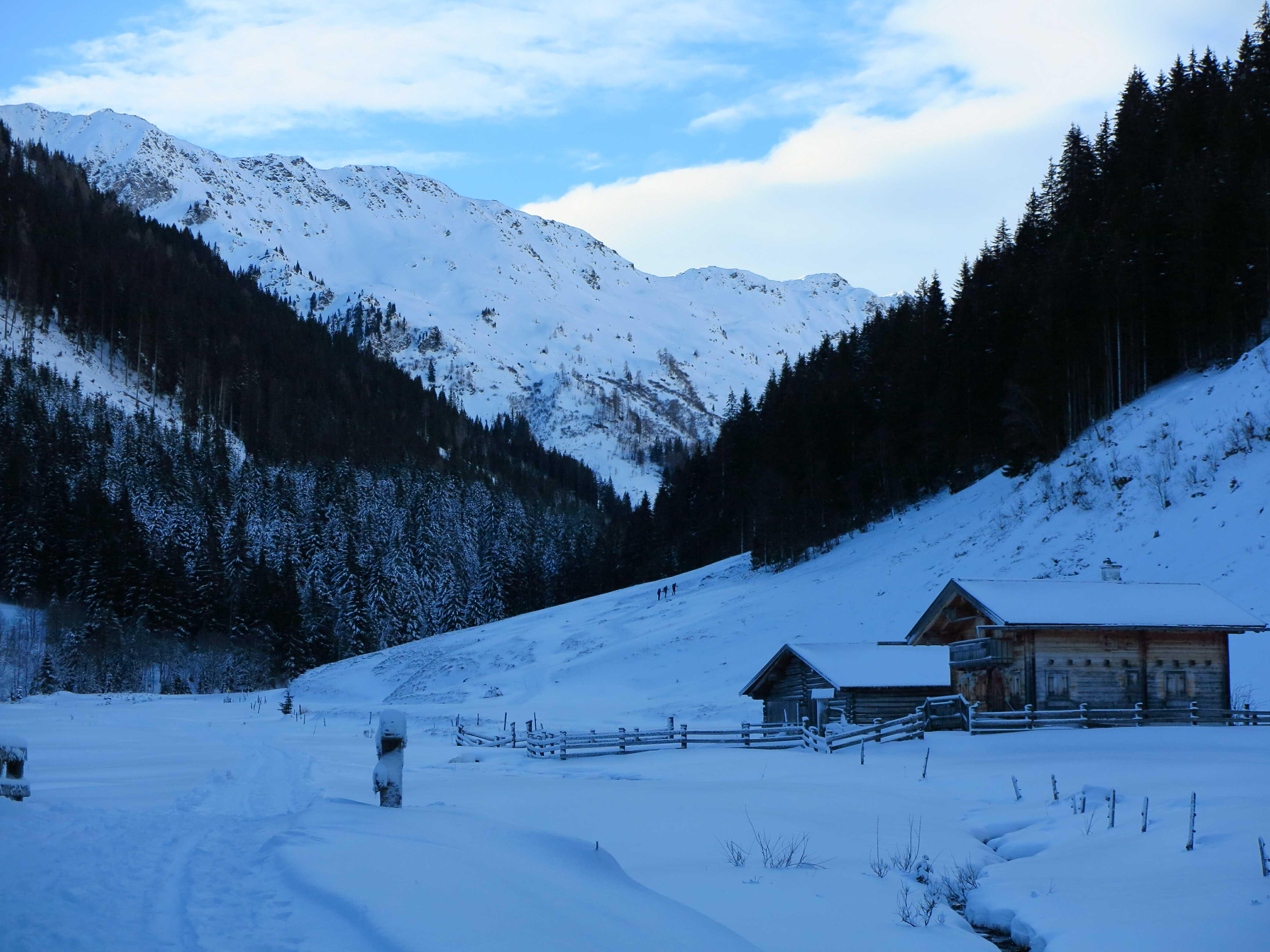 Schneelage: Auch in Lengau, das ja sonst als Schneeloch gilt, hat der Regen ganze Arbeit geleistet Am PP nur ca. 5cm Pulverauflage auf einer verharschten, dünnen Altschneeunterlage. Im Vogelalmgraben ab der Saalhofalm hat dann der Wind noch seines dazu beigetragen, dass man als Skitourer nicht vom Pulver zu verwöhnt wird. Der Aufstieg über die Saalhofhochalm hat durwegs wenig Schnee und der ist noch mehr oder weniger vom Wind behandelt (gepresst oder ganz verblasen). Das Stefflkar ist ebenfalls großenteils windgepresst, aber noch einigermaßen gut fahrbar. Am besten gings in den hinteren Vogelalmgraben hinab, je tiefer man kam, desto pulvriger wurde es.