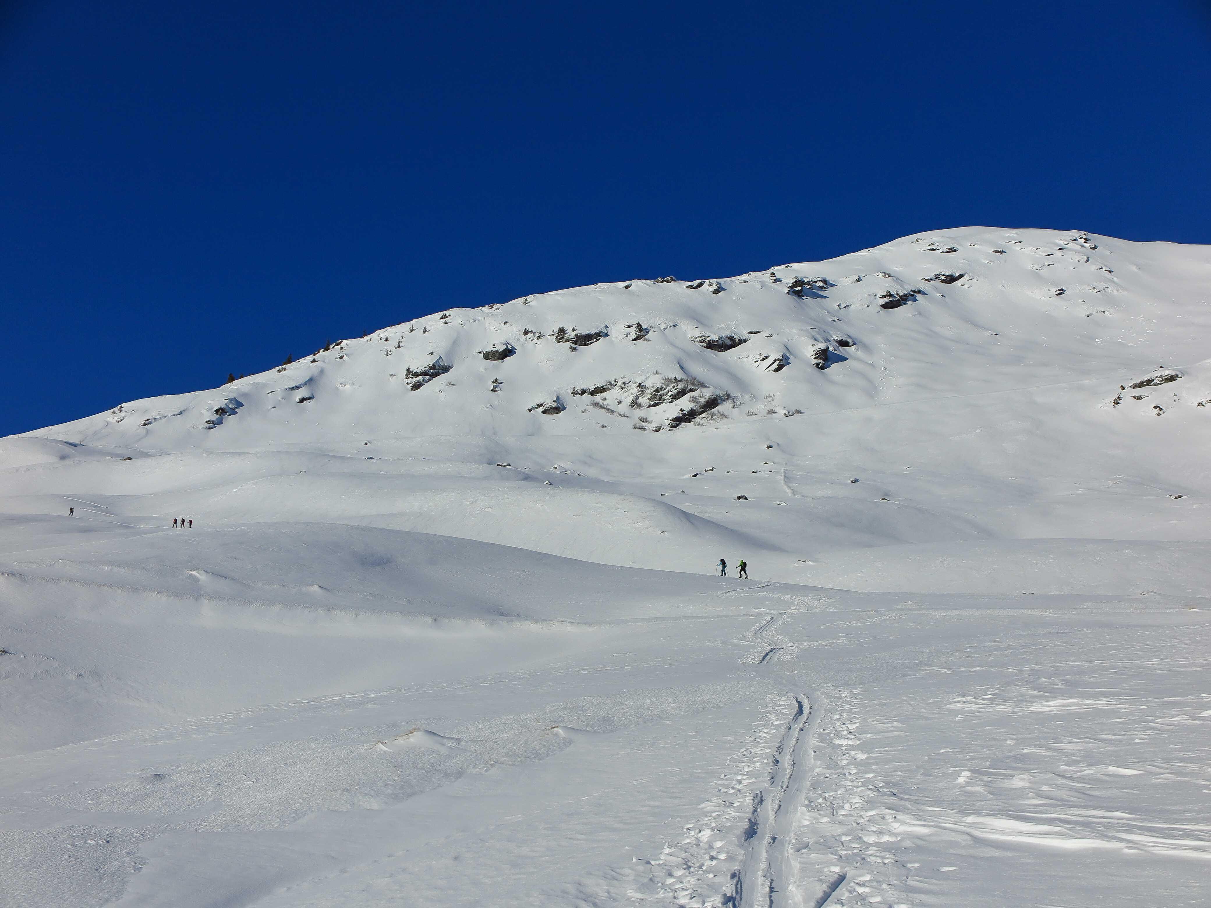 Von Hinterglemm/Lengau (1160) auf der üblichen Route über die Saalhofalm zum Schusterkogel (2207). Abfahrt in den hinteren Vogelalmgraben.