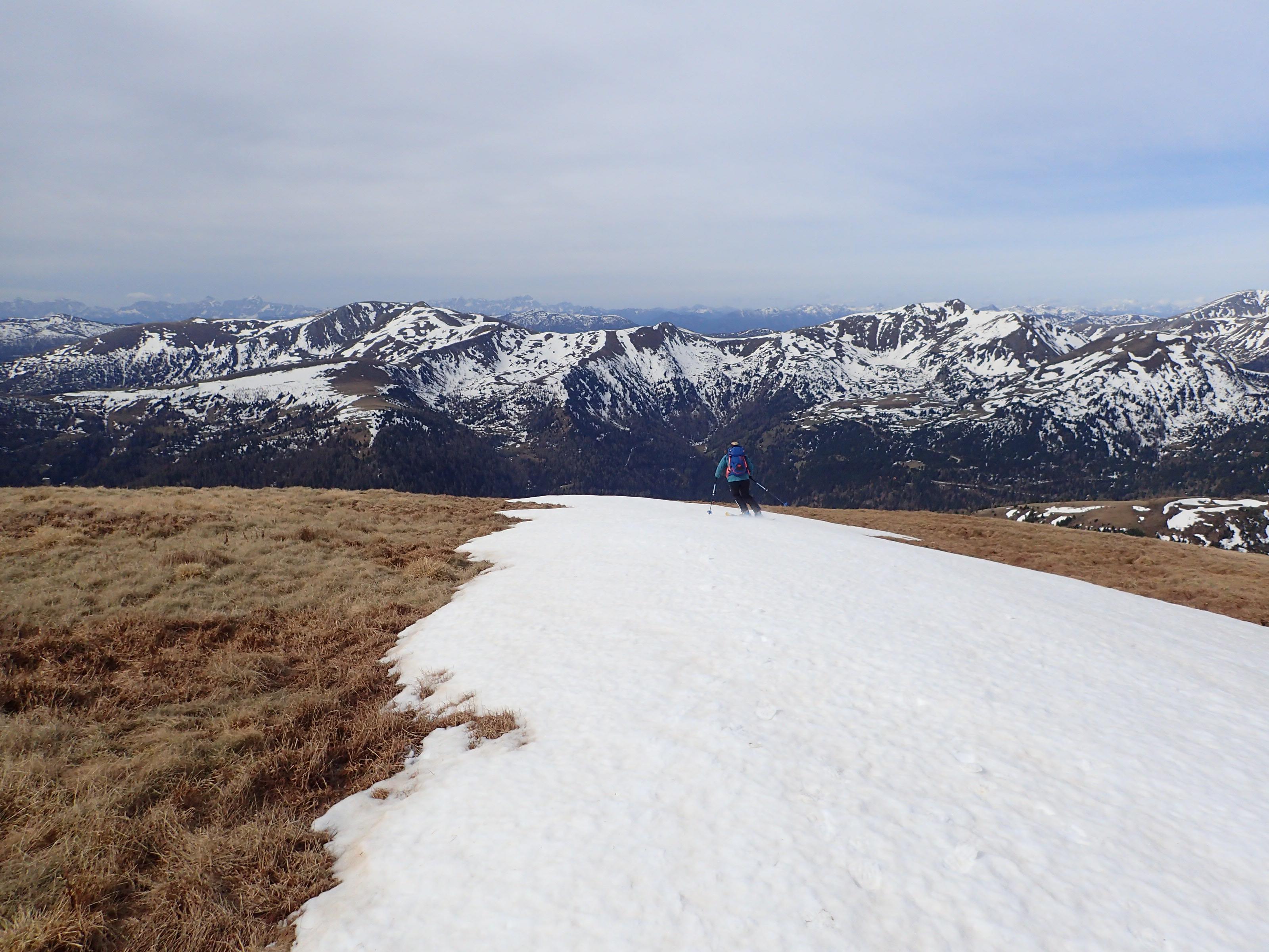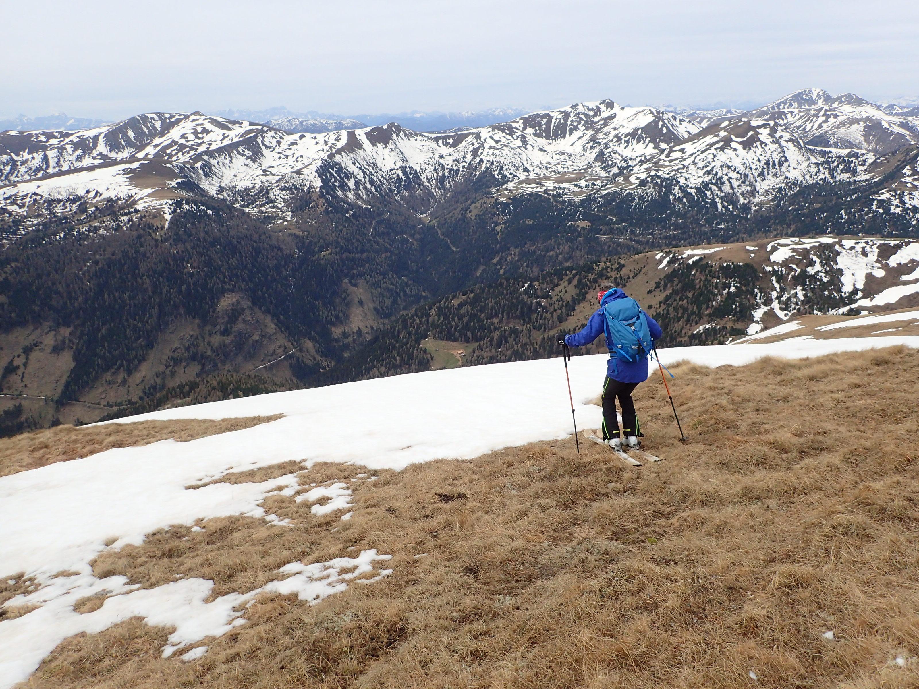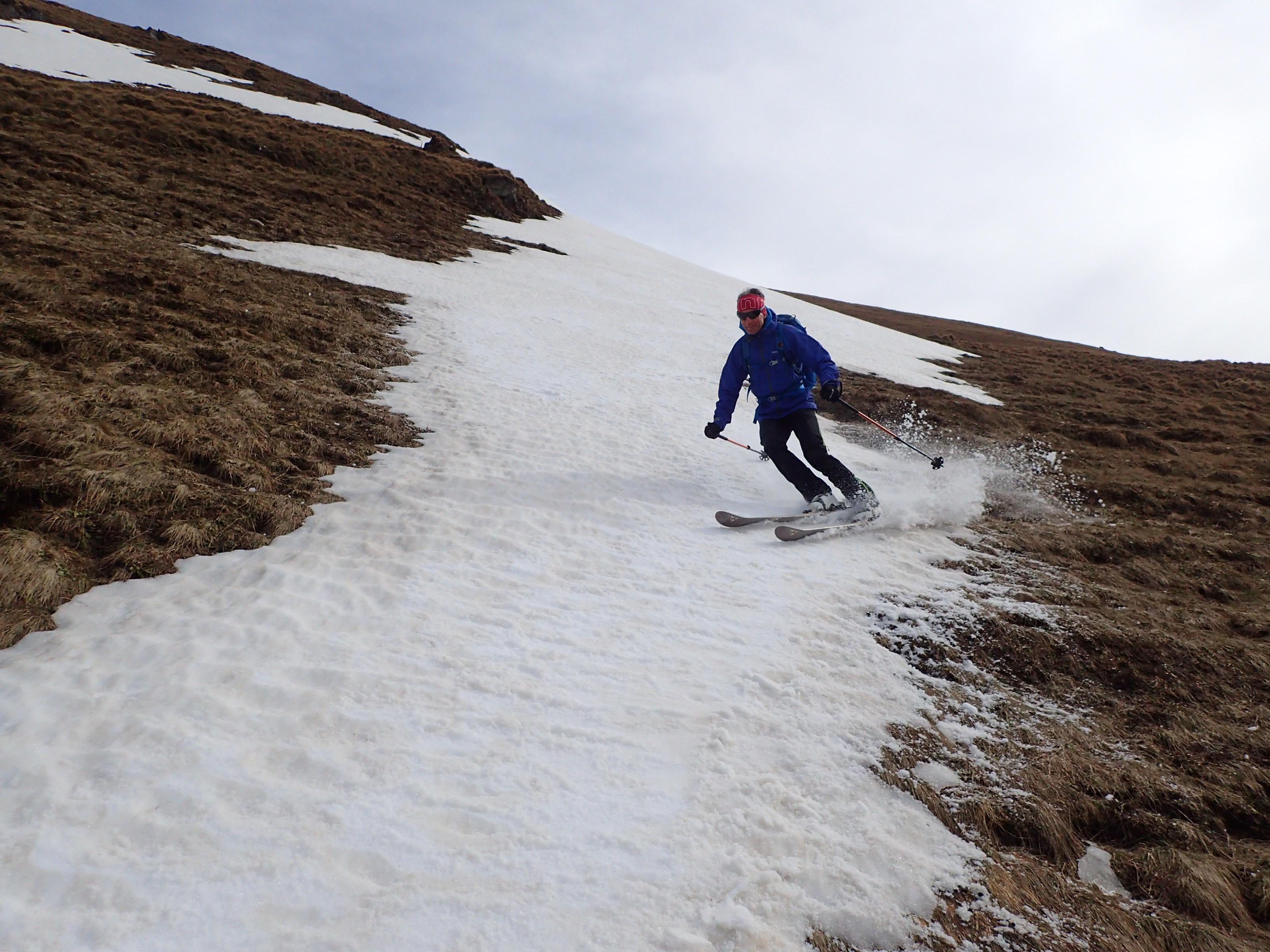 Eine Webcam war die Inspiration für die eine oder andere steile Rinne auf der Turrach. Etwas erstaunt sind wir, dass heute die Kornockbahn noch fährt, wenn auch der letzte Tag und nur am Vormittag. Aufstieg daher am Pistenrand zum Kornock. Auf der Webcam konnte man nur den oberen Teil der Rinnen einsehen, vor Ort müssen wir leider feststellen, dass unten bereits alles aper ist. Also vorerst vergeblich, unsere Rinnensuche. Sicherheitshalber nehmen wir die Ski doch mit auf den Rinsennock. Dort ebenfalls Schneesuche. In der Südwestflanke schaut es von oben dann so aus, als ob wir wenigstens ein Stück weit abfahren könnten. Und tatsächlich: Zwei relativ breite Schneestreifen ziehen mit einer kurzen Unterbrechung etwa 300 HM weit hinunter, bis der Schnee inmitten steiler Wiesenhänge abrupt zu Ende ist. Hart, gutgriffig und stellenweise bis knapp 40 Grad. Gegenanstieg Skitragen. Weil wir schon einmal da sind und sonst nix mehr geht, fahren wir die gleiche Strecke nochmals hinunter, jetzt im feinen Firn. Gegenanstieg zurück, diesmal mit Ski, der Firn macht´s einfacher. Nun sollte auch die bis ca. 45 Grad steile Nordwestrinne zur Winkleralm aufgefirnt haben. Von der Einfahrt in die Rinne bis zum Auslauf auf Höhe der Alm finden wir tatsächlich besten Firn vor. Wir sind begeistert, weil das so gut geklappt hat. Auch der während des Aufstieges zum Rinsennock nicht einsehbare Rinnenteil ist durchgehend befahrbar. Gegenanstieg nochmals Skitragen, zuletzt mit Steigfellen über die nun menschenleere Piste zum Kornock, wo wir sogar in der Sonne sitzen können. Abfahrt über die Firnpiste bis zum Auto. Alles in allem sind es dann doch noch etwas über 1500 Höhenmeter geworden.