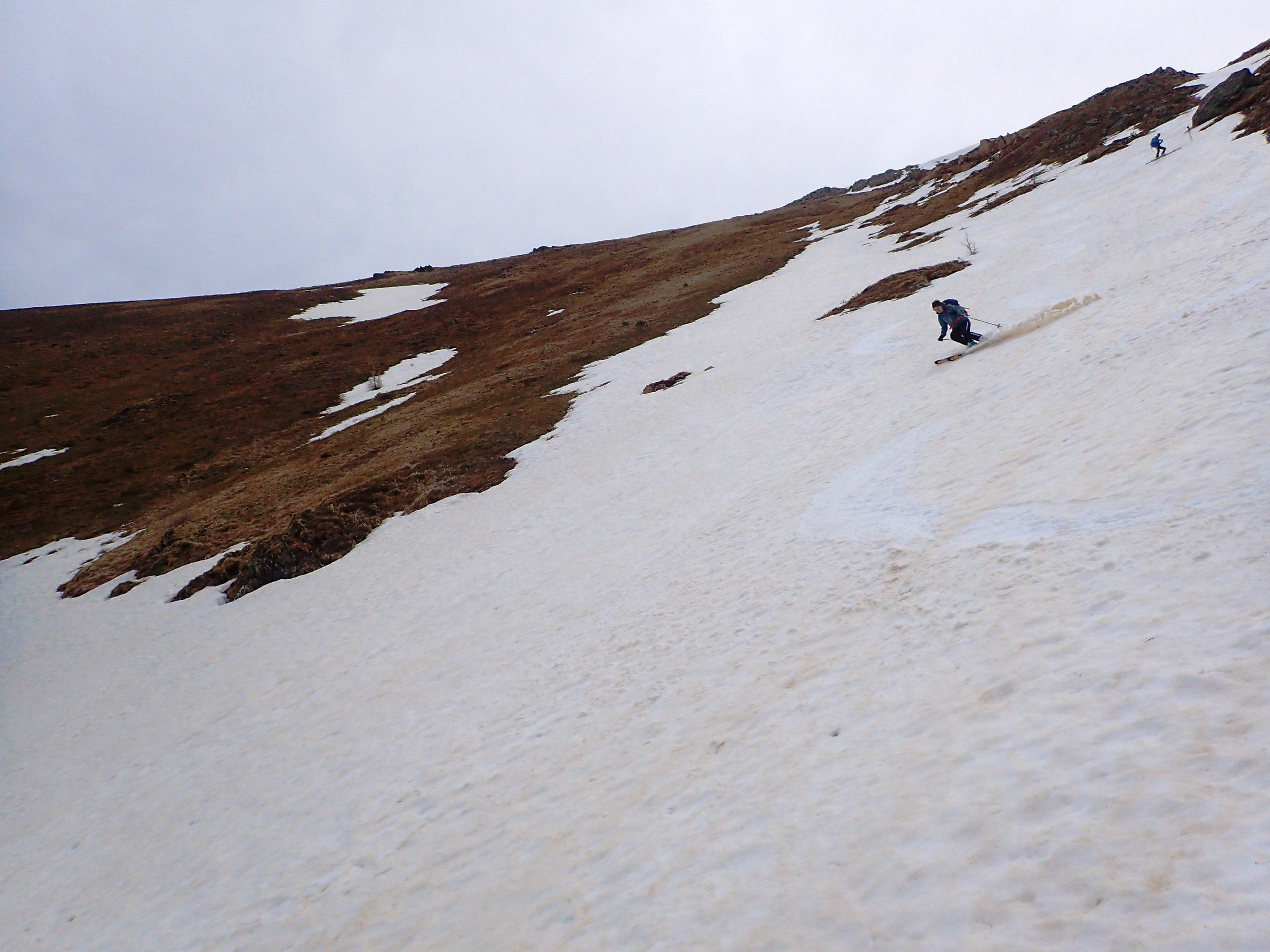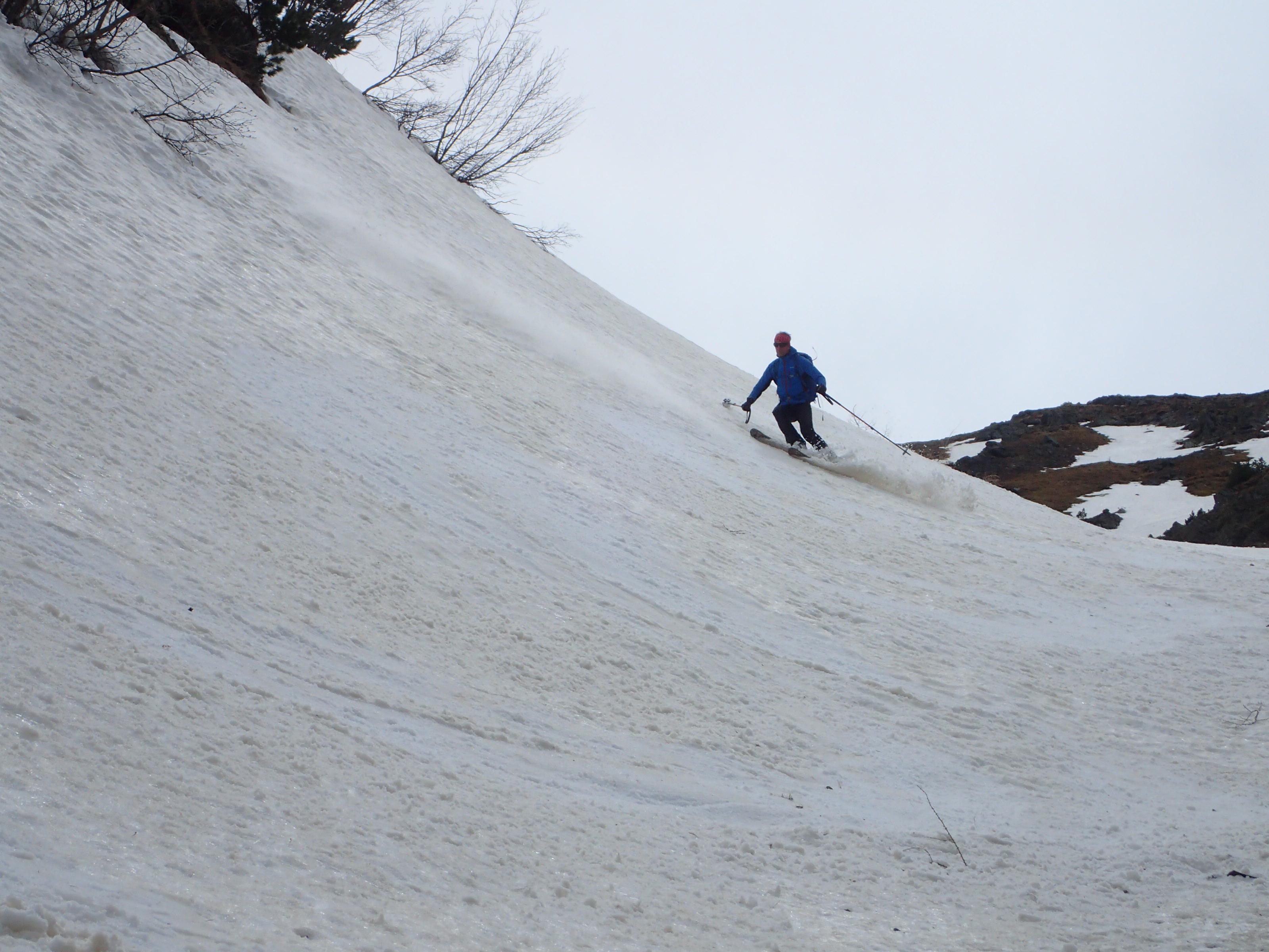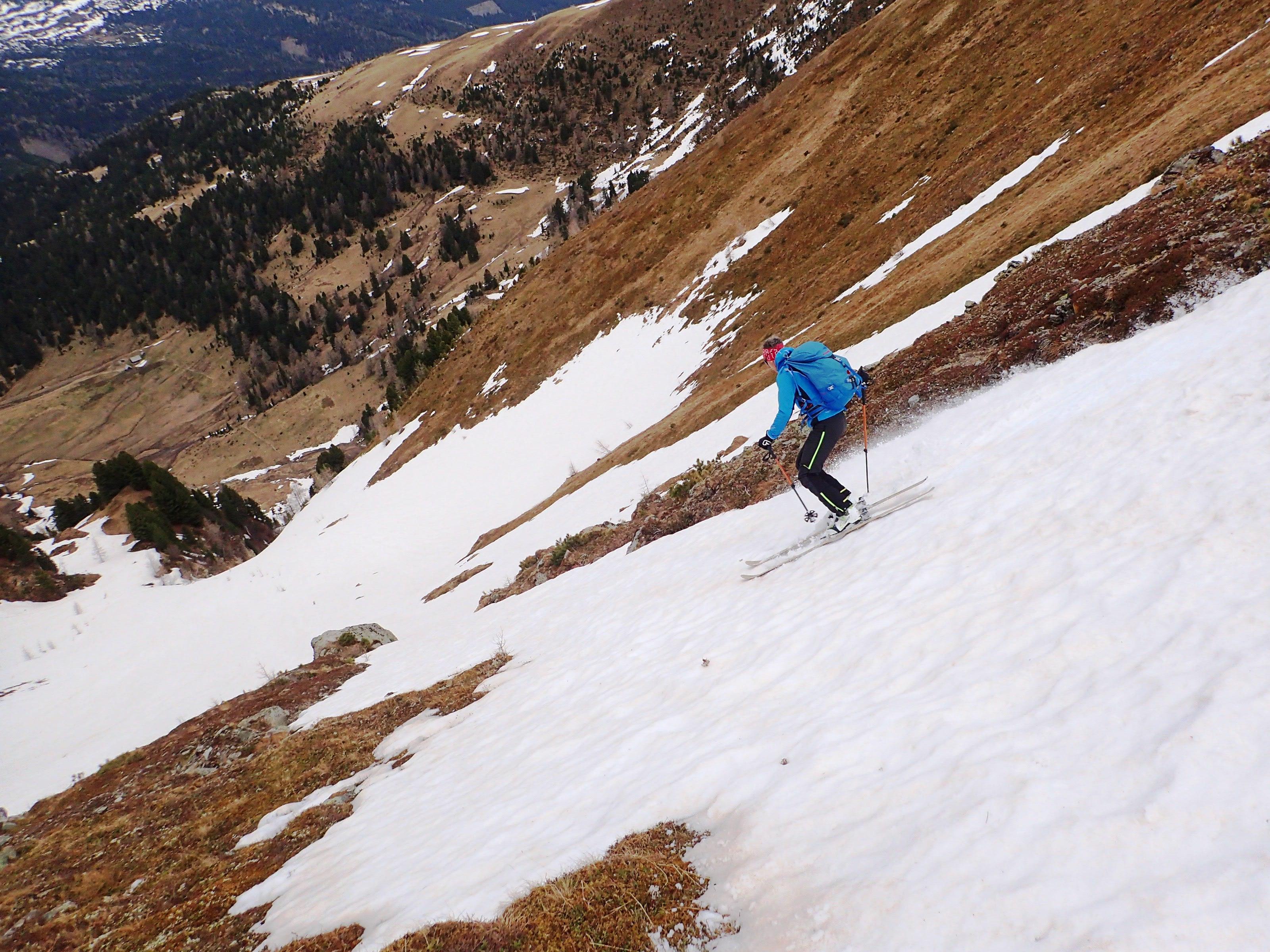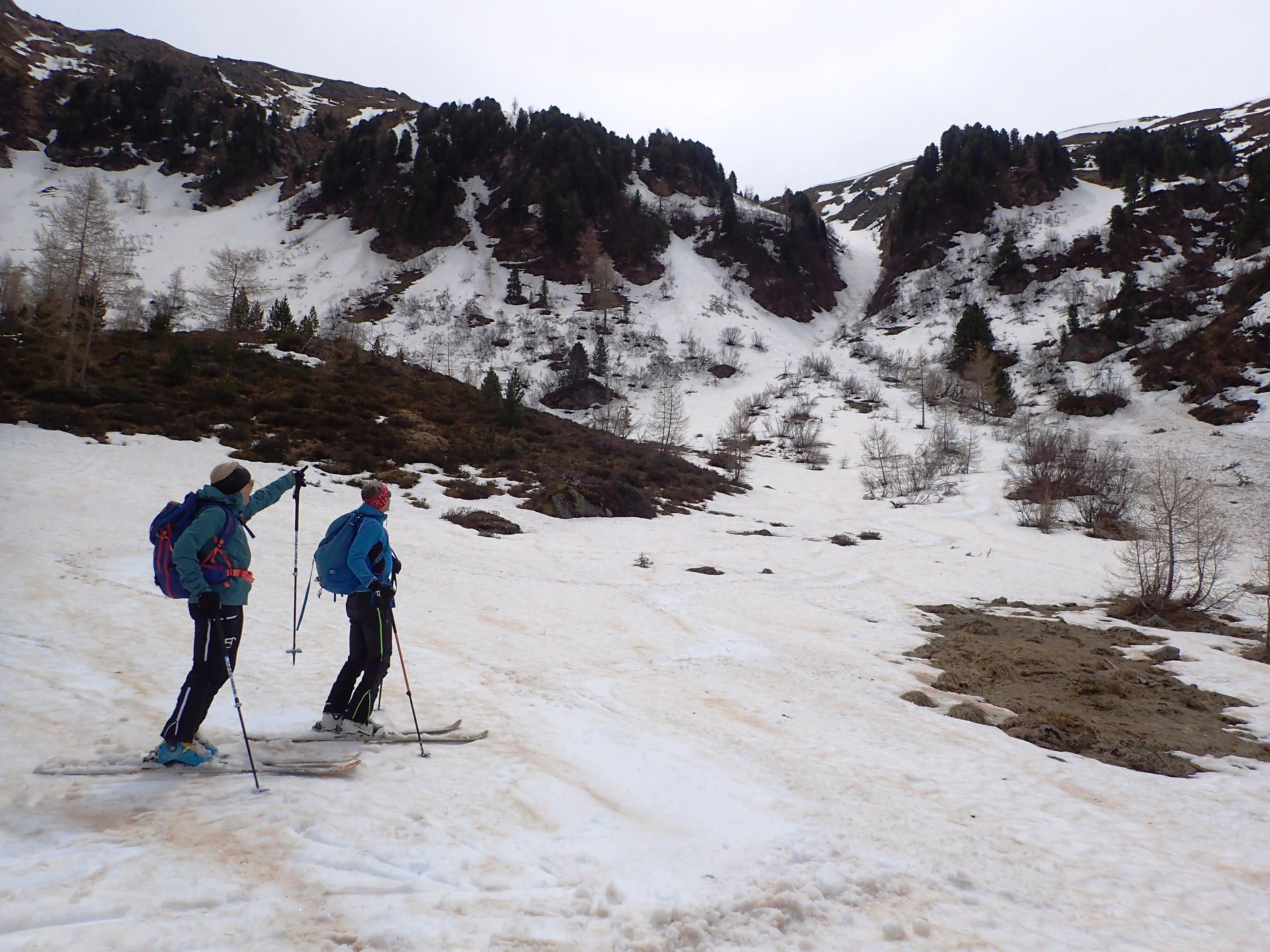 Es gibt einige Möglichkeiten für eher kurze, dafür teils ordentlich steile Rinnen, die jedoch allesamt wegen Schneemangels nicht mehr in Frage kommen.