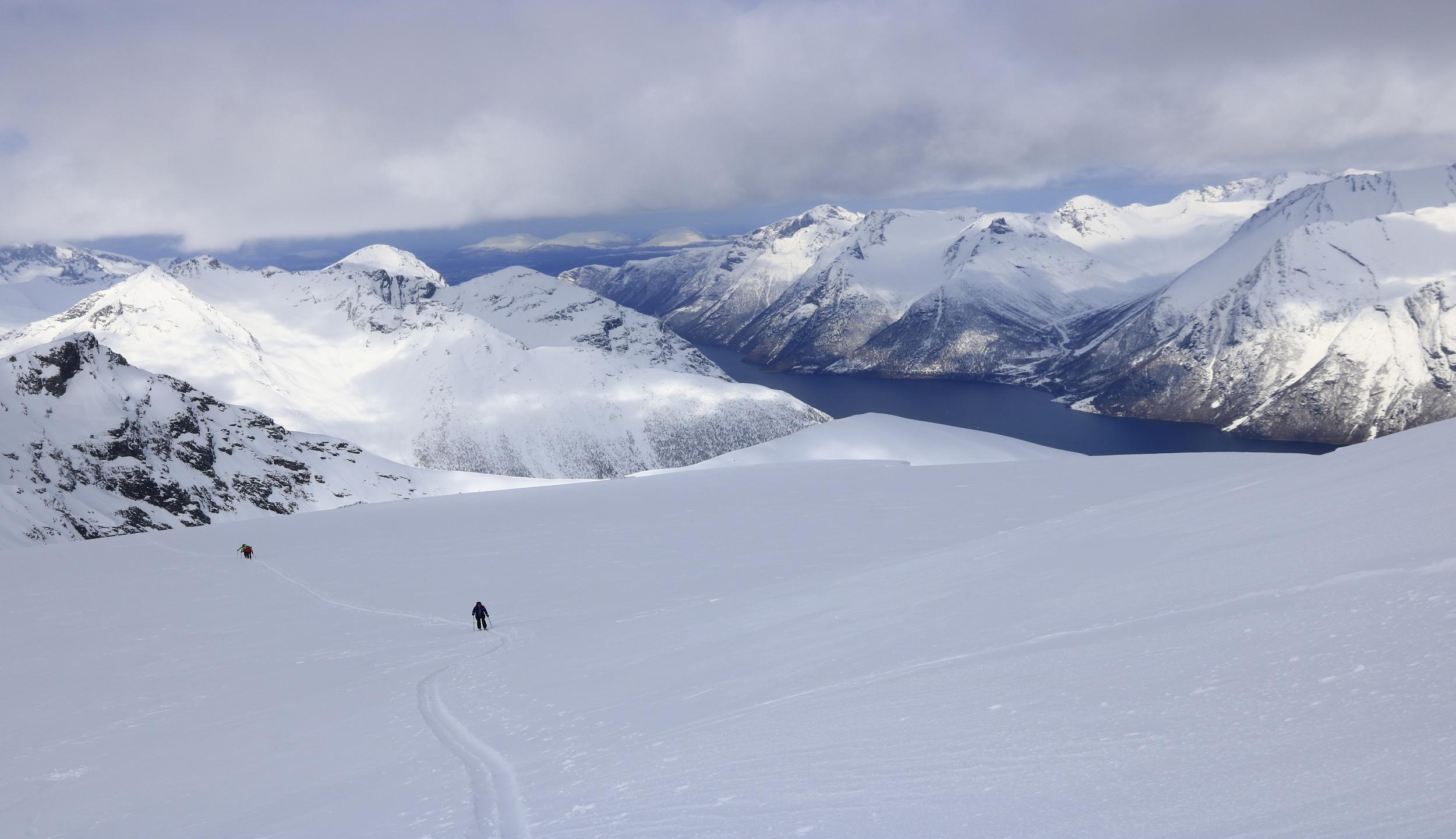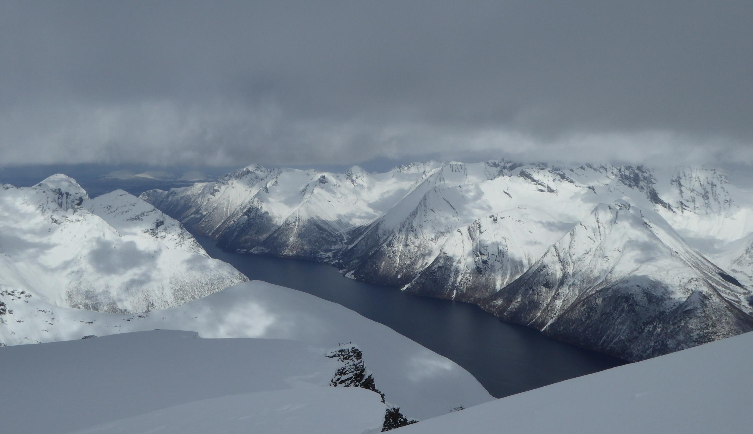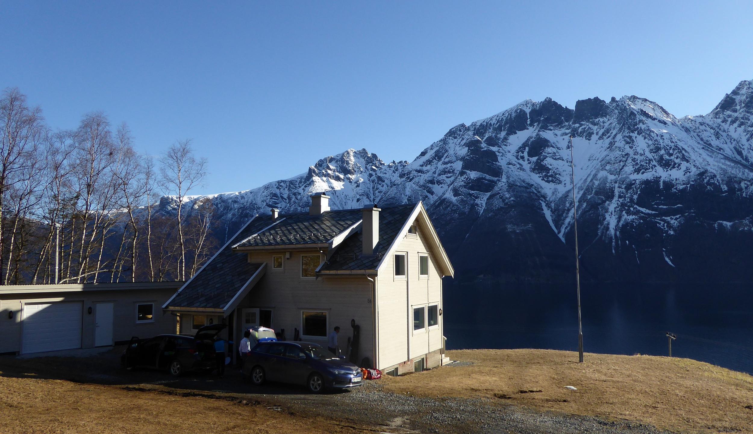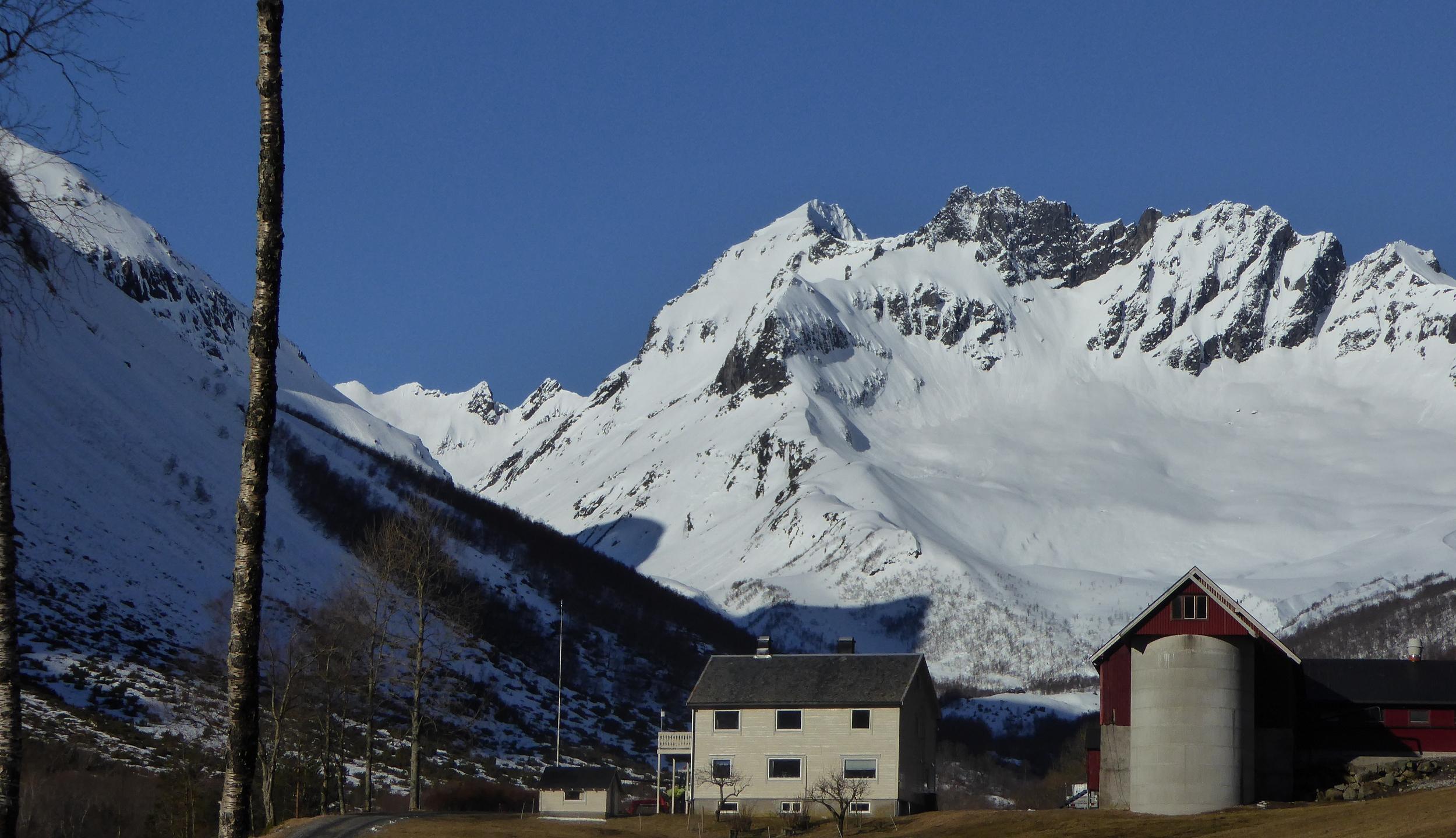Wir wohnten am Hjorungfjord und besuchten die Skiberge rund um den Fjord. Slogen, Kostaltinden, Sylvkallen, Skarasalen, und Fingeren hießen die bestiegenen Gipfel. Mit Ausgangshöhen zwischen 50 und 250m reichen die Gipfelhöhen zwischen 1300 und 1500m leicht aus um schöne Skitouren und Abfahrten zu erleben. Die Birkenwälder reichen nur bis max. 400m, darüber gibt es baumfreie weite Hänge für traumhafte Abfahrten.