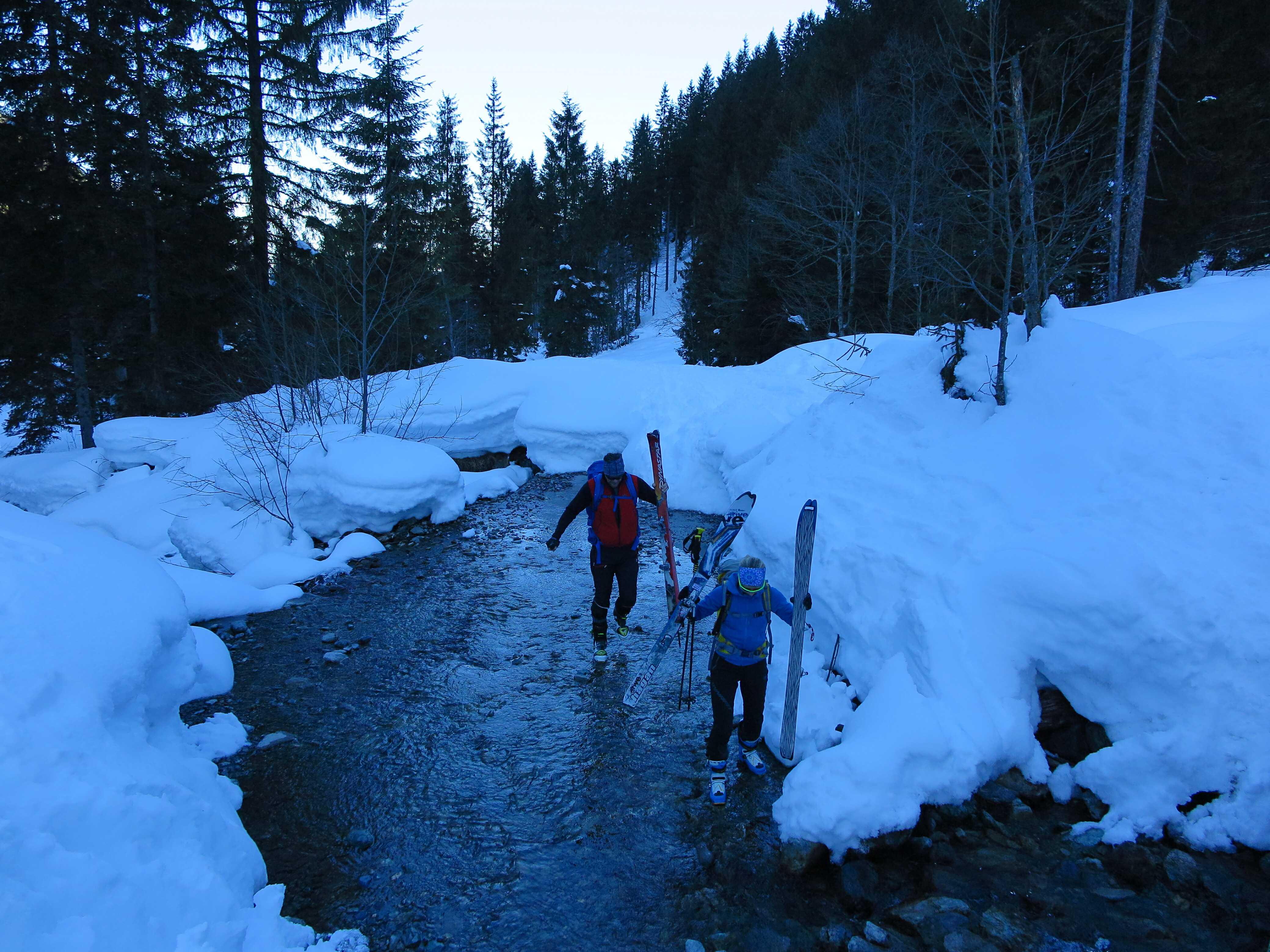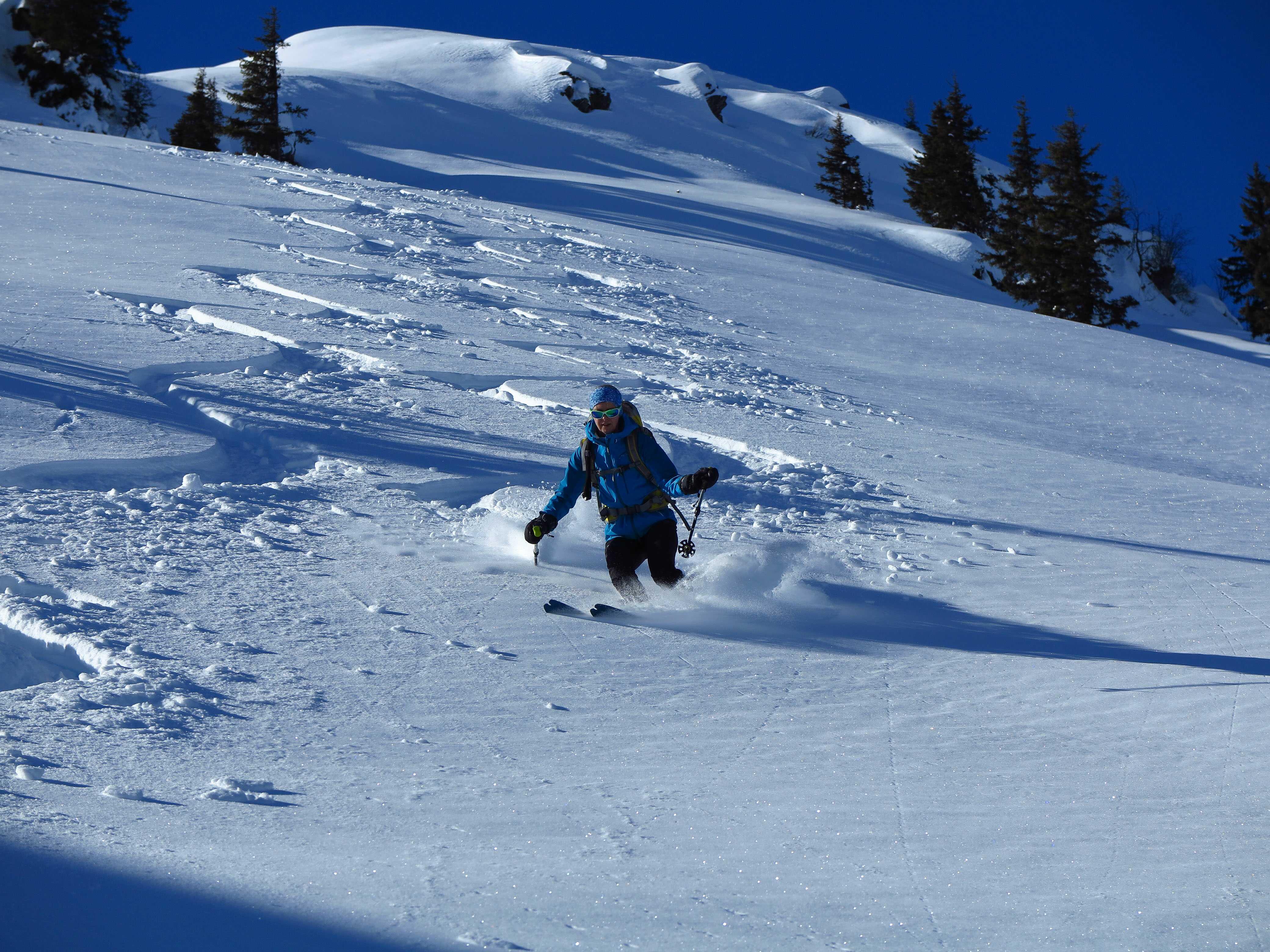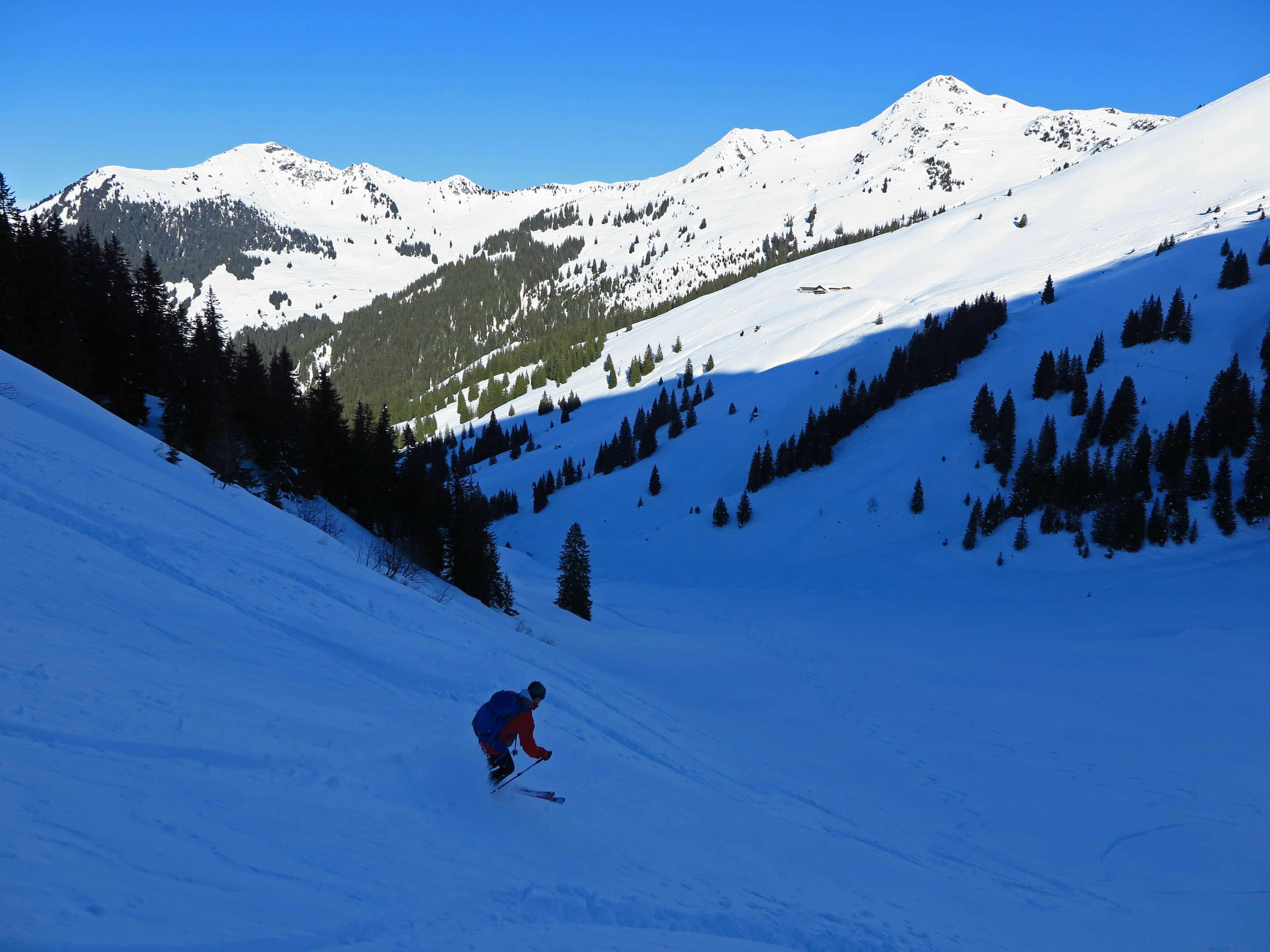 Schneelage: Kaum zu glauben, aber im schattseitigen Wildalmgraben gabs noch feinen Pulverschnee, nur an wenigen Stellen etwas windbehandelt. Der sonnseitige Harschdeckel wurde ab Spätvormittag weich.