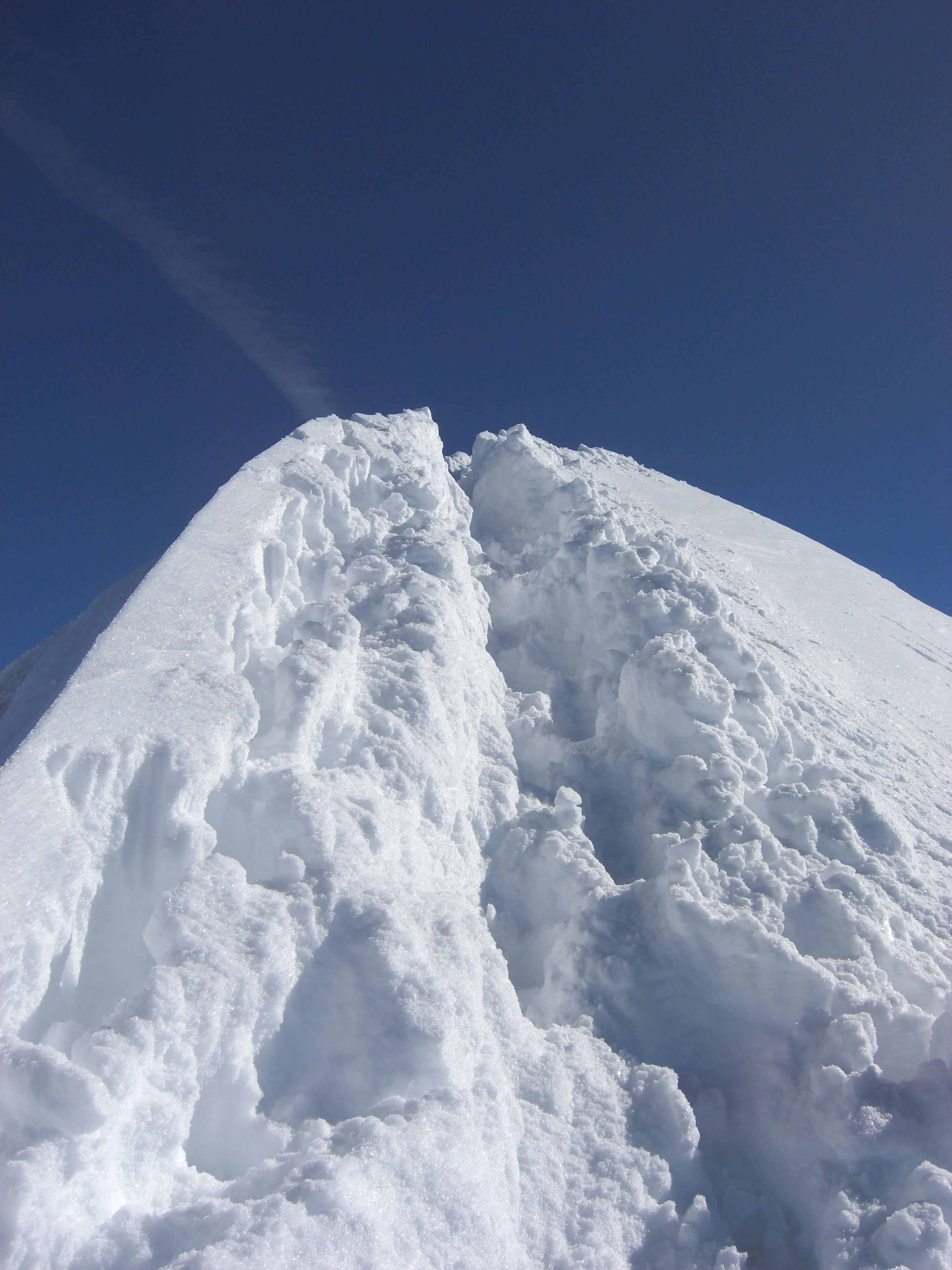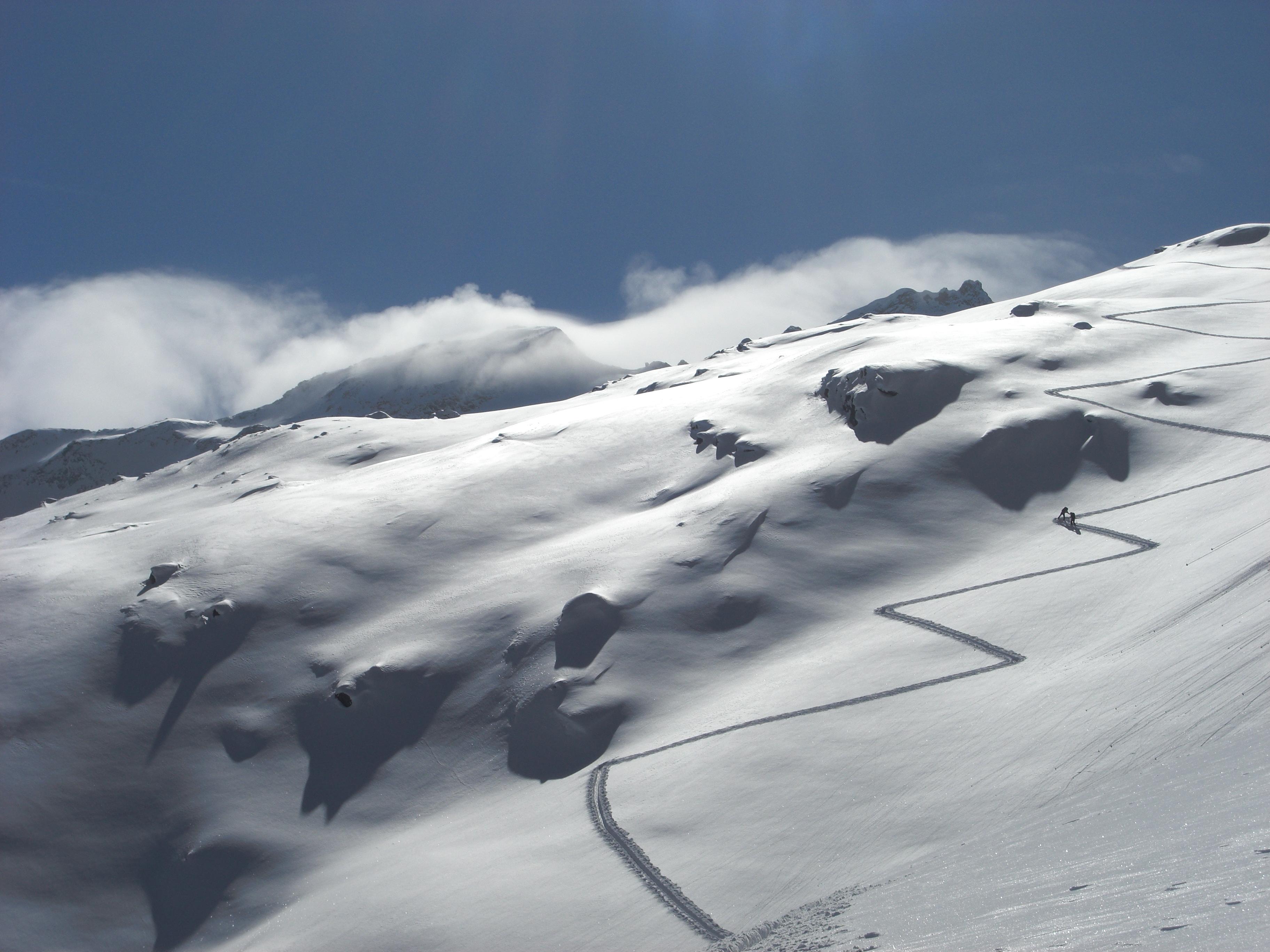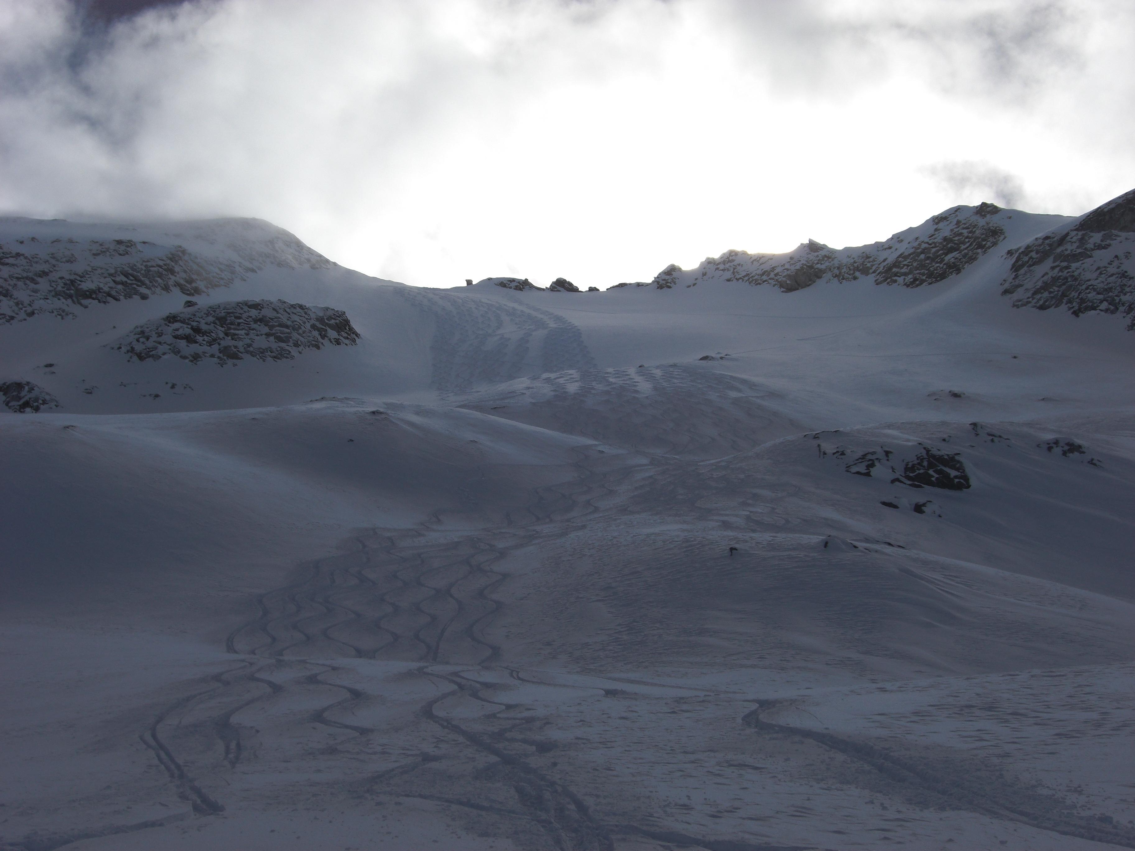 Einzig unter dem Keesnickelkopf und im Ausstieg vom Gstößkees in die Scharte war etwas windgepresster Schnee.