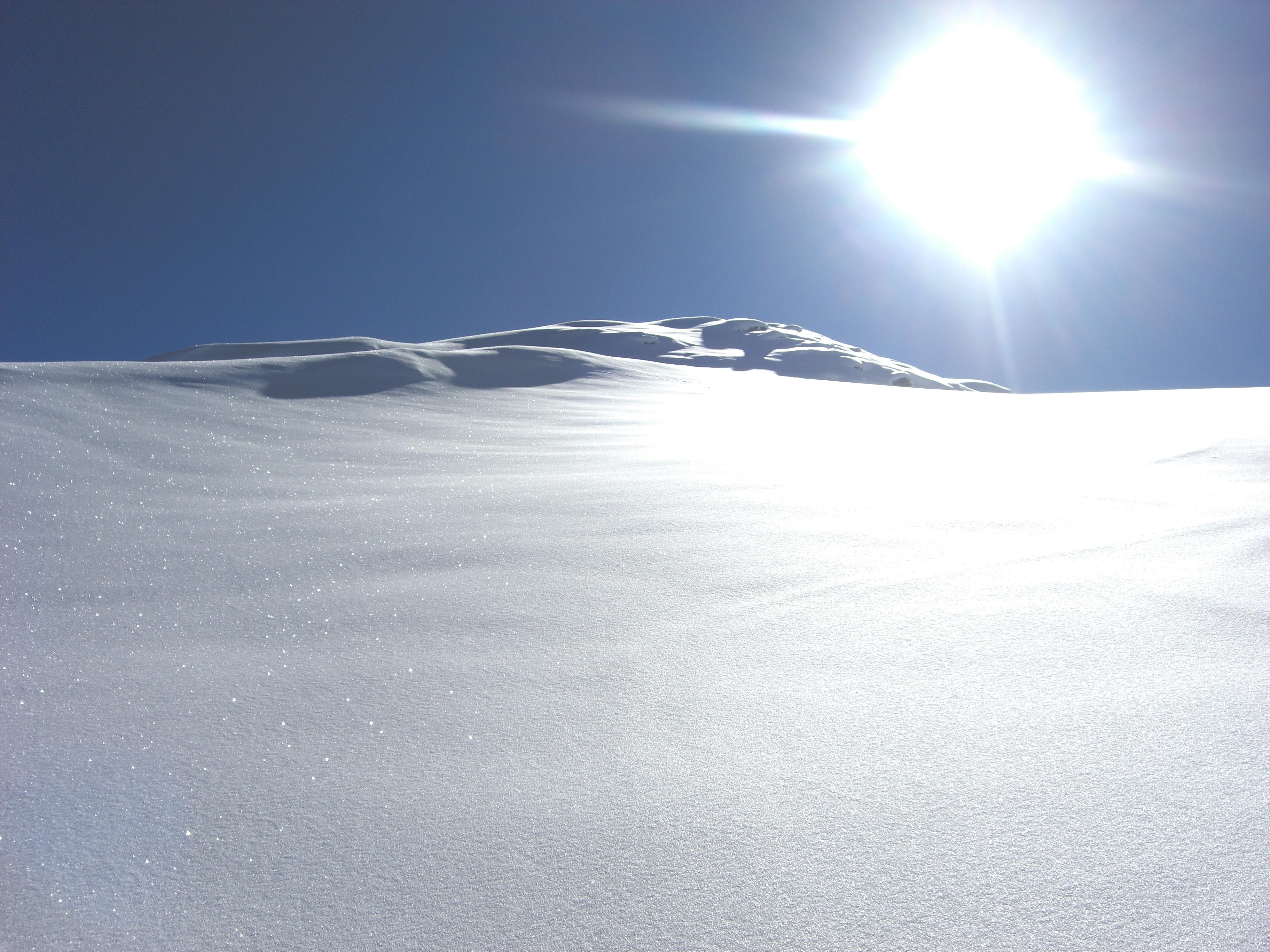 Schneedecke: Auf sehr gut tragendem Untergrund liegen ca. 40 cm Pulverschnee, ohne Windeinfluß gefallen.