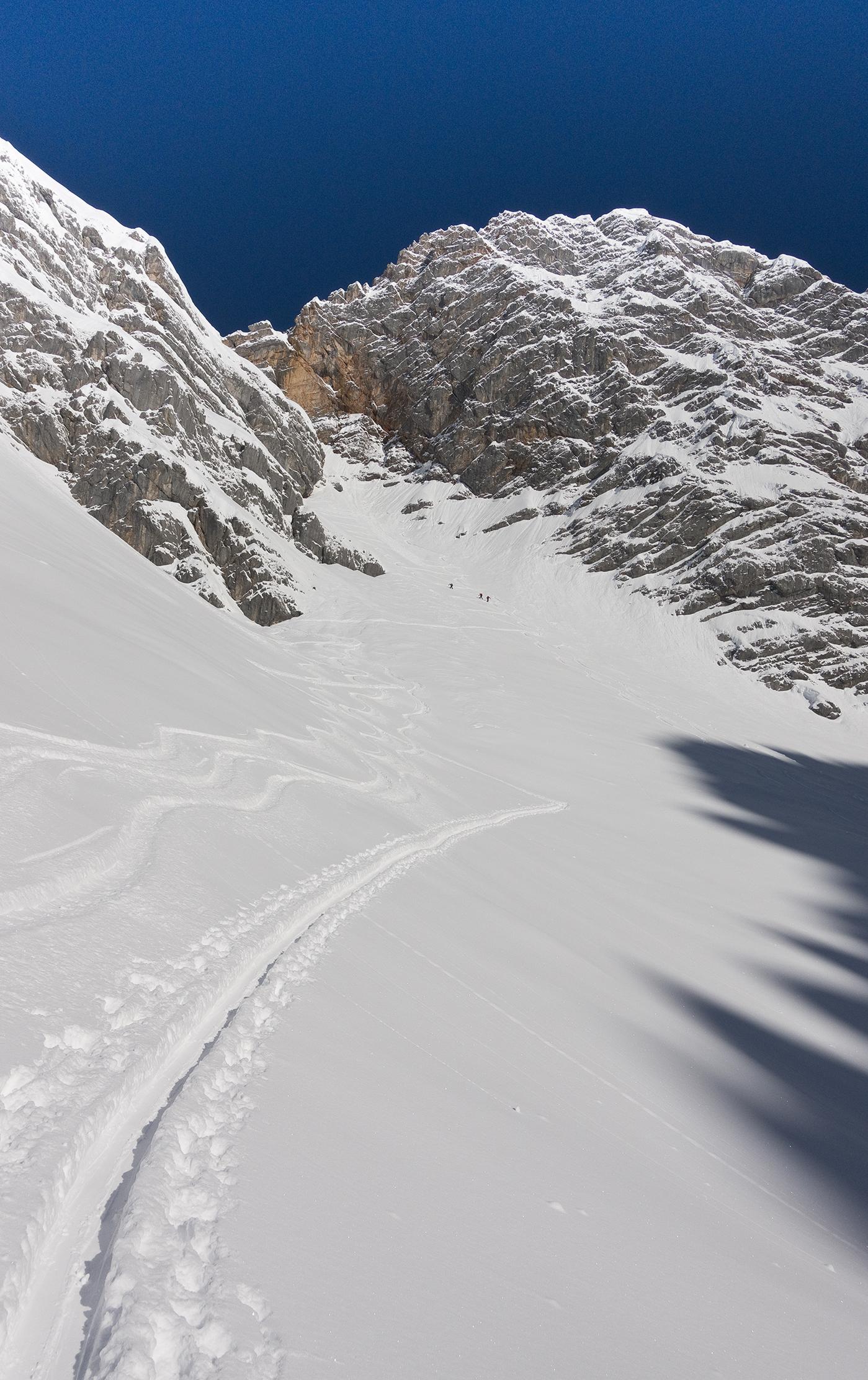 Die Verhältnisse waren - heute Vormittag! - wirklich ausgezeichnet, wie man sie vielleicht alle 10 Jahre mal hat für diese Tour. Pulverschnee von oben bis unten, oben knietief, und die Latschenzone so gut zugeschneit wie seit Jahren nicht.