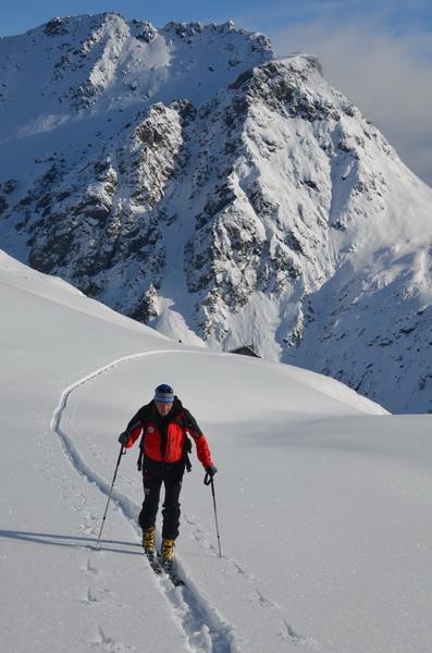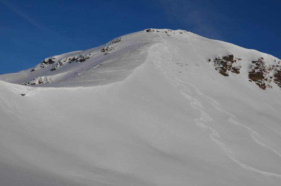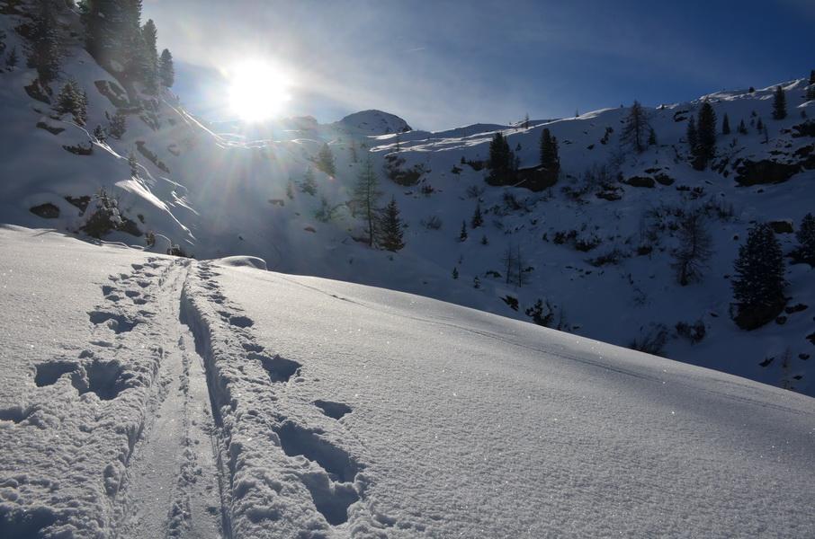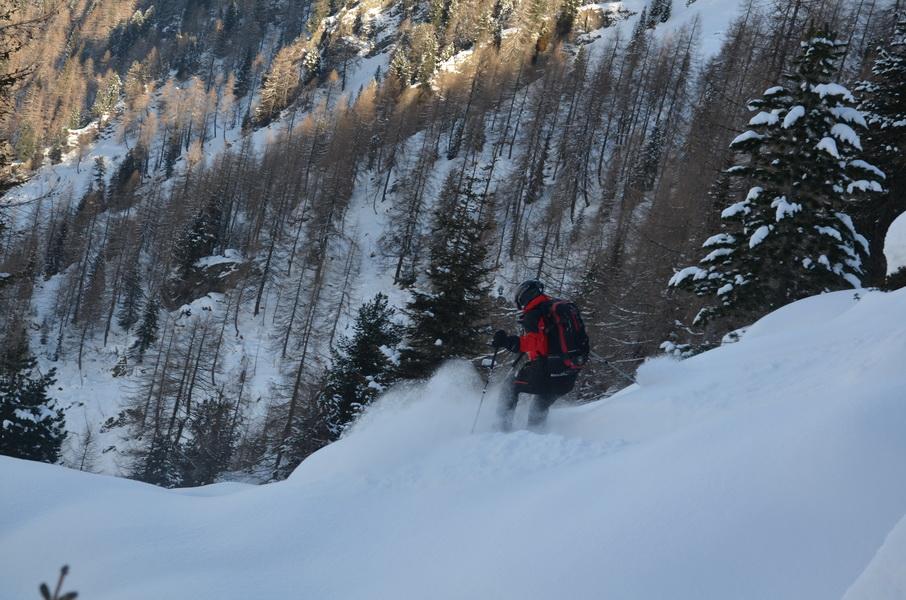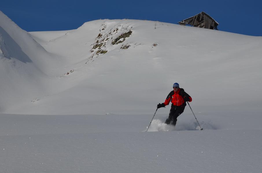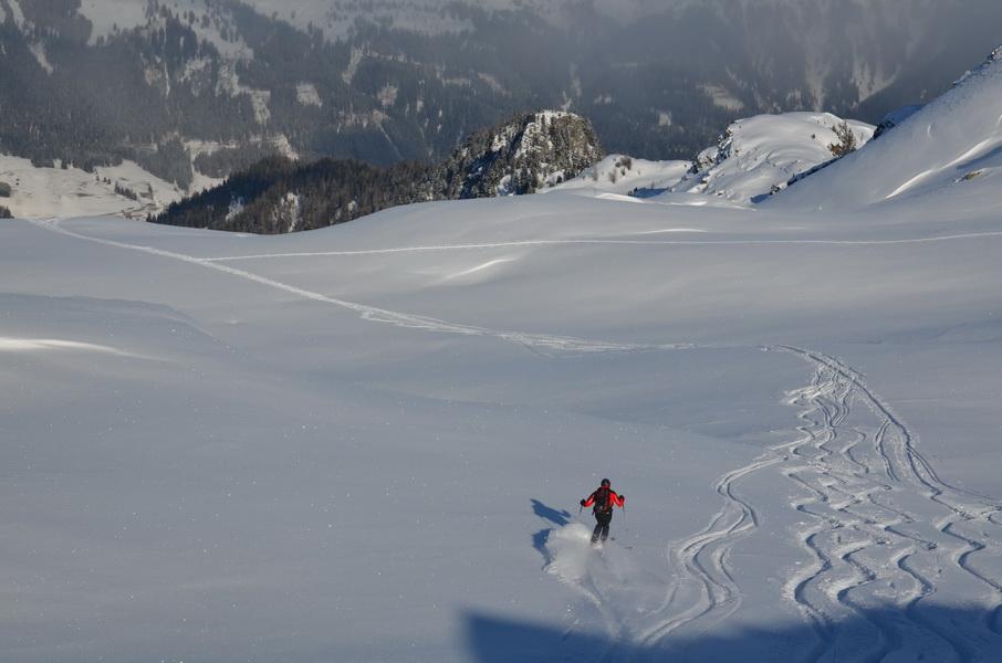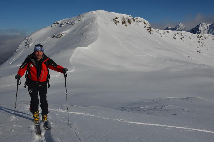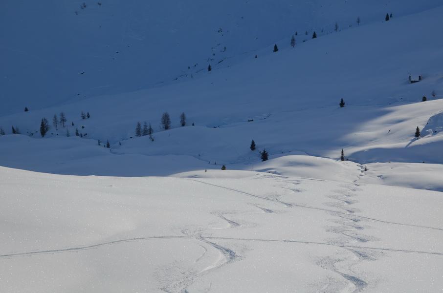 Der letzte Schneefall hat auch in Lesachtal etwas liegen gelassen. Vom Auto weg fanden wir eine gut gesetzte Schneedecke mit ca. 15cm frischer spannungsloser Pulverschneeauflage vor. In Kammnähe konnte man allerdings gut den WIndeinfluss erkennen und speziell die Hangausrichtung von W über N bis O waren ab ca.2300m stark eingeweht. Wir haben die tollen Verhältnisse genützt und sind noch einmal ein Stück in Richtung Leitertal abgefahren und von dort wieder aufgestiegen.