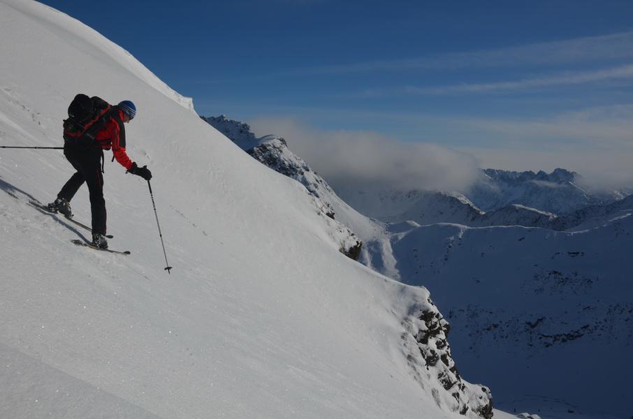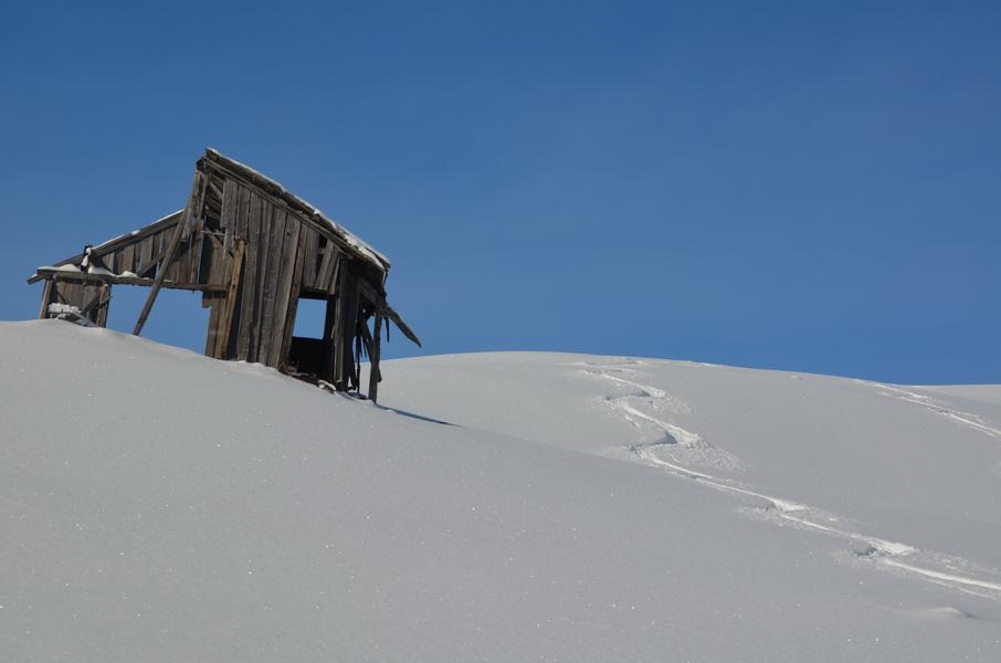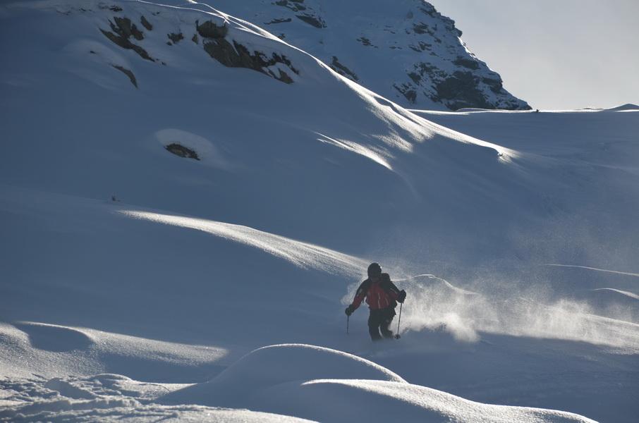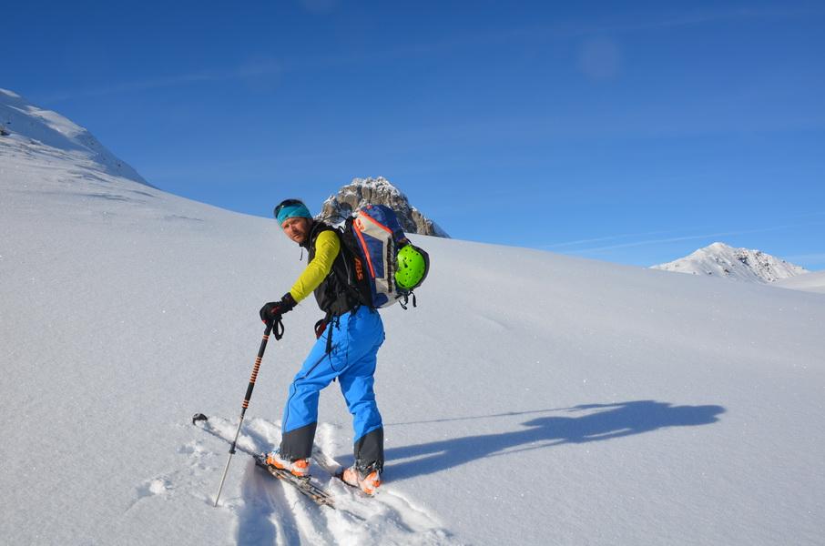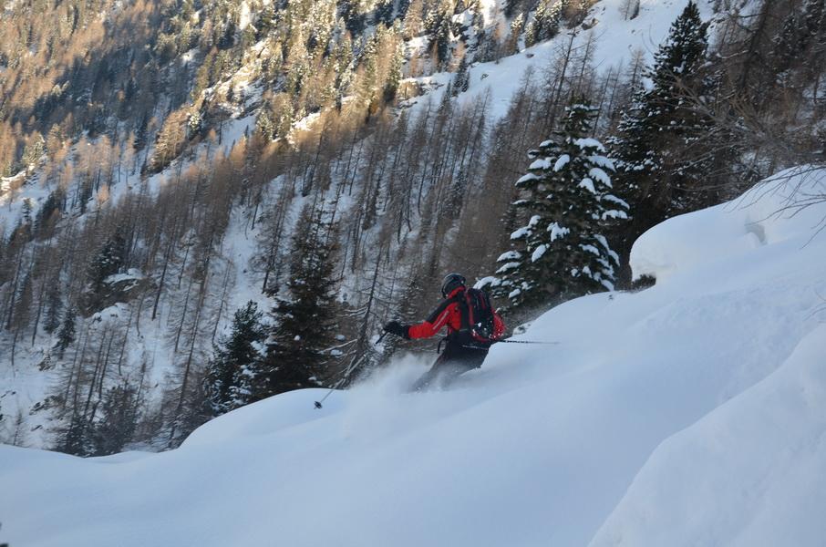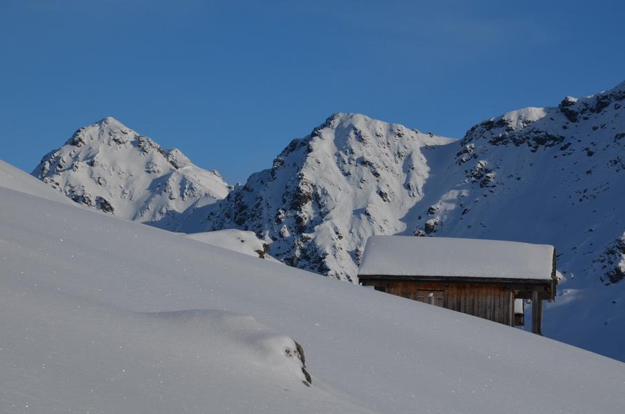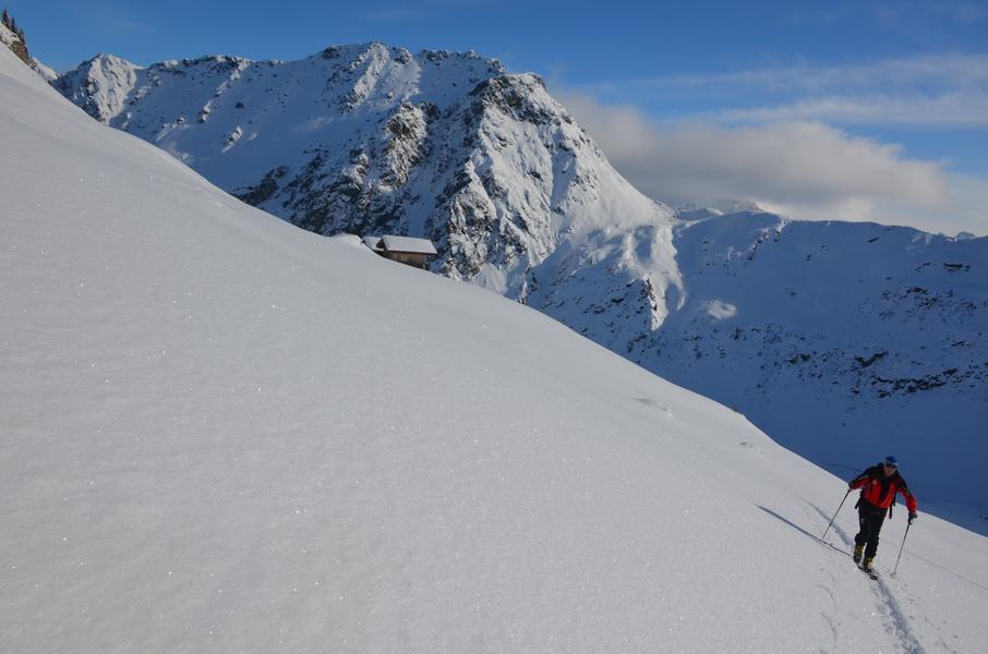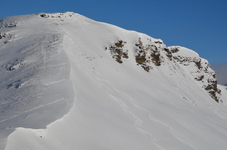 Der letzte Schneefall hat auch in Lesachtal etwas liegen gelassen. Vom Auto weg fanden wir eine gut gesetzte Schneedecke mit ca. 15cm frischer spannungsloser Pulverschneeauflage vor. In Kammnähe konnte man allerdings gut den WIndeinfluss erkennen und speziell die Hangausrichtung von W über N bis O waren ab ca.2300m stark eingeweht. Wir haben die tollen Verhältnisse genützt und sind noch einmal ein Stück in Richtung Leitertal abgefahren und von dort wieder aufgestiegen.