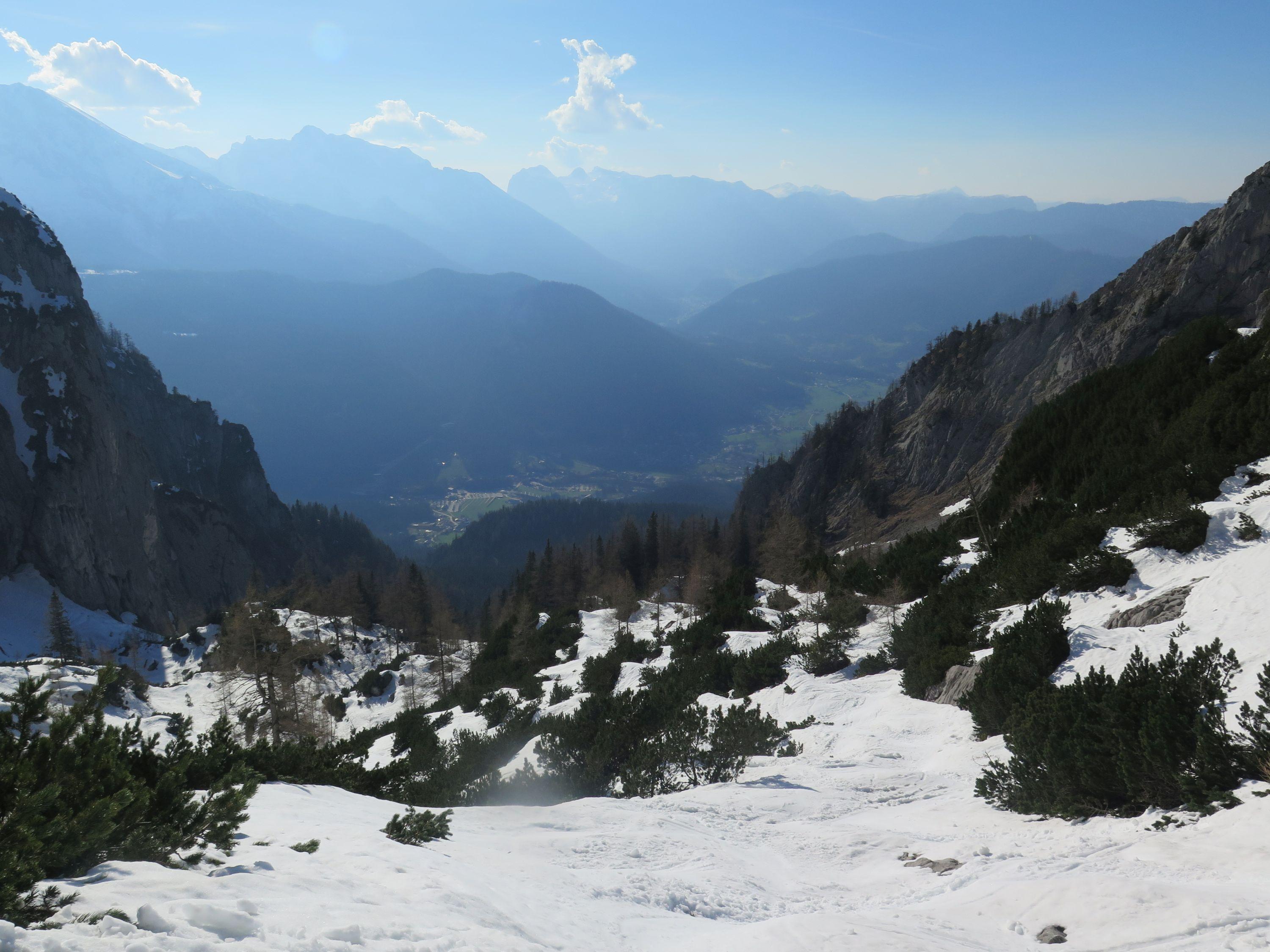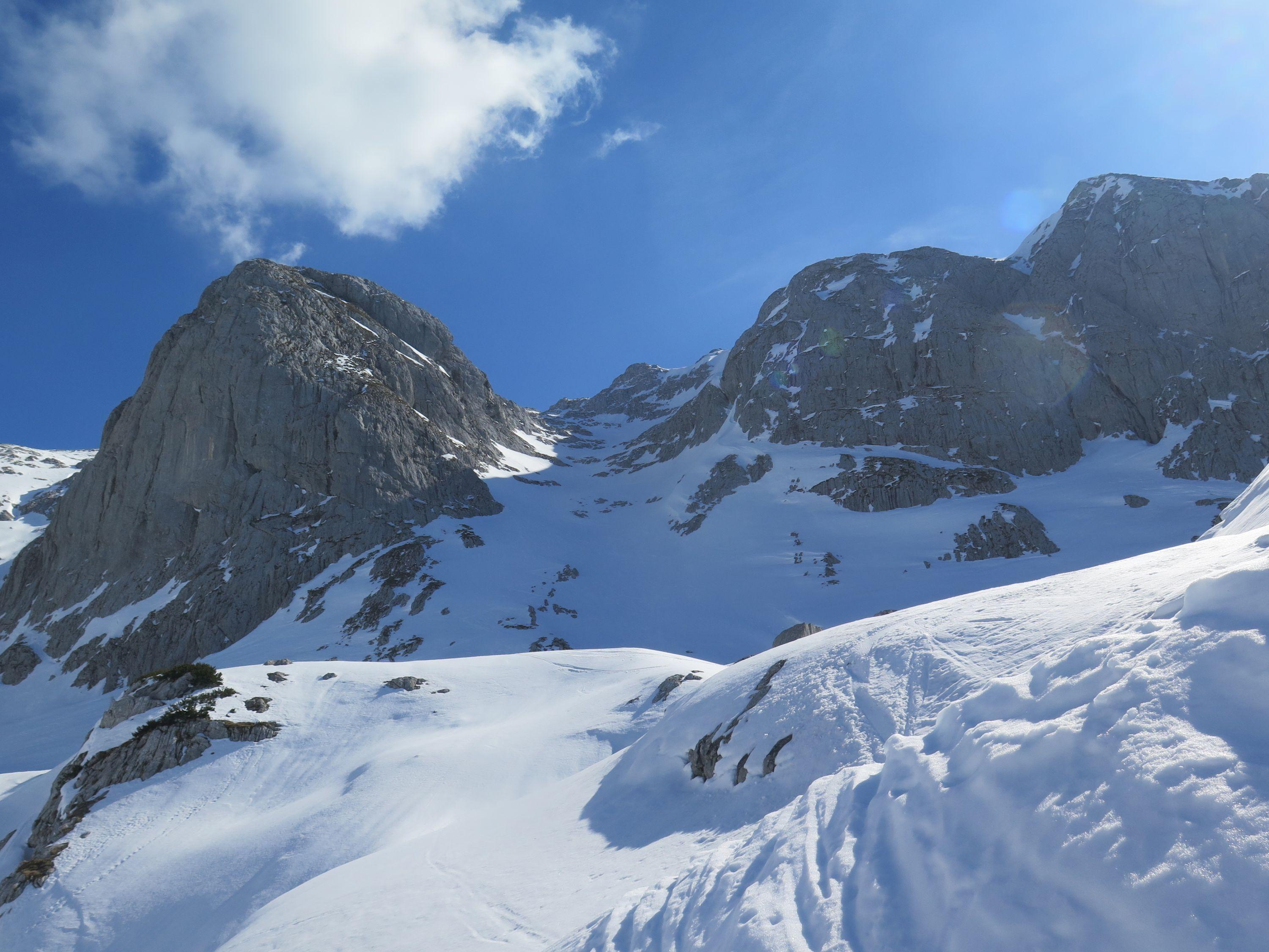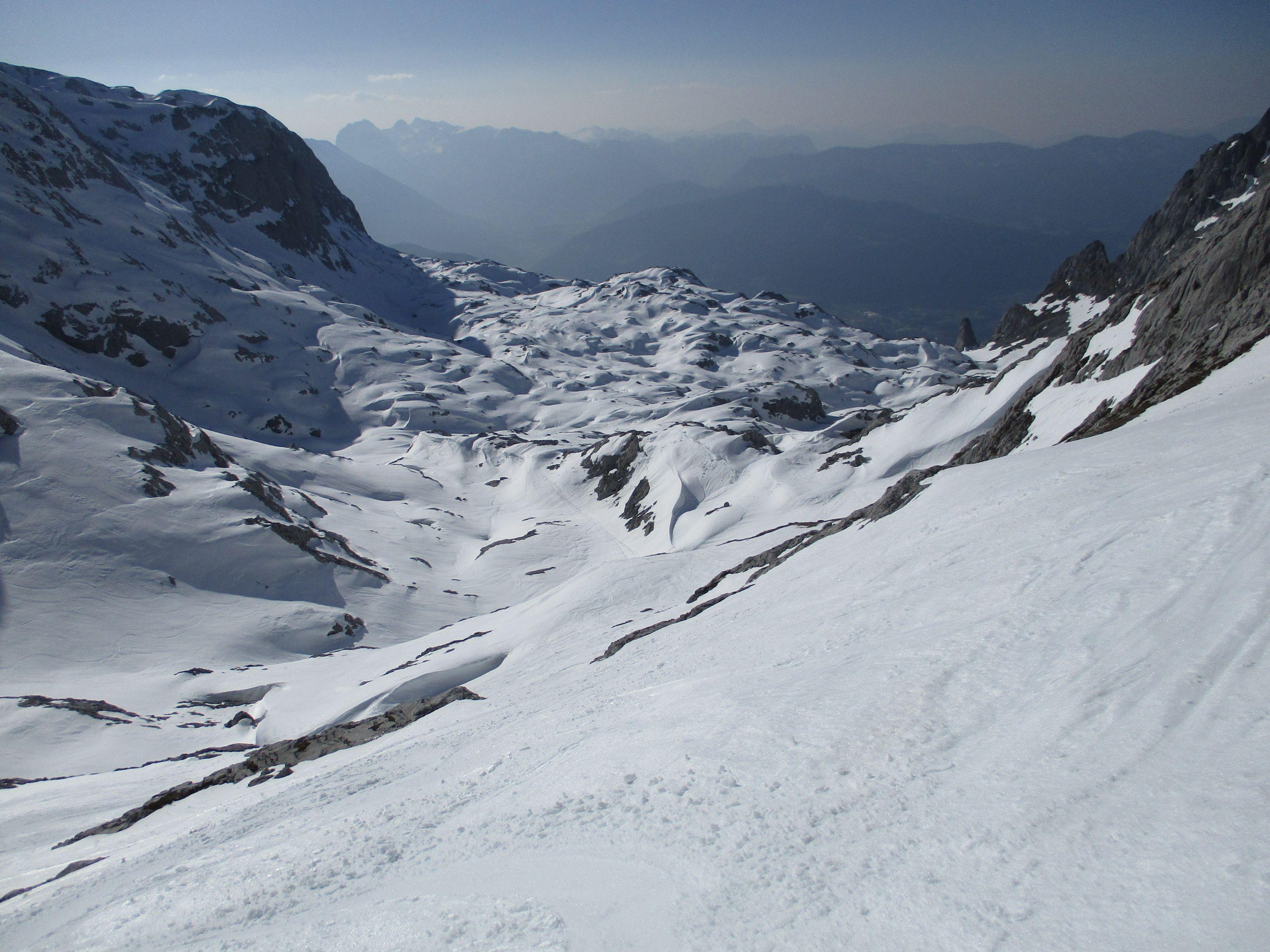Hoher Göll: Dienstag kurz nach Mittag gestartet, Schnee ab dem 2. Felswandl. Erste Steilstufe auch Mittags noch hart, der Rest ohne Harscheisen angenehm zu gehen. Leichter Wind und angenehme Temperatur. Auch am späteren Nachmittag noch gute Abfahrtsverhältnisse.