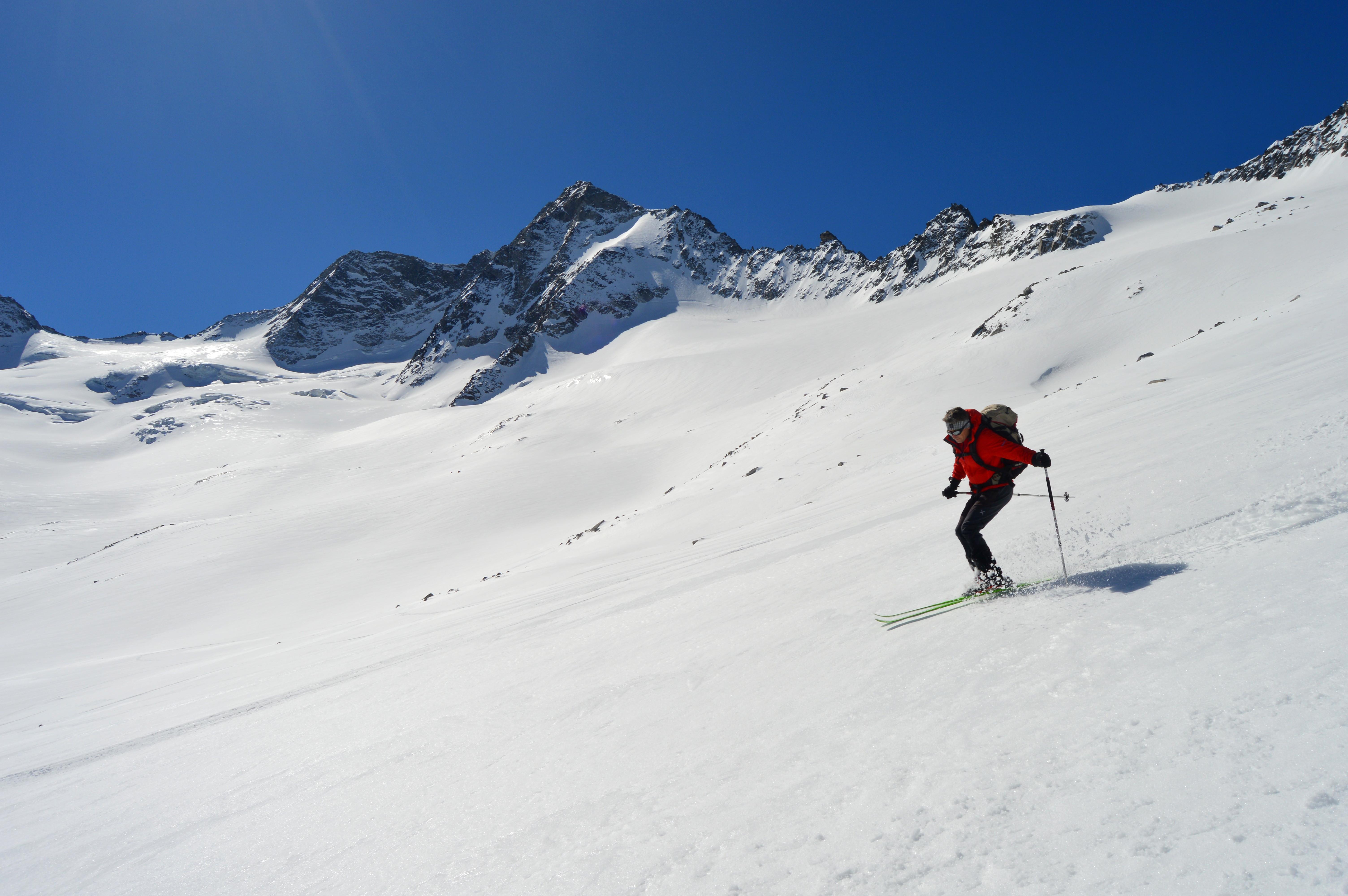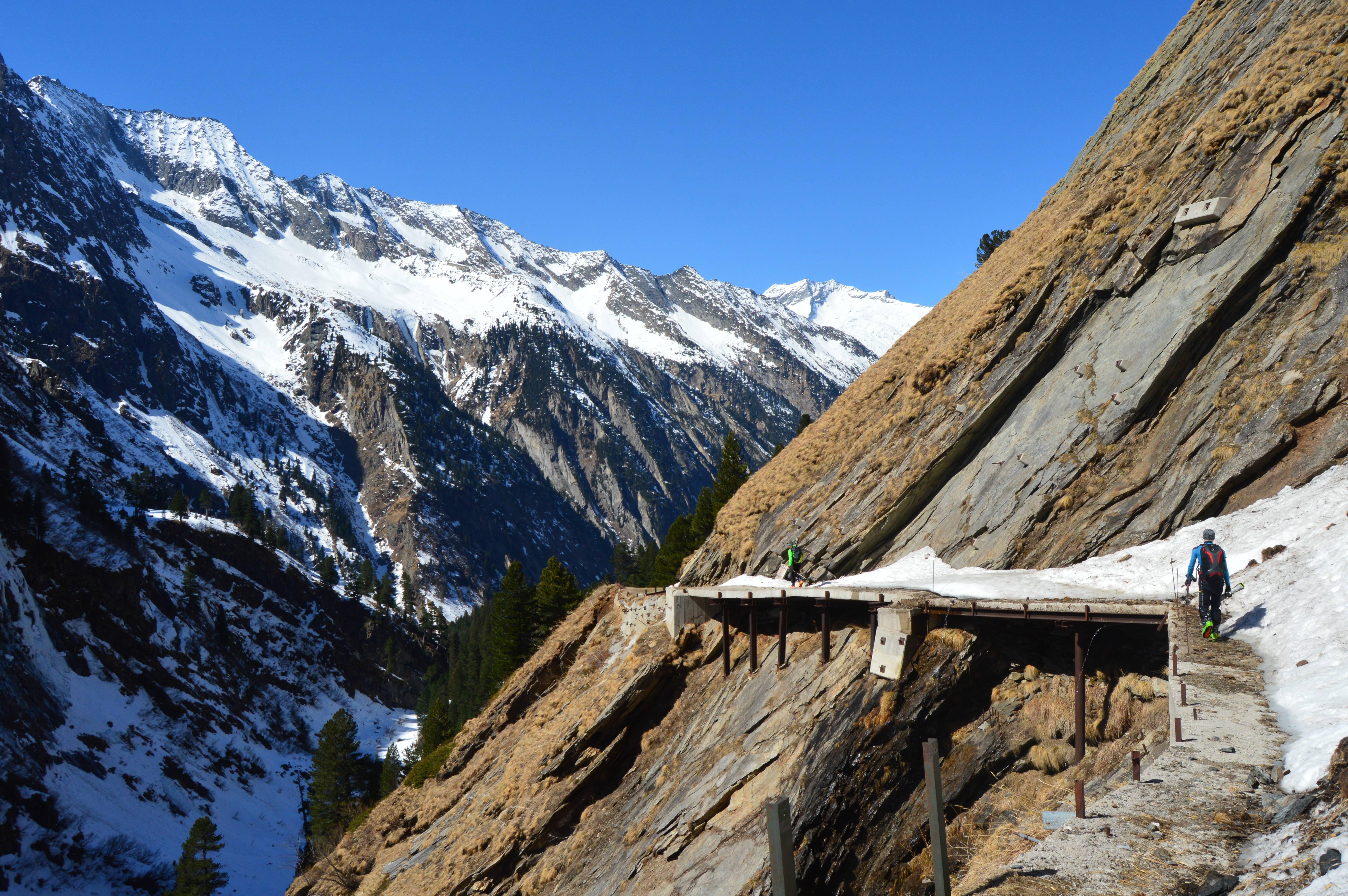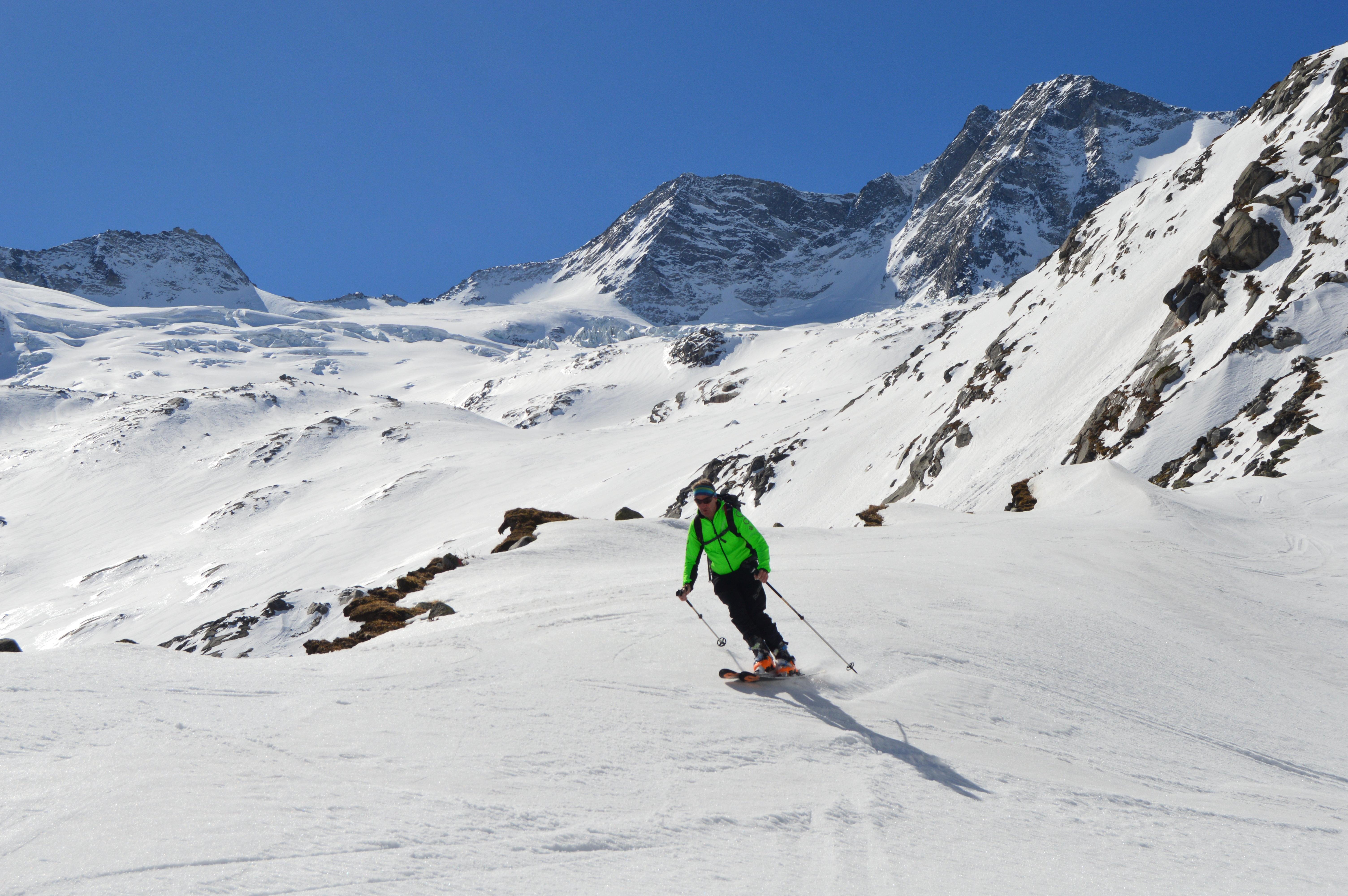 Wie überall ist auch im Gebiet der Berliner Hütte wenig Schnee. Allerdings herrschen momentan perfekte Verhältnisse. Firn von oben bis unten! Auch unten war noch perfekter Firn - Nix tief, trotz der hohen Temperaturen. Das im Sommer stark frequentierte Schönbichler Horn ist eine geniale Schitour mit ewig weiten mittelsteilen Hängen. Am liebsten möchte man gar nicht mehr stehen bleiben. Nach dem Riesigen Garberkar fuhren wir dann eine sehr steile Rinne auf den Moränenrücken ab. Danach gings über schöne Rampen und eine steile Moräne hinunter zur Alpenrose. In der Zemmschlucht mussten wir teilweise die Schi schultern, ehe es gemütlich über die Forststraße zur Grawandhütte ging.