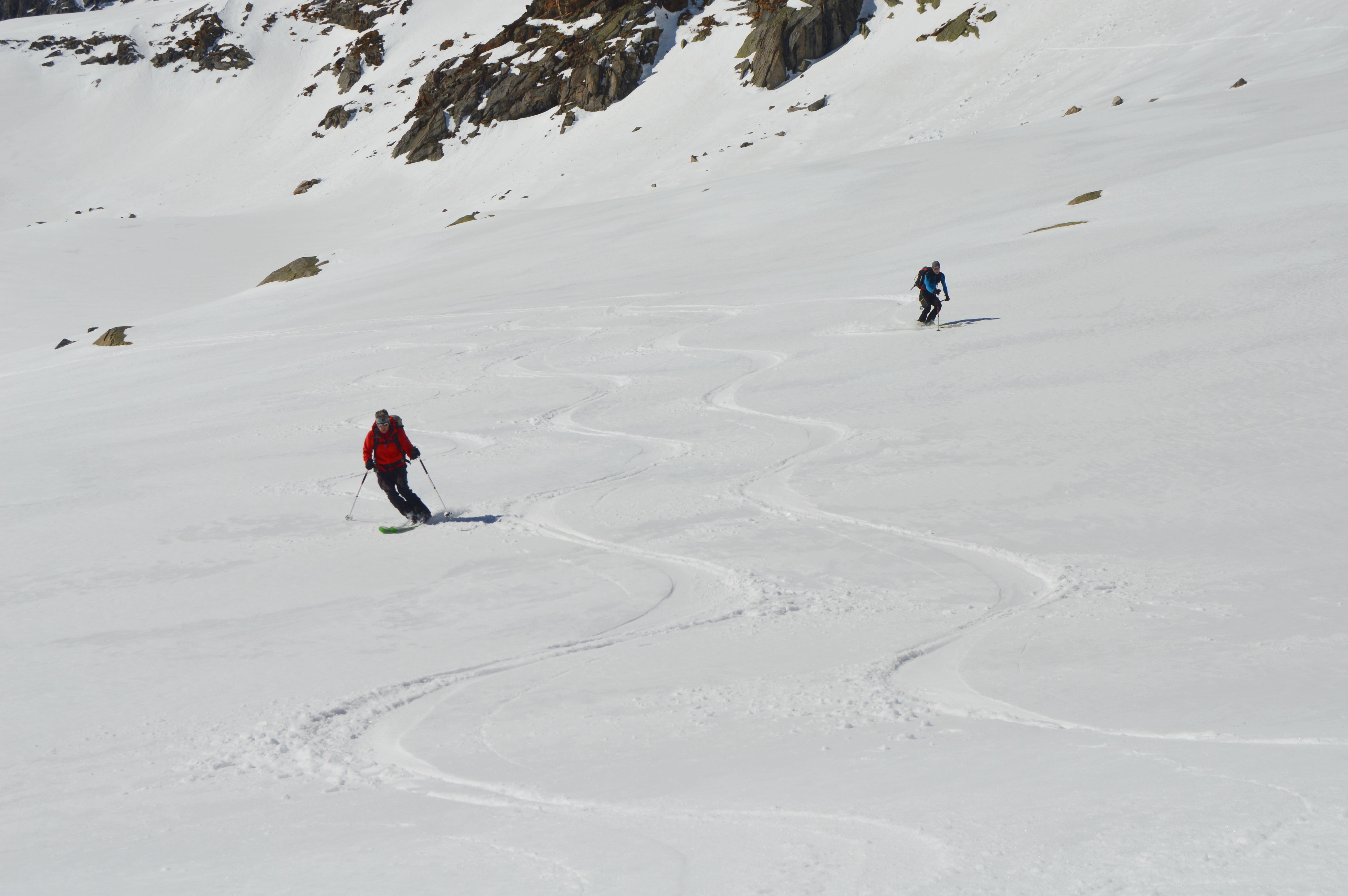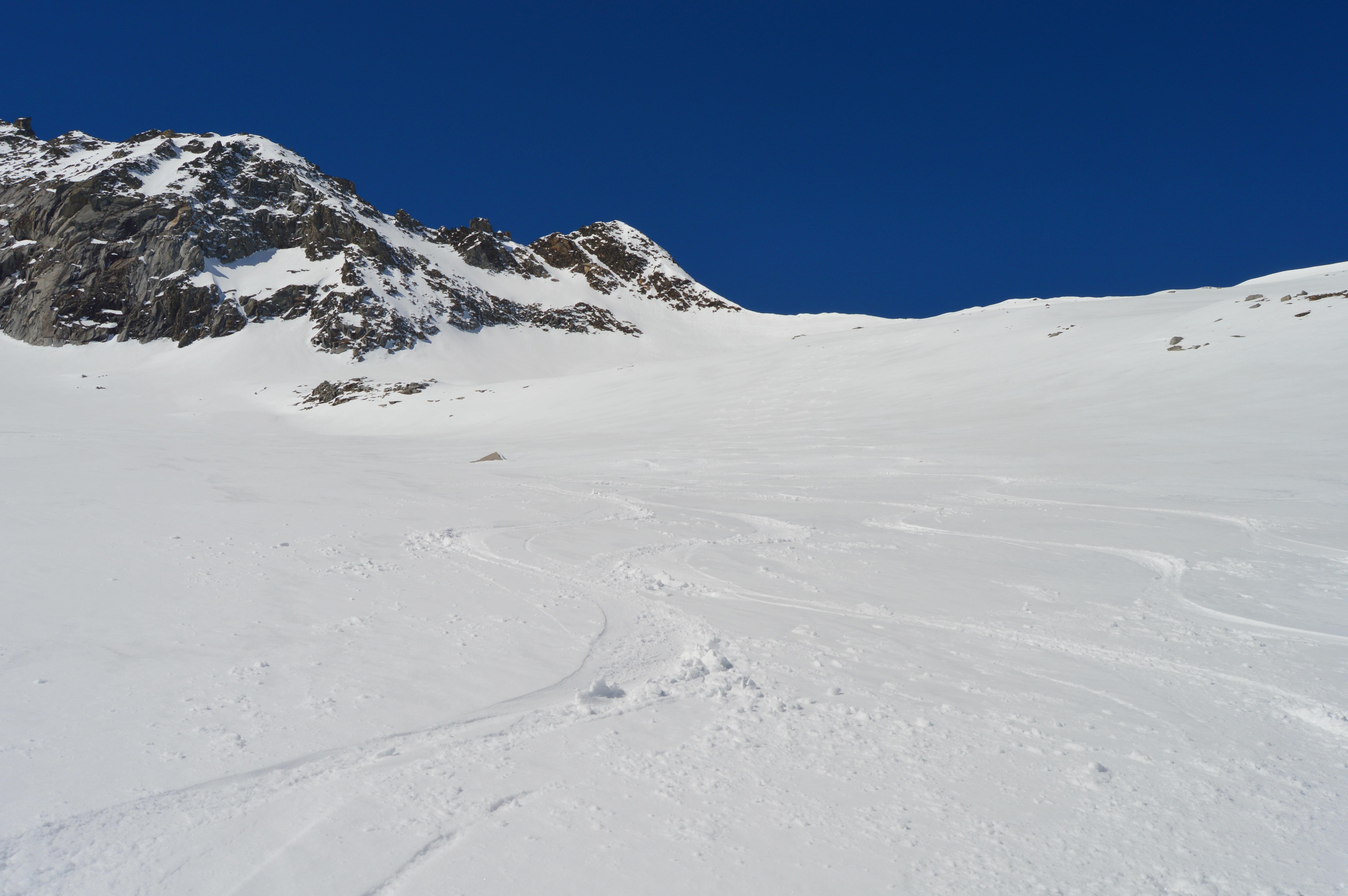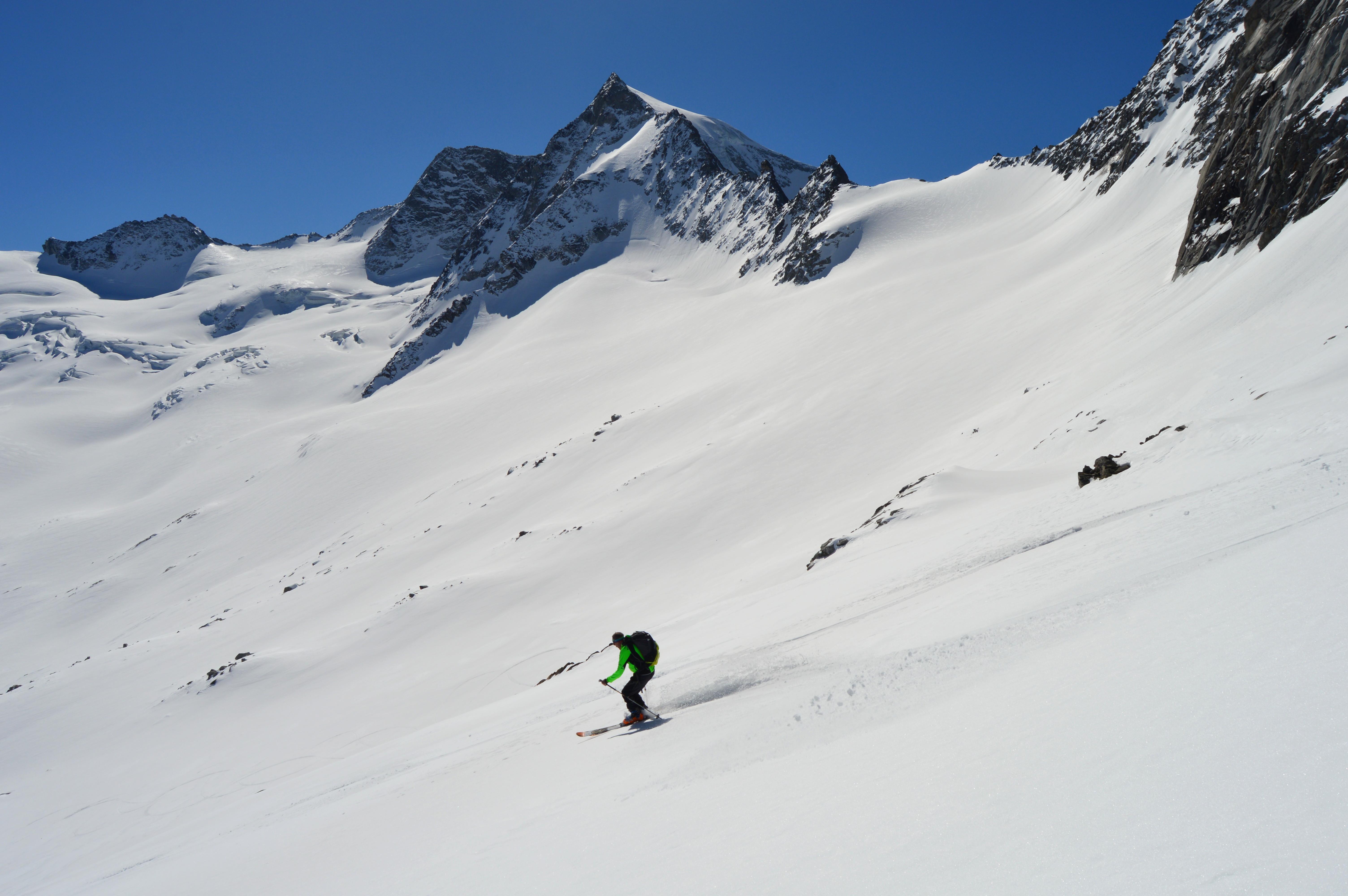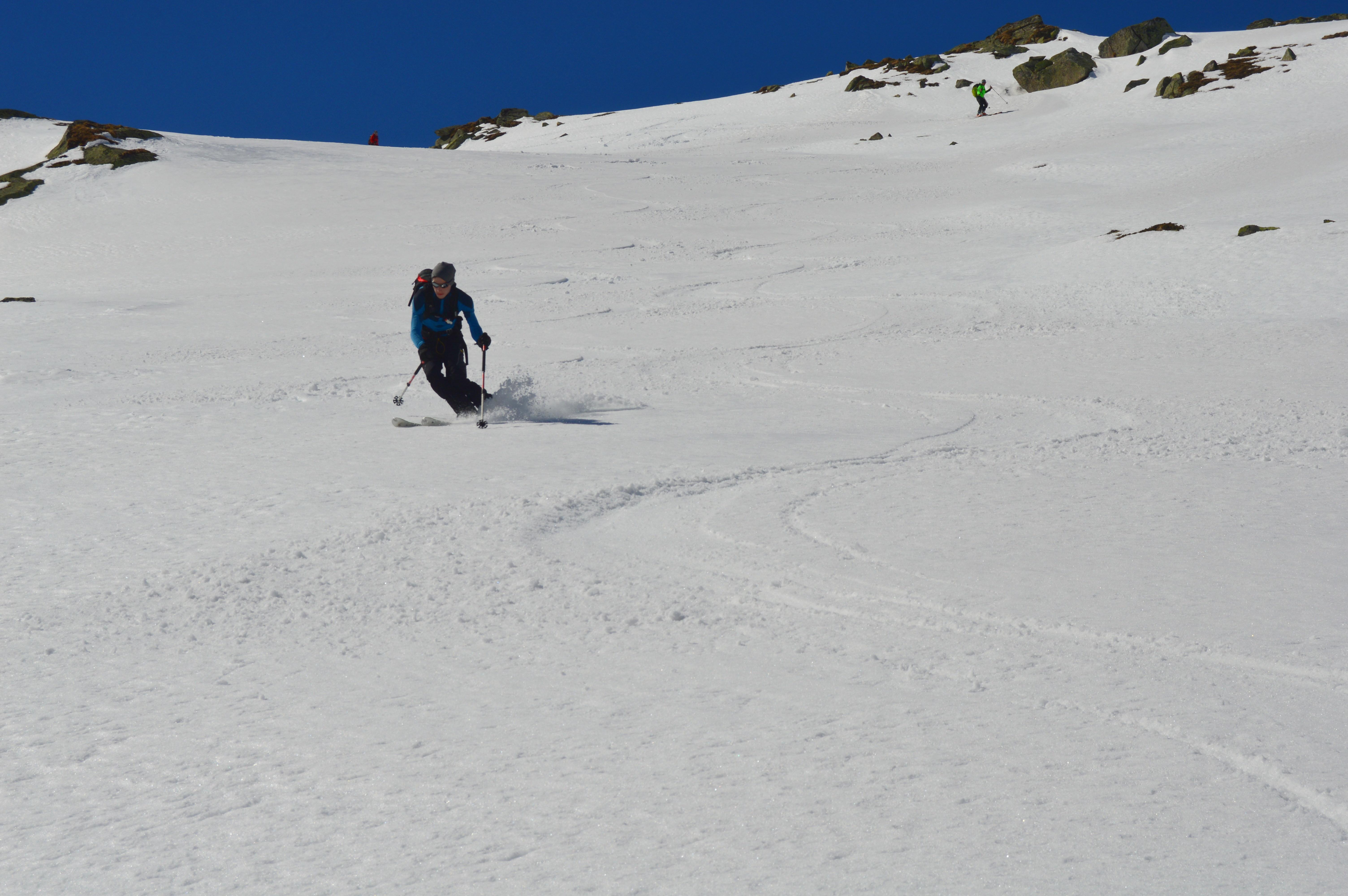 Wie überall ist auch im Gebiet der Berliner Hütte wenig Schnee. Allerdings herrschen momentan perfekte Verhältnisse. Firn von oben bis unten! Auch unten war noch perfekter Firn - Nix tief, trotz der hohen Temperaturen. Das im Sommer stark frequentierte Schönbichler Horn ist eine geniale Schitour mit ewig weiten mittelsteilen Hängen. Am liebsten möchte man gar nicht mehr stehen bleiben. Nach dem Riesigen Garberkar fuhren wir dann eine sehr steile Rinne auf den Moränenrücken ab. Danach gings über schöne Rampen und eine steile Moräne hinunter zur Alpenrose. In der Zemmschlucht mussten wir teilweise die Schi schultern, ehe es gemütlich über die Forststraße zur Grawandhütte ging.