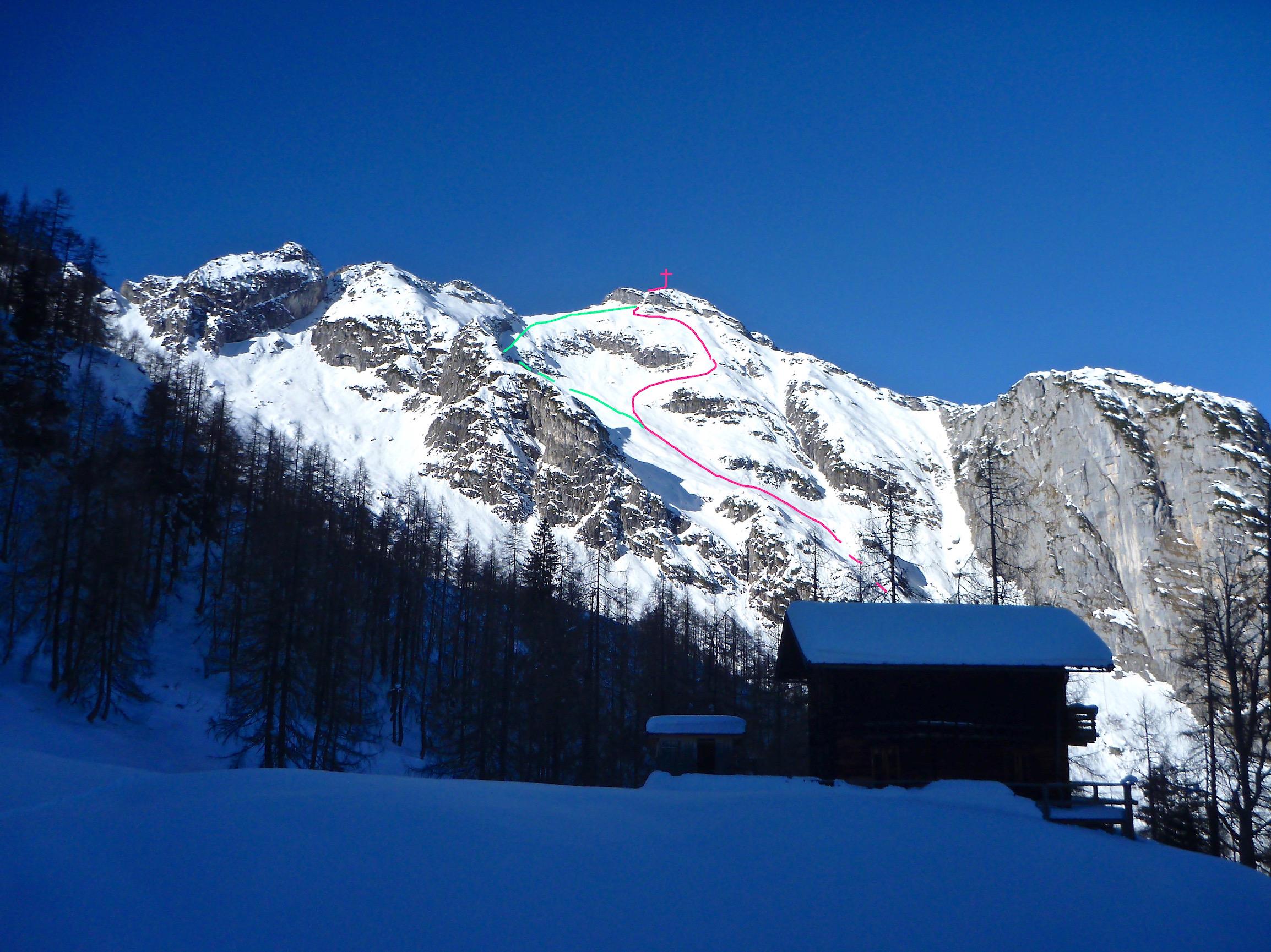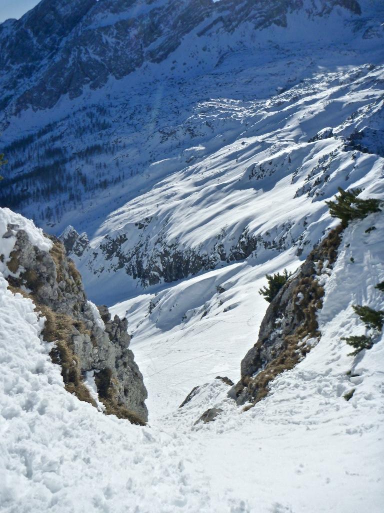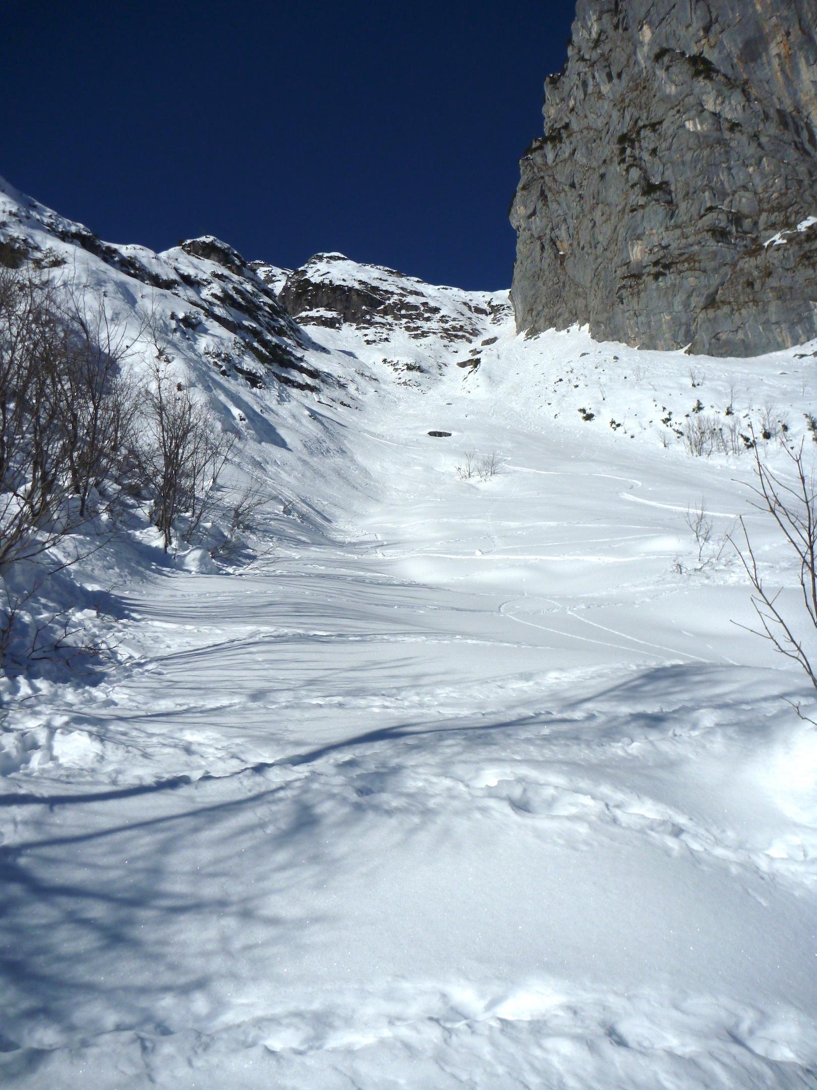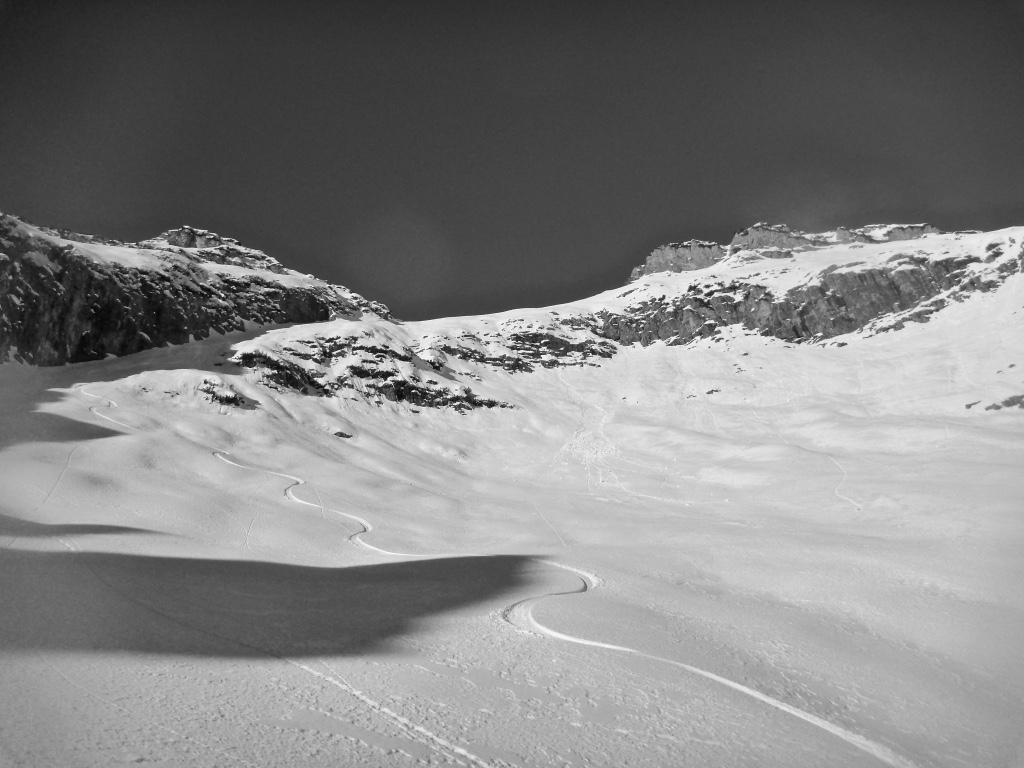 Abfahrt: vom Boarddepot von oben gesehen rechts entlang der Felsen; das ist die Seite mit Schatten und Pulver und letztendlich auch die sicherere, da man im Unglücksfall nicht über die Felswände gespült wird.