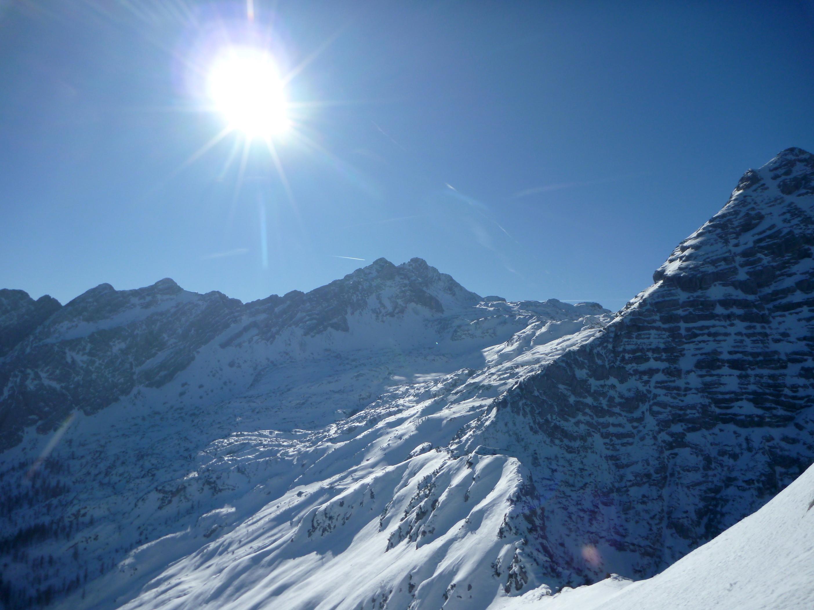 Schnee Lawinen: unten gefrorene Lockerschneerutsche, Mitte etwas angefeuchteter feinster Pulver, oben Harsch; Abfahrt oben Pulver, der Rest siehe Anstieg. Keine Anzeichen auf Lawinen.
