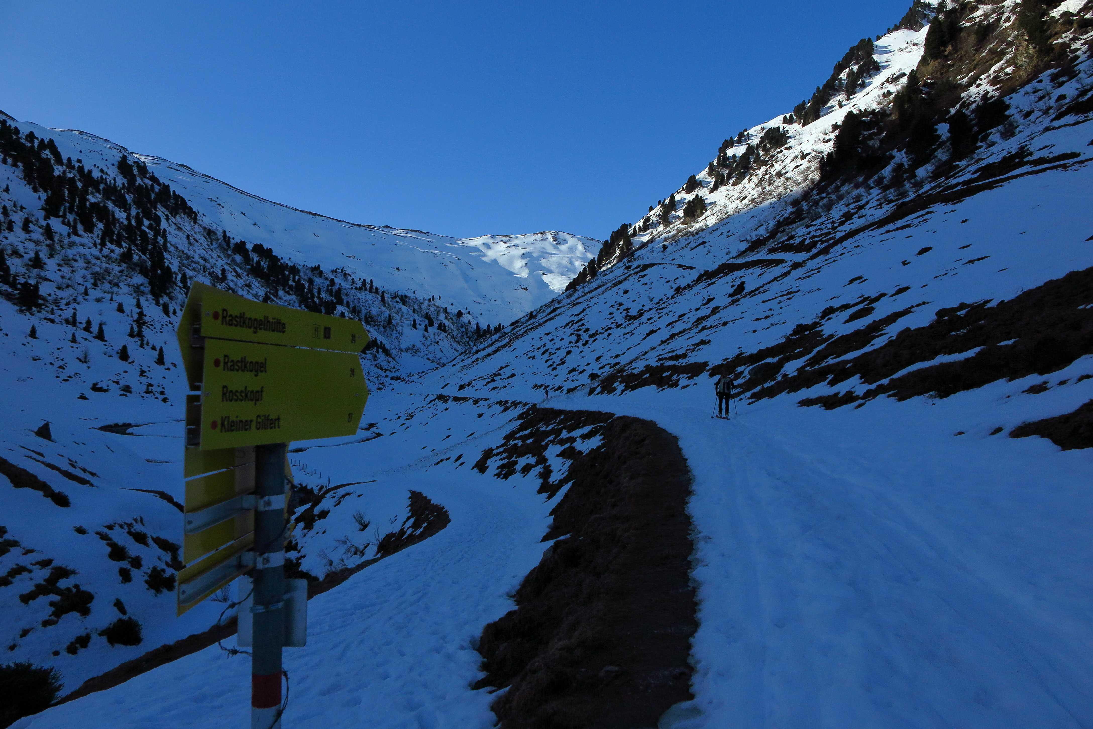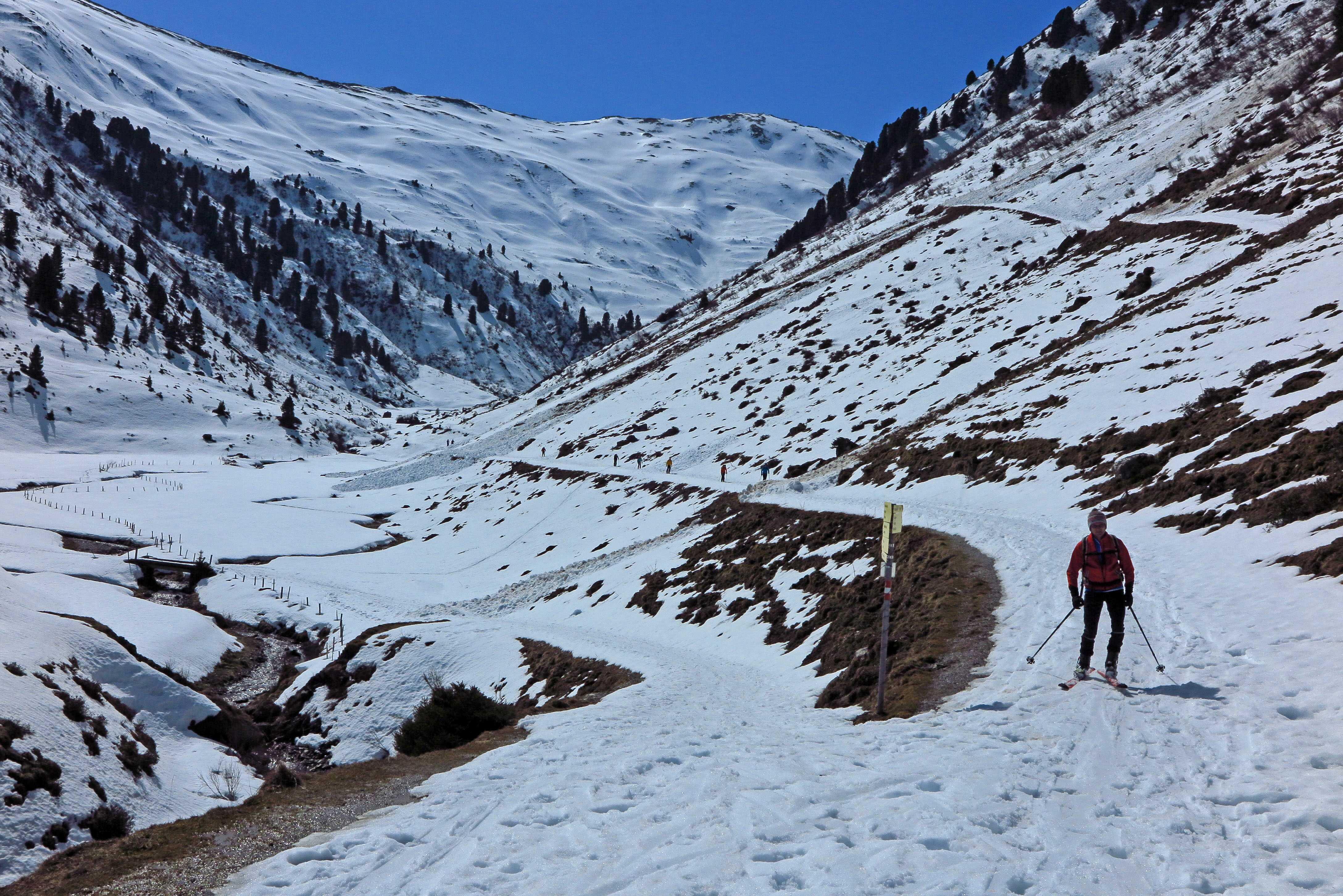 Schneelage: Gleich hinterm PP die Ski angeschnallt und auf dem Rodelweg ins Finsingbachtal hineinmarschiert. Der Schnee war am Morgen überall bockhart gefroren. Bei der Pfundsalm wird die Schneedecke schon sehr dünn. Am Gratrücken oberhalb des Sidanjoches war der Schnee dann schon von der Sonne etwas aufgeweicht. Abfahrt um ca. 11:00 über den NO-Hang, z.T. griffiger Harsch, in besonnteren Lagen schöner Firn. Der SO-seitige Schlusshang zum Bach hinab war dann schon ziemlich tief.
