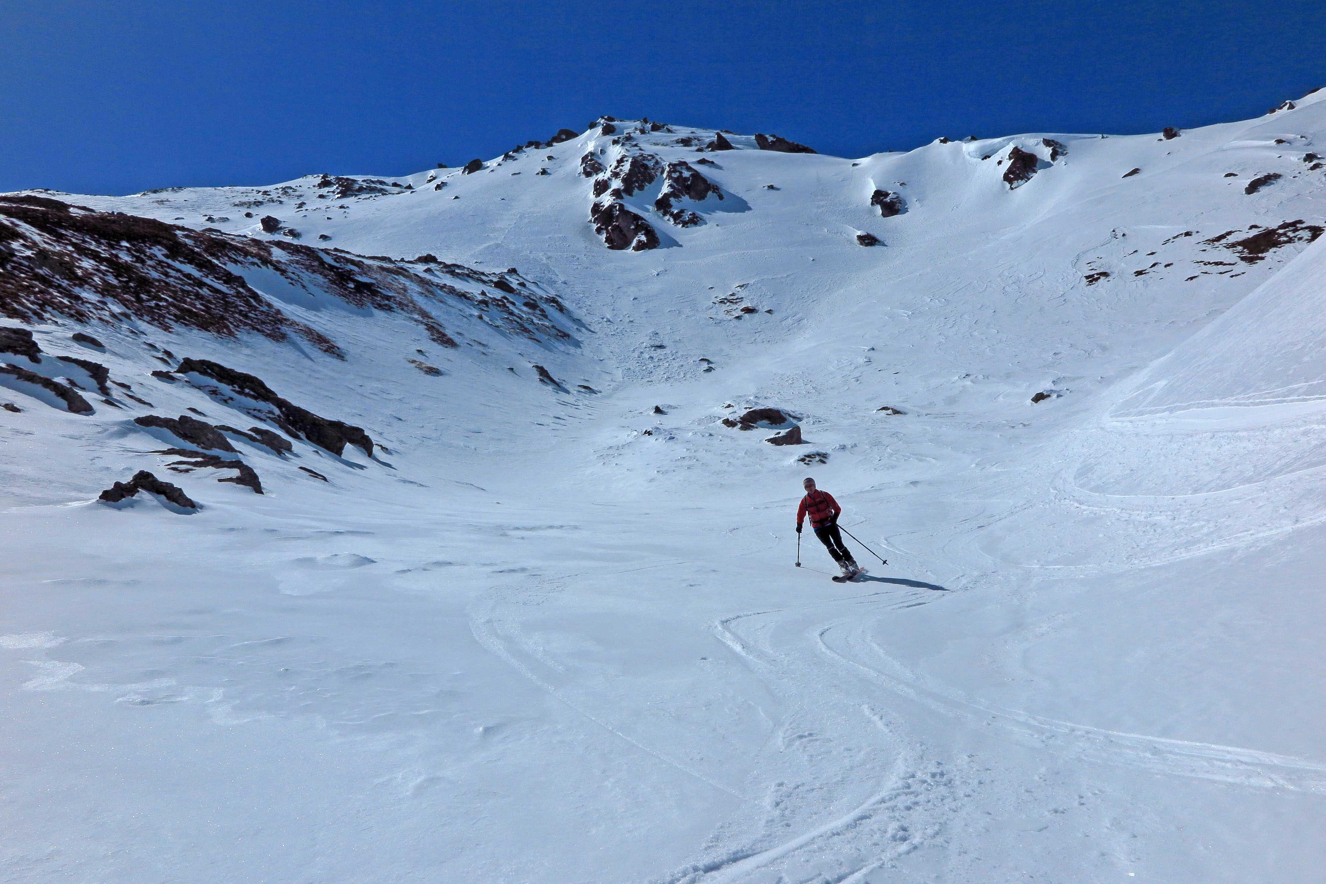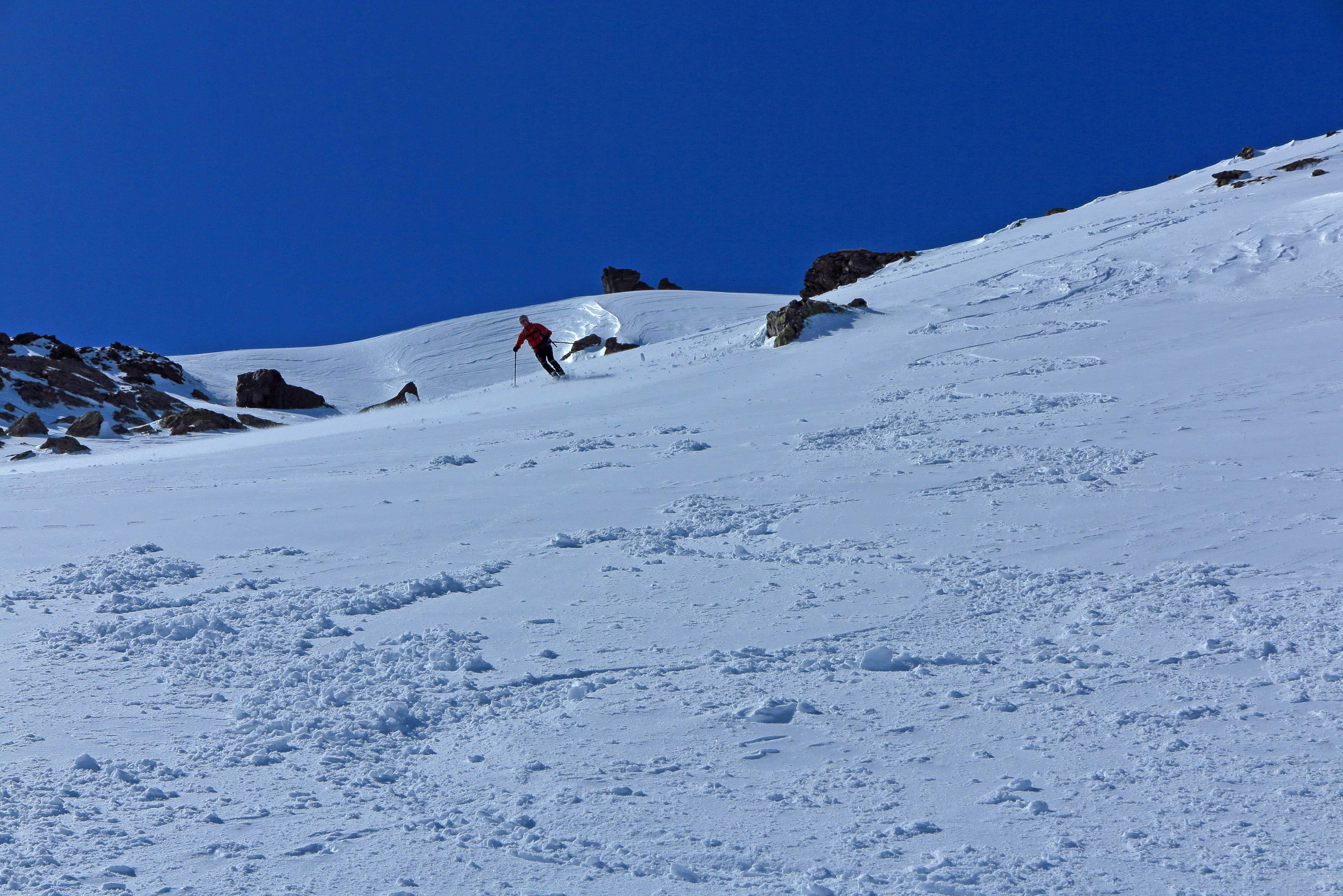 Wetter: Am Morgen ca. 3°C und recht frisch. Sobald man in die Sonne kam sehr mild. SO-seitig firnte es schon um ca. 9 Uhr auf, während es auf den N-Seiten noch hart war. Unter Tags leichte Wilkenschleier. Oben kaum Wind und mild.