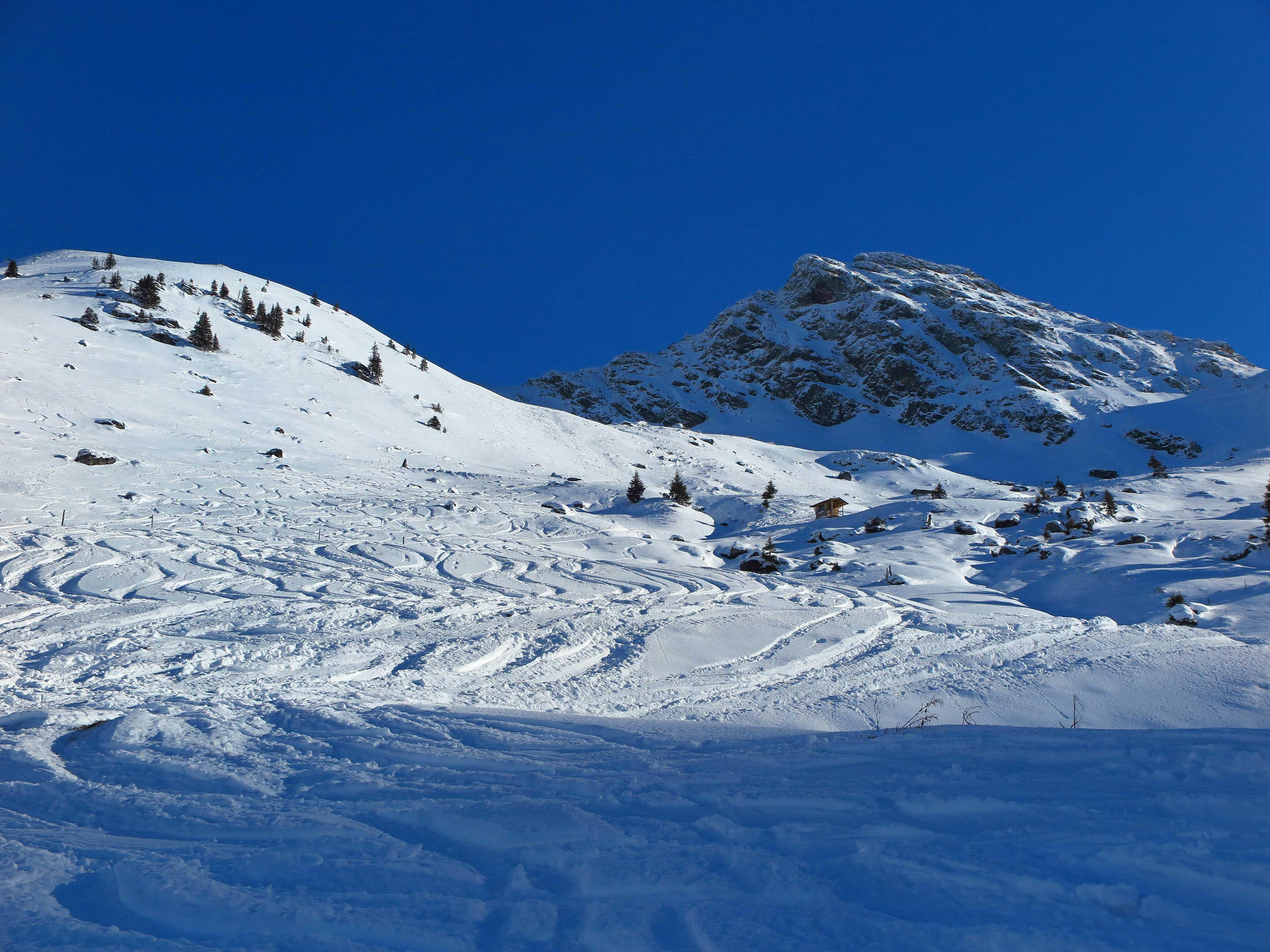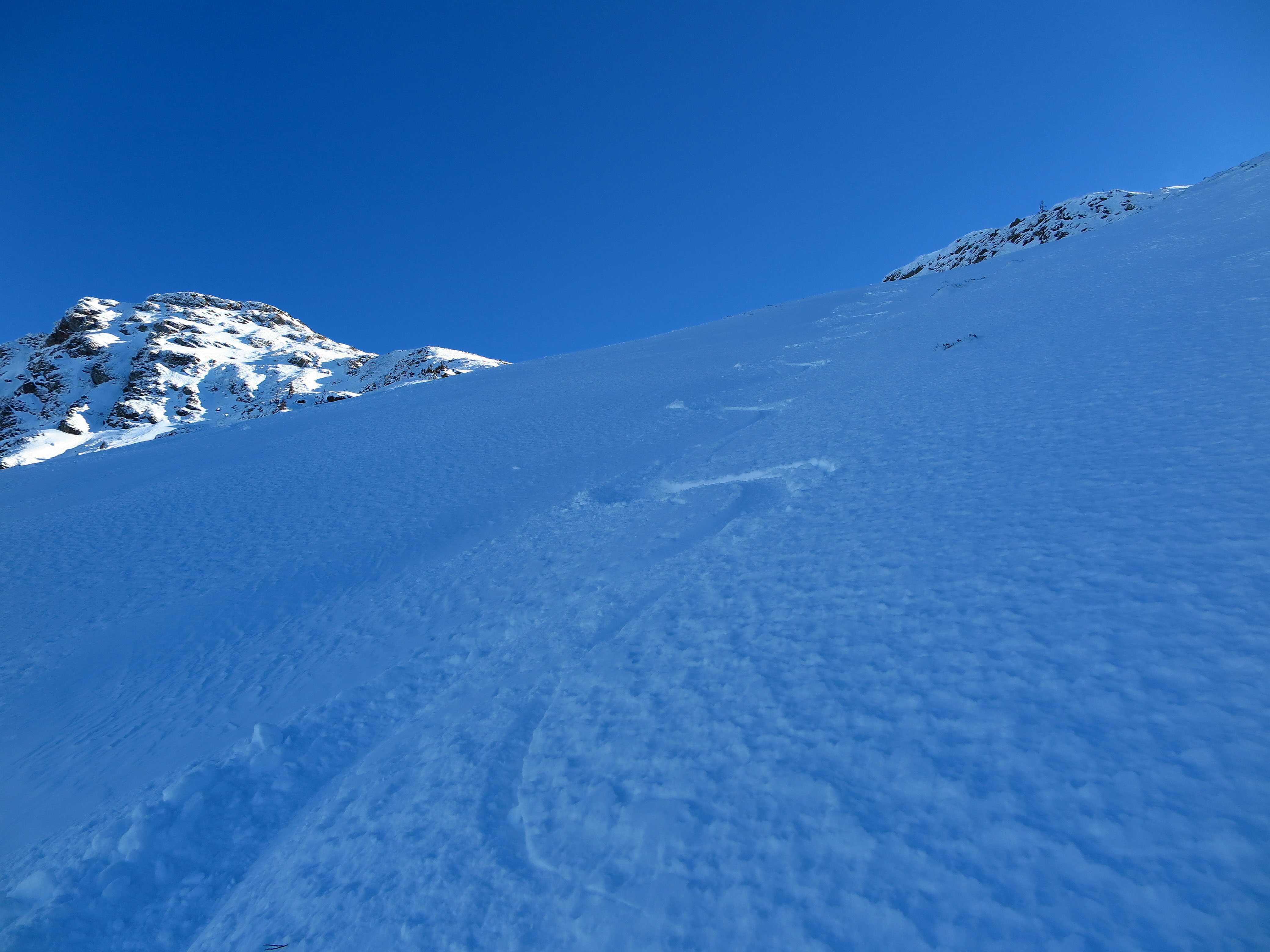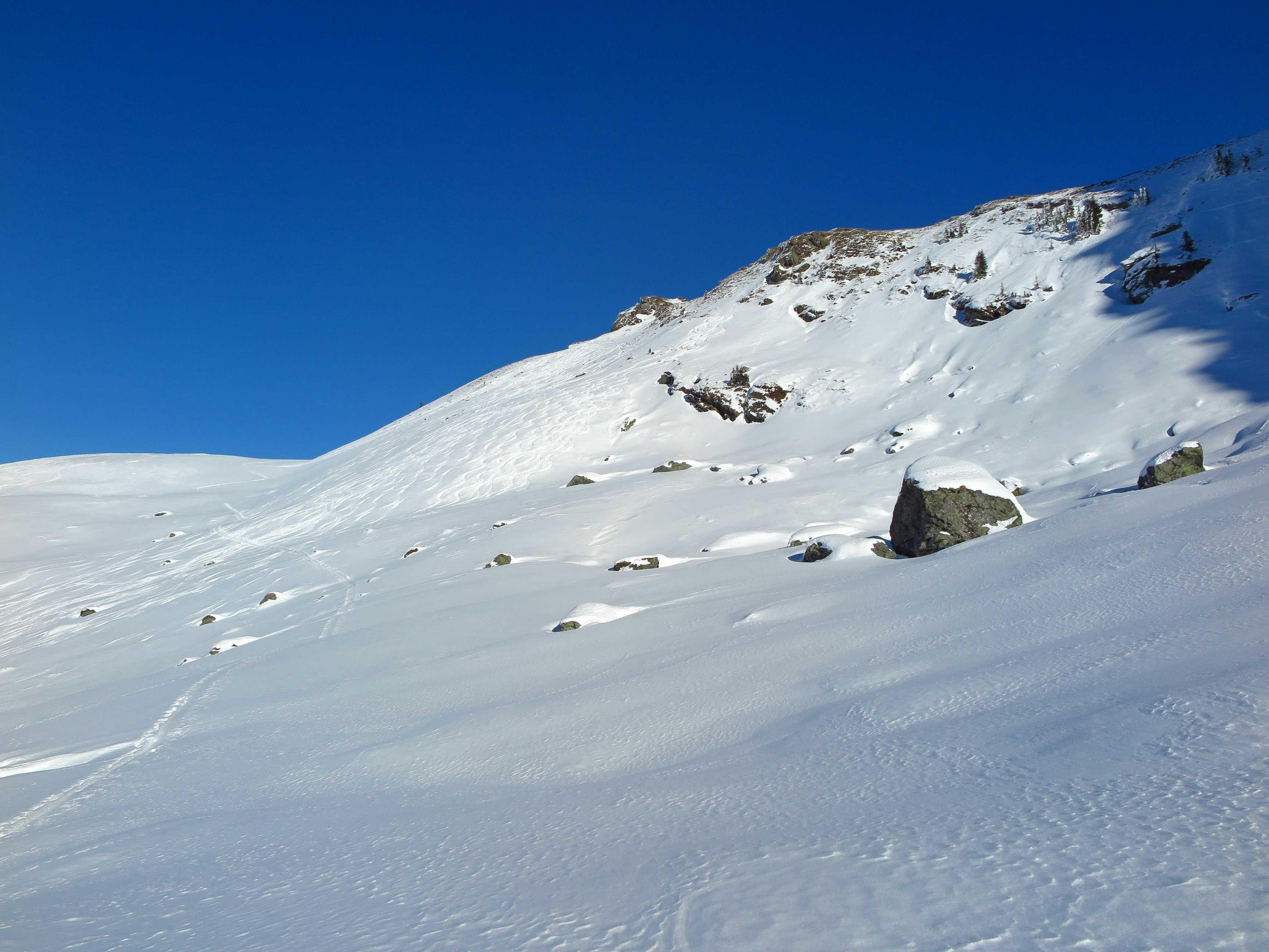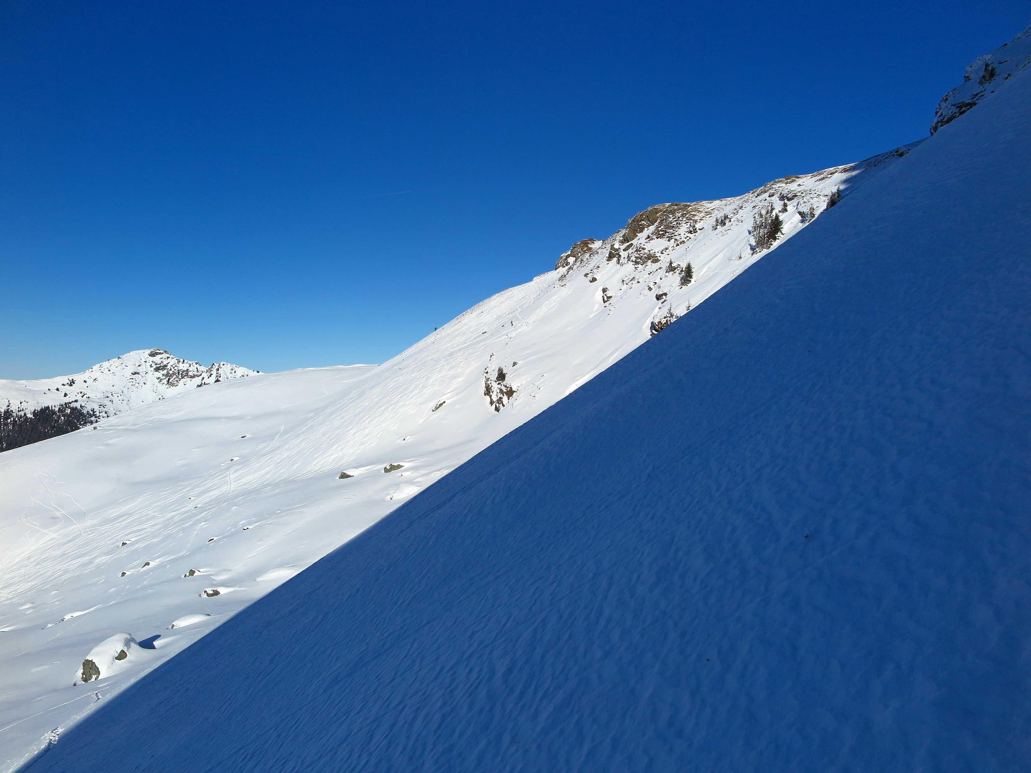 Schneelage: An steileren Sonnenhängen hatte sich am Morgen ein deutlicher Harschdeckel gebildet. Ansonsten noch guter Pulverschnee, wo der Wind nicht hinkommt. Oben stellenweise schon durch den starken S-Wind verblasen oder zu Pressschnee verwandelt.