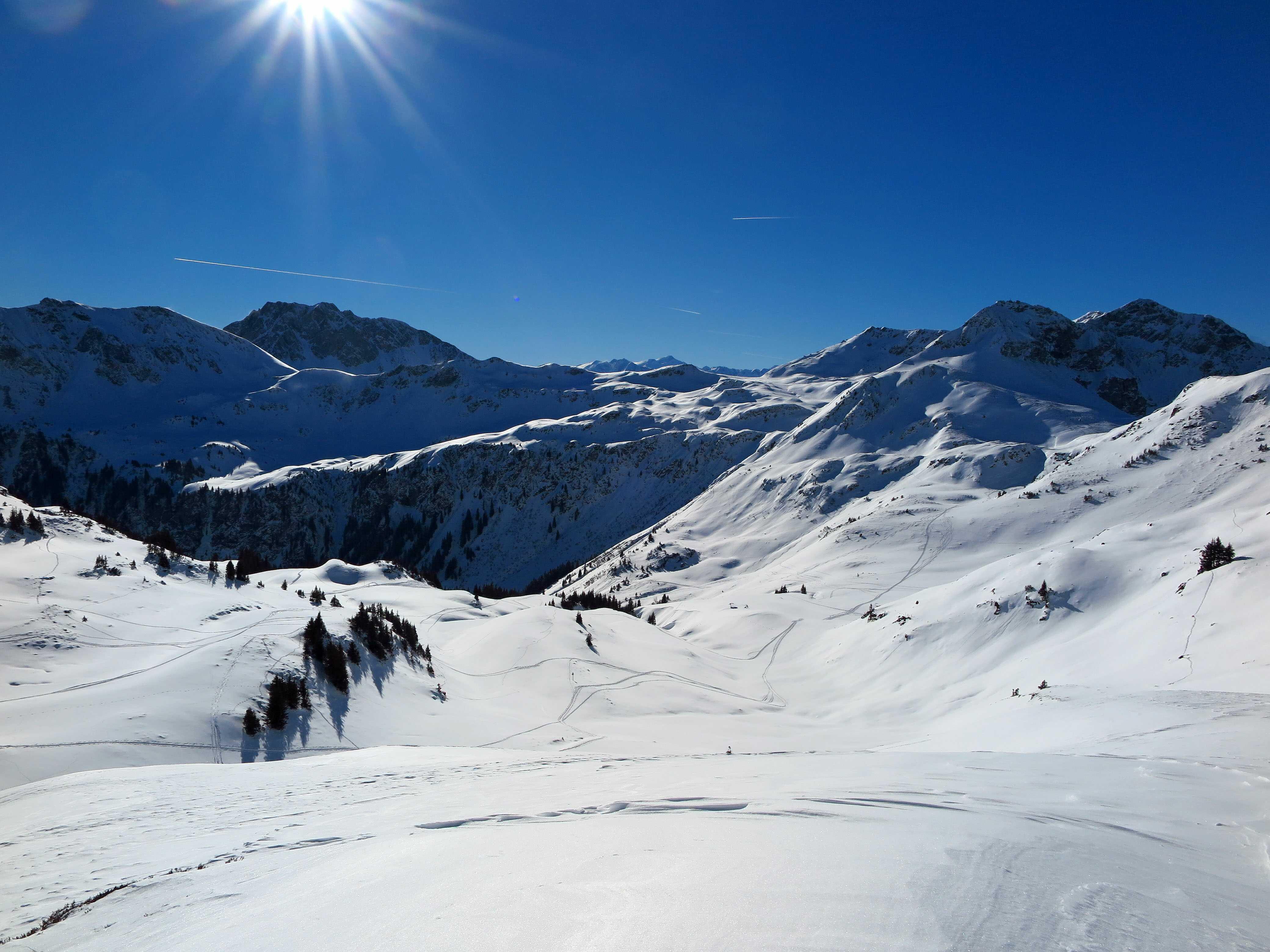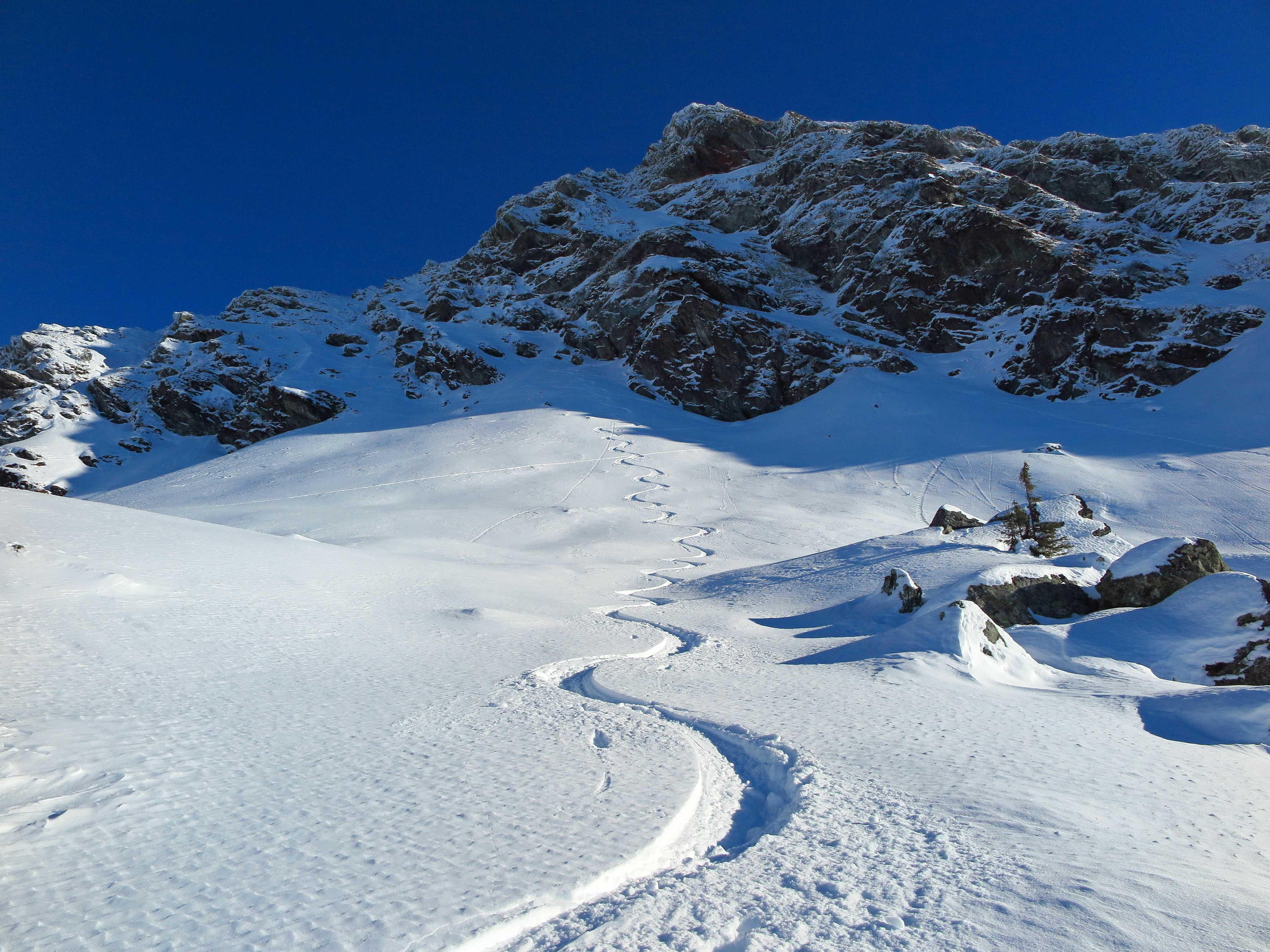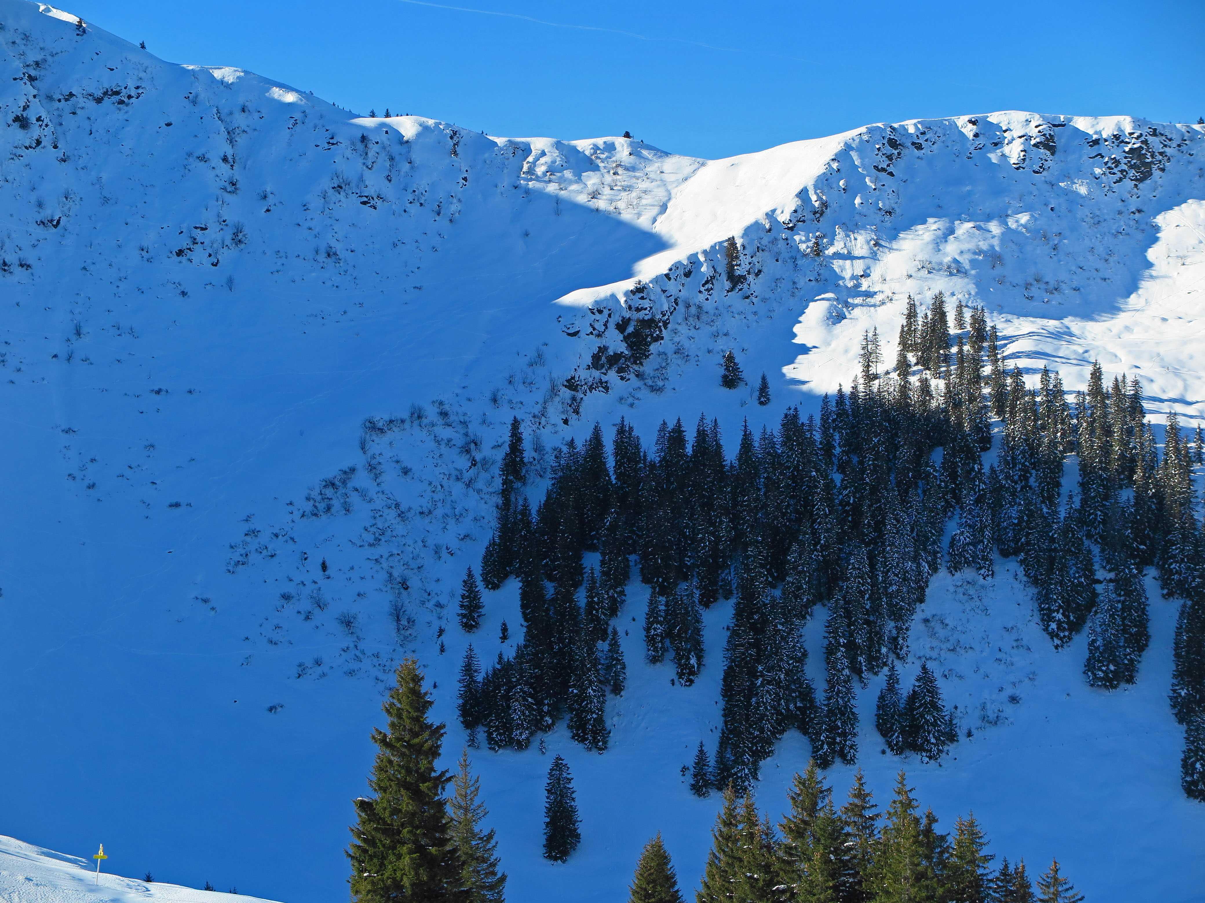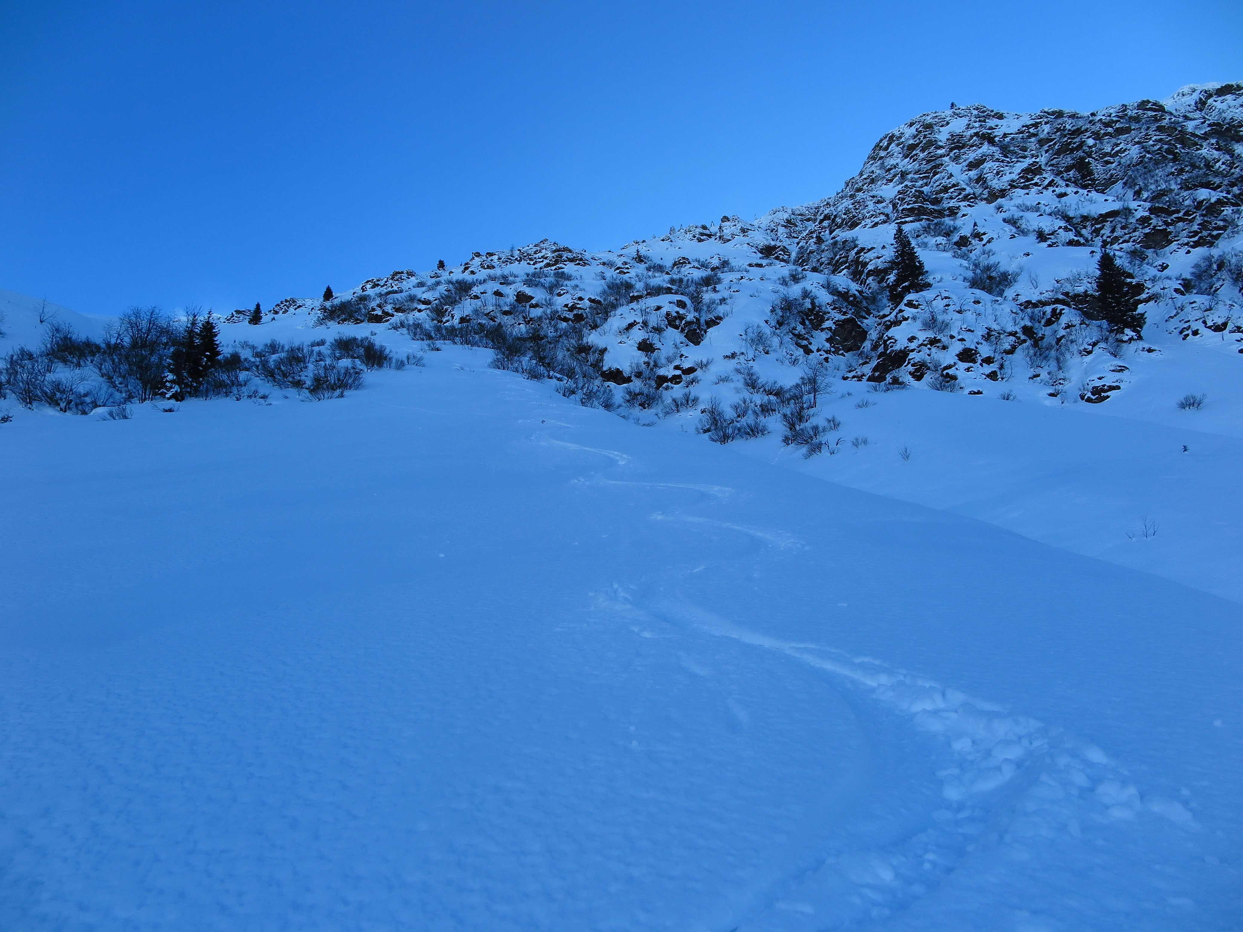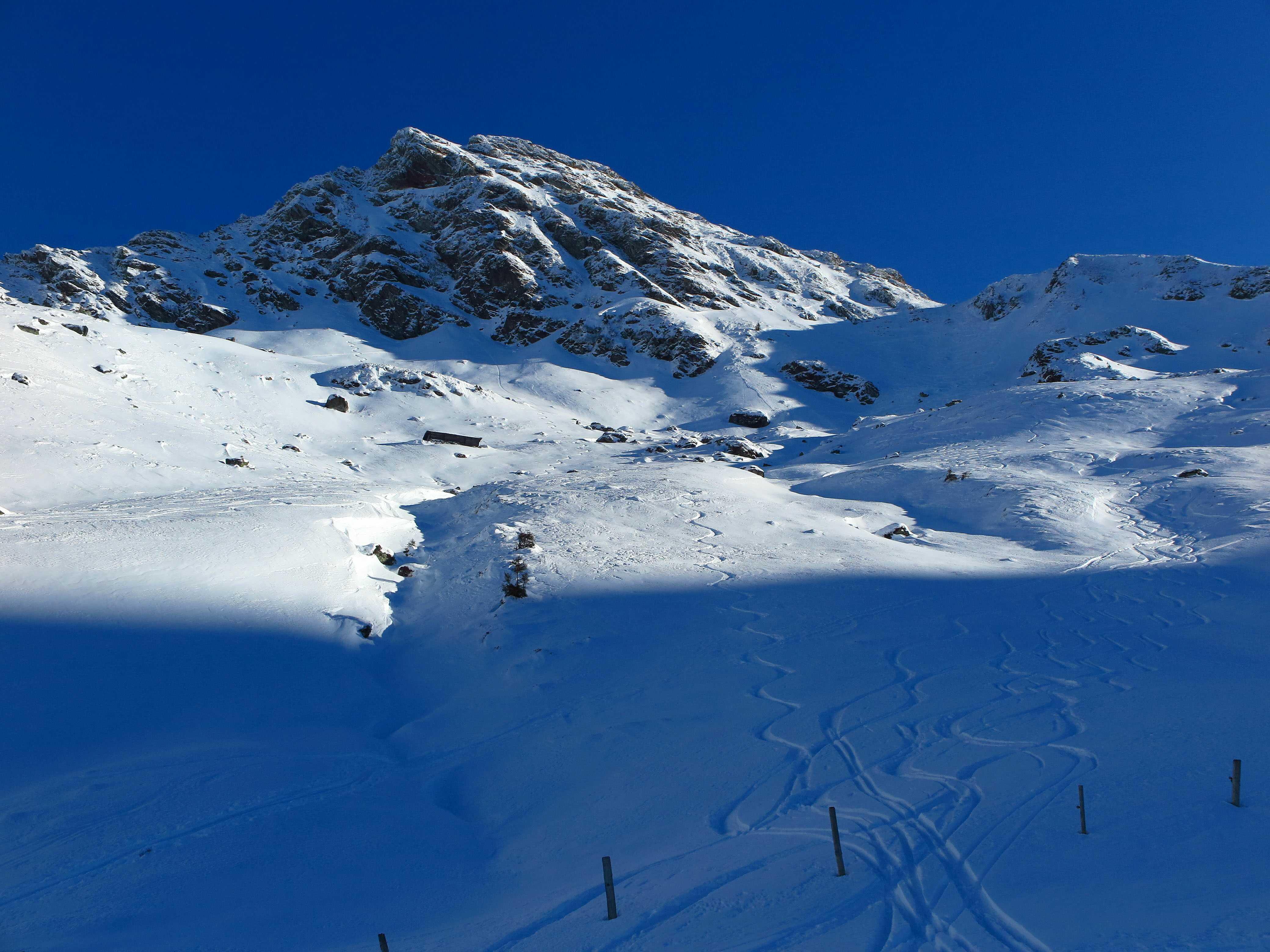 Schneelage: An steileren Sonnenhängen hatte sich am Morgen ein deutlicher Harschdeckel gebildet. Ansonsten noch guter Pulverschnee, wo der Wind nicht hinkommt. Oben stellenweise schon durch den starken S-Wind verblasen oder zu Pressschnee verwandelt.
