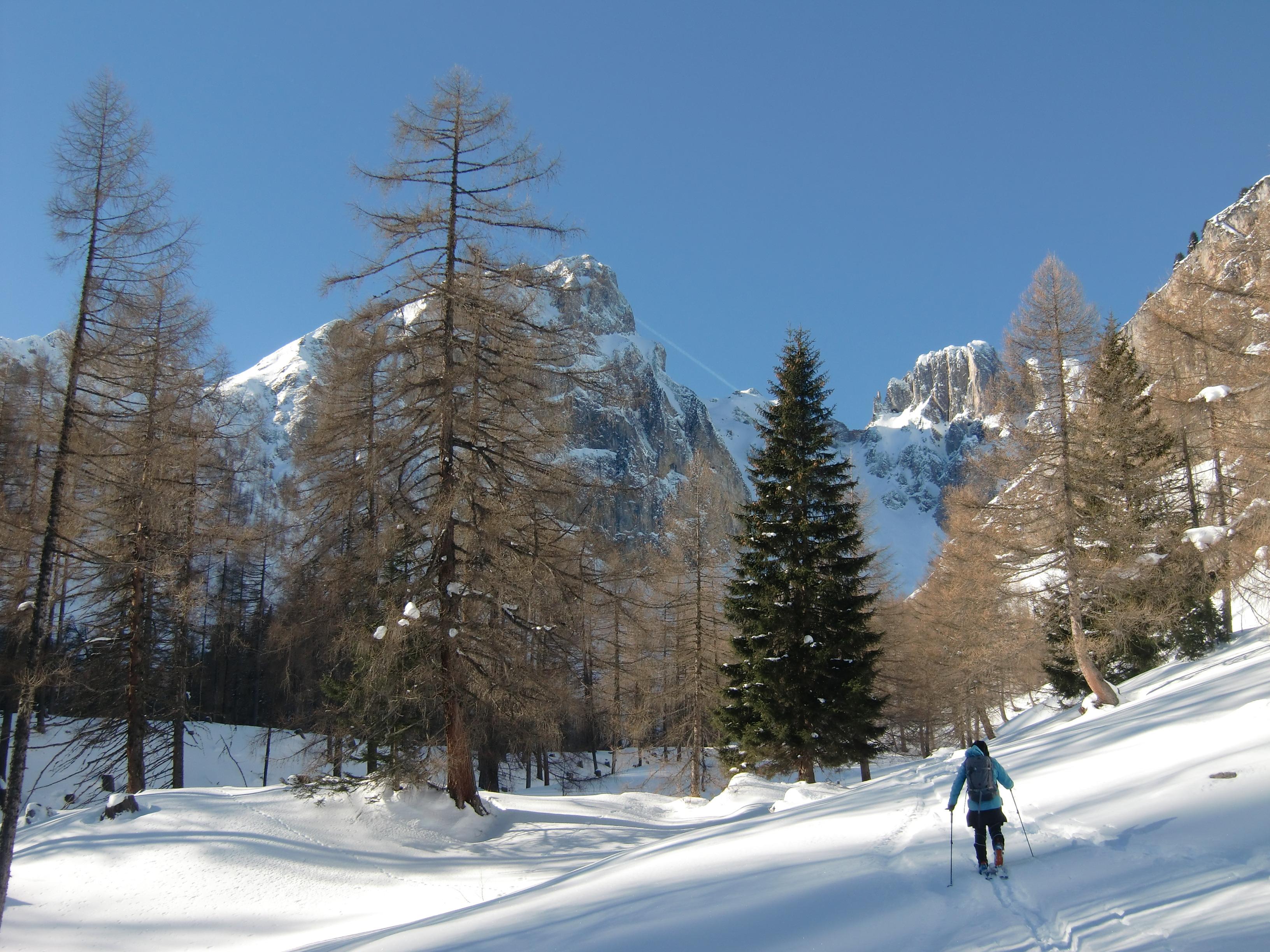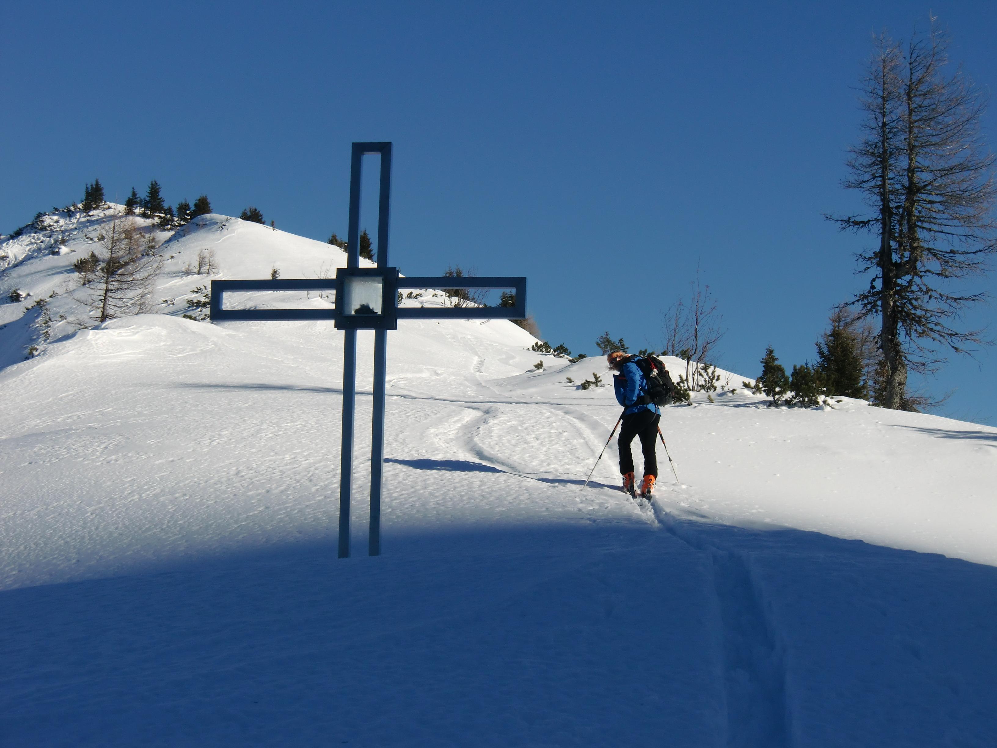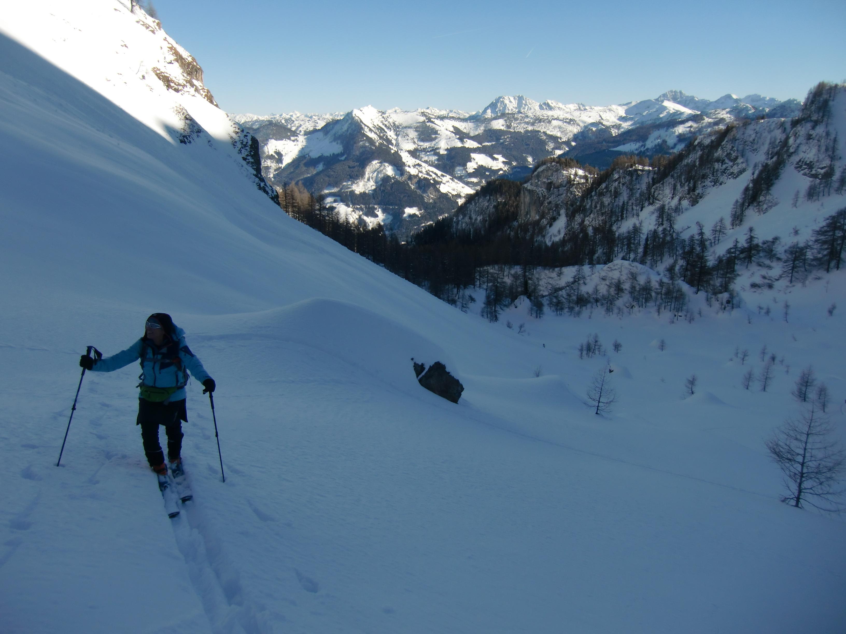 Schnee/Lawinen: Obwohl das Kar und der ganze Aufstieg generell ostexponiert ist, kommt ganz wenig Sonne rein, also fast die komplette Tour kalt-pulvrig, teilweise mit rauschendem Raureifpelz, traumhaft. Nur an ganz wenigen, kurzen Stellen eine oberflächliche Glasur, trotzdem gut zu fahren. Puncto Lawinen ist ein Respektabstand zur besonnten Schrofenflanke rechts des Aufstiegs nicht schlecht, ein dickes Gleitschneepaket hat sich während unsrer Gipfelrast gelöst, den darunterliegenden Gully ausgeputzt und ist exakt bis zur Aufstiegsspur geflossen. Die Trasse selbst ist nur an einem kurzen Aufschwung vom Sattel zw. Höllwand und Schober rauf auf den Westkamm etwas steiler, sonst harmlos.