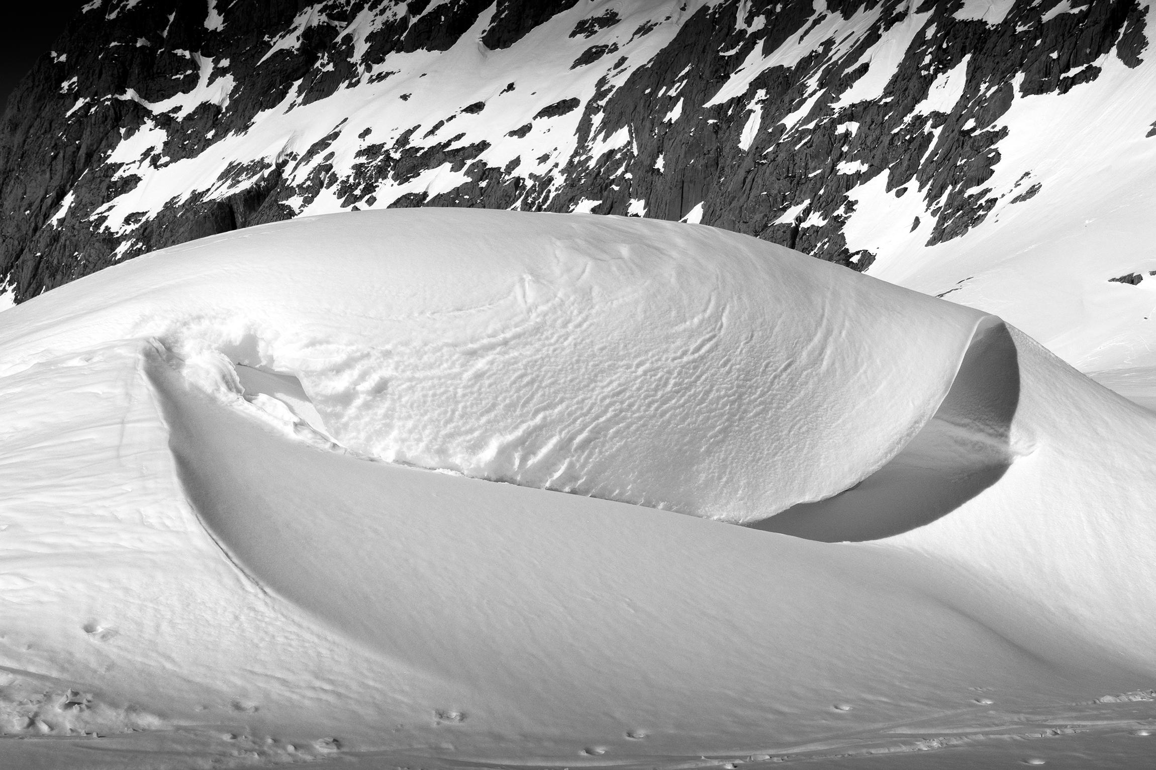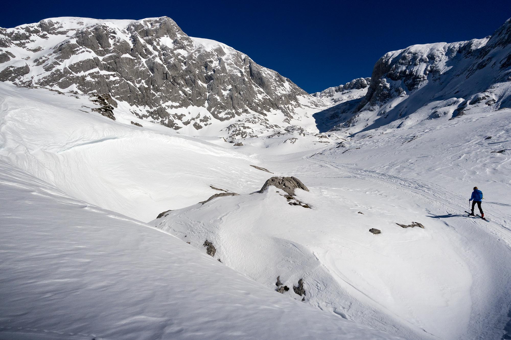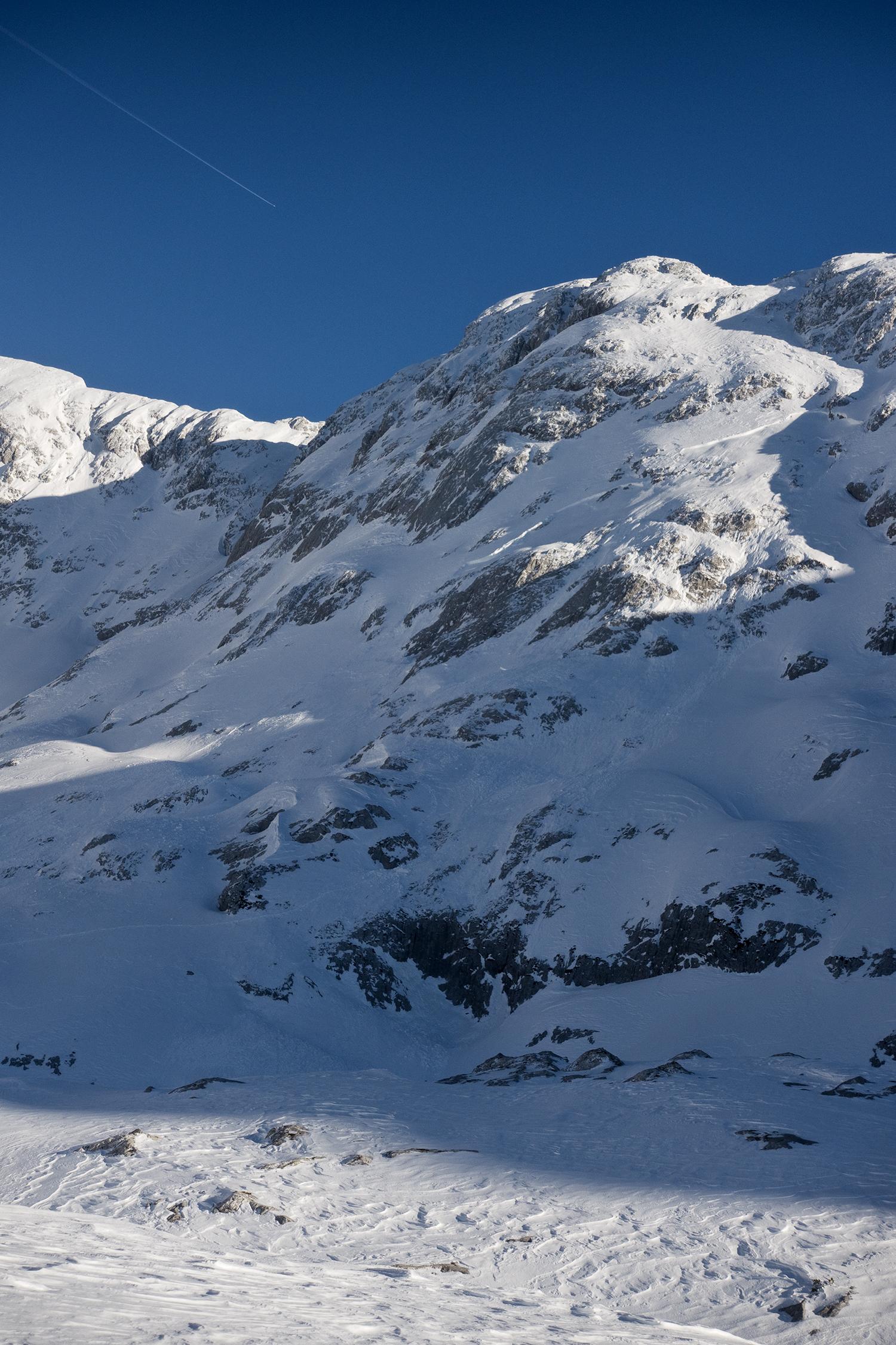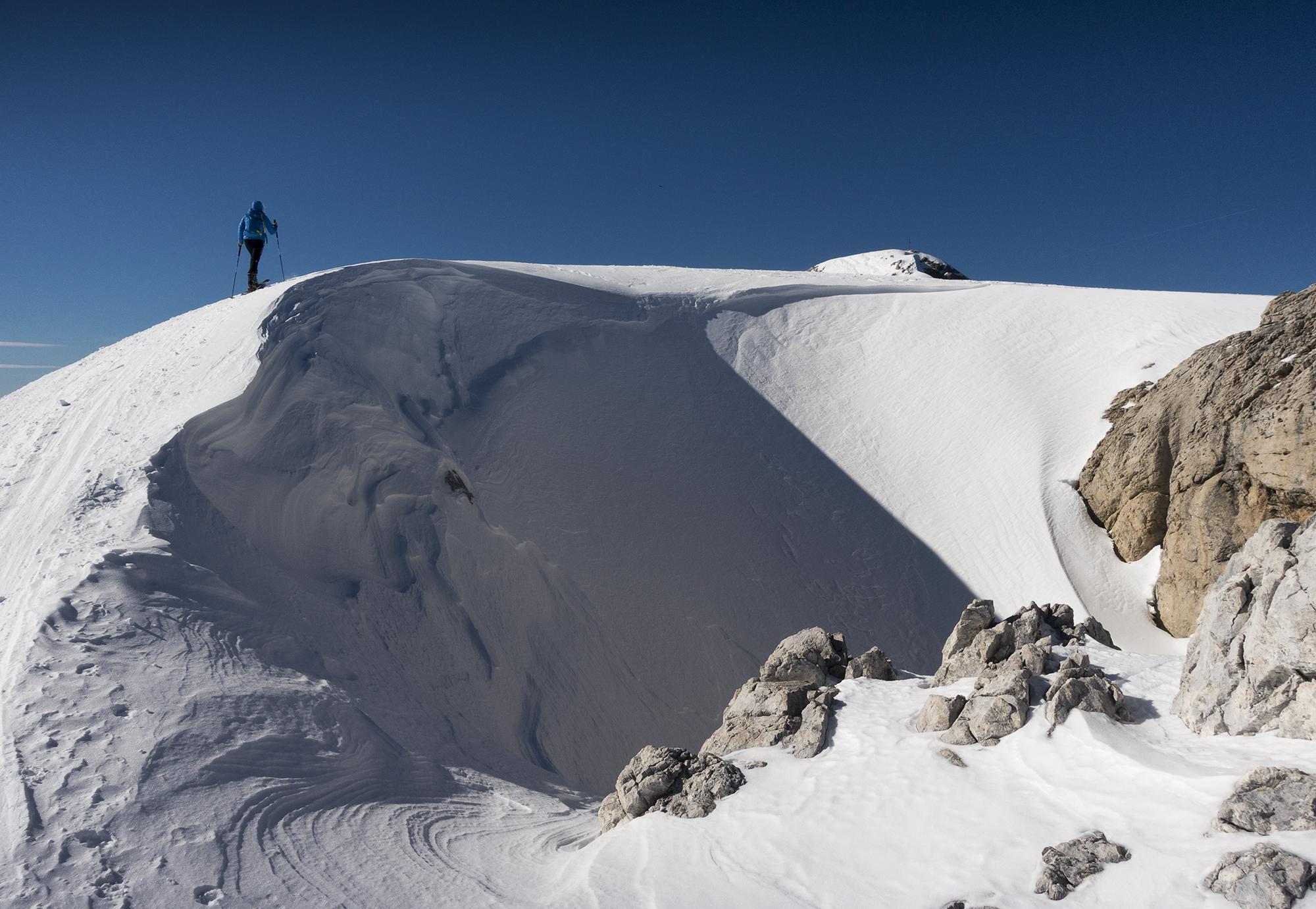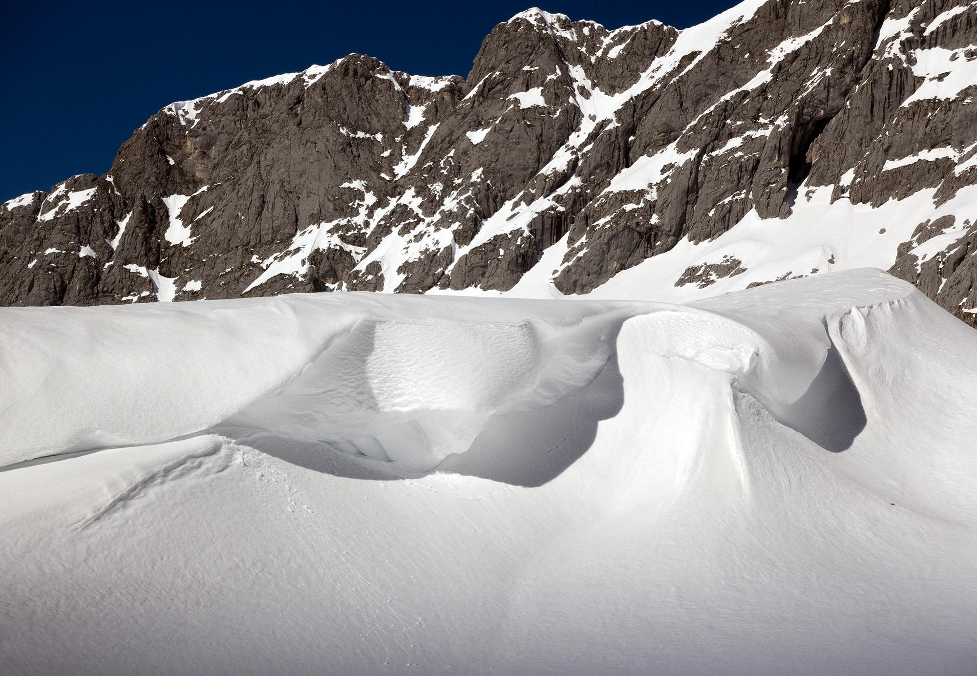 Gute Verhältnisse am Hohen Göll! Nur bis zur Wandquerung muss man die Ski tragen, darüber ist (sicher nicht mehr lange) genug Schnee. Für den Aufstieg sind nachmittags auch keine Harscheisen notwendig, obwohl das Alpltal zum Teil pistenartig eingefahren ist und Lawinenknollen hat. Der Weiterweg durch die Umgäng und der Gipfelhang sind gut zu gehen und wieder abzufahren, auch spätnachmittags nicht zu weich geworden. Am Gipfel wehte ein kalter Nordwestwind. Beeindruckend waren die Anrisskanten der Schneebrettlawine in der Flanke des Hohen Brett, die am 14.3. einen Skifahrer verschüttet hat. Das Gelände weist nämlich generell sehr wenig Schnee auf, mit eingewehten Bereichen, wo viel Schnee ist. Böse Falle.