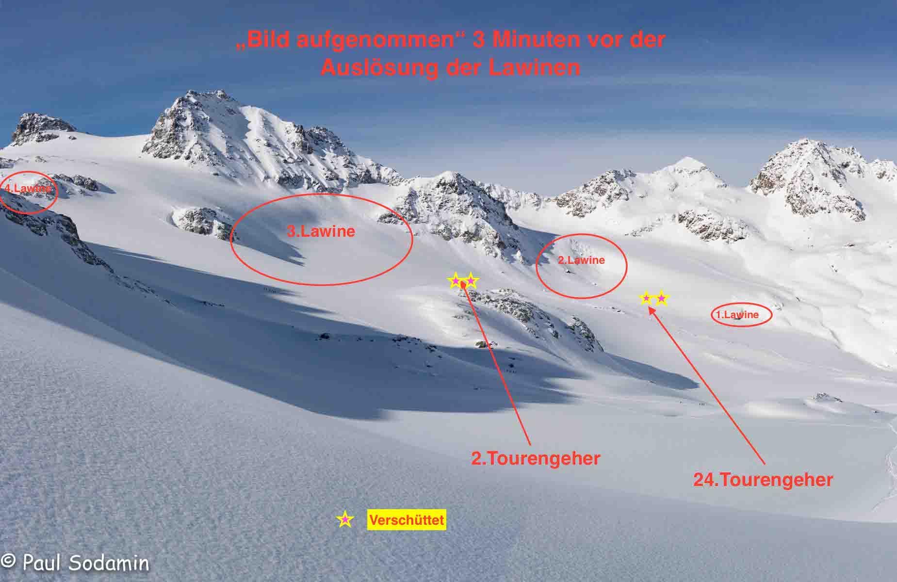 Zeitgleich ging nordöstlich der Jamtalspite auf 2900 Meter ein drittes Schneebrett ab, dessen Auslauf zwei Steirer im Alter von 55 und 48 Jahren erfasste. Während einer der beiden durch einen ABS-Rucksack nur oberflächlich verschüttet wurde, wurde der zweite Mann von den Schneemassen zur Gänze begraben. Seinem Begleiter gelang es, ihn rasch zu orten und auszugraben. Beide blieben unverletzt.