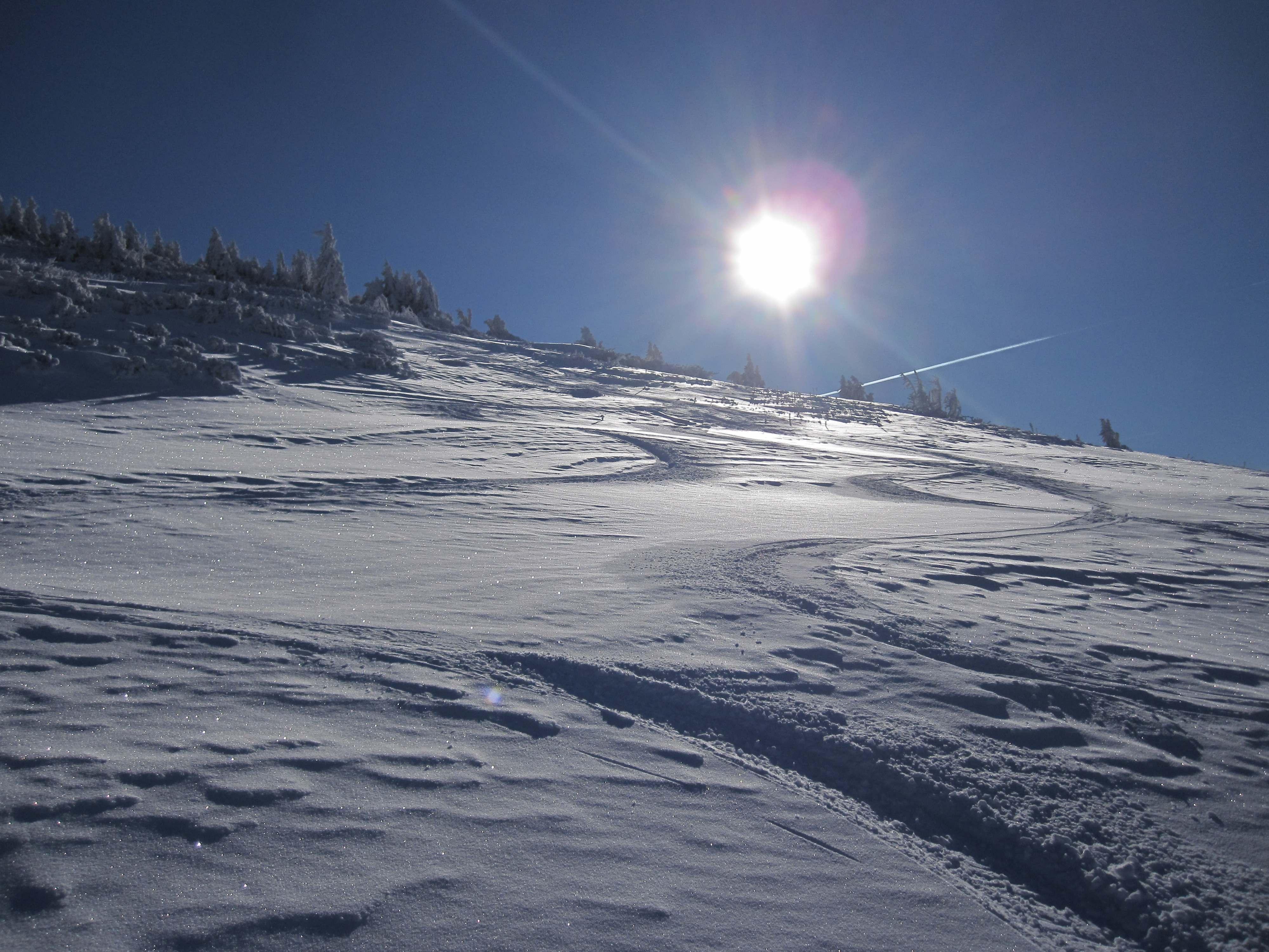 Am Gipfelhang 20 -25 cm, teils Pulver, teils mit einer Eiskruste überzogen. Abfahrt trotzdem genussreich u. kaum Feindkontakt.