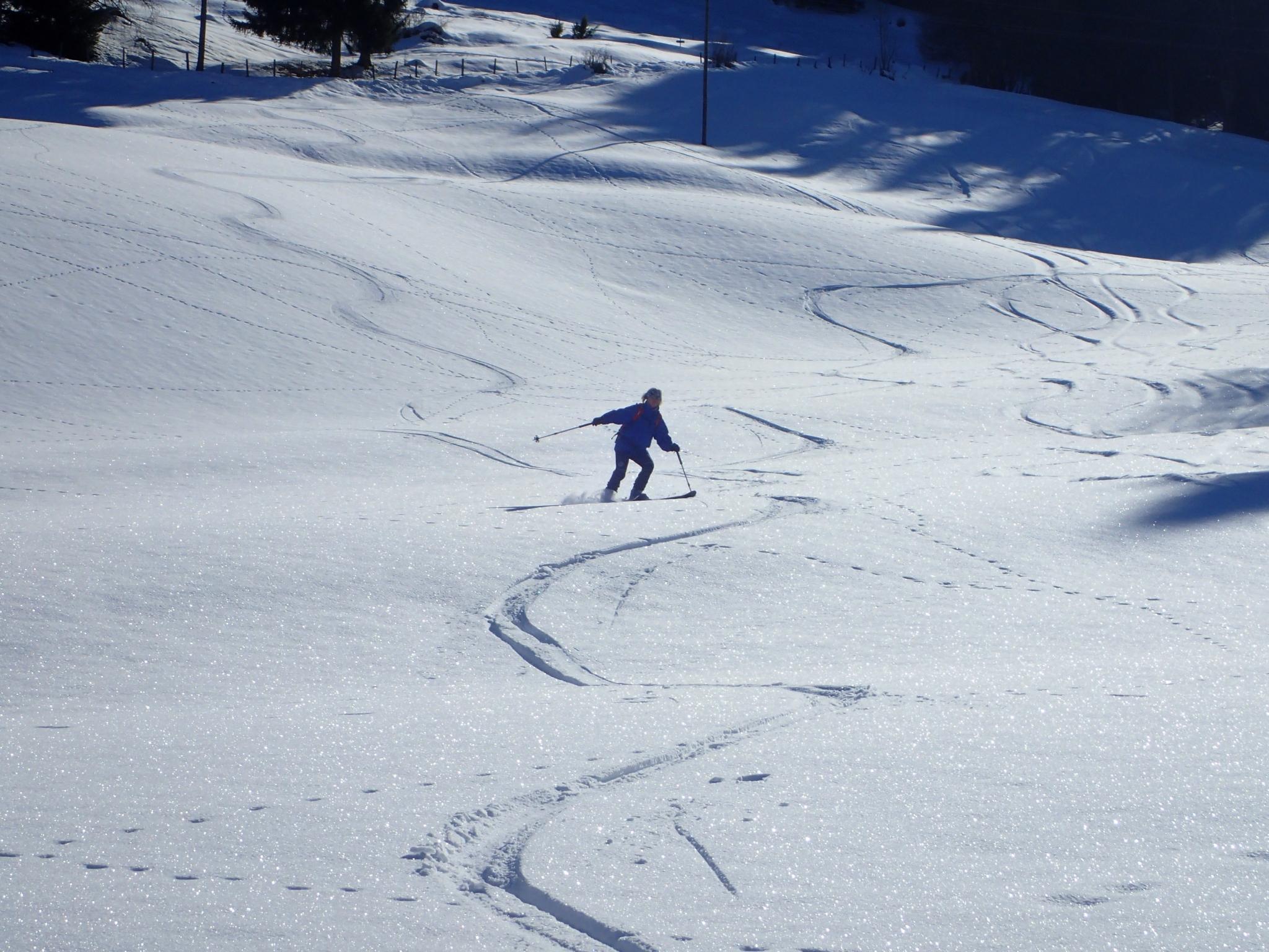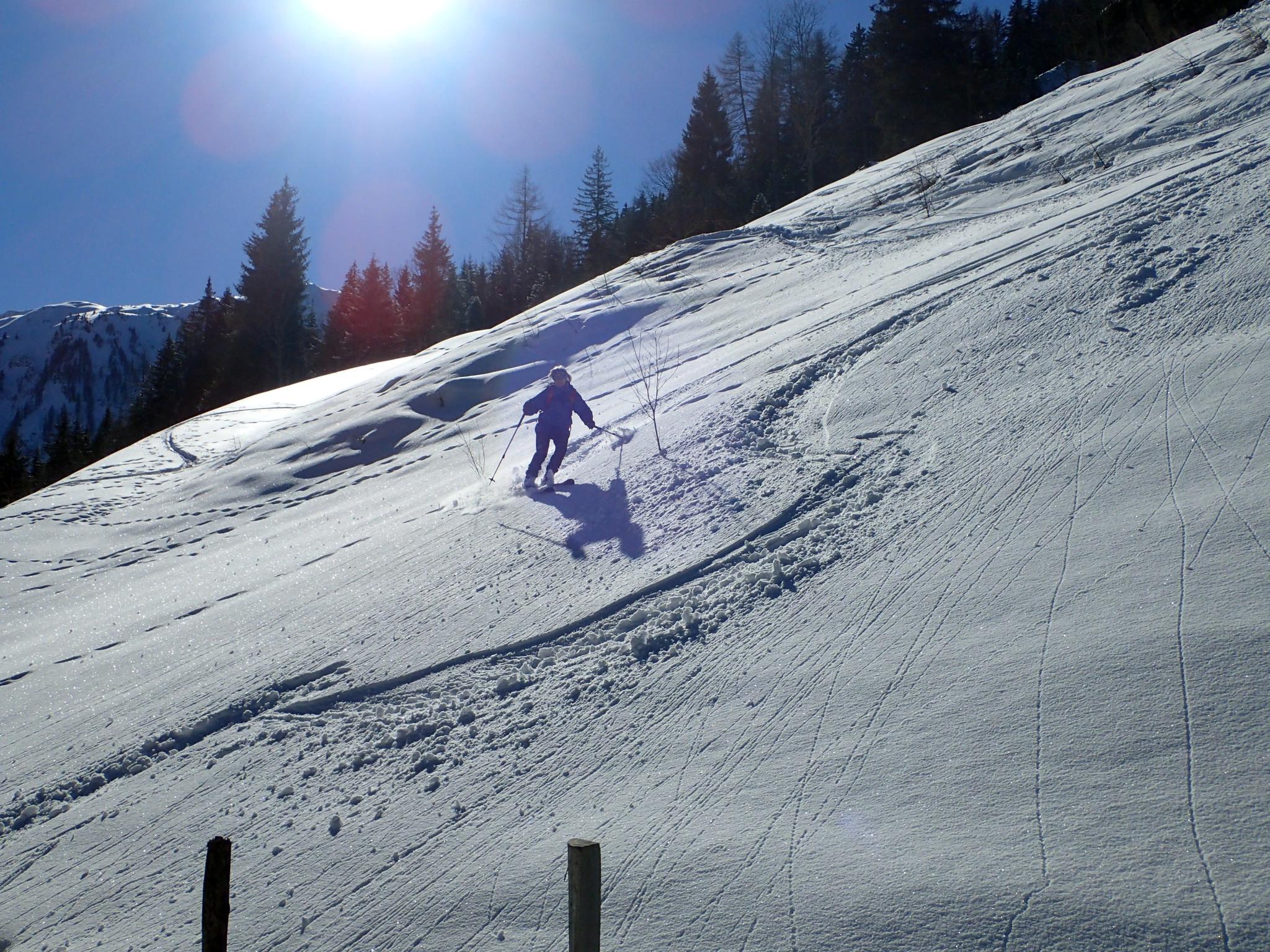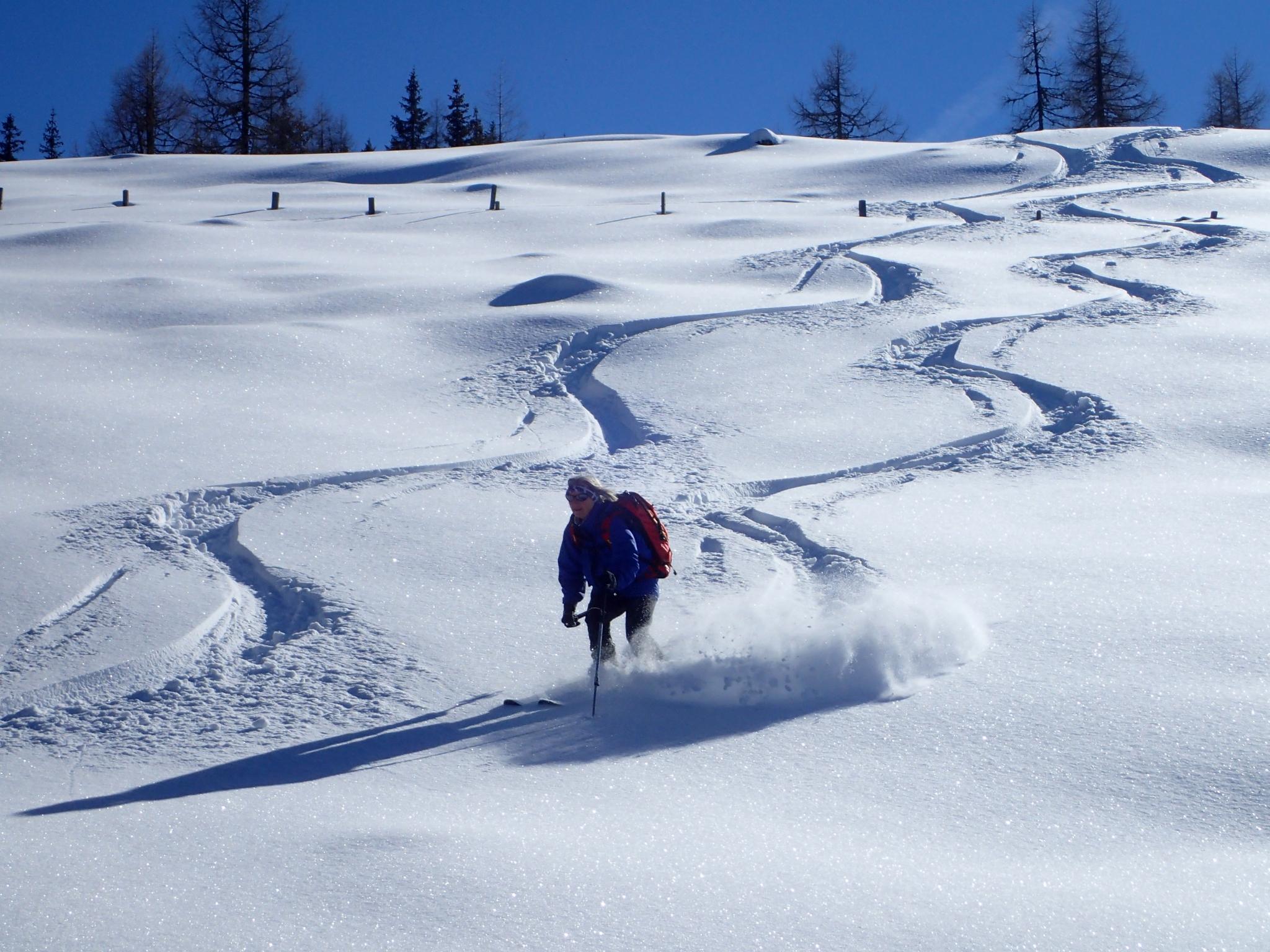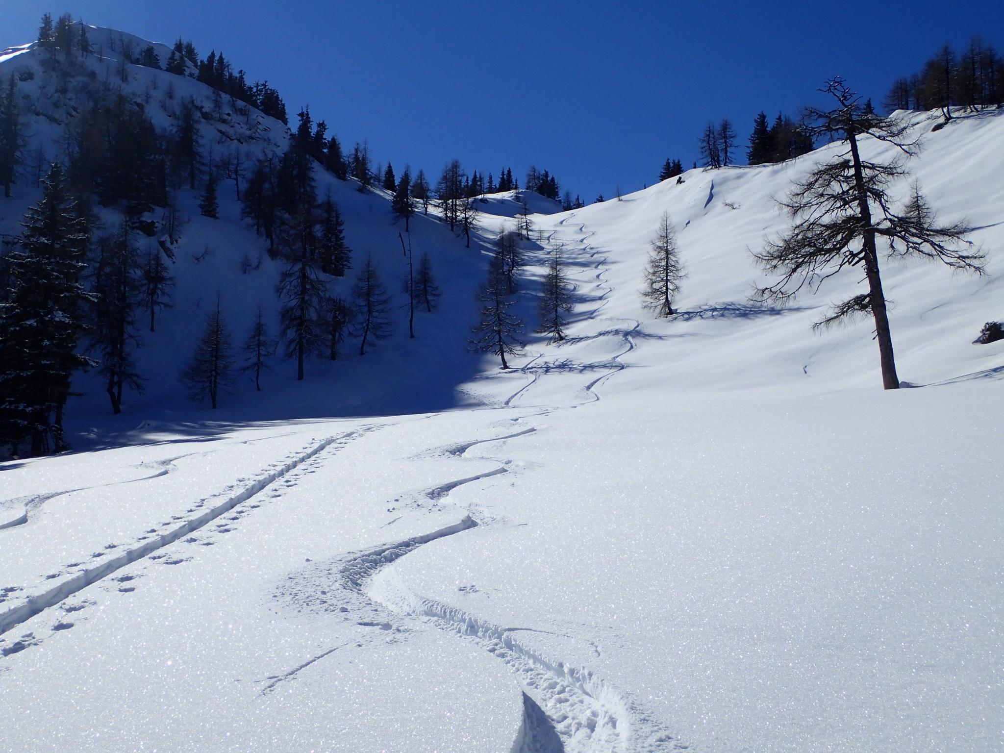 Allgemeine Verhältnisse, Schnee: Beim Ausgangspunkt ca. 2 – 3 cm Neuschnee auf nur teilweise tragfähigem Grund, Ab Teufenbachtal konstant ansteigend auf maximal 20 cm, sonnseitig sofort mit Stich, anstöckeln. Abfahrt bis ins Teufenbachtal sehr schön, überwiegend unverspurter Pulver. Fahrweg im Wald ungut hart und rippelig, die letzten Wiesen zum Stoffdörfl mit schnittigem Schnee.