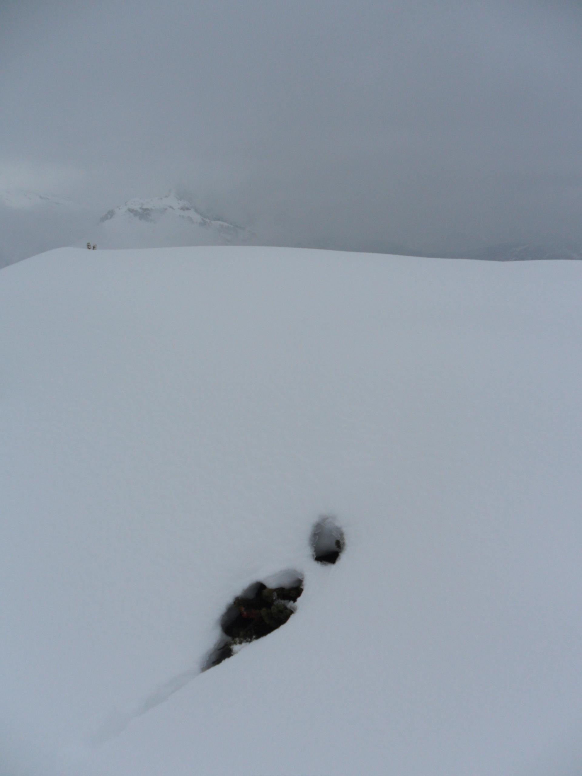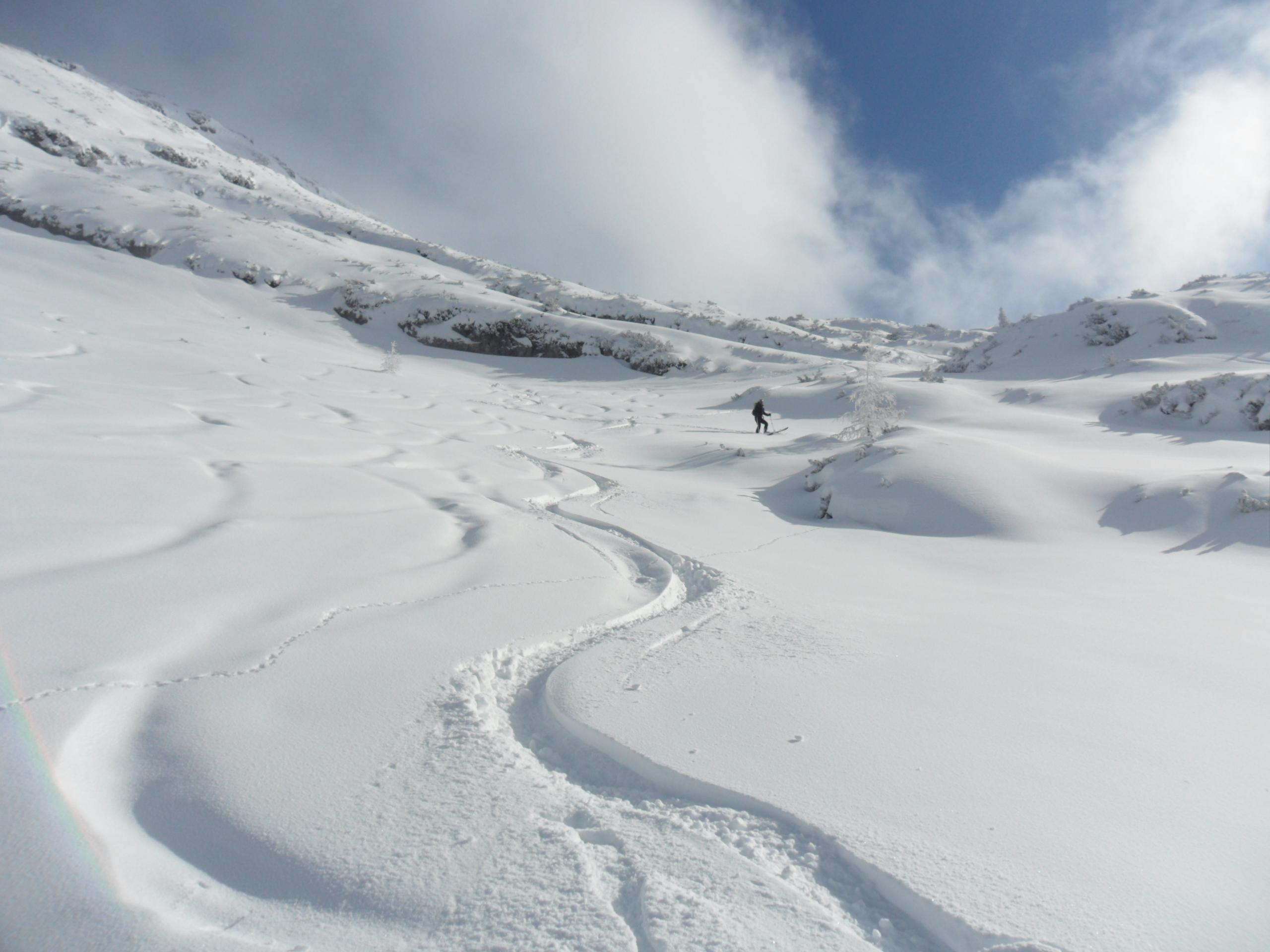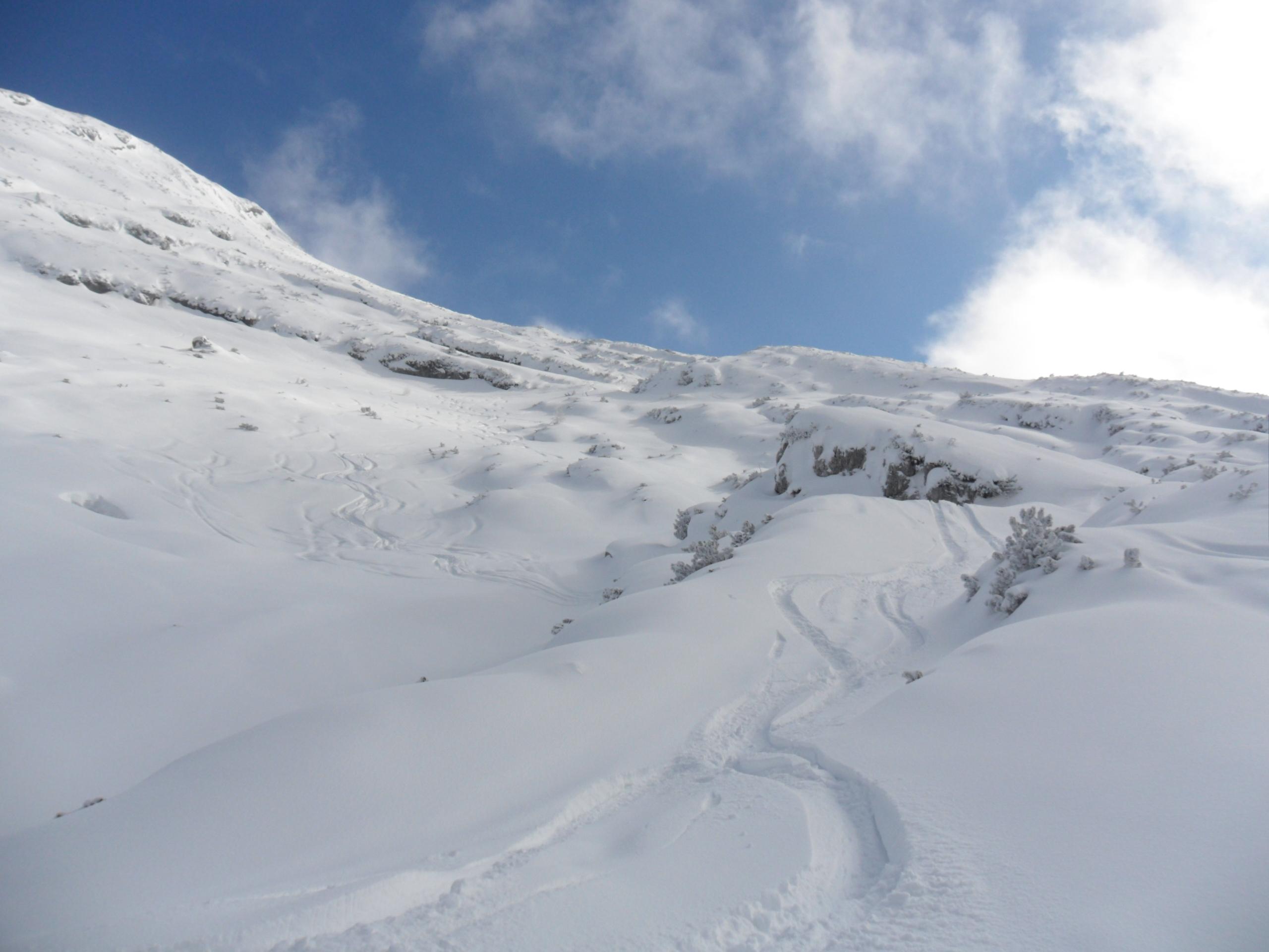 5 cm Pulver vom Parkplatz weg, nach oben hin bis zu 20 cm. Alles schön befahrbar. Am Gipfelhang nimmt die Neuschneemenge wieder etwas ab. Eisige oder verfestigte Stellen gibt es aber keine. Im Latschenfeld gibt es ein paar wenige Stellen auf die man achten sollte ( Siehe Foto ). Oberhalb der Querung vor dem letzten Hang zum Gipfel sind auf einem kurzen Teilstück auch Feindkontakte möglich.