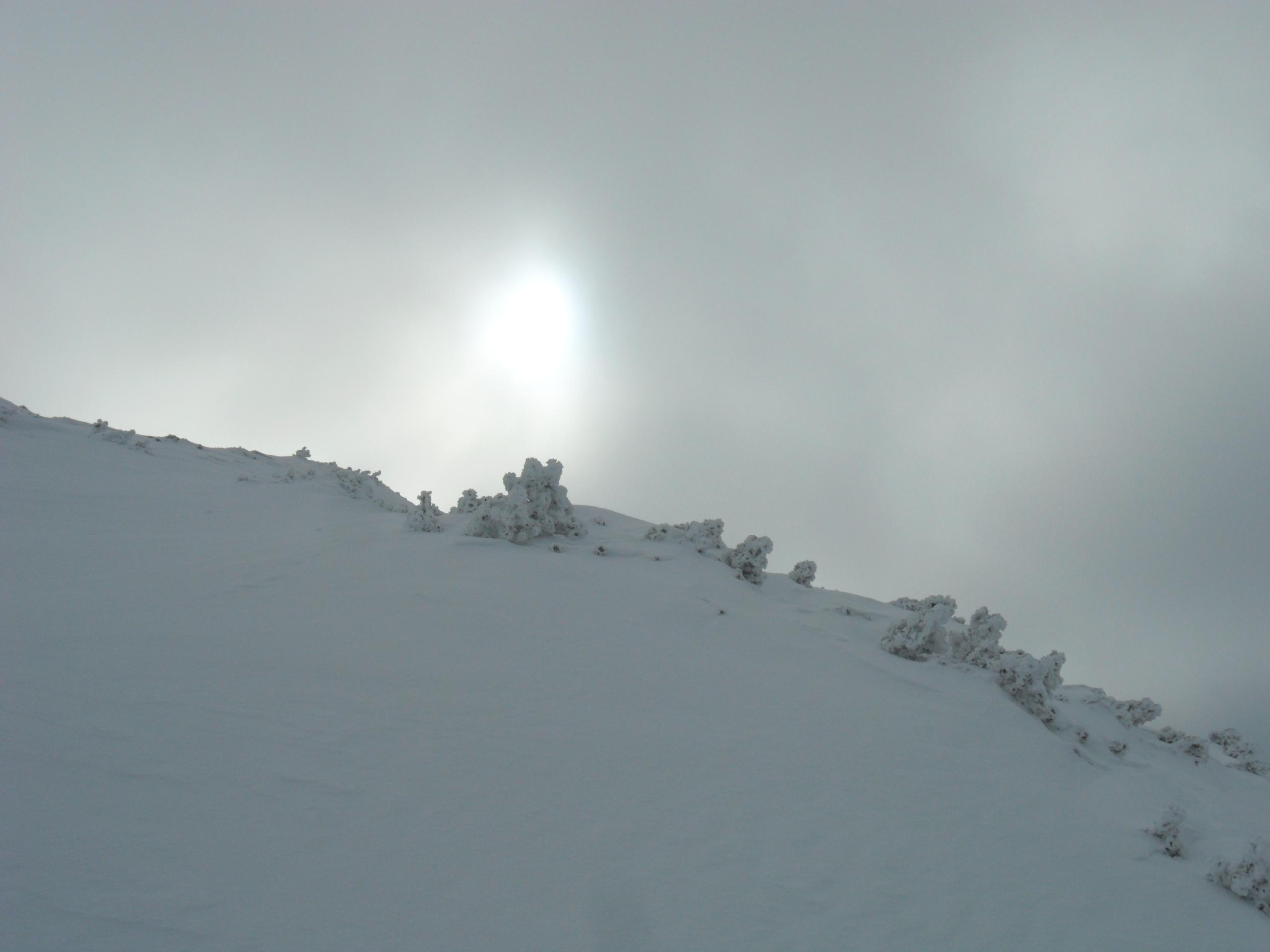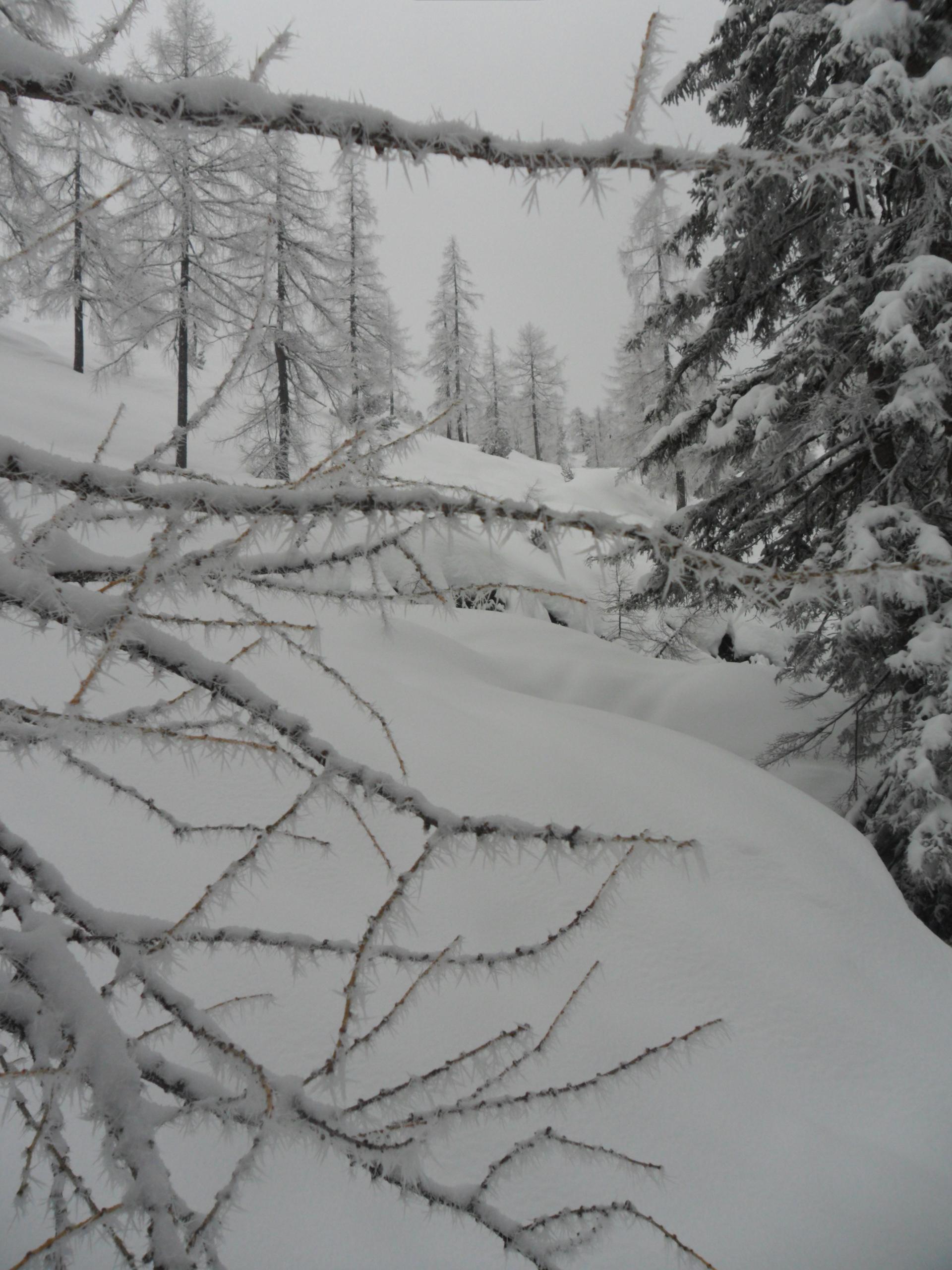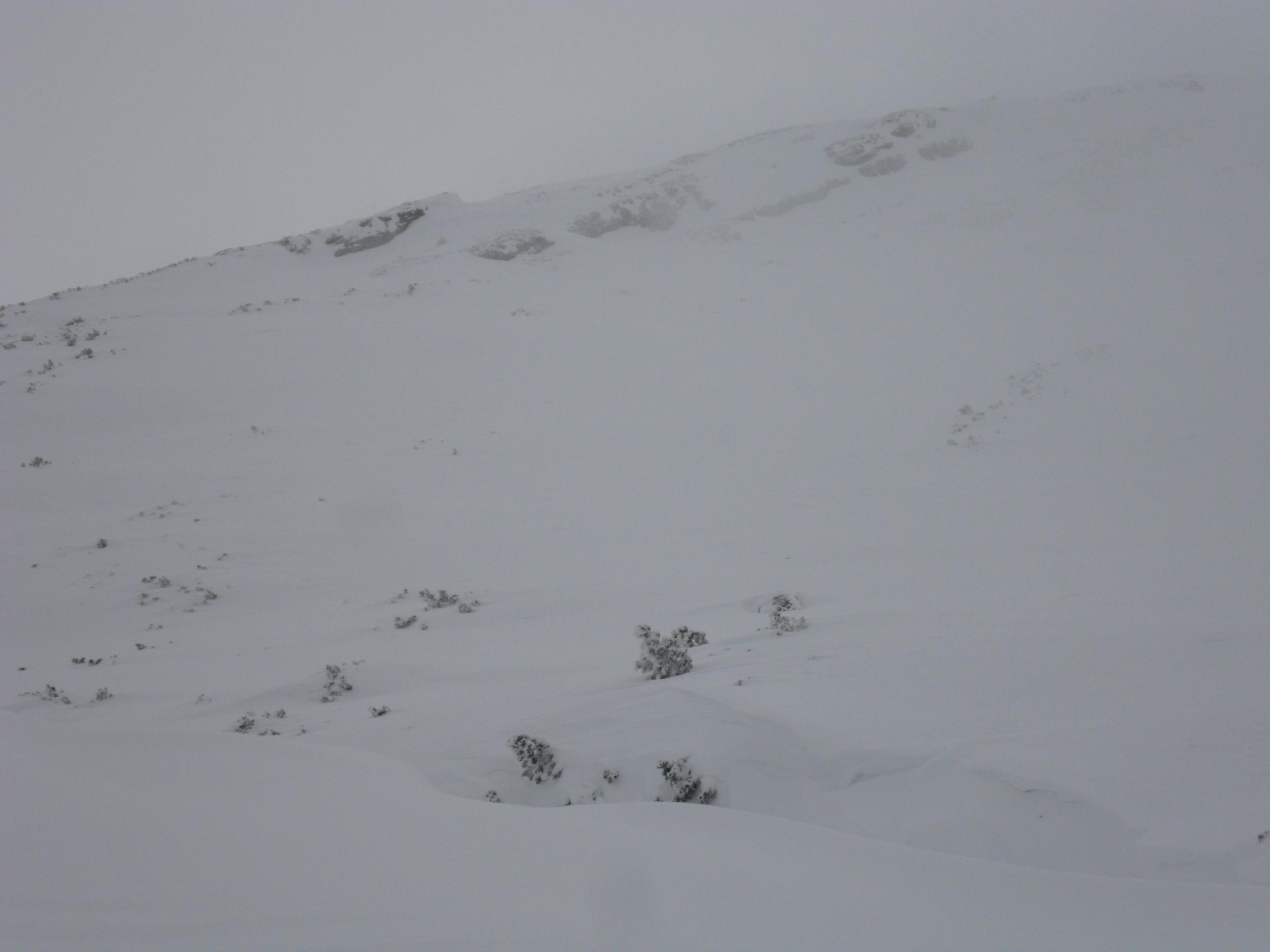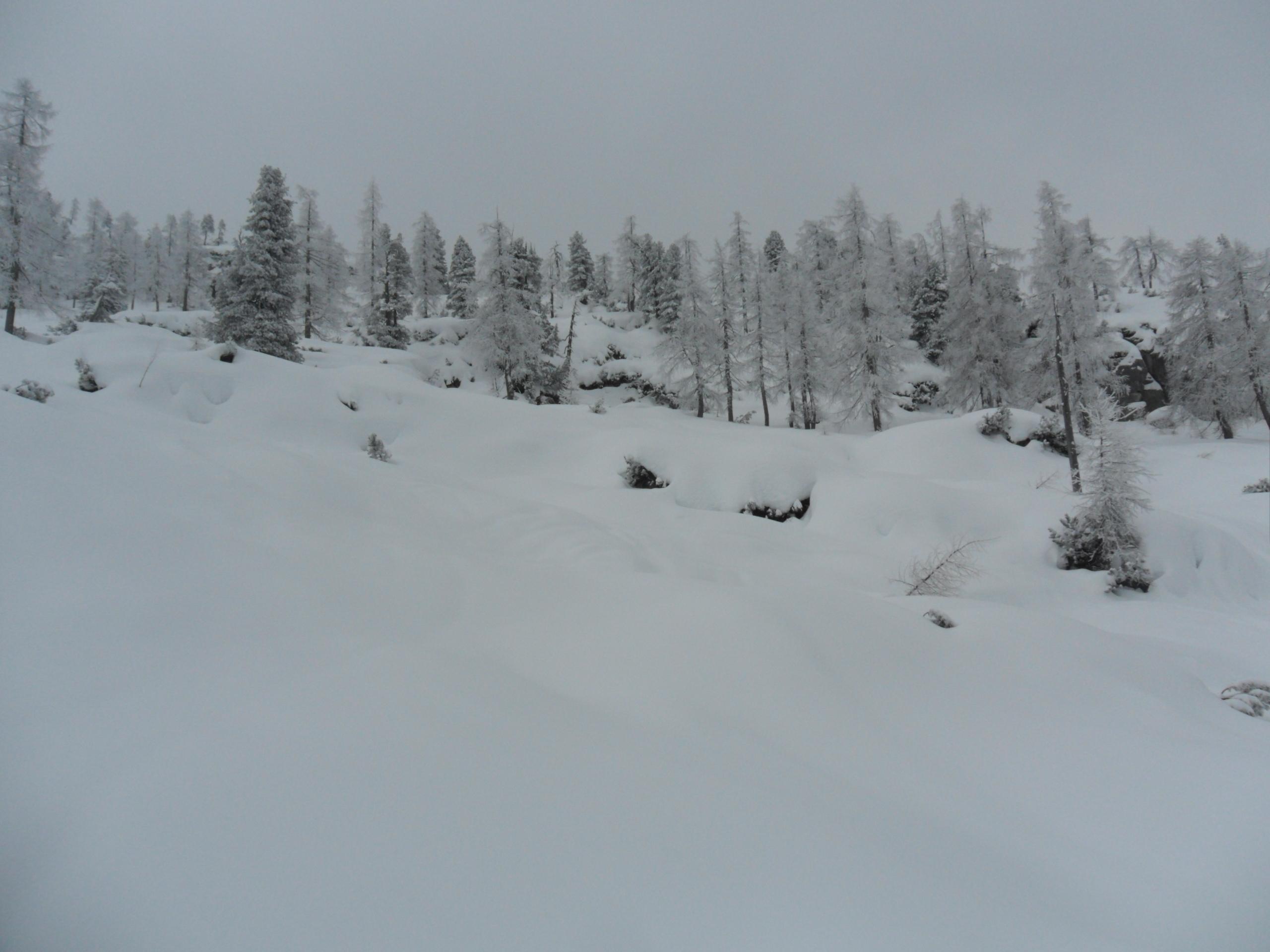 5 cm Pulver vom Parkplatz weg, nach oben hin bis zu 20 cm. Alles schön befahrbar. Am Gipfelhang nimmt die Neuschneemenge wieder etwas ab. Eisige oder verfestigte Stellen gibt es aber keine. Im Latschenfeld gibt es ein paar wenige Stellen auf die man achten sollte ( Siehe Foto ). Oberhalb der Querung vor dem letzten Hang zum Gipfel sind auf einem kurzen Teilstück auch Feindkontakte möglich.