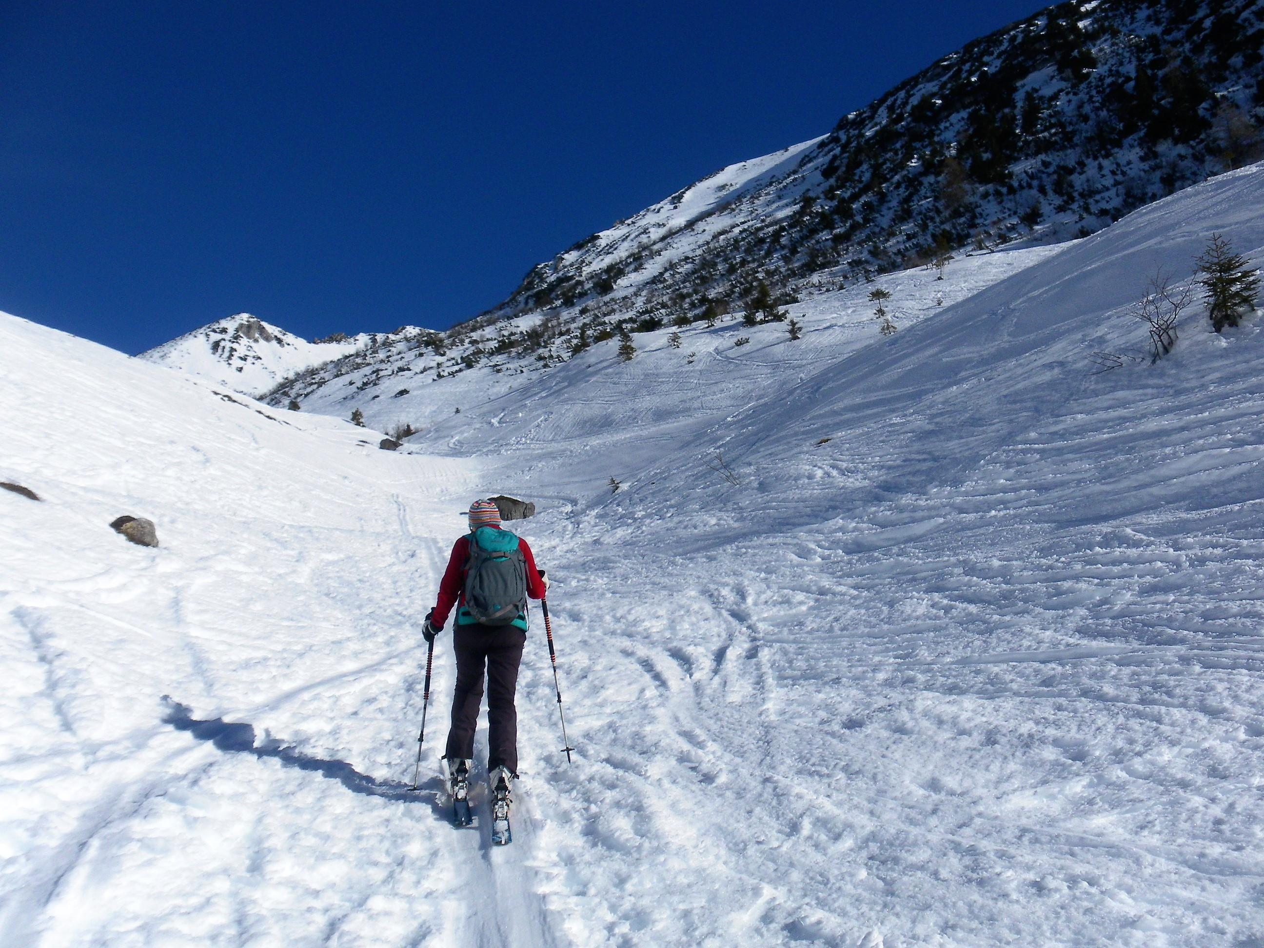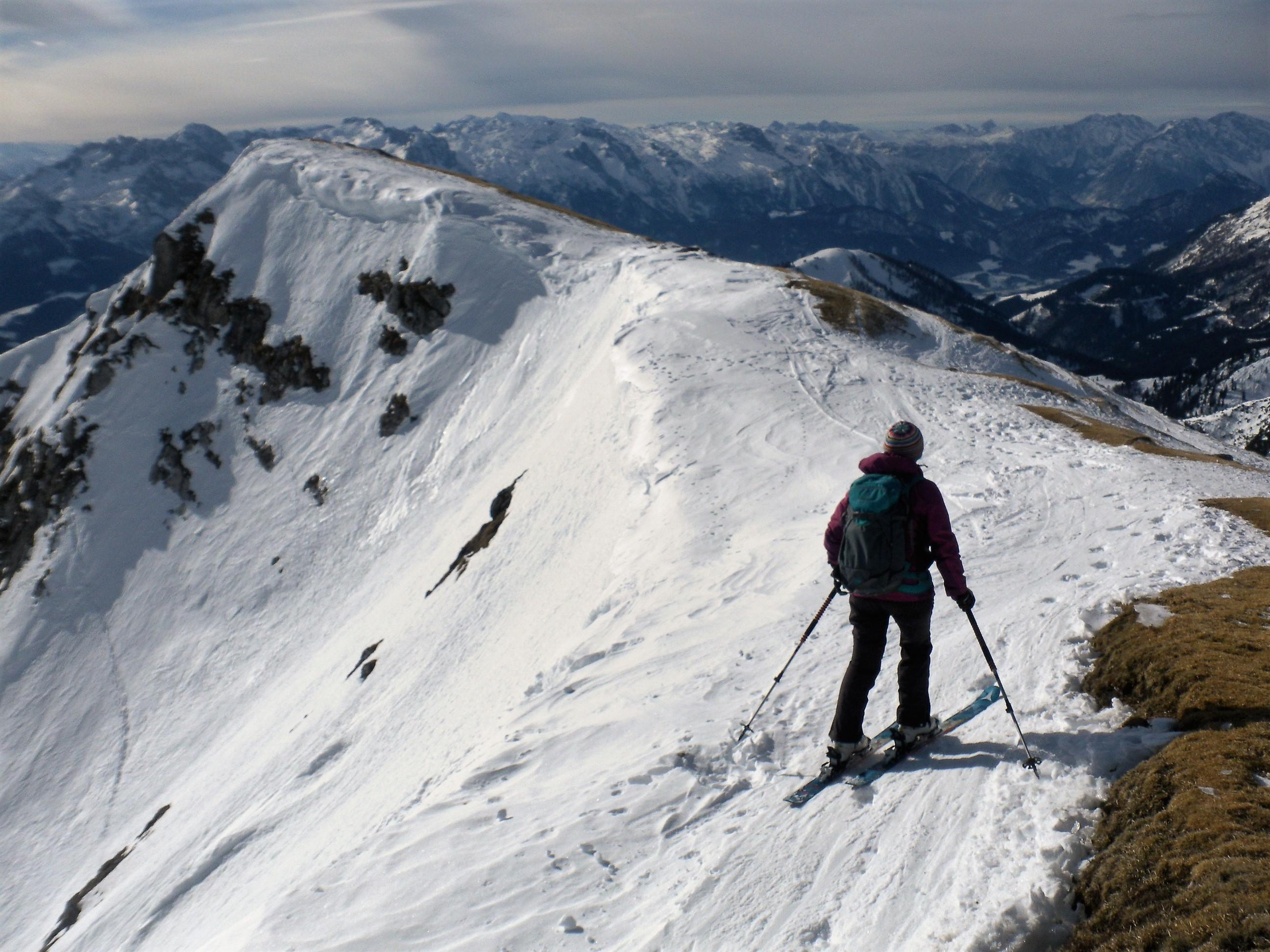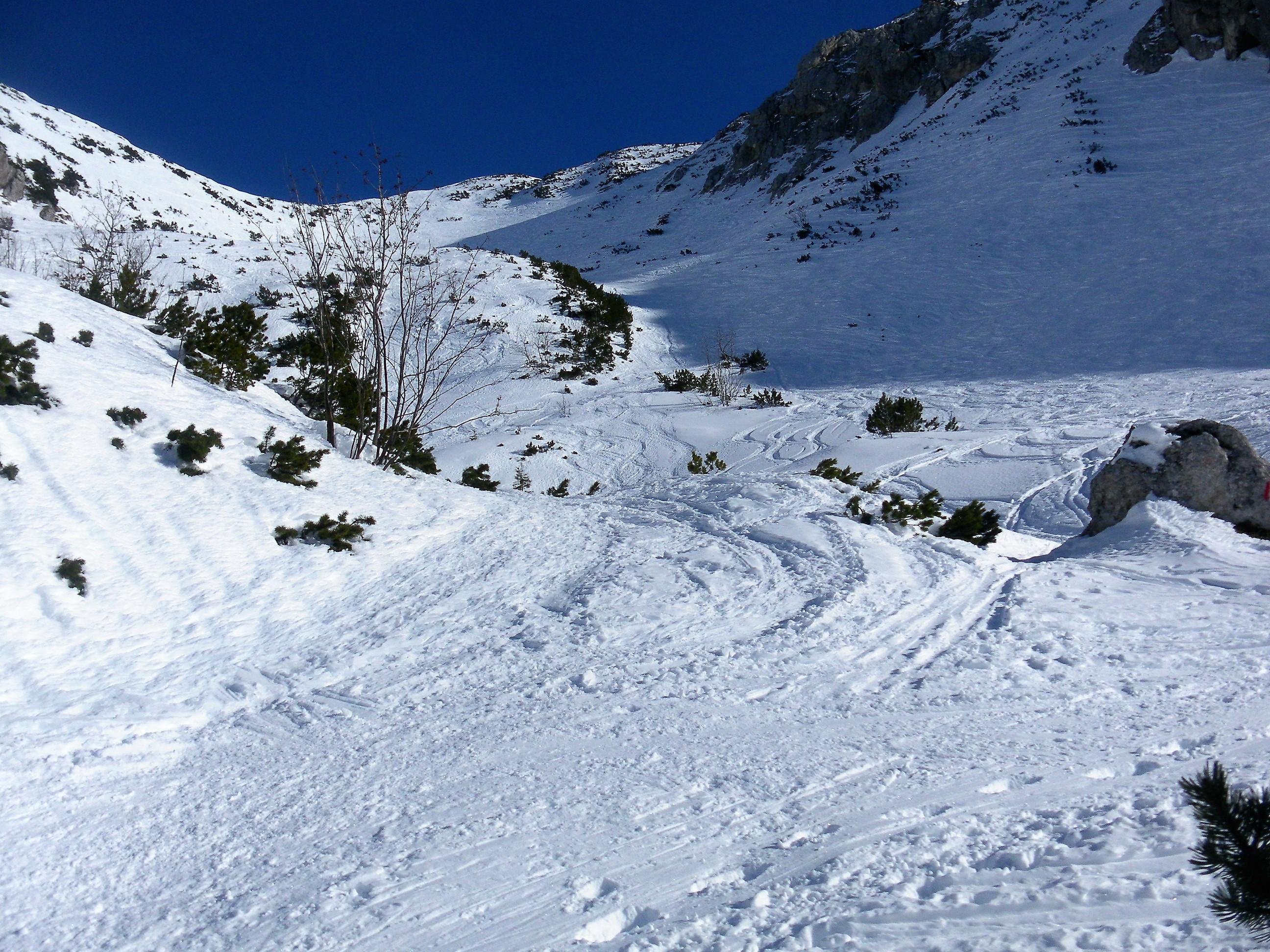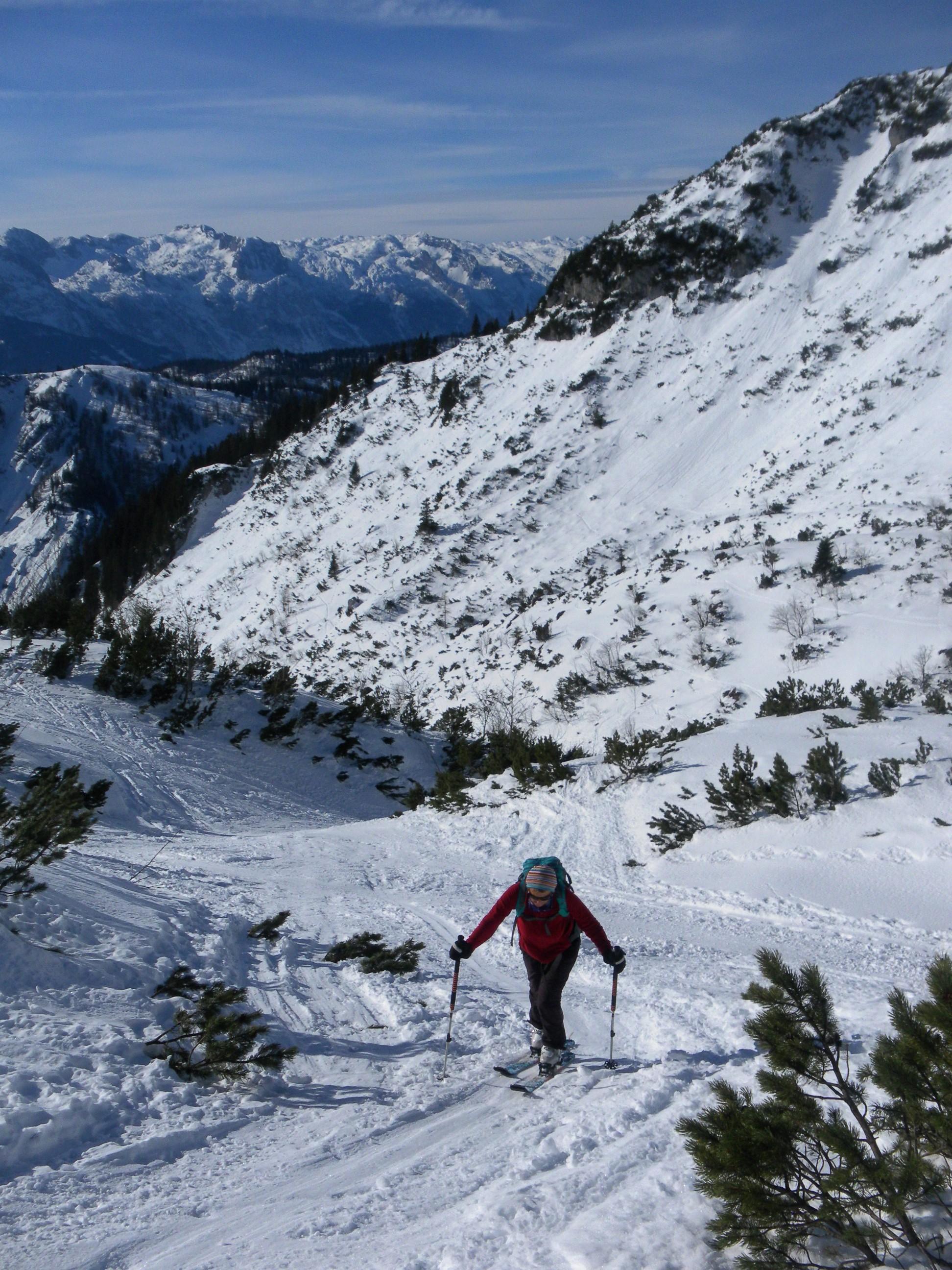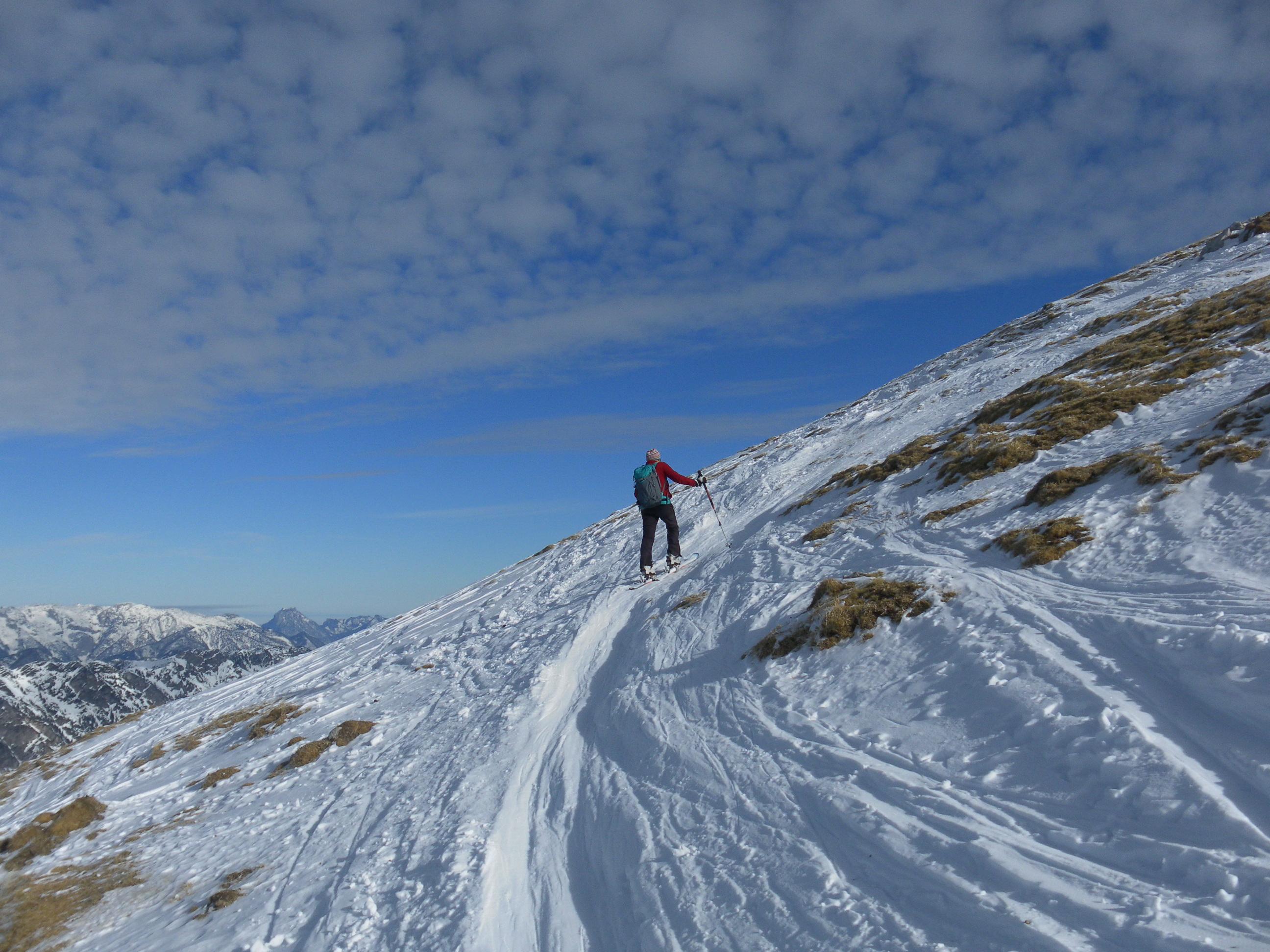 Heute hält sich der Anstiegsgenuss in Grenzen. Im Wald zur Angerkaralm hartgefrorene Altspuren. Die gut angelegte, harte Aufstiegsspur ist bis zum Gipfel durch Fußstapfen "verziert". Eine eigene Linie ist im zerspurten, harten Schnee des oberen Kars recht mühsam. Die Sonne verwandelt bis zum Nachmittag diese Bedingungen zum Besseren: im Gipfelhang bleibt ein griffiger Harsch, im Kar gibts kurze Firnflecken, auch ein wenig Sulz, im Schatten gepressten Pulver. Überraschend gut.