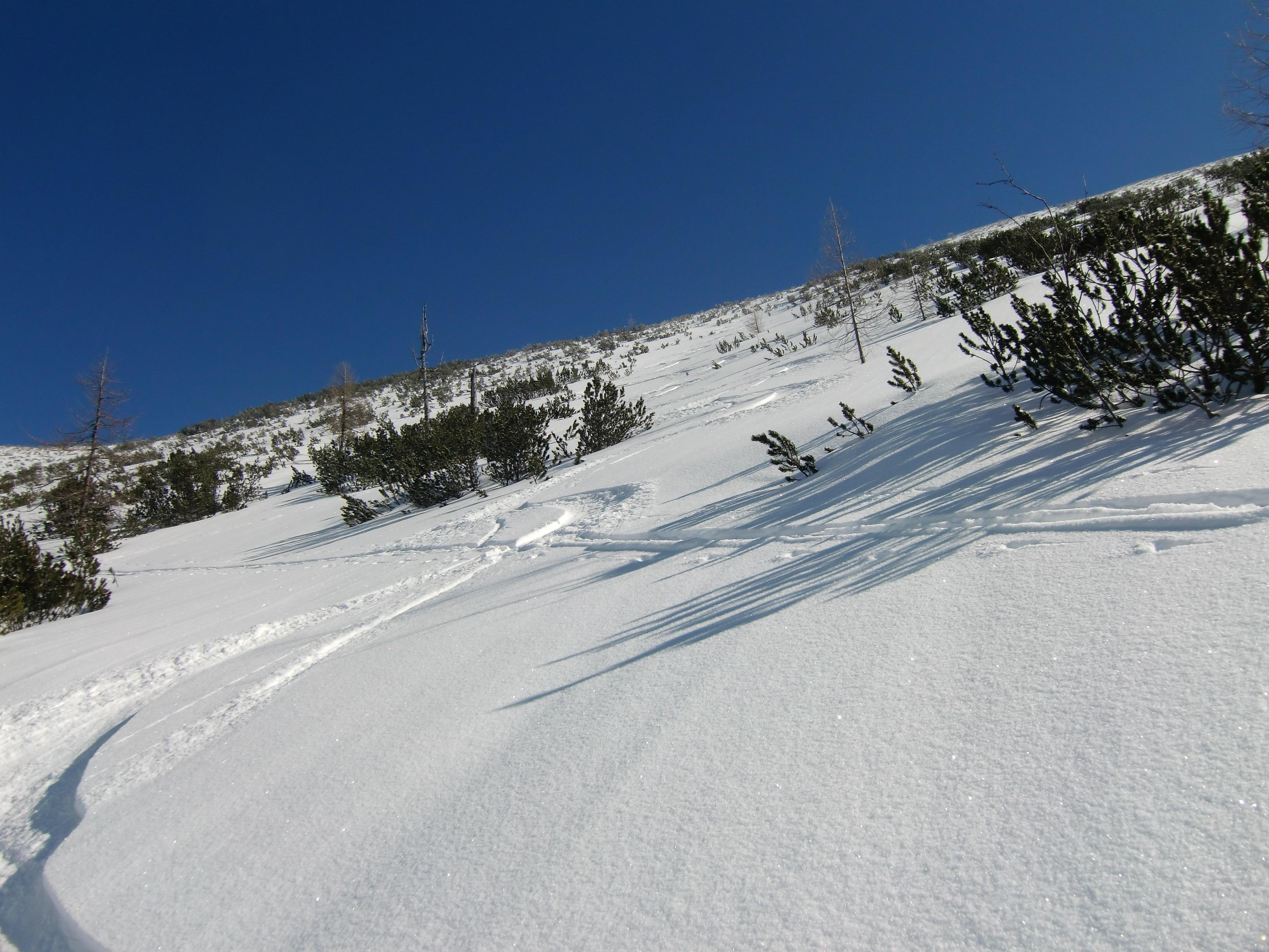 Schnee/Lawinen: Unten mehr Rauhreif als Neuschnee, nach oben hin dann max. 15cm bester, trockener neu auf tragfähiger Harschkruste. Optimal!! Durch die Tropenhitze Anfang der Woche ist ein ziemlich glatter Gleithorizont drunter entstanden und der Neuschnee ist gleich von Anfang an kalt gefallen, d.h. er ist nicht angefroren, aber kein Grund zum Dramatisieren: Er ist geringmächtig und sehr windarm gefallen, also Ampel eher grün!!