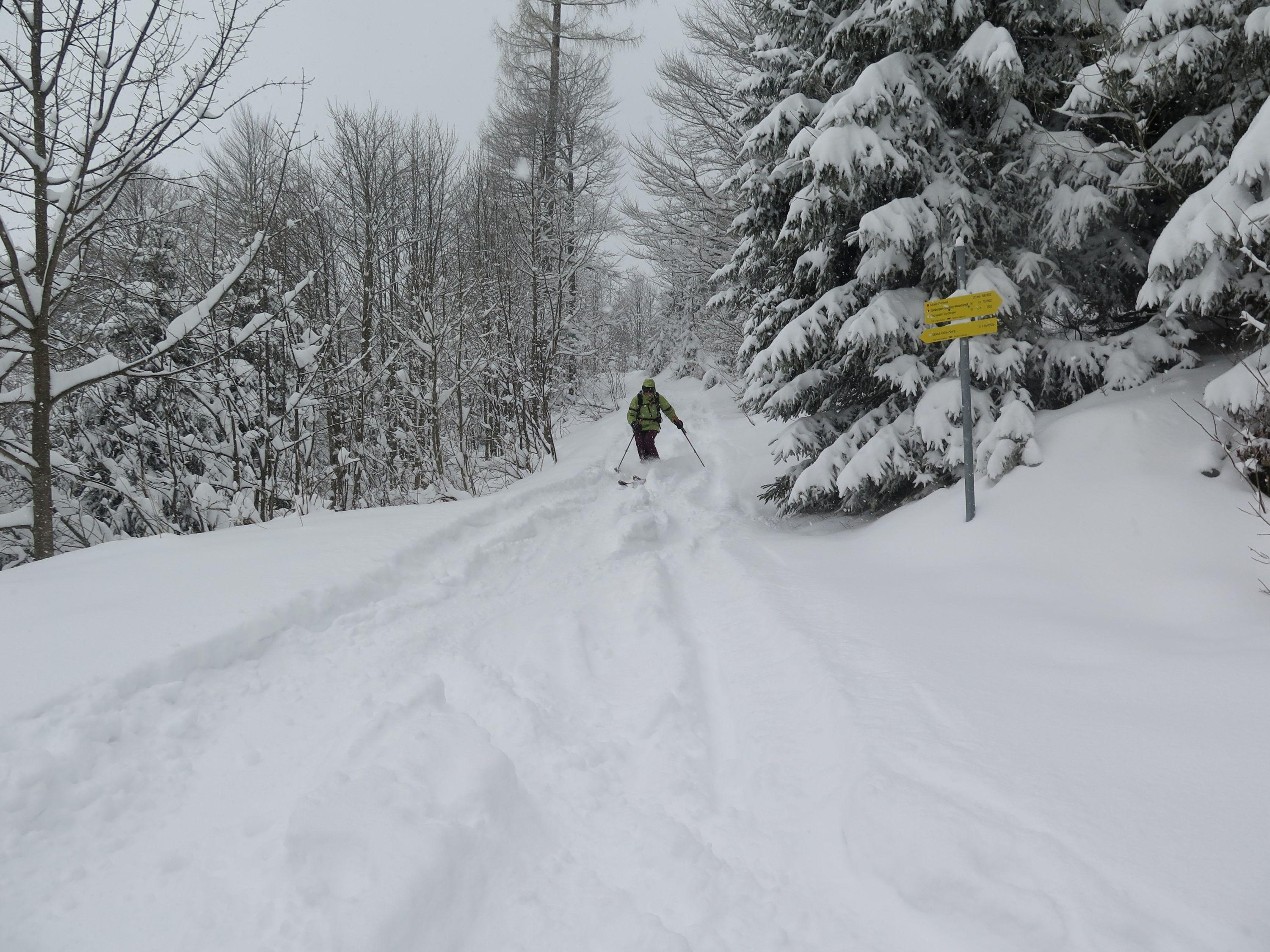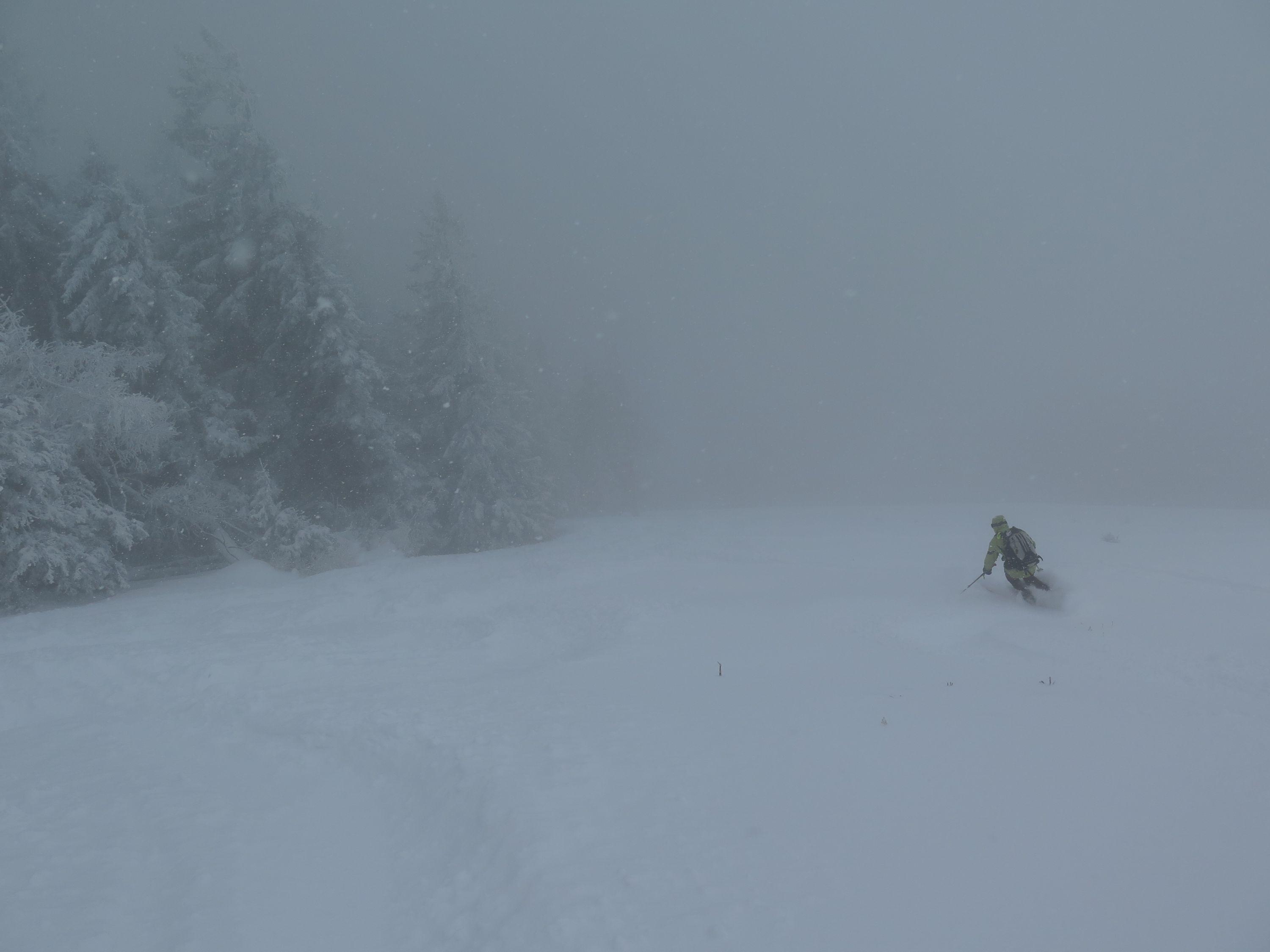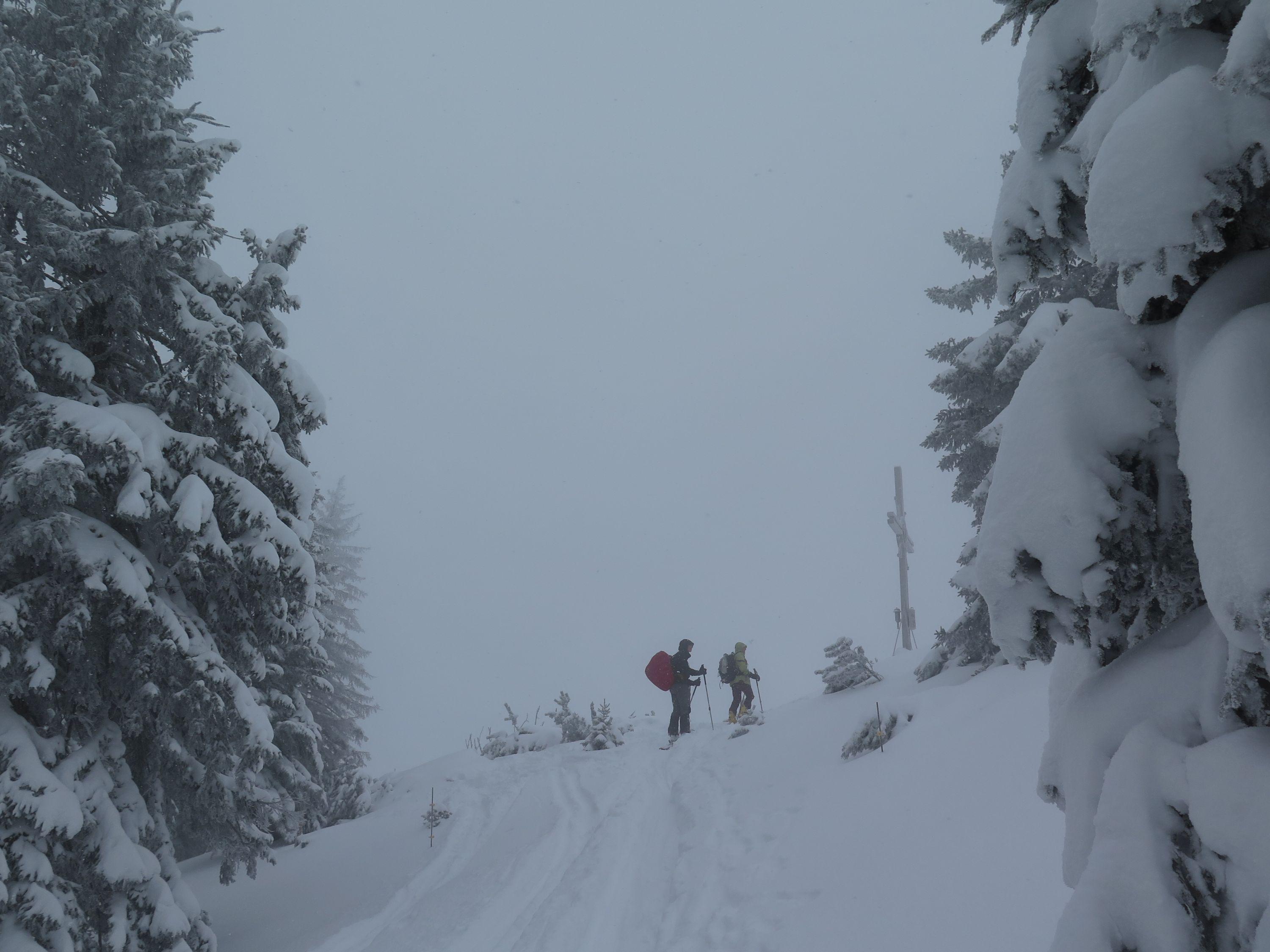 Frau Holle hat mit dem Schnee ordentlich zugeschlagen :vom Tal ca 2ocm bis zum Gipfel teilweise auf 40-50cm ansteigend.Wetter :zeitweise leichter Schneefall,im Gipfelbereich Nebel und mäßiger Wind.Die lange Waldquerung zur Eibleckalm ist gut ohne Feindkontakt zu befahren.