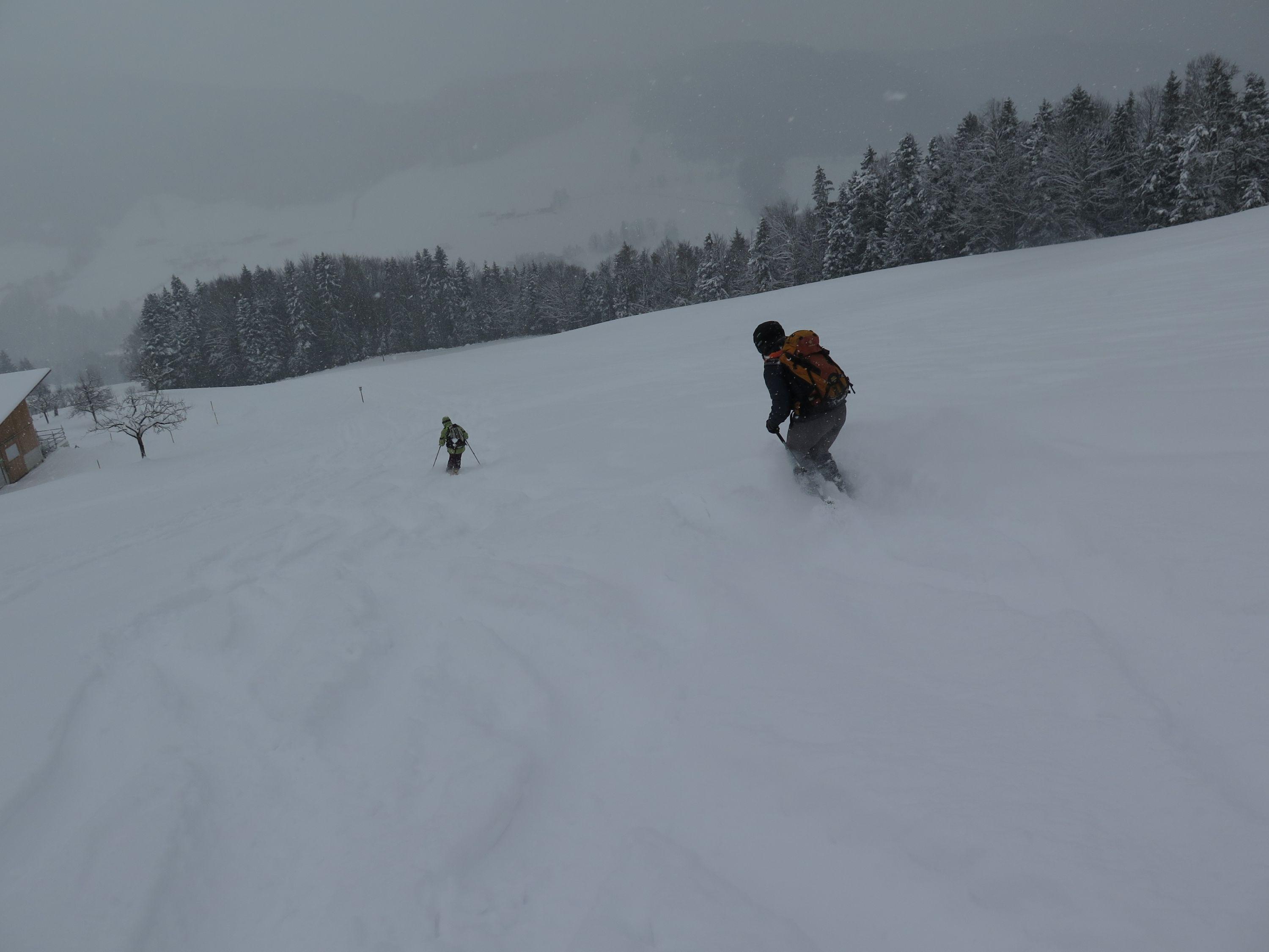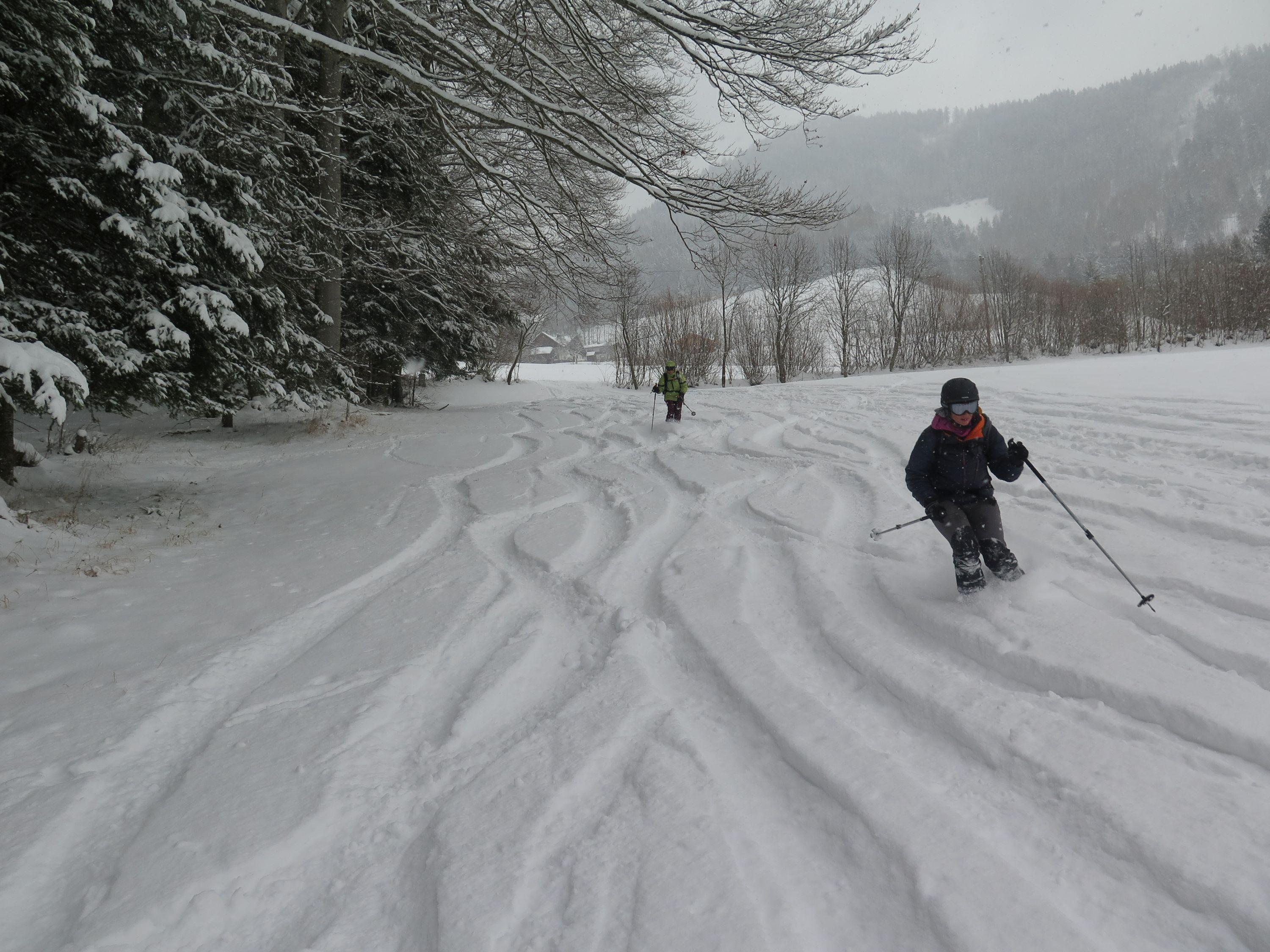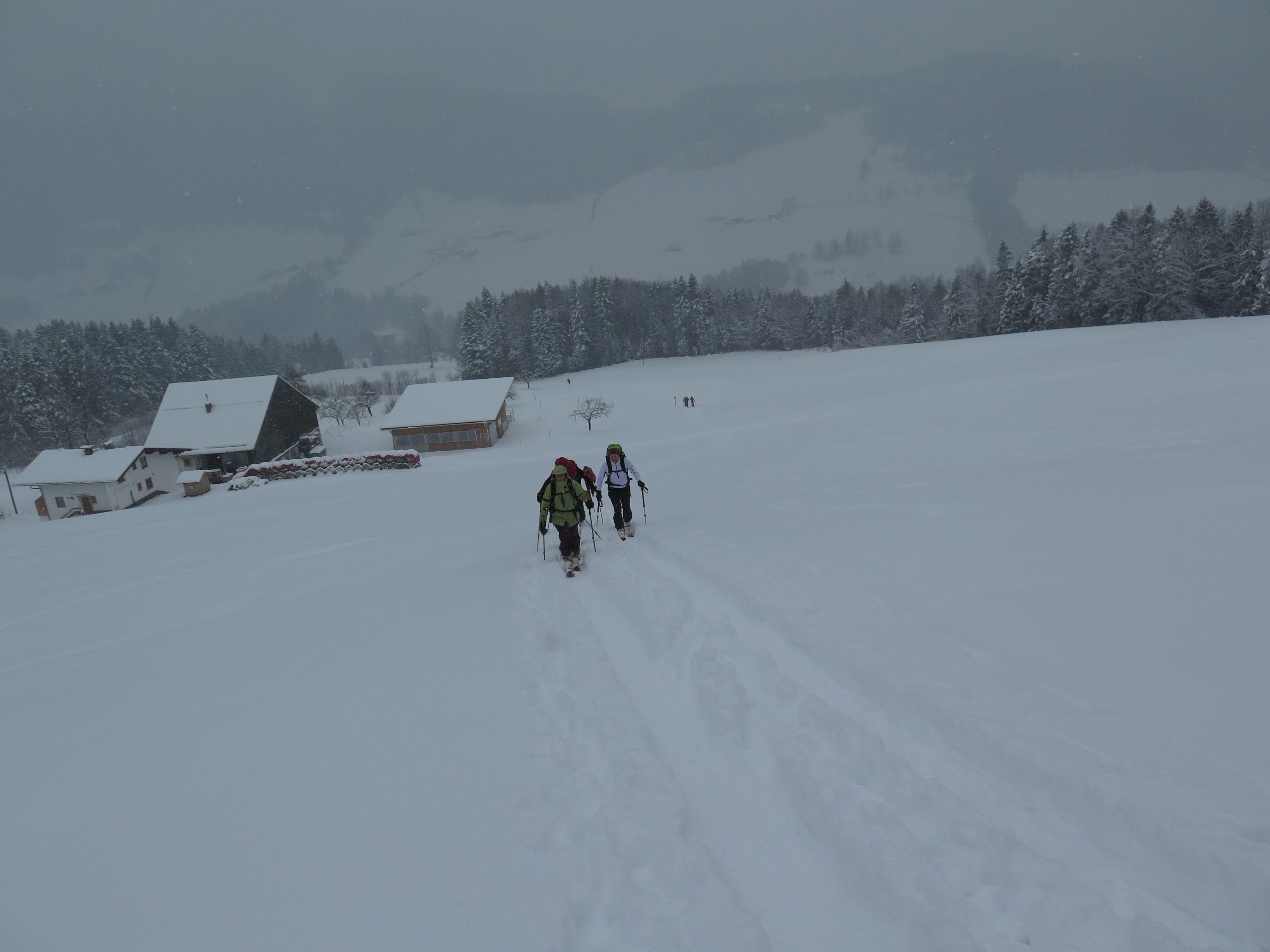 Frau Holle hat mit dem Schnee ordentlich zugeschlagen :vom Tal ca 2ocm bis zum Gipfel teilweise auf 40-50cm ansteigend.Wetter :zeitweise leichter Schneefall,im Gipfelbereich Nebel und mäßiger Wind.Die lange Waldquerung zur Eibleckalm ist gut ohne Feindkontakt zu befahren.