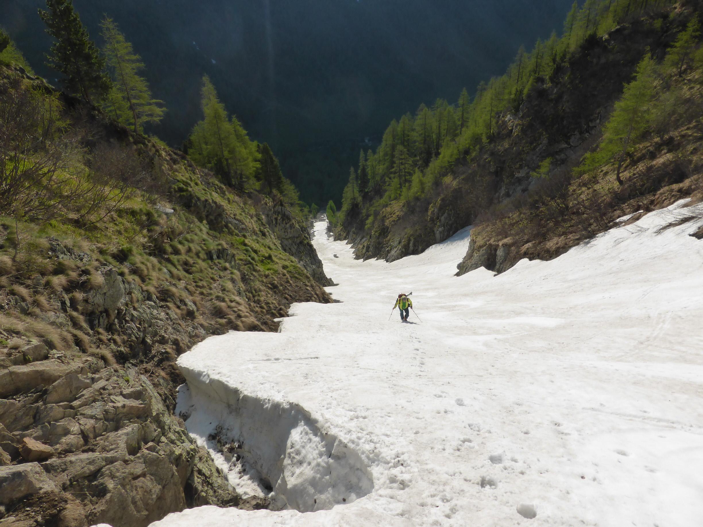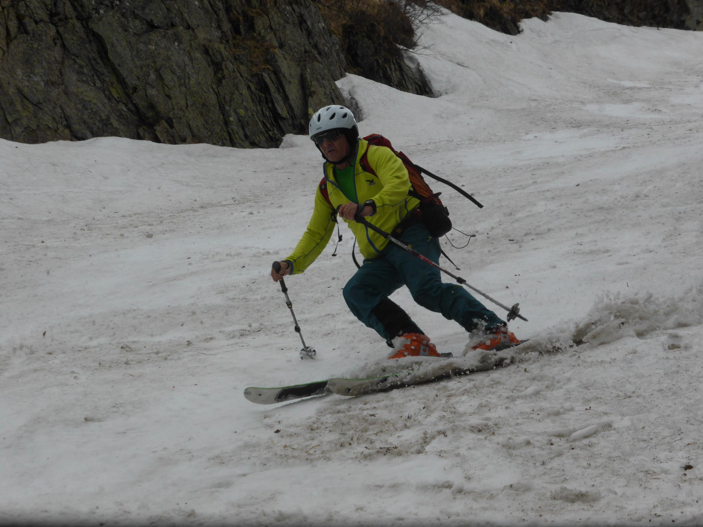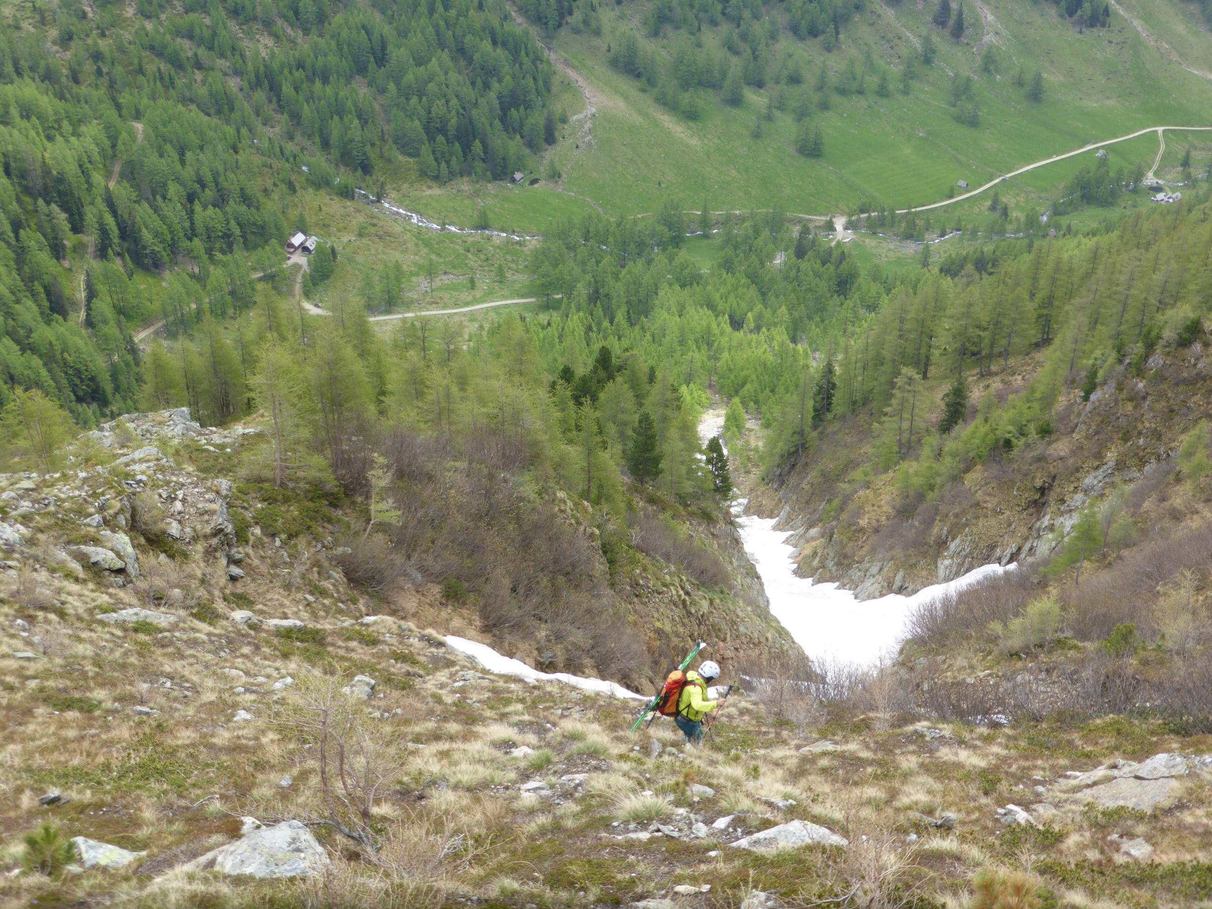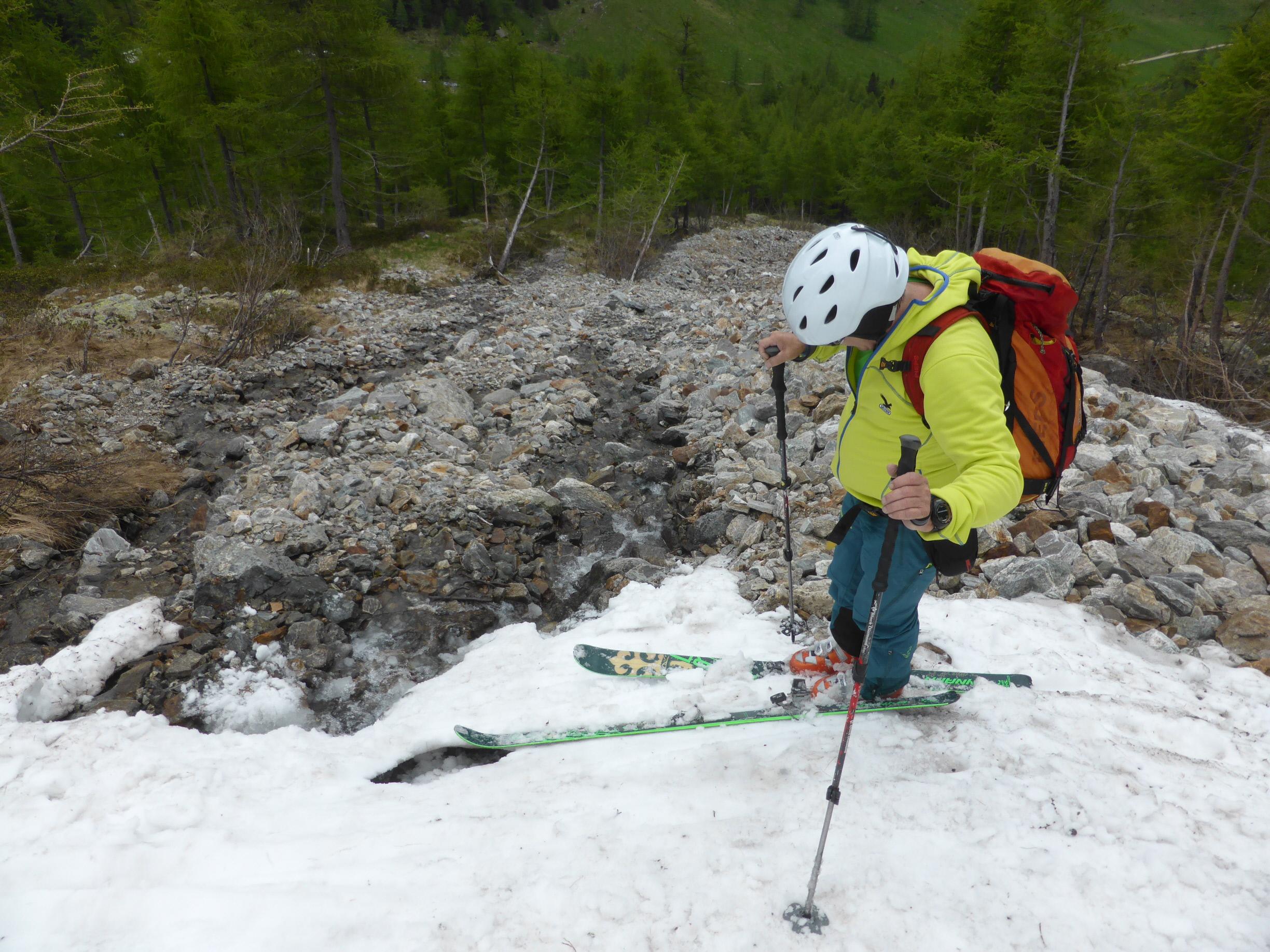 Vom Ausgangspunkt bis zum Schnee trägt man dzt. ca. 100 Hm; der ausgeaperte Übergangsbereich oberhalb des Ölaschngrabens bedingt ca. 50 Hm Tragestrecke