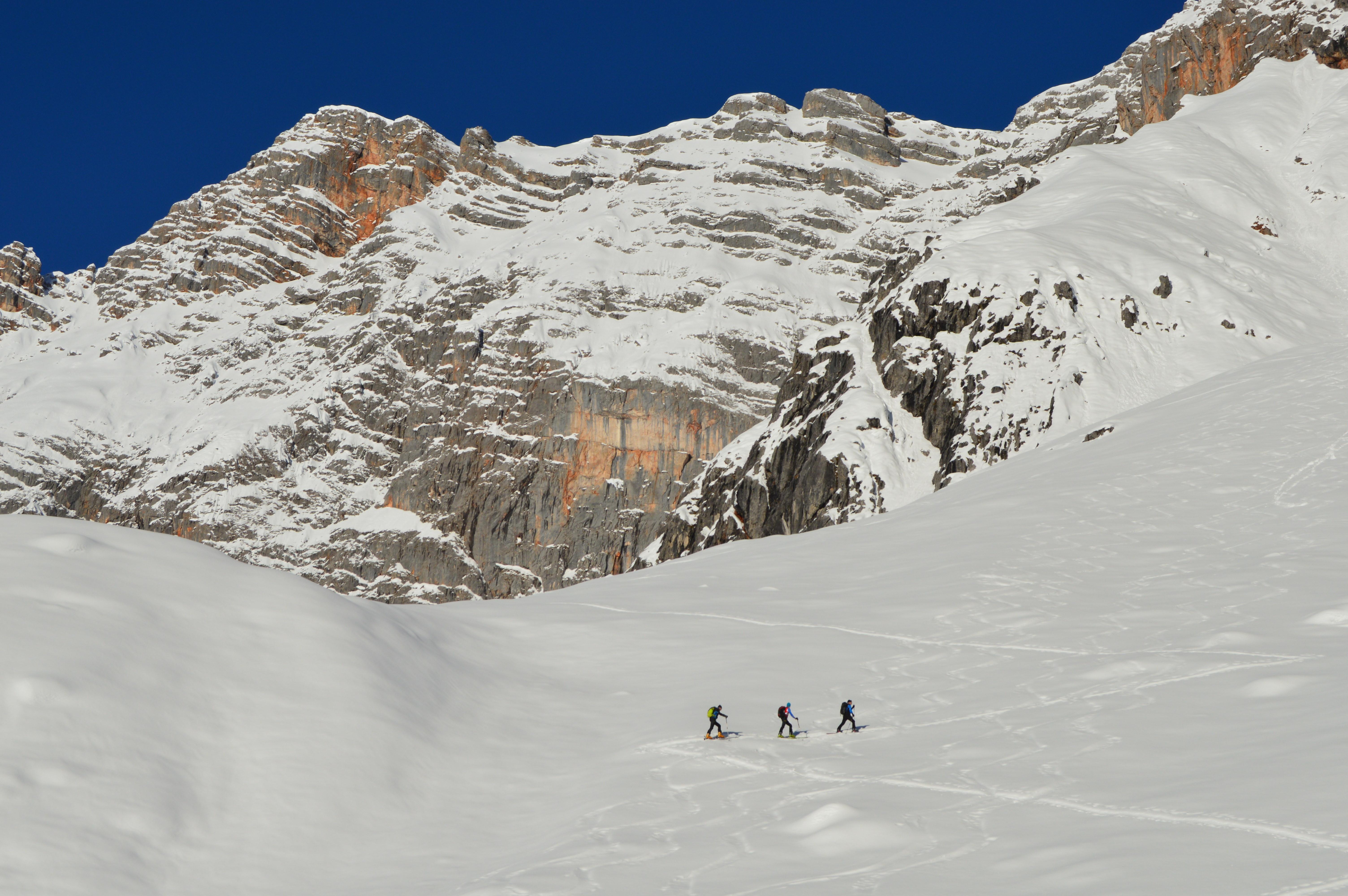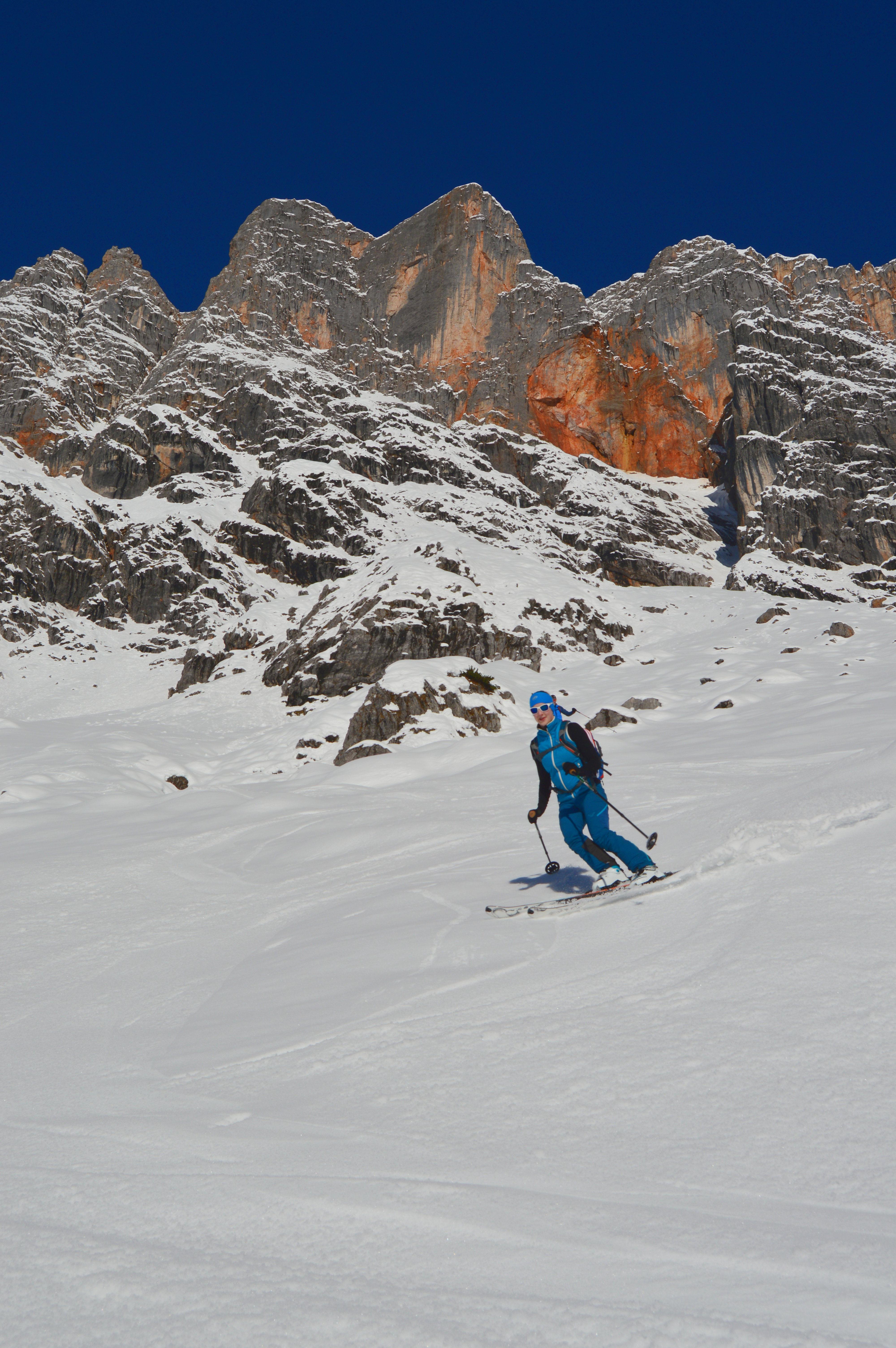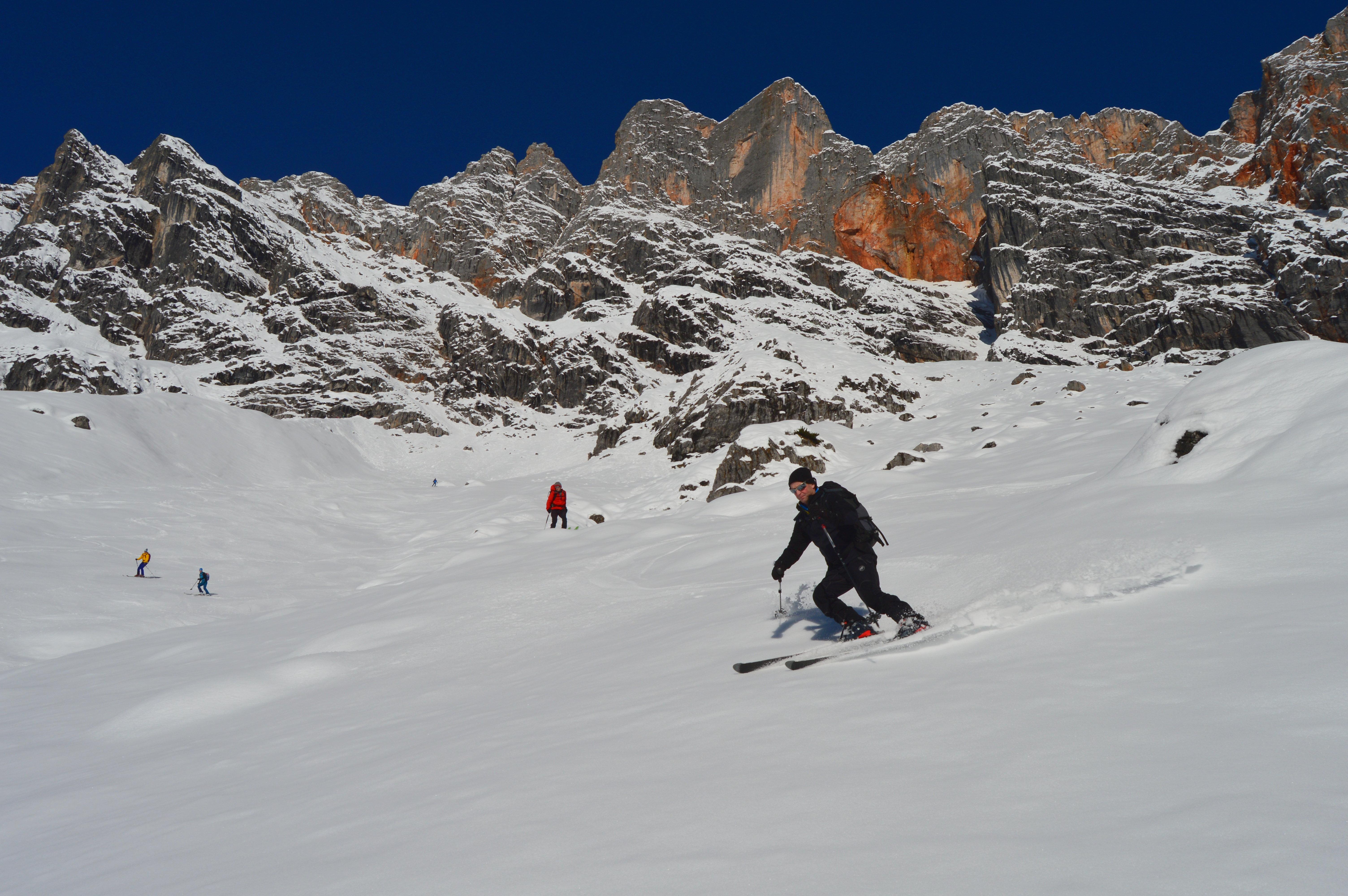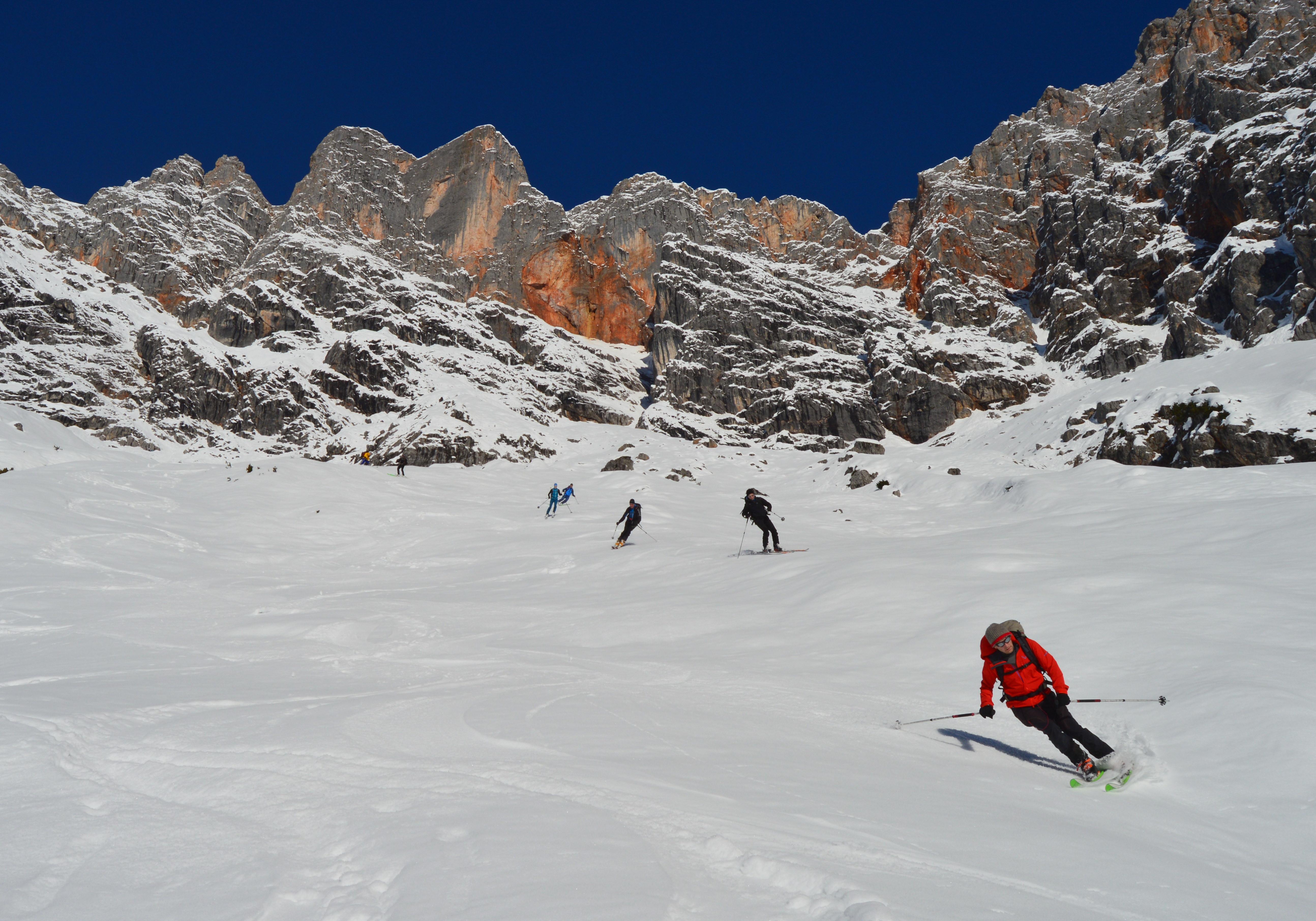 Nach unserer ersten Abfahrt packten wir die Felle nochmals aus und stiegen weiter östlich nochmals bis zu den Wänden auf und fuhren direkt in Fallinie in den Talgrund. Um 12 Uhr saßen wir wieder bei der Kaspressknödelsuppe und beim Weißbier auf der Sonnenterrasse in Hinterthal.