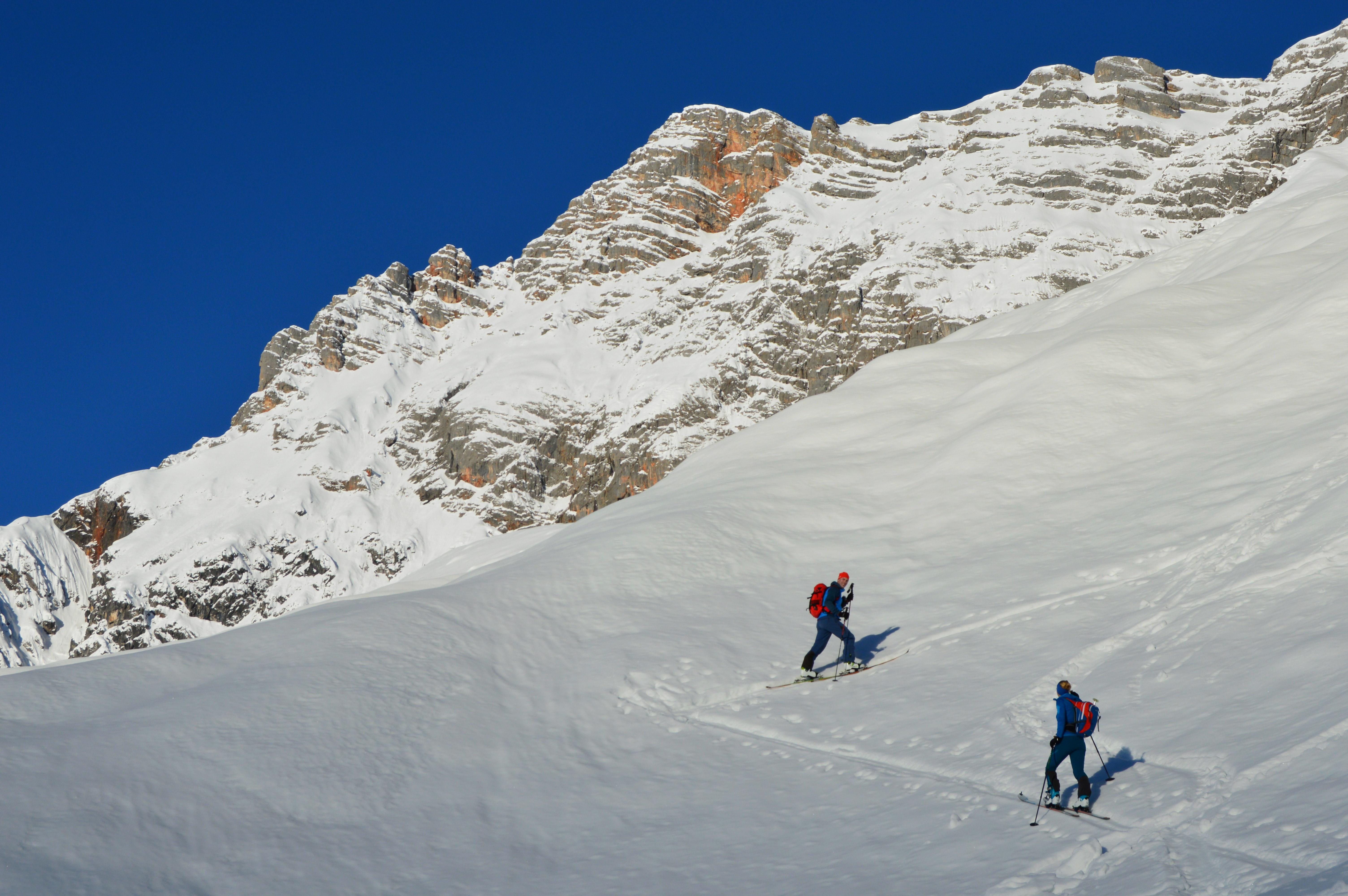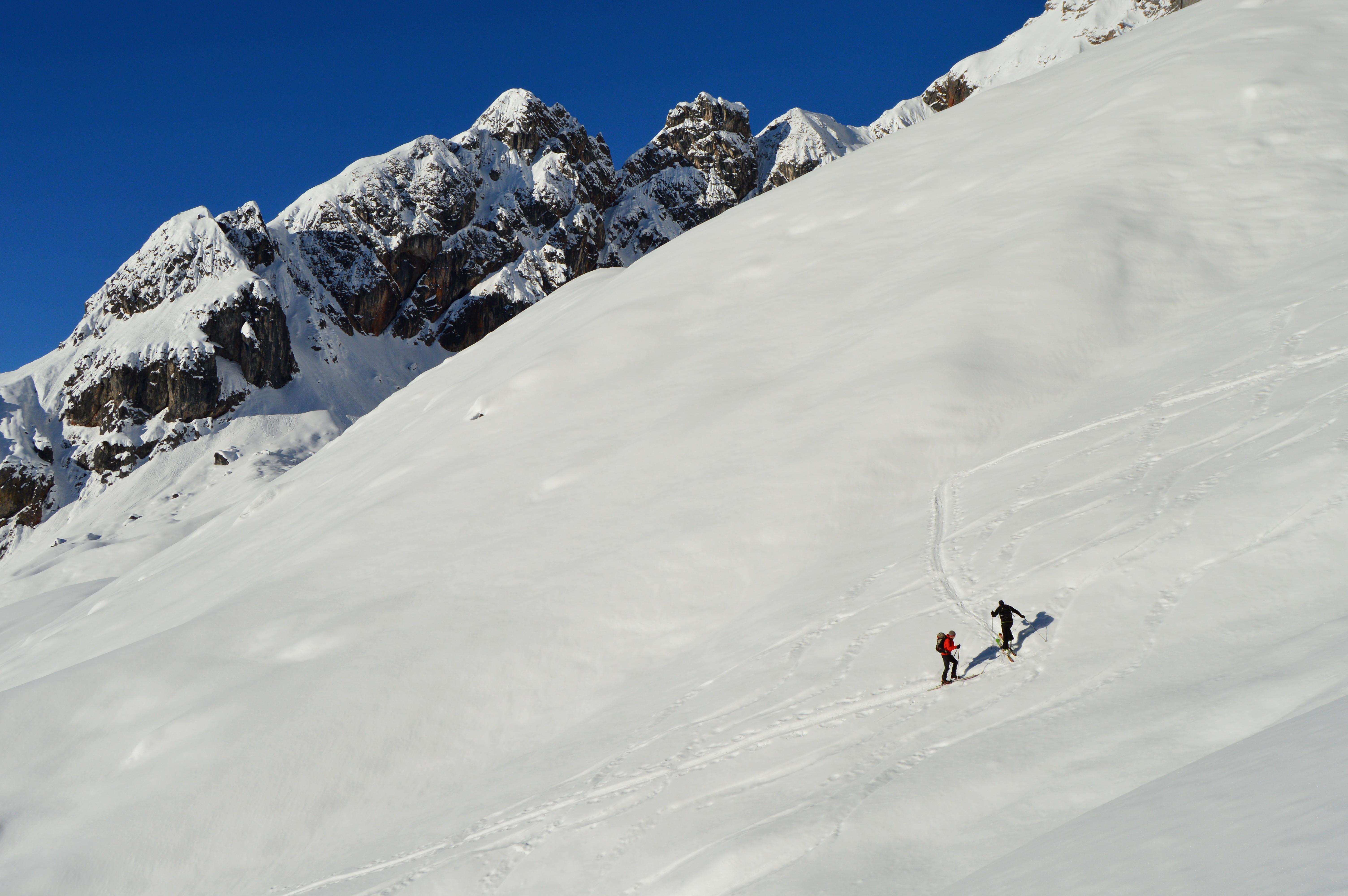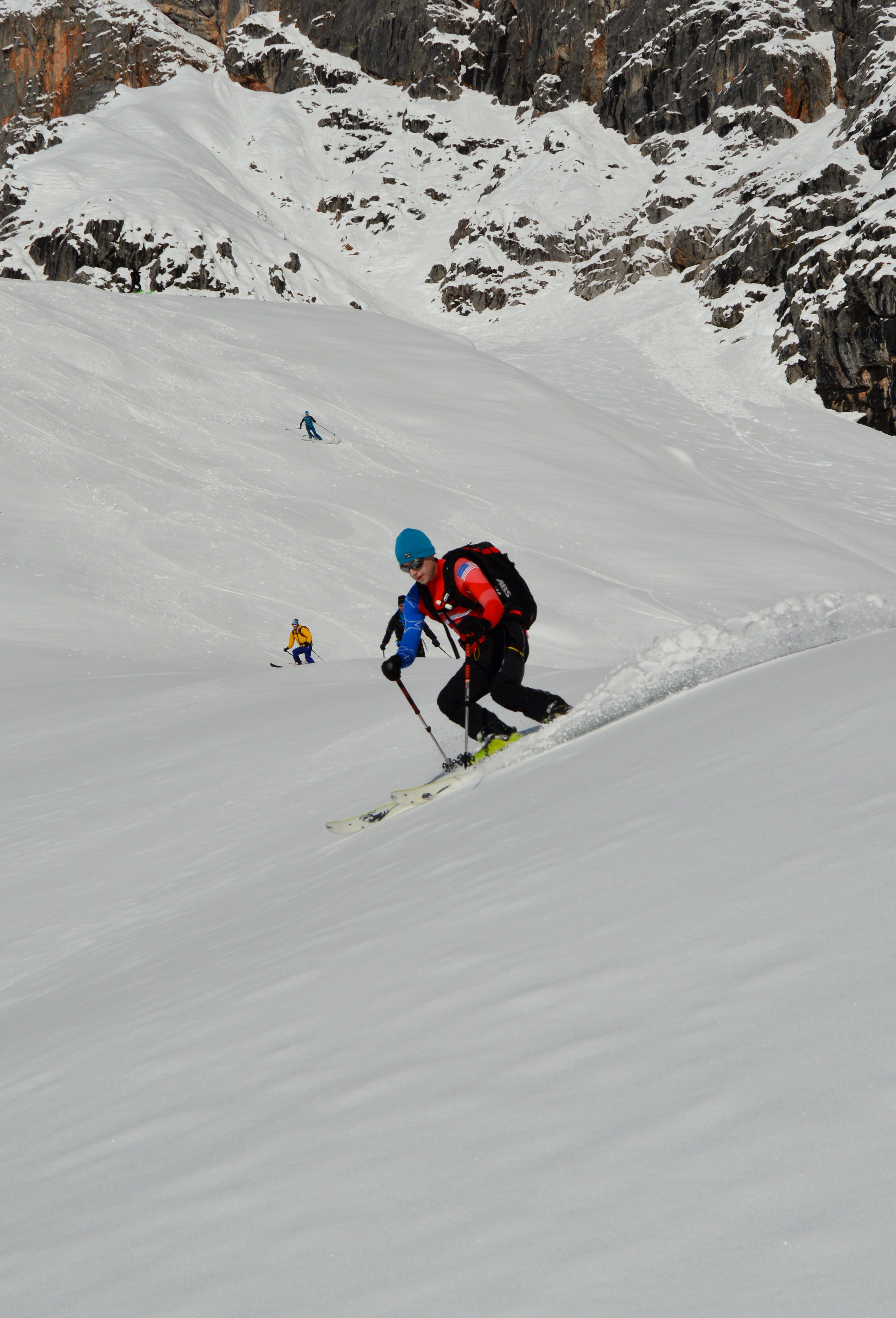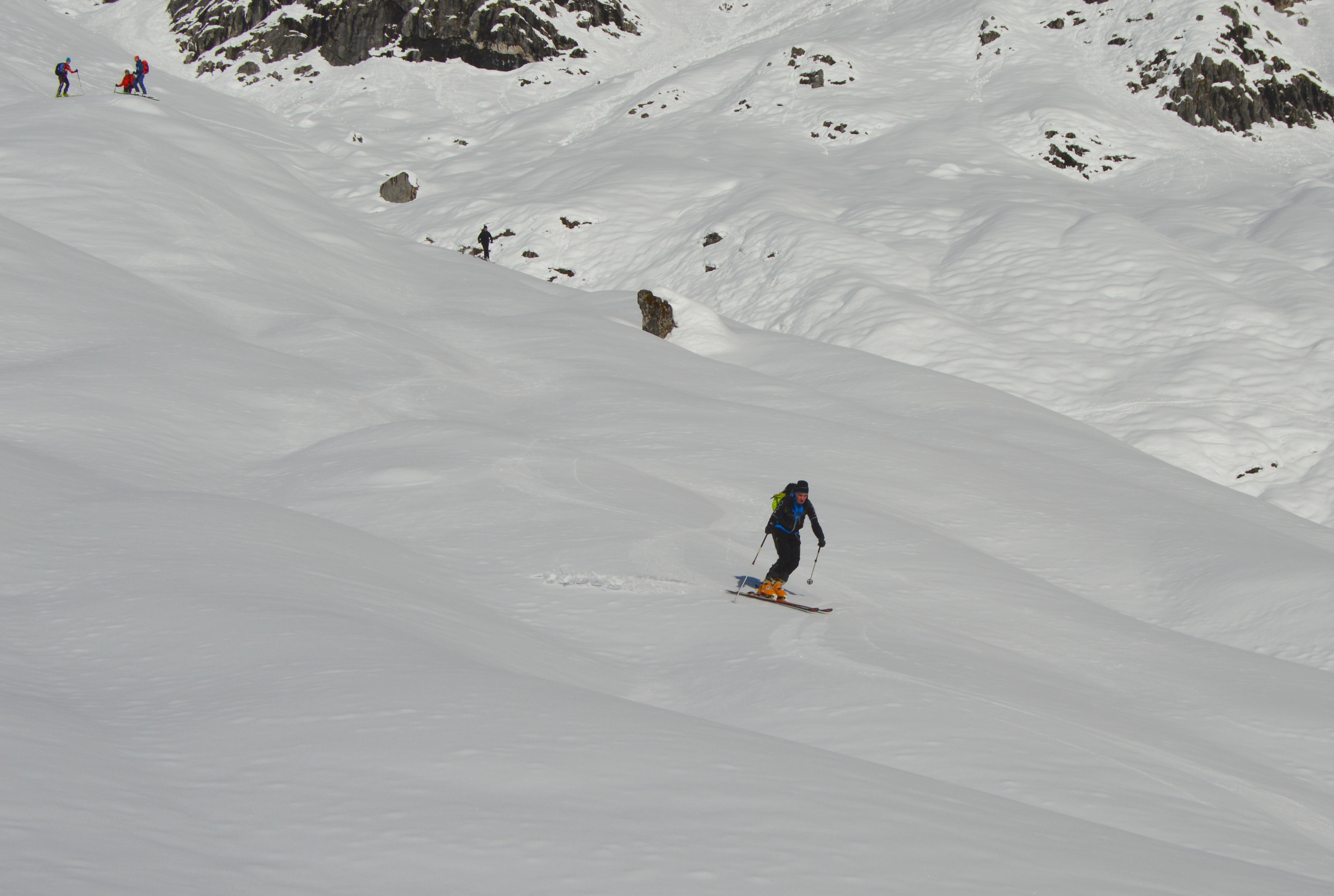 Nach unserer ersten Abfahrt packten wir die Felle nochmals aus und stiegen weiter östlich nochmals bis zu den Wänden auf und fuhren direkt in Fallinie in den Talgrund. Um 12 Uhr saßen wir wieder bei der Kaspressknödelsuppe und beim Weißbier auf der Sonnenterrasse in Hinterthal.