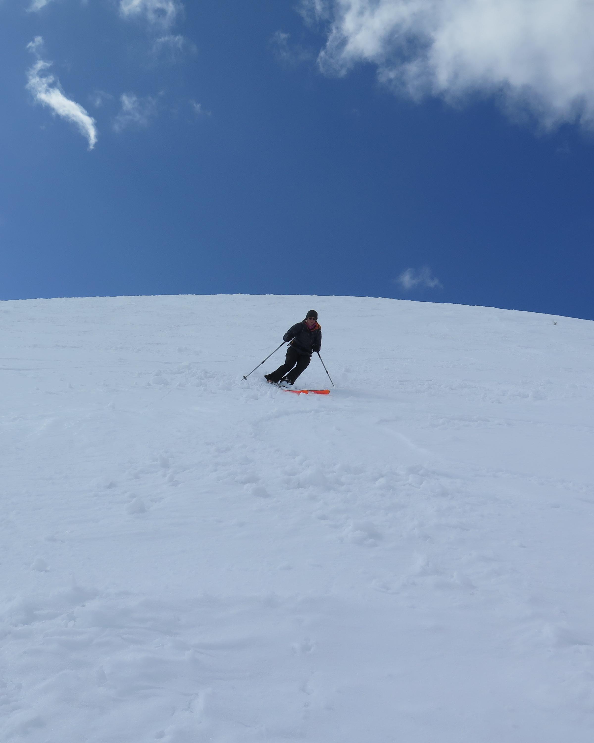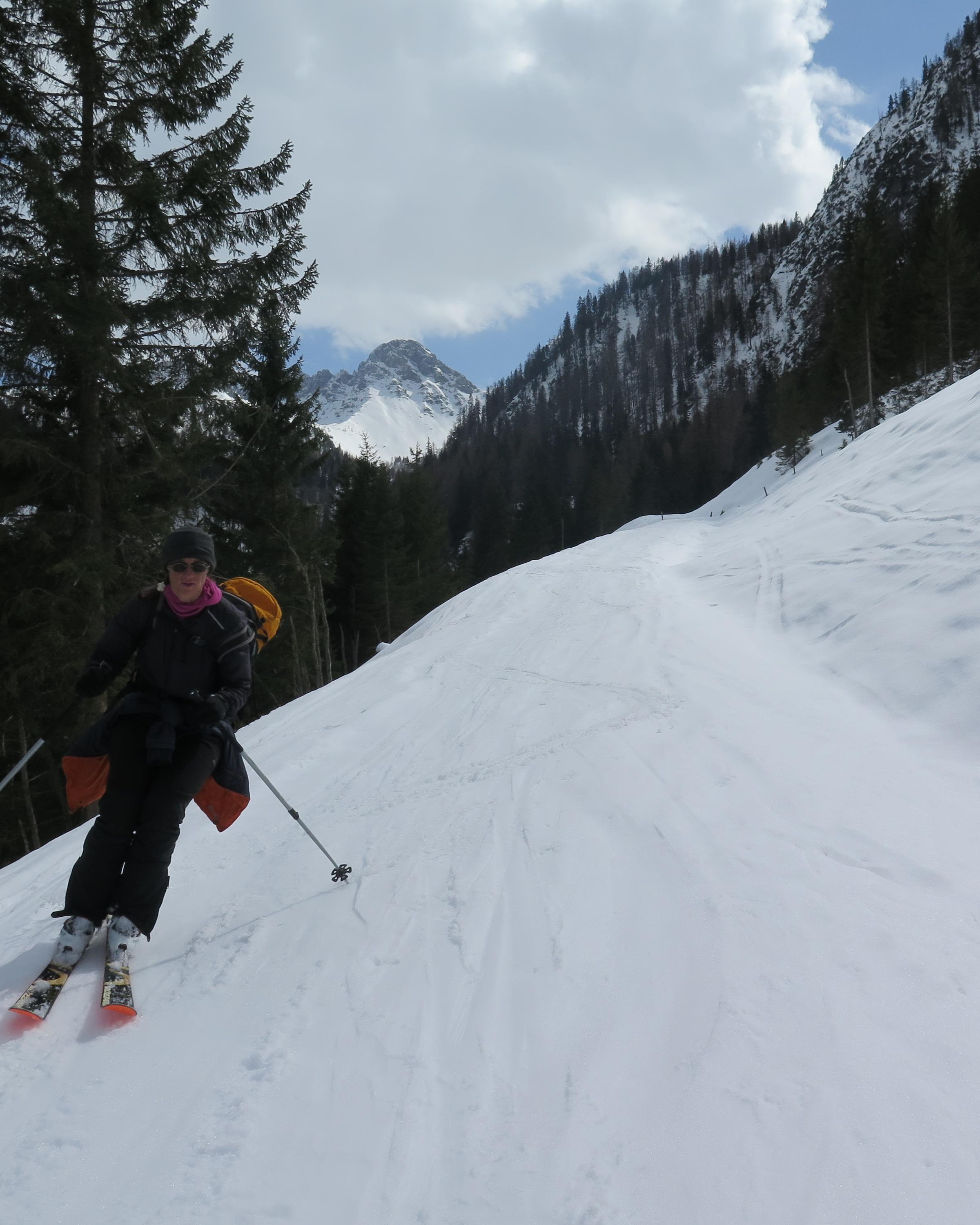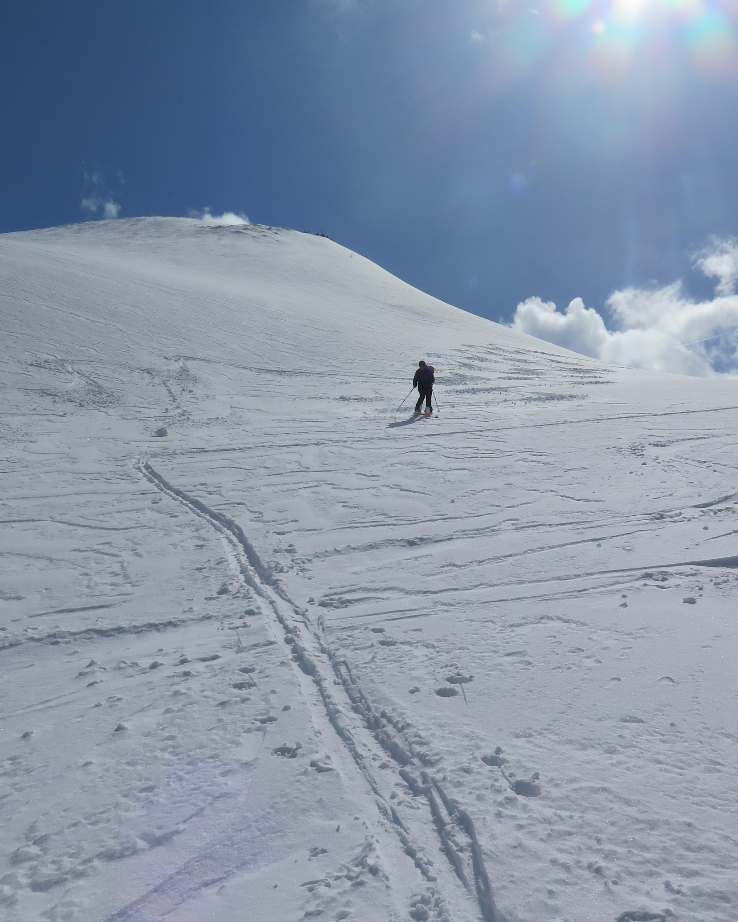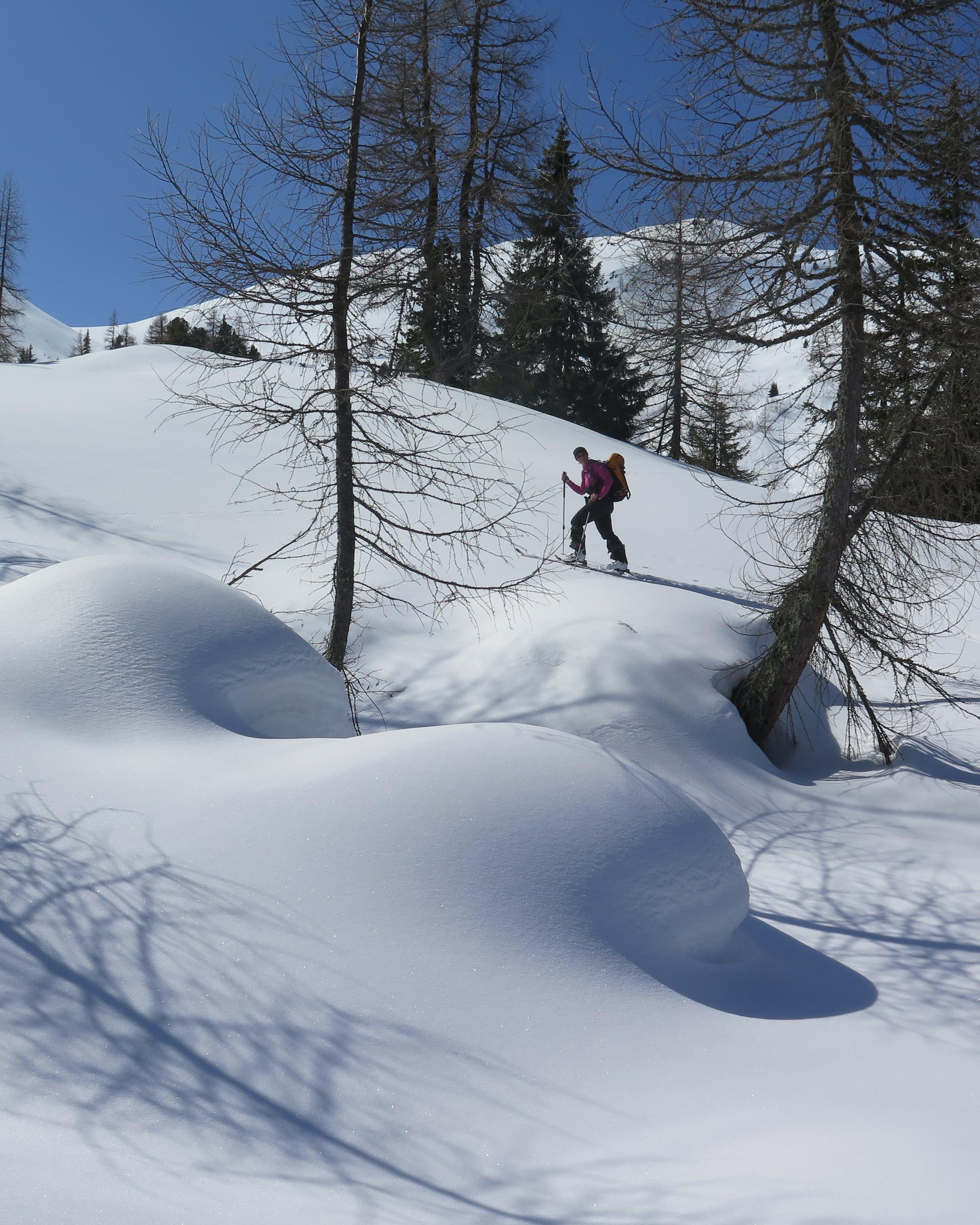 Noch gute Schneelage im Ellmautal,für den Start am Vormittag gut gefrorene Schneedecke und leichtes Winderl.Von der Filzmoosalm stiegen wir im Abfahrtskar durch Pulverhänge auf.Gipfelhang war firnig,die weitere Abfahrt bot ca 10cm Pulver auf fester Unterlage