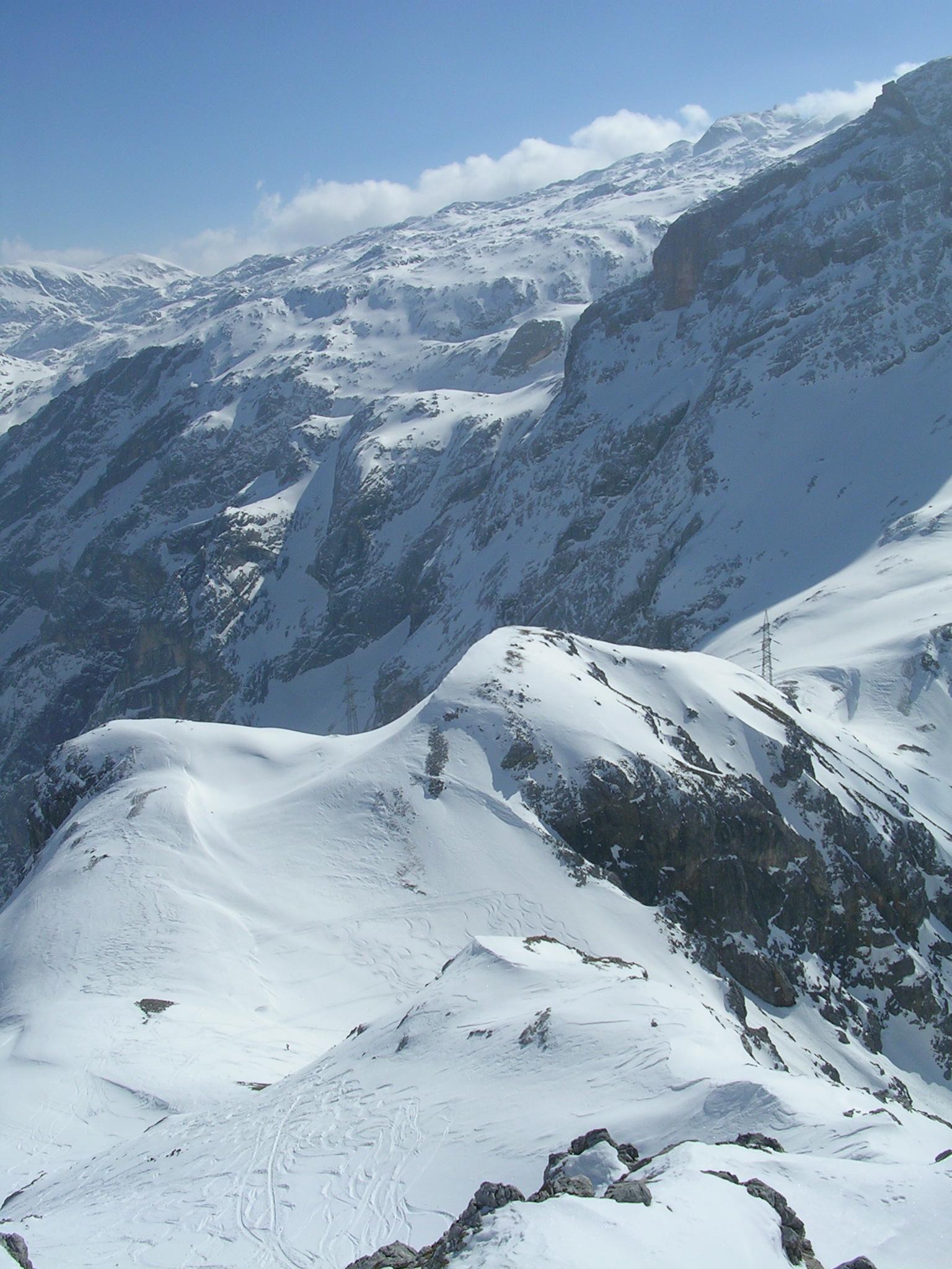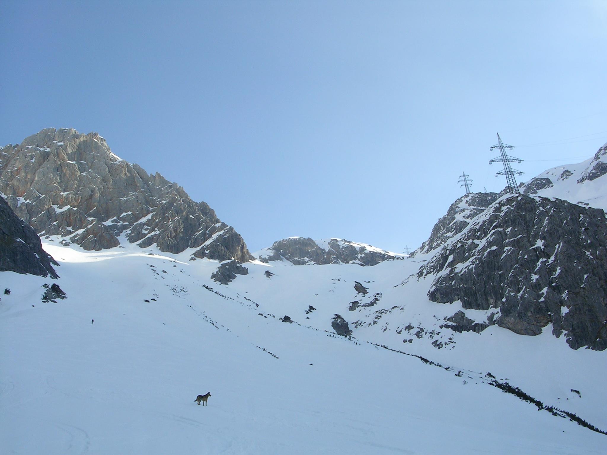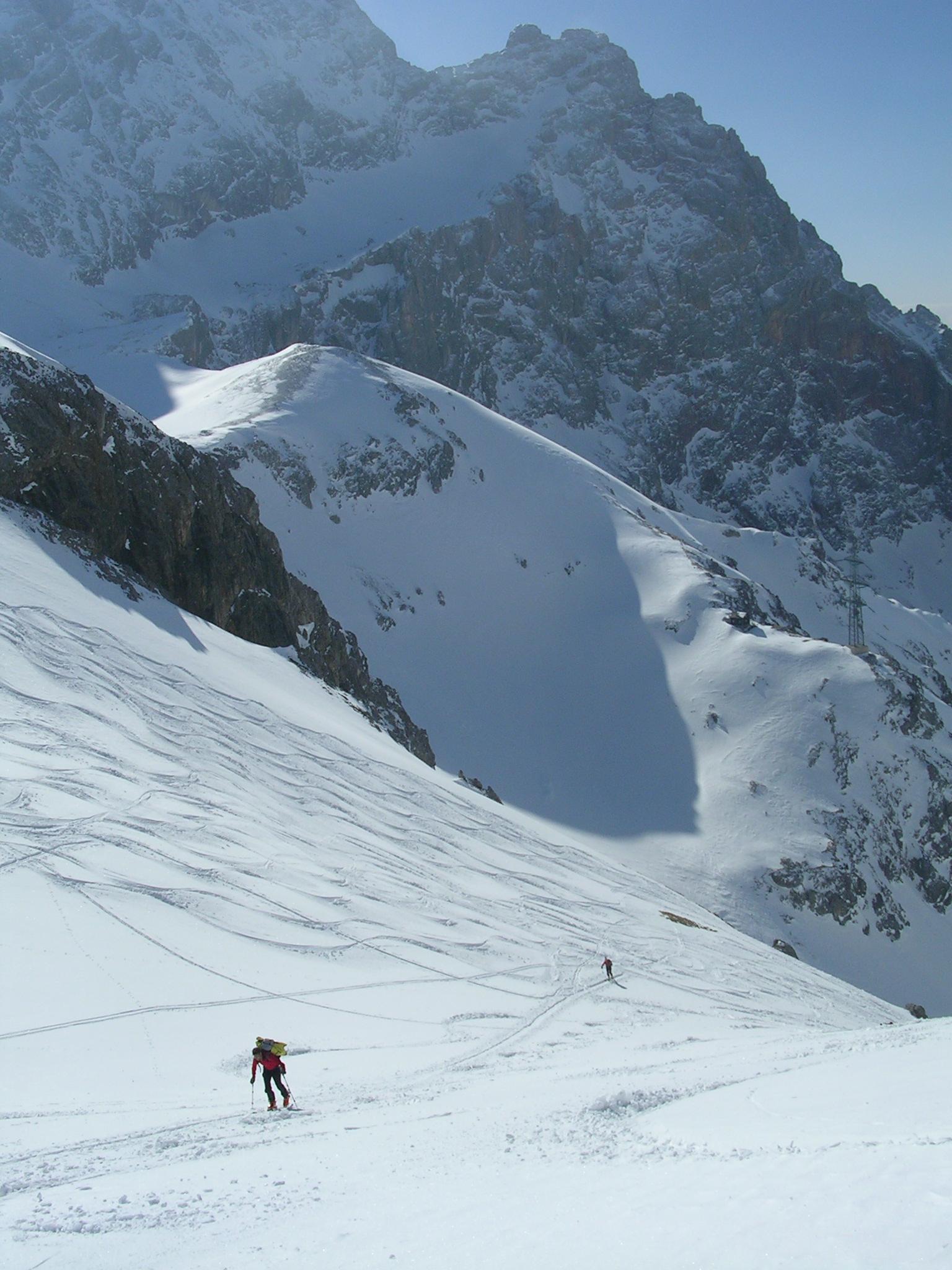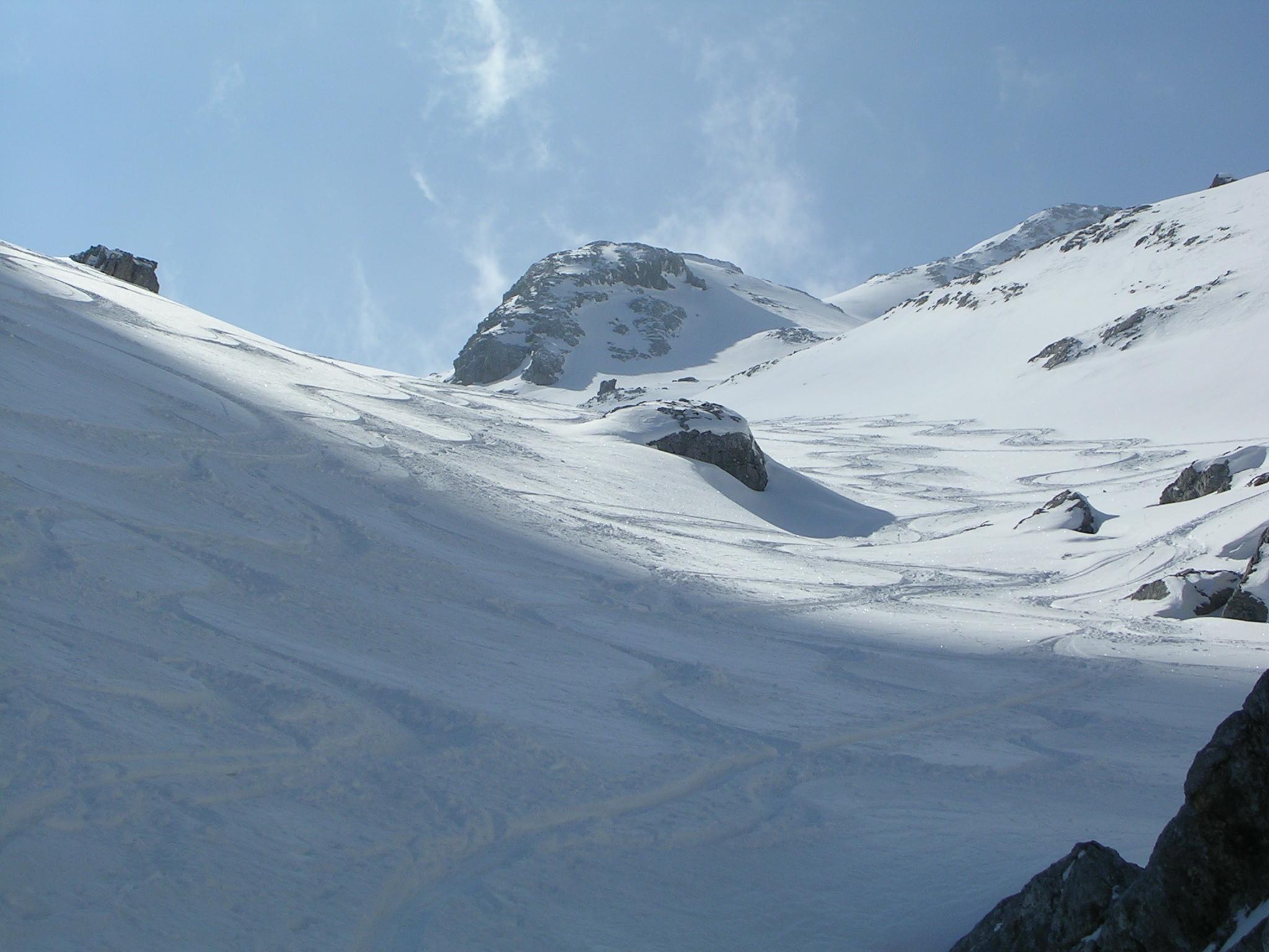 Inzwischen hatte es auch auf der SW-Seite aufgefirnt. Unterhalb der Torscharte noch leicht knusprig, weiter unten teilweise tief aufgeweicht, sonst schöne Firnabfahrt.